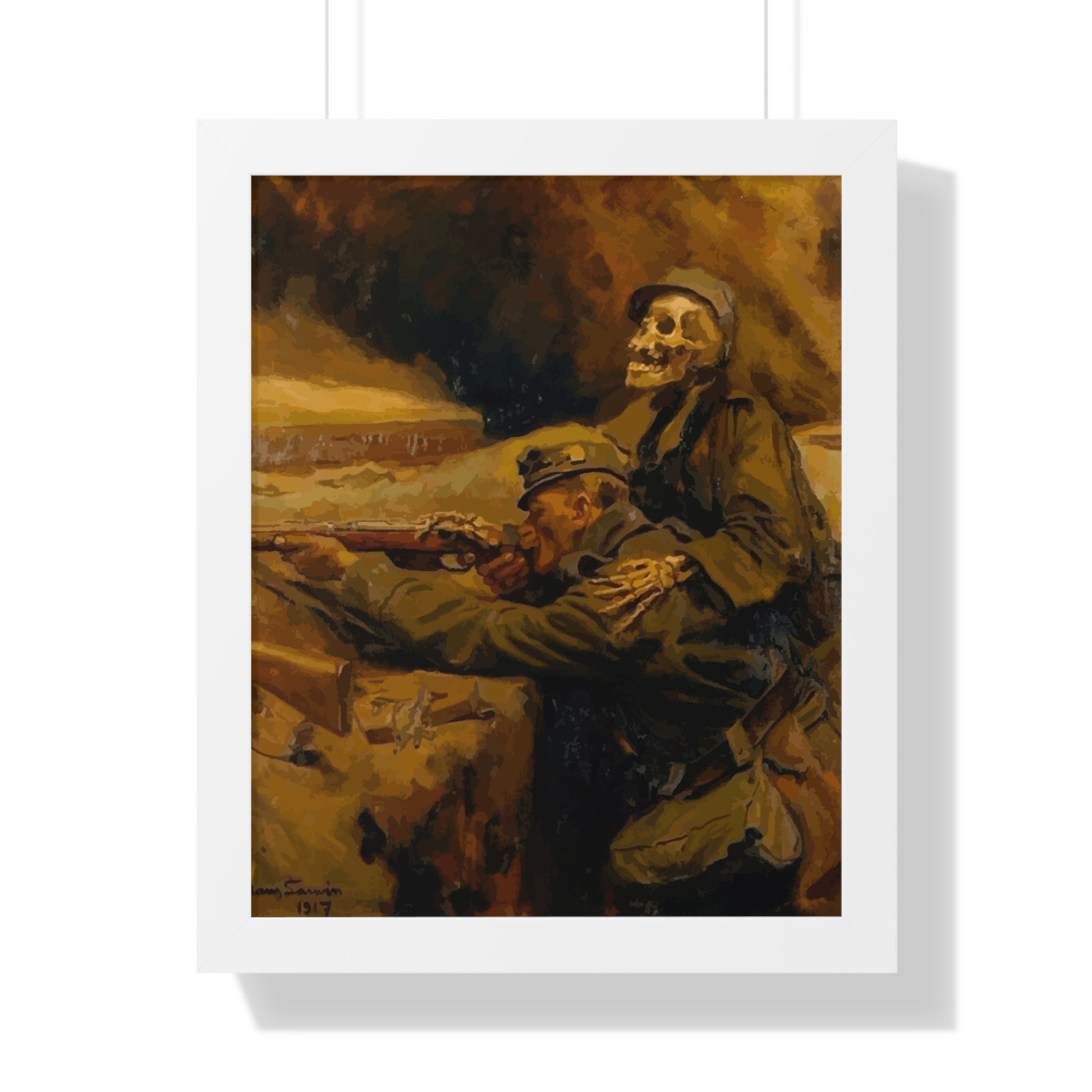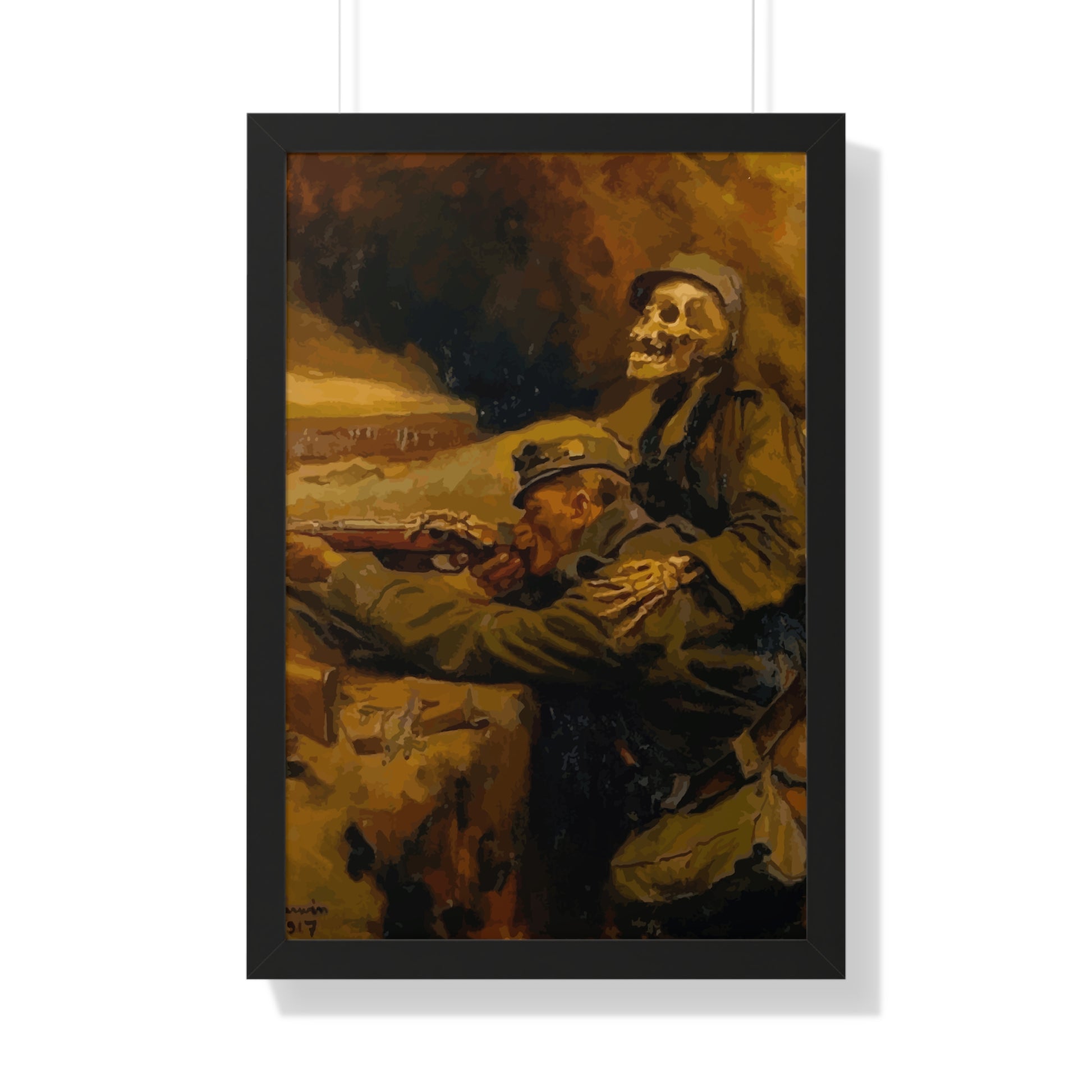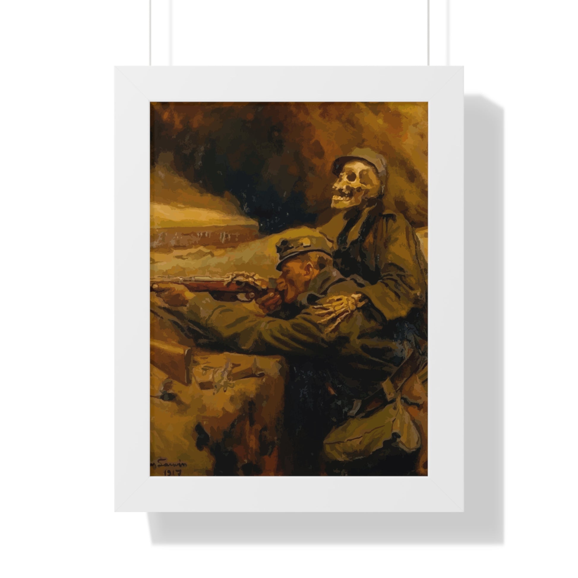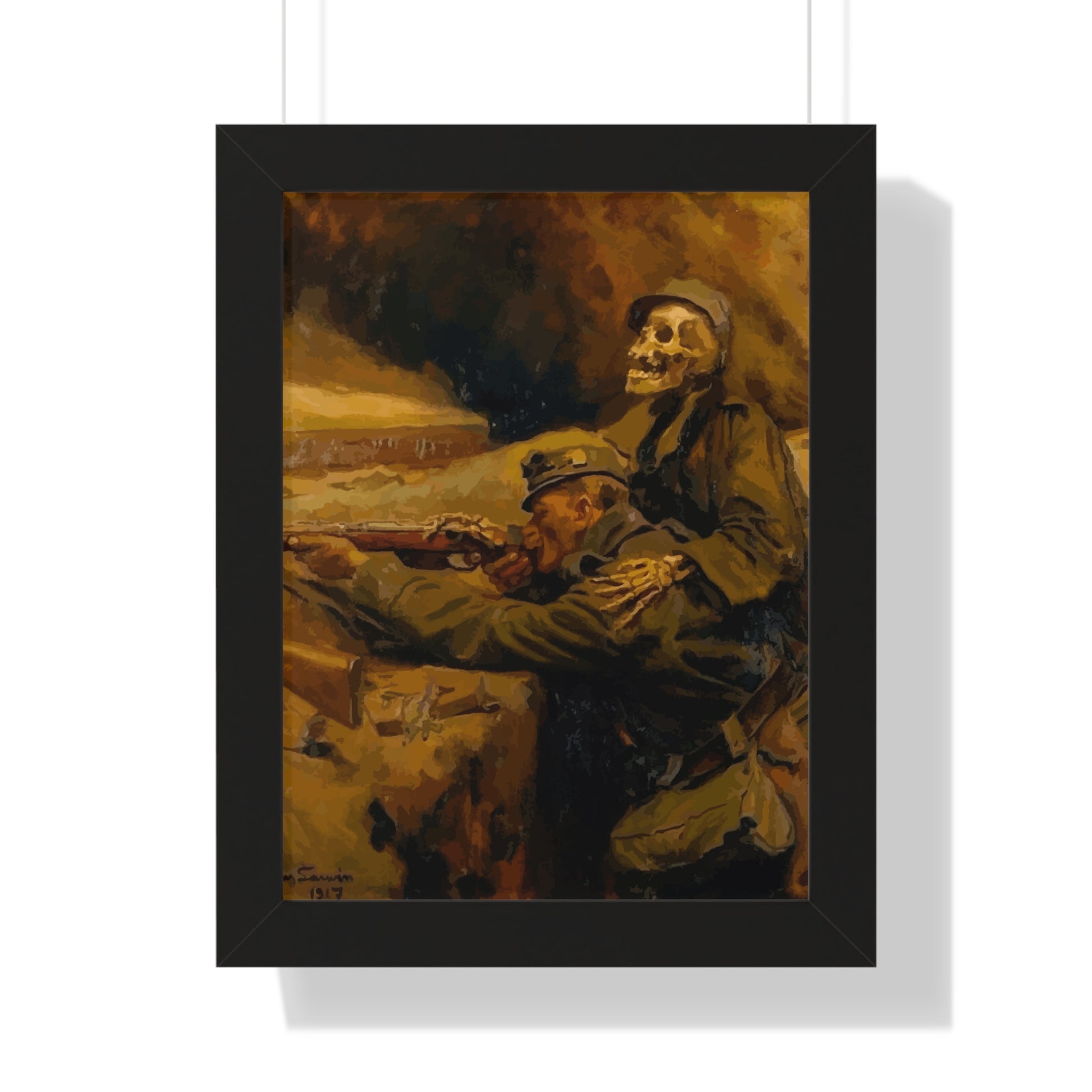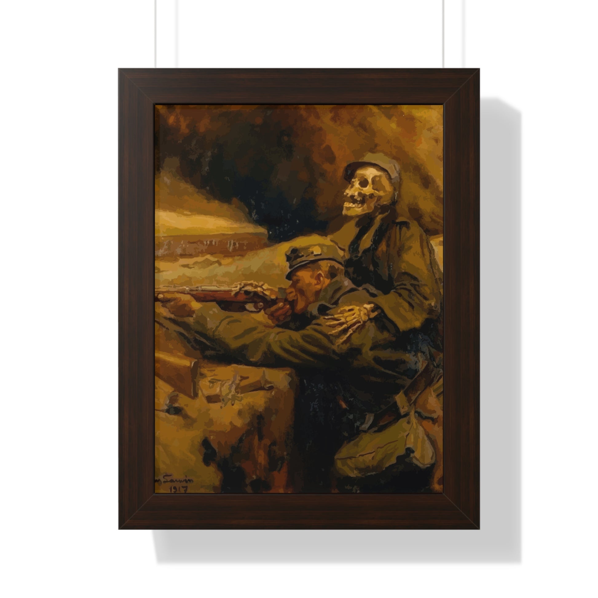 Elevate your home décor with this stunning Framed Vertical Poster Titled "Death and the Soldier" painted by Hans Larwin in 1917. Perfect for art enthusiasts and history buffs alike, this exquisite piece creates a captivating atmosphere in any space. Whether you're decorating a living room, office, or study, this framed poster effortlessly enhances your surroundings with its vibrant colors and rich detail.