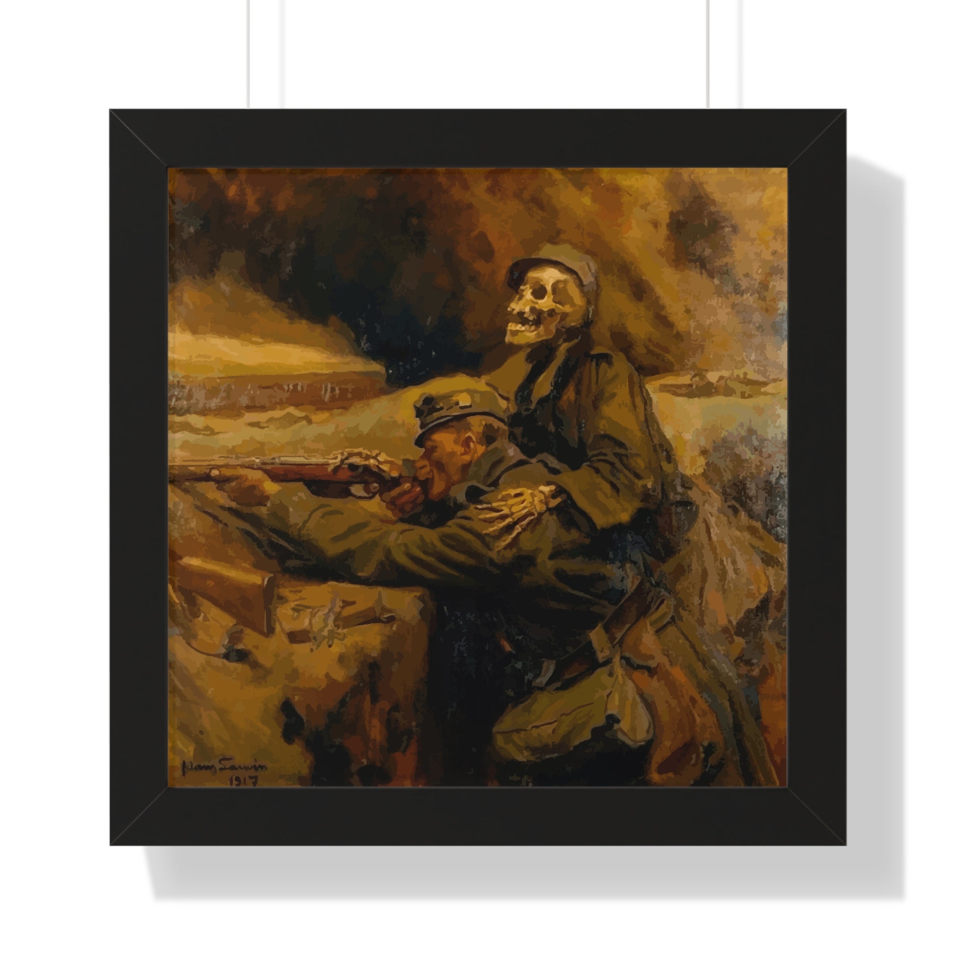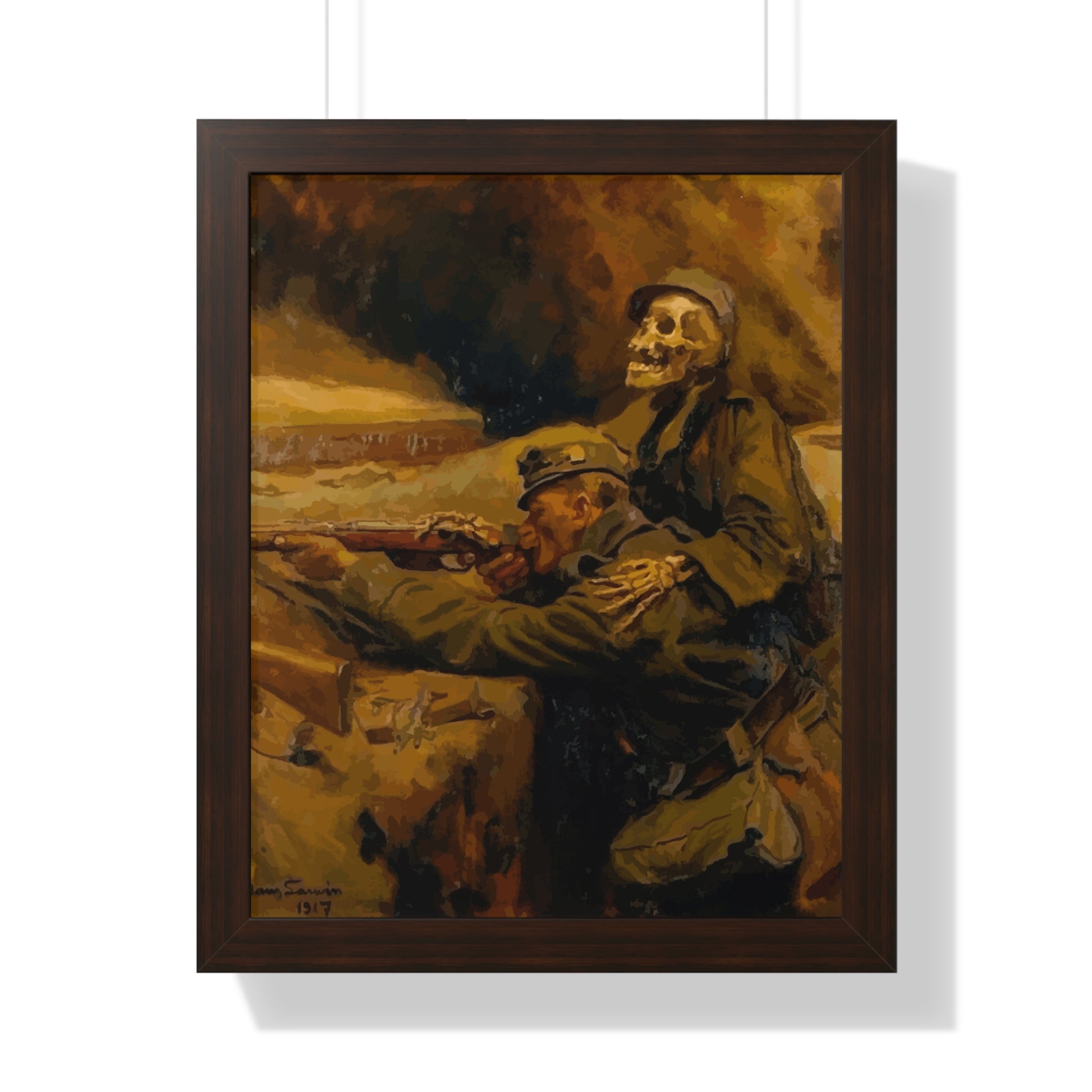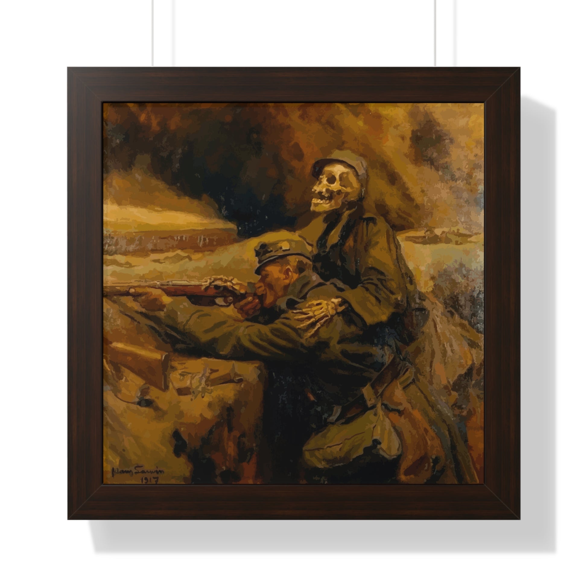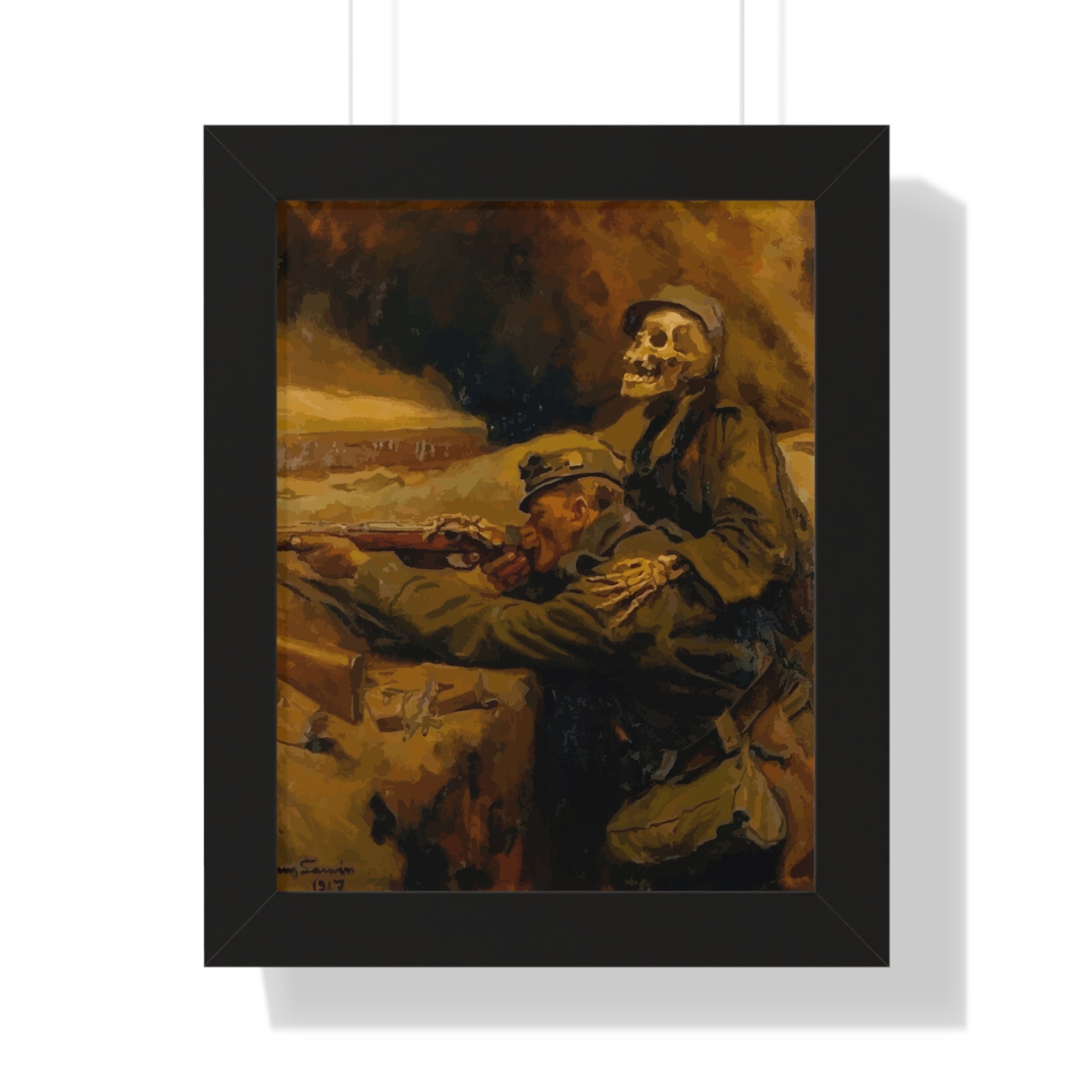 Elevate your home décor with this stunning Framed Vertical Poster Titled "Death and the Soldier" painted by Hans Larwin in 1917. Perfect for art enthusiasts and history buffs alike, this exquisite piece creates a captivating atmosphere in any space. Whether you're decorating a living room, office, or study, this framed poster effortlessly enhances your surroundings with its vibrant colors and rich detail.