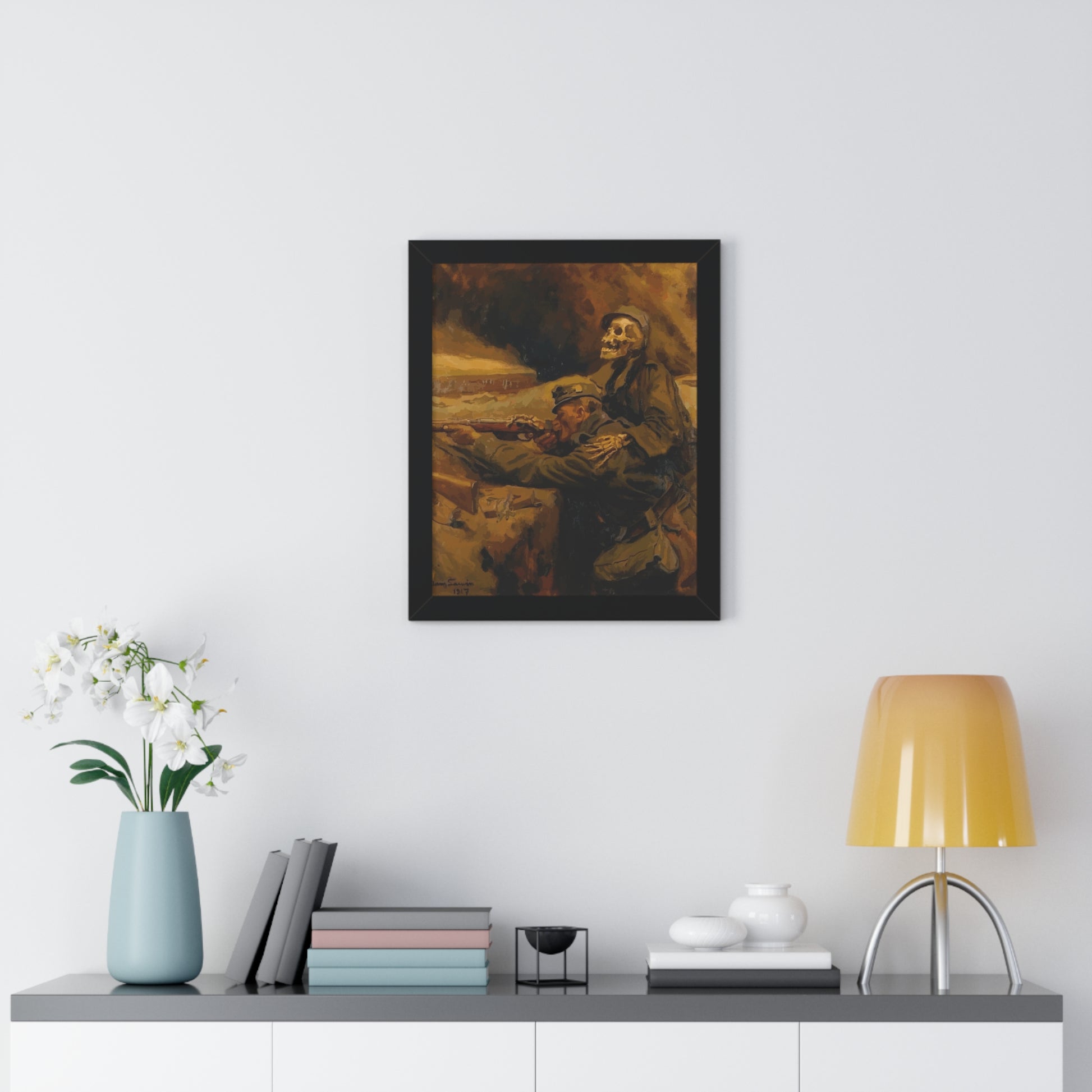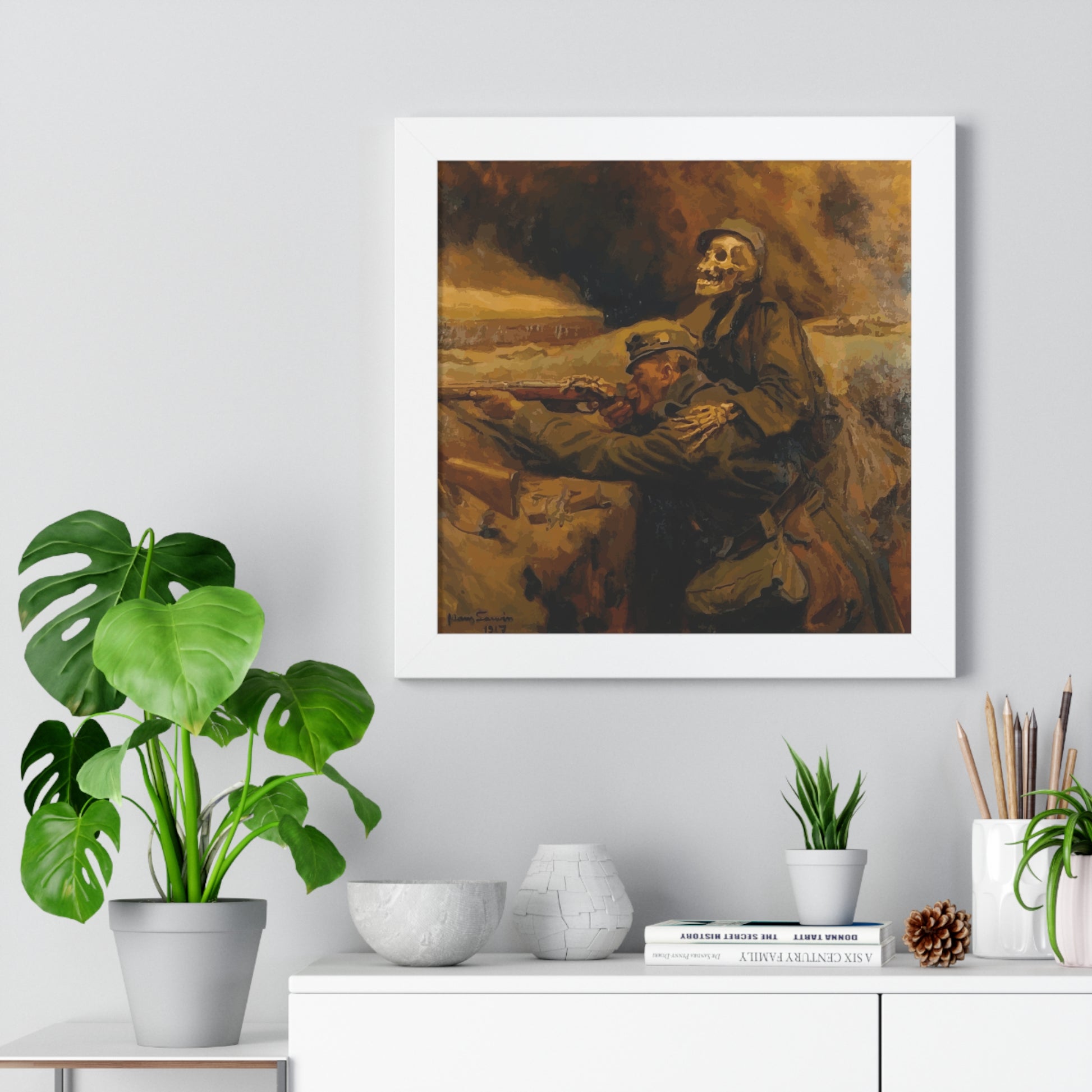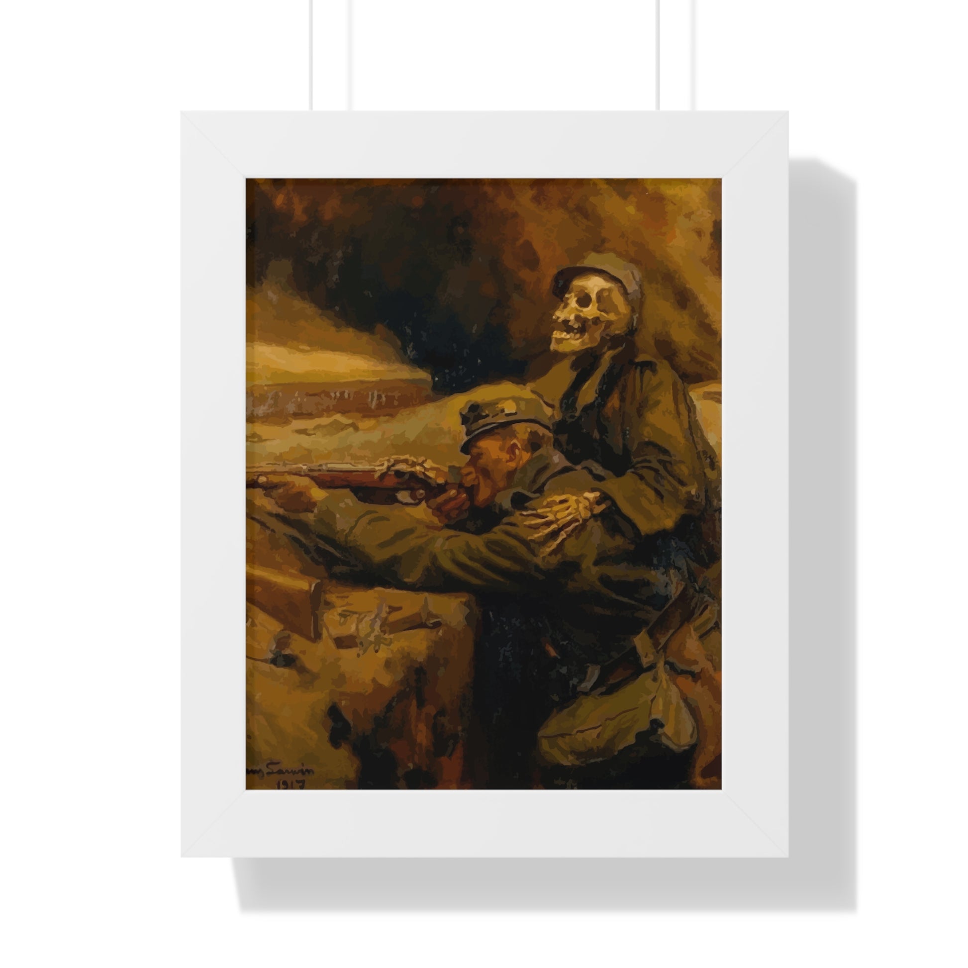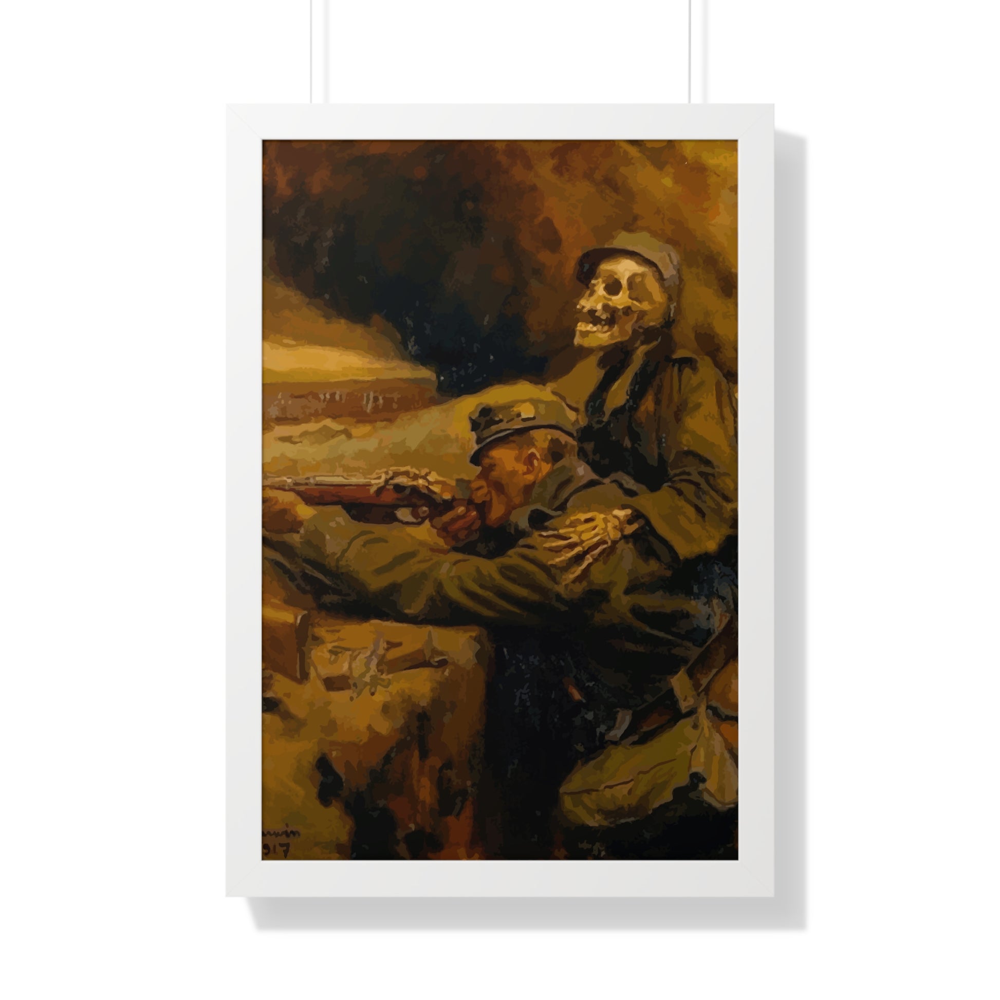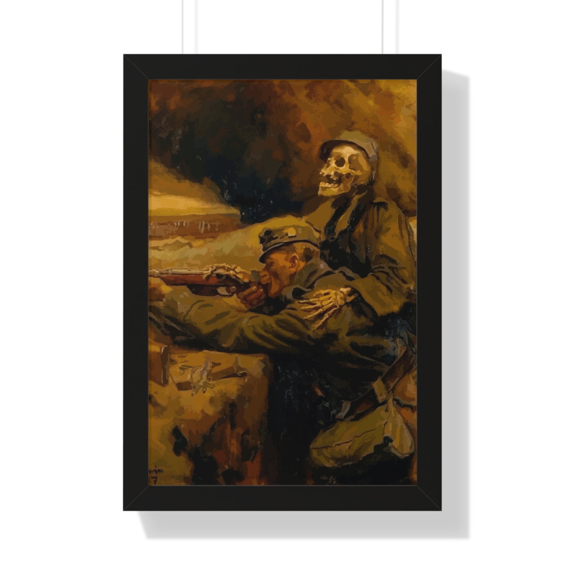 Elevate your home décor with this stunning Framed Vertical Poster Titled "Death and the Soldier" painted by Hans Larwin in 1917. Perfect for art enthusiasts and history buffs alike, this exquisite piece creates a captivating atmosphere in any space. Whether you're decorating a living room, office, or study, this framed poster effortlessly enhances your surroundings with its vibrant colors and rich detail.