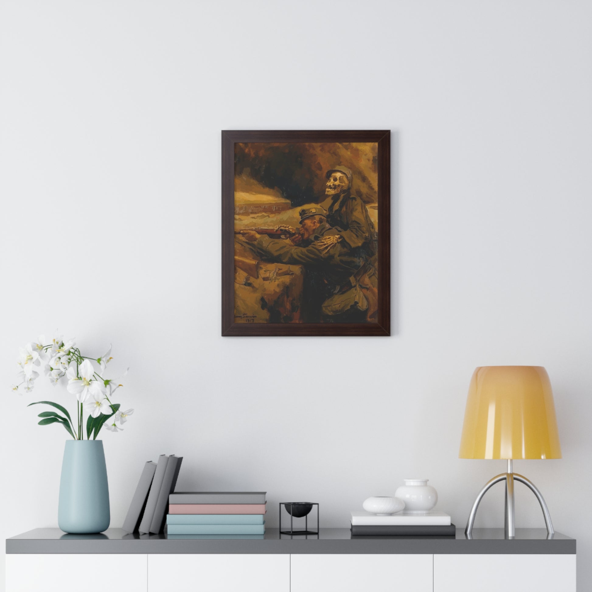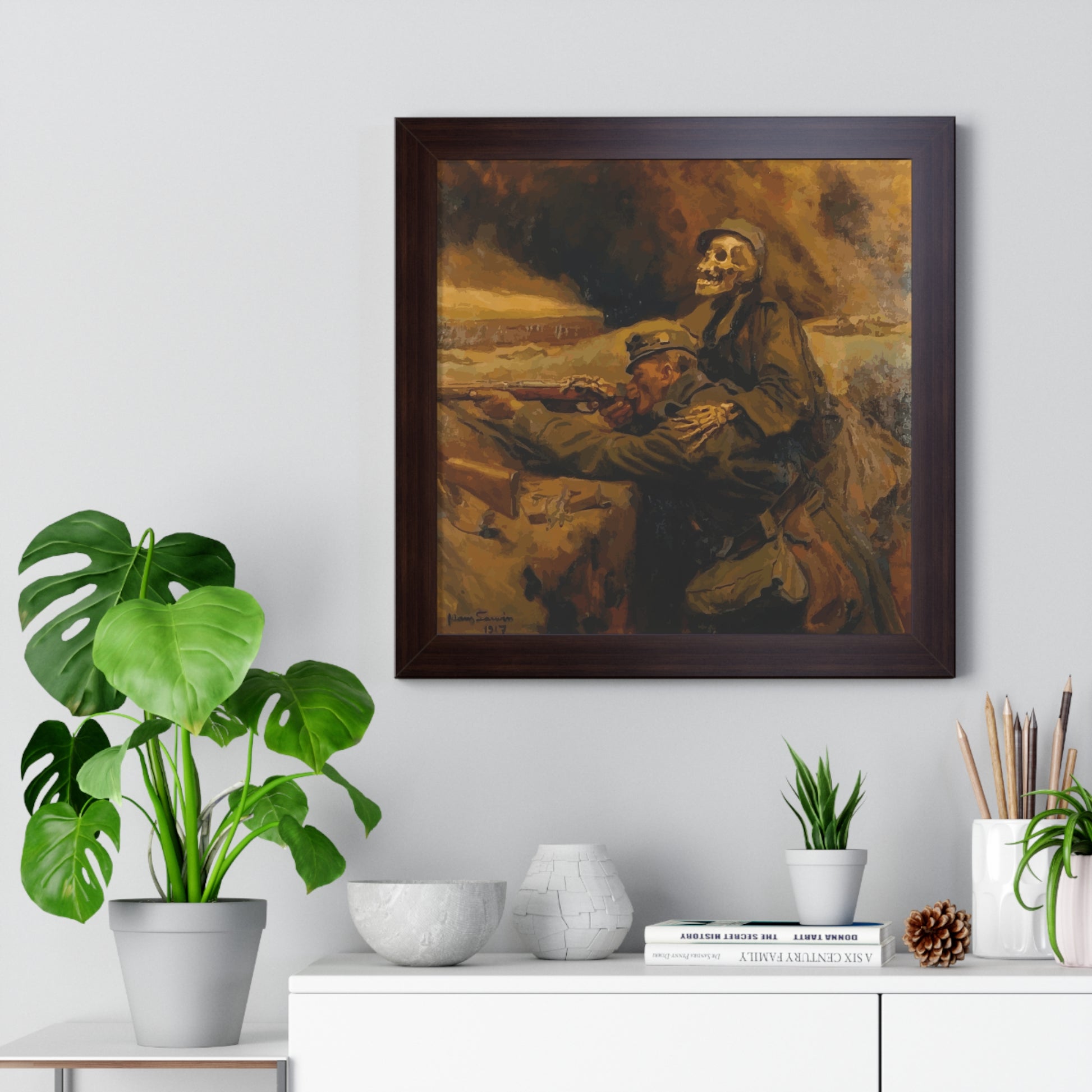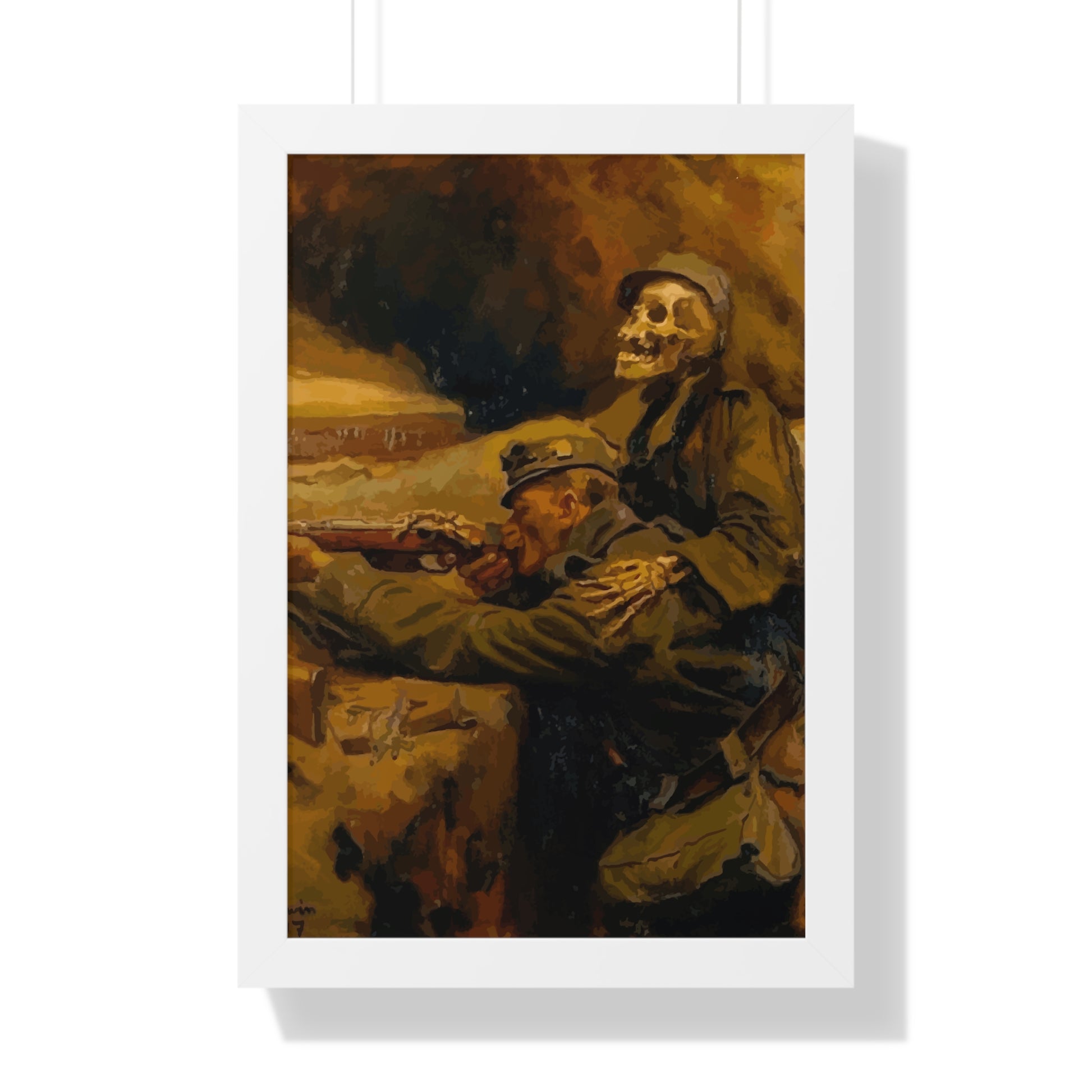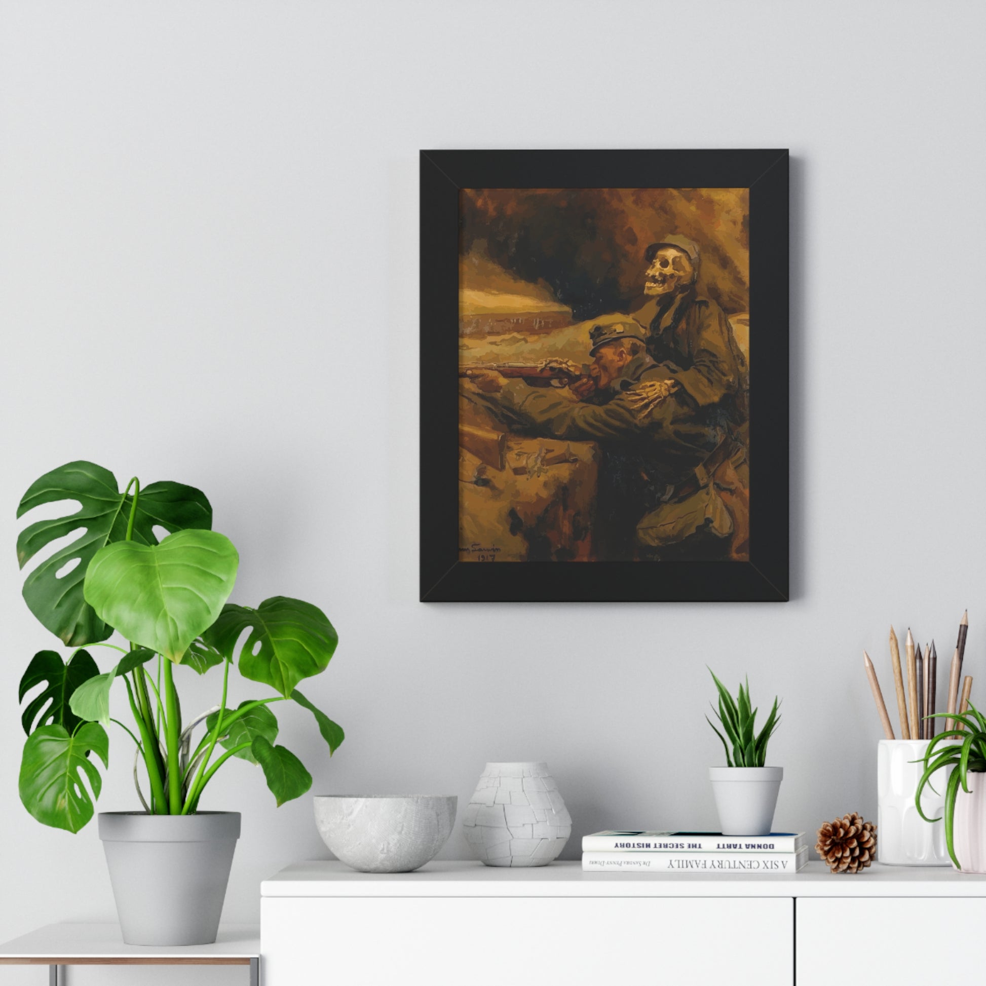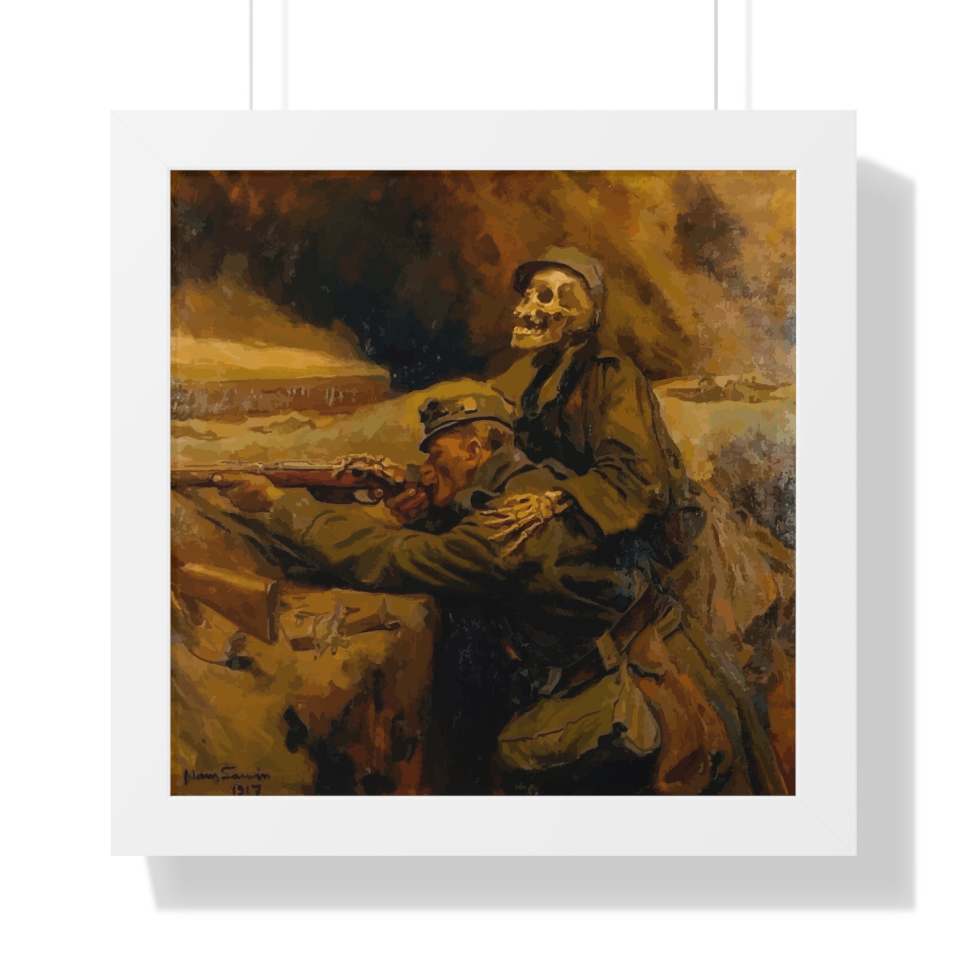Elevate your home décor with this stunning Framed Vertical Poster Titled "Death and the Soldier" painted by Hans Larwin in 1917. Perfect for art enthusiasts and history buffs alike, this exquisite piece creates a captivating atmosphere in any space. Whether you're decorating a living room, office, or study, this framed poster effortlessly enhances your surroundings with its vibrant colors and rich detail.