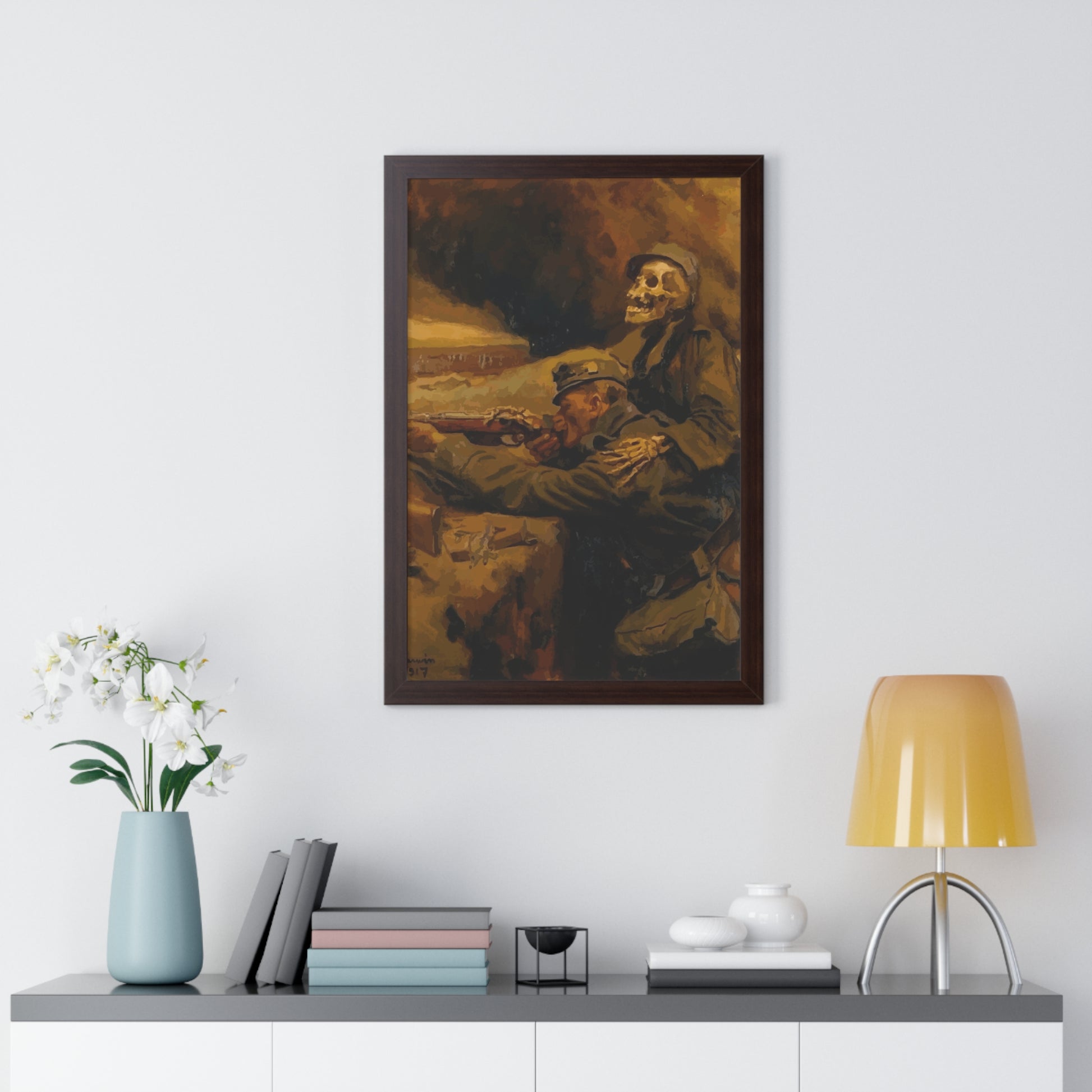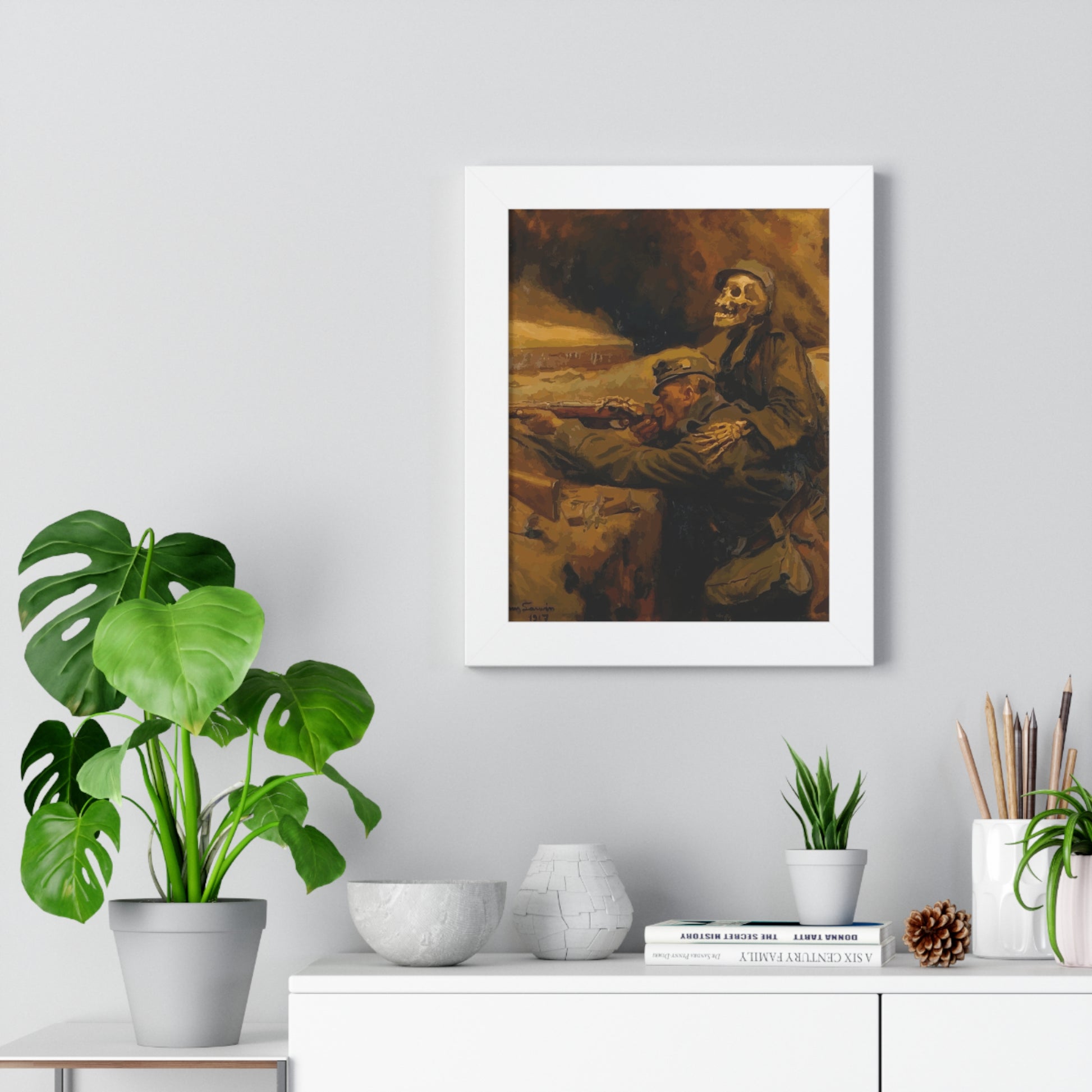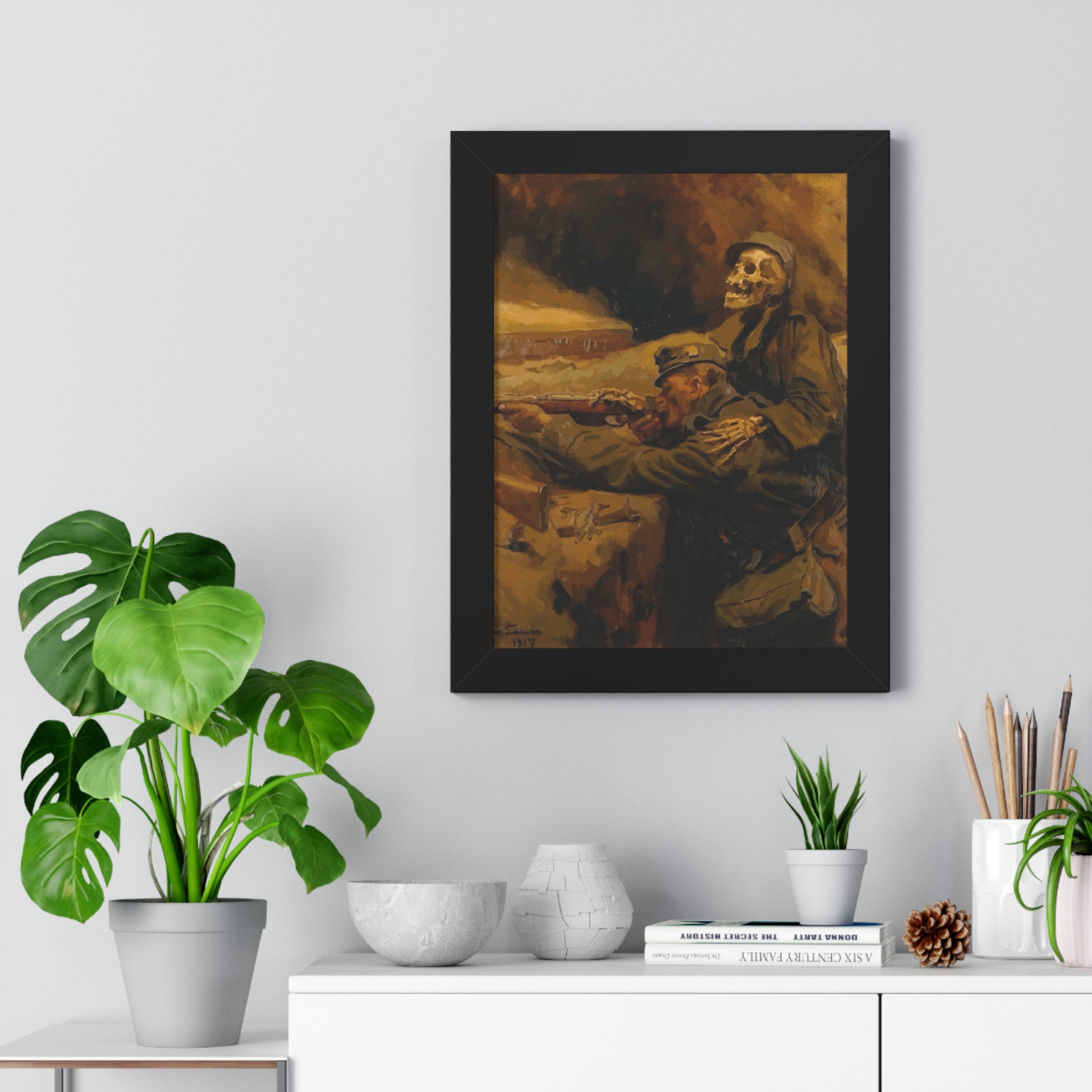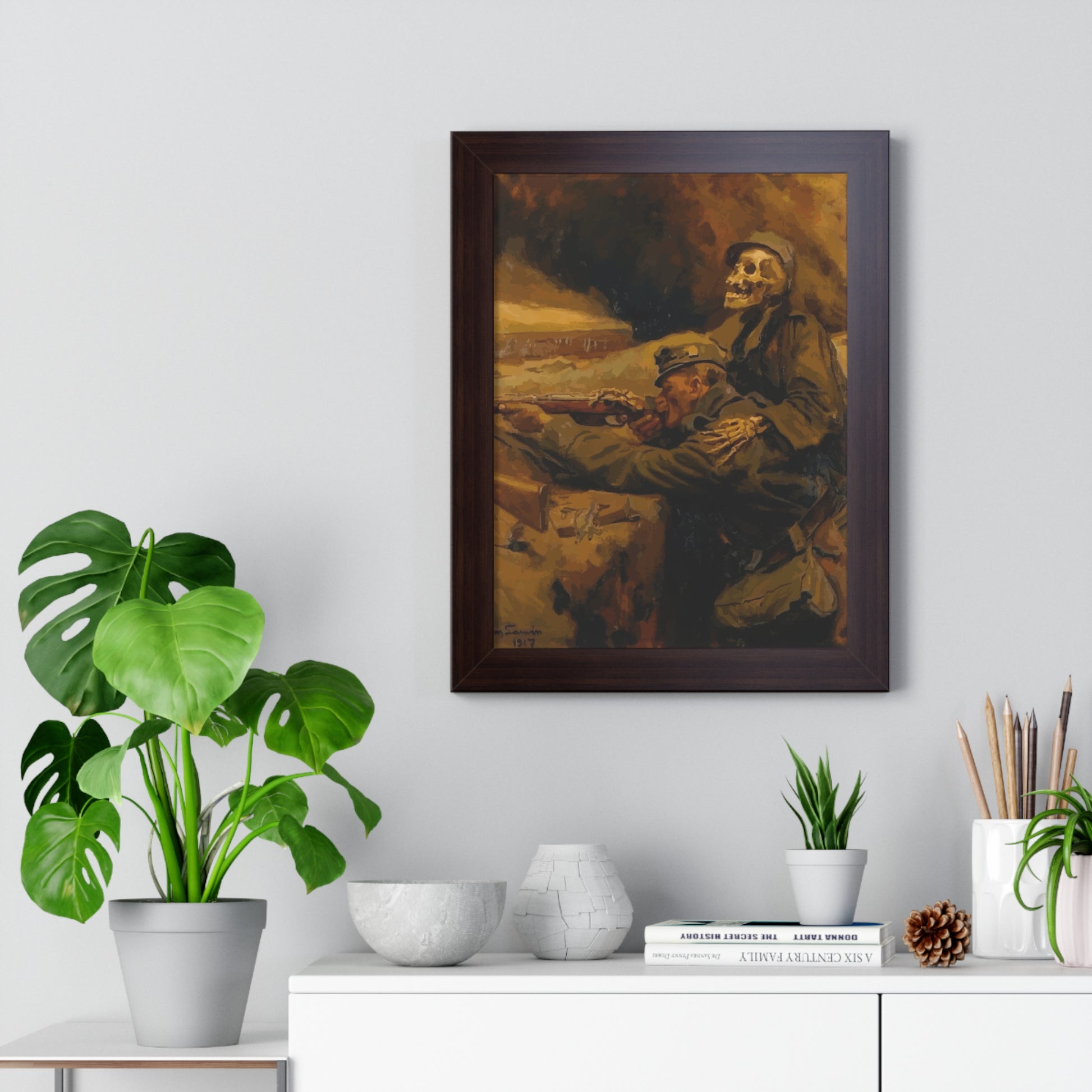 Elevate your home décor with this stunning Framed Vertical Poster Titled "Death and the Soldier" painted by Hans Larwin in 1917. Perfect for art enthusiasts and history buffs alike, this exquisite piece creates a captivating atmosphere in any space. Whether you're decorating a living room, office, or study, this framed poster effortlessly enhances your surroundings with its vibrant colors and rich detail.