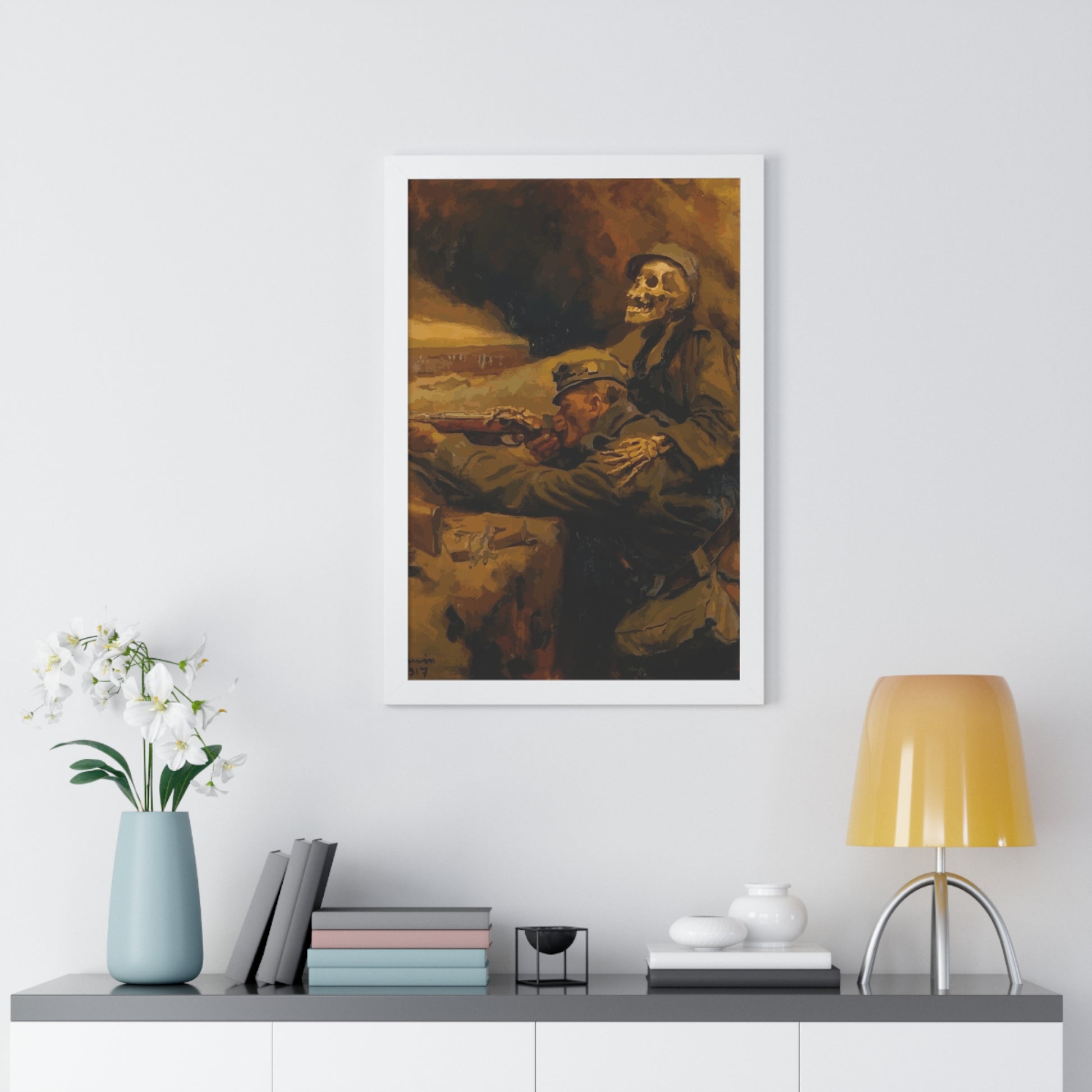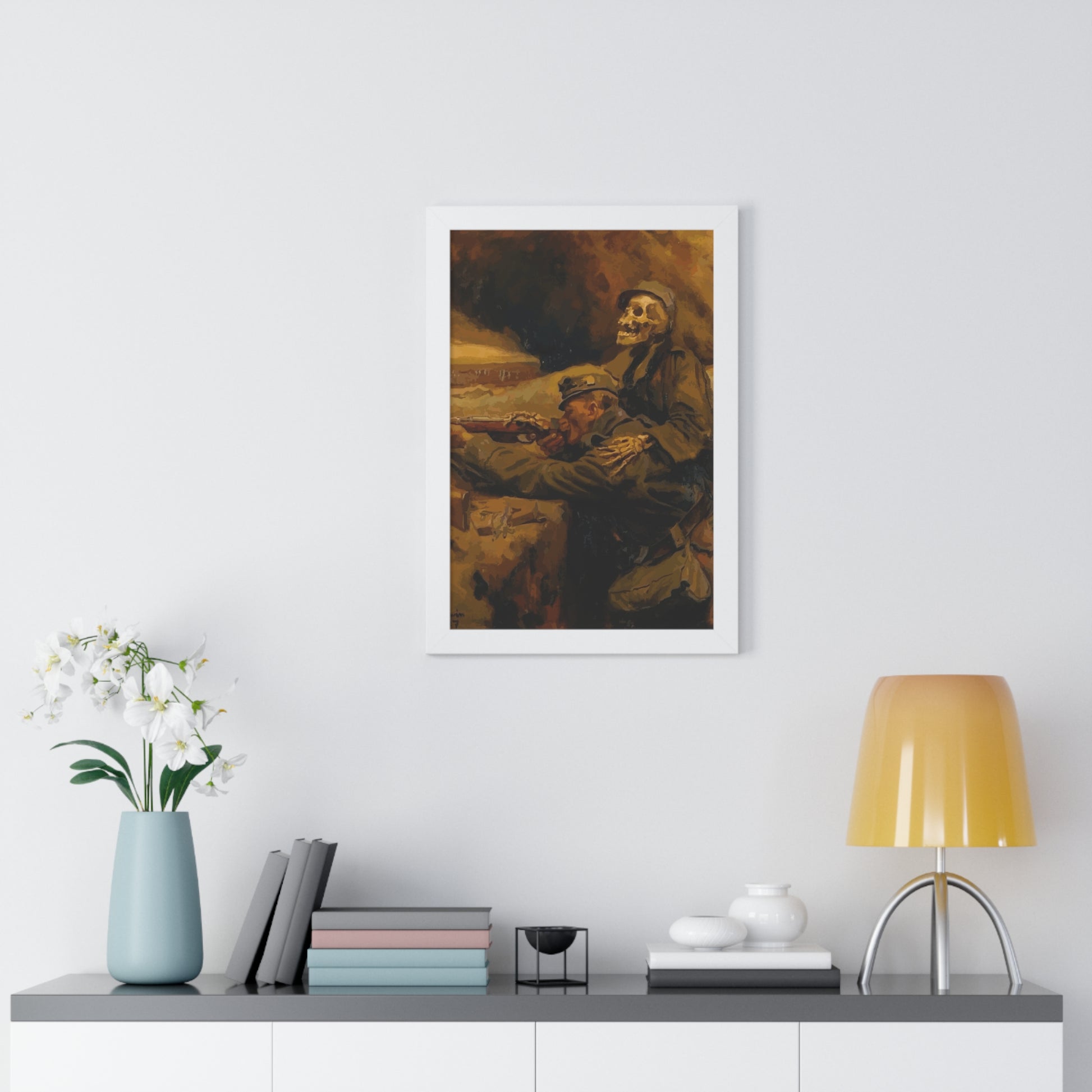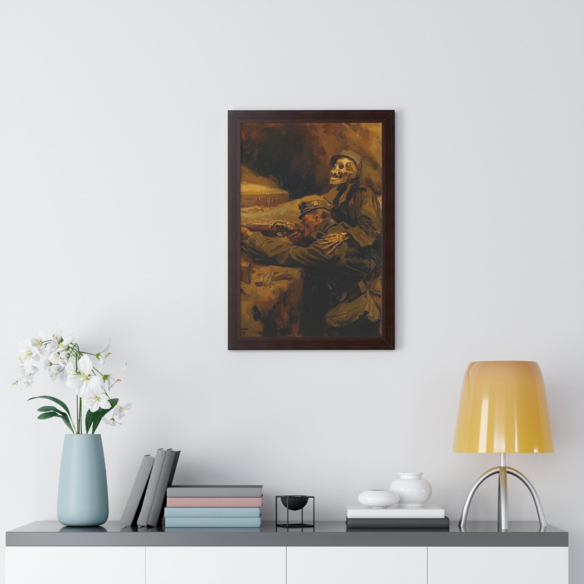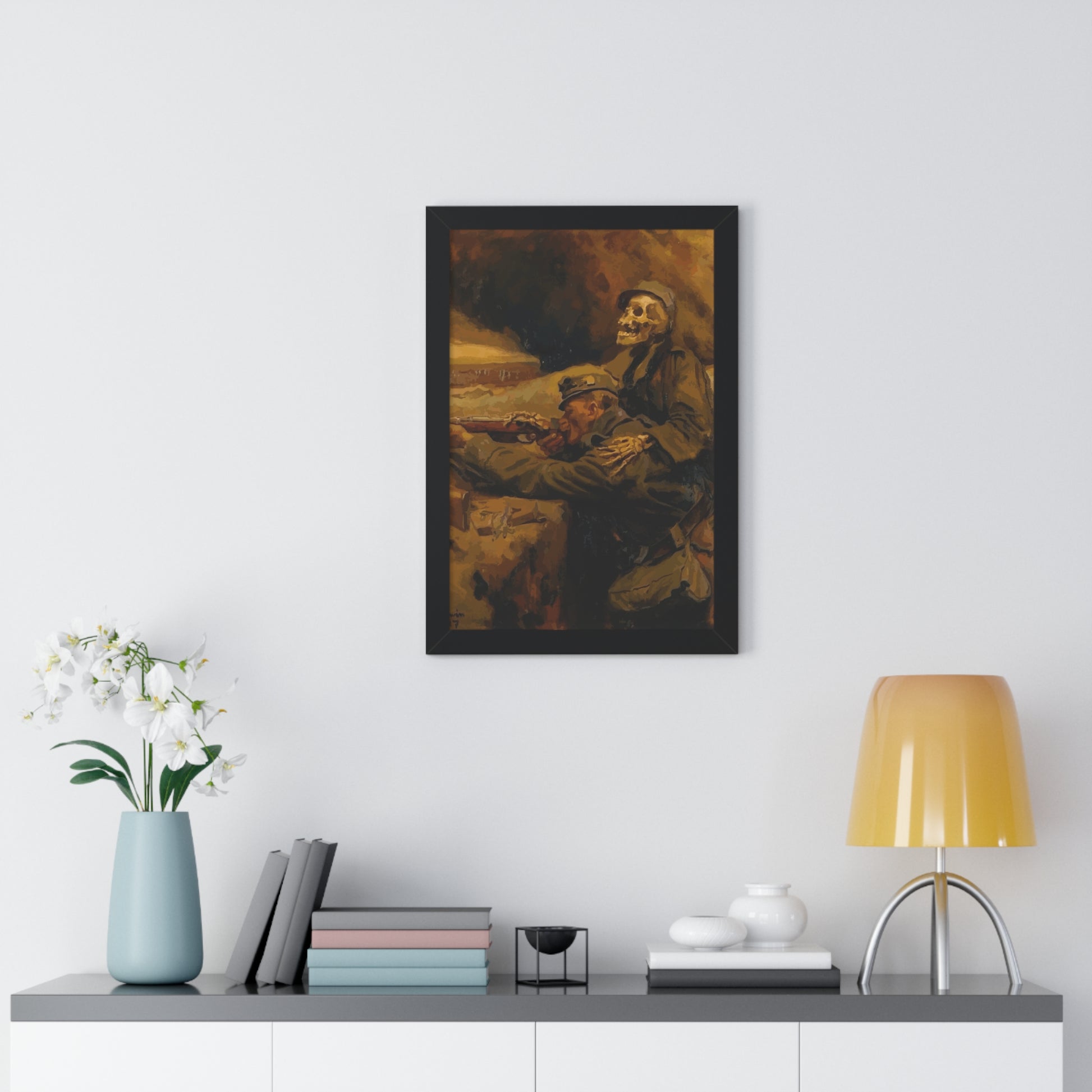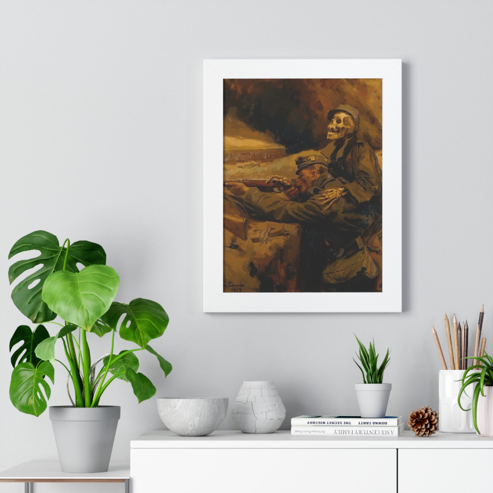 Elevate your home décor with this stunning Framed Vertical Poster Titled "Death and the Soldier" painted by Hans Larwin in 1917. Perfect for art enthusiasts and history buffs alike, this exquisite piece creates a captivating atmosphere in any space. Whether you're decorating a living room, office, or study, this framed poster effortlessly enhances your surroundings with its vibrant colors and rich detail.