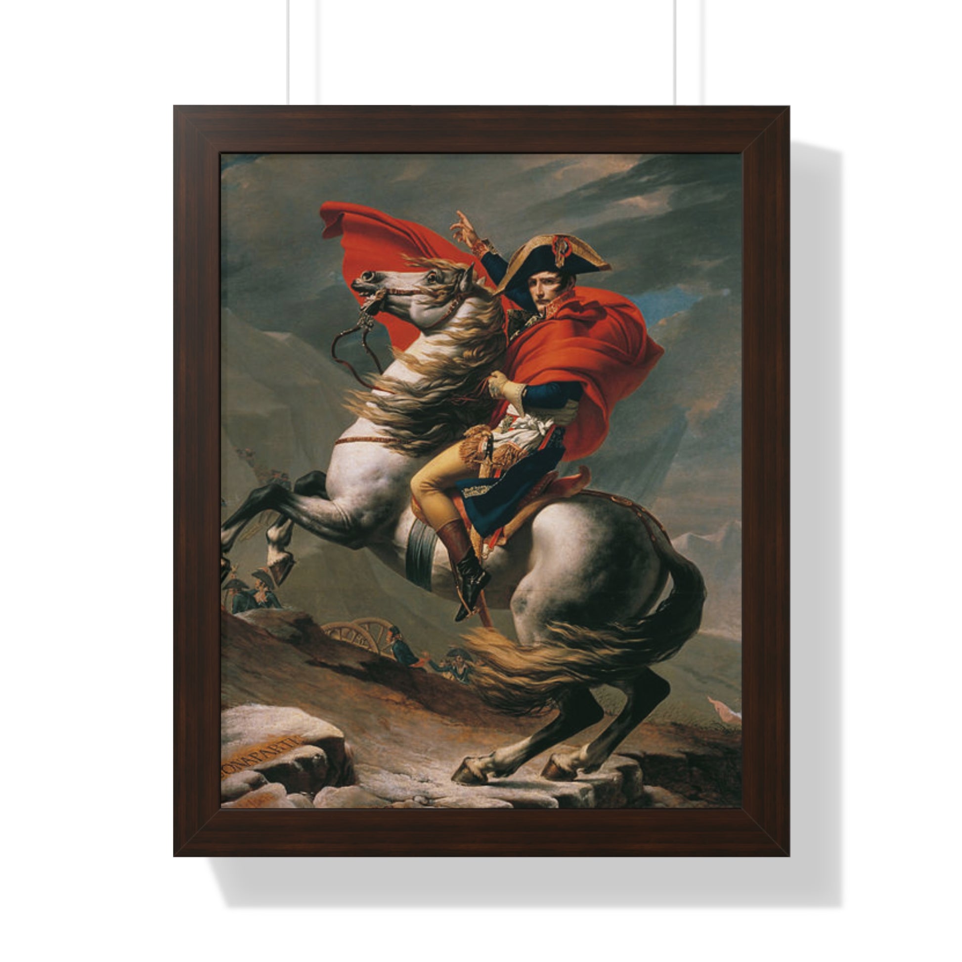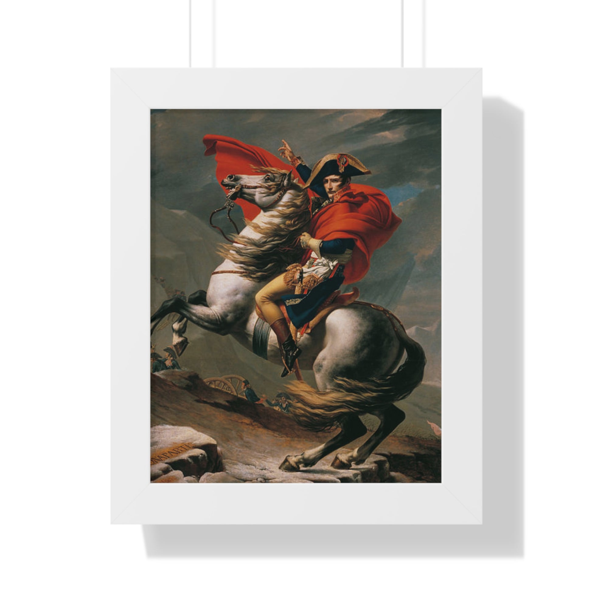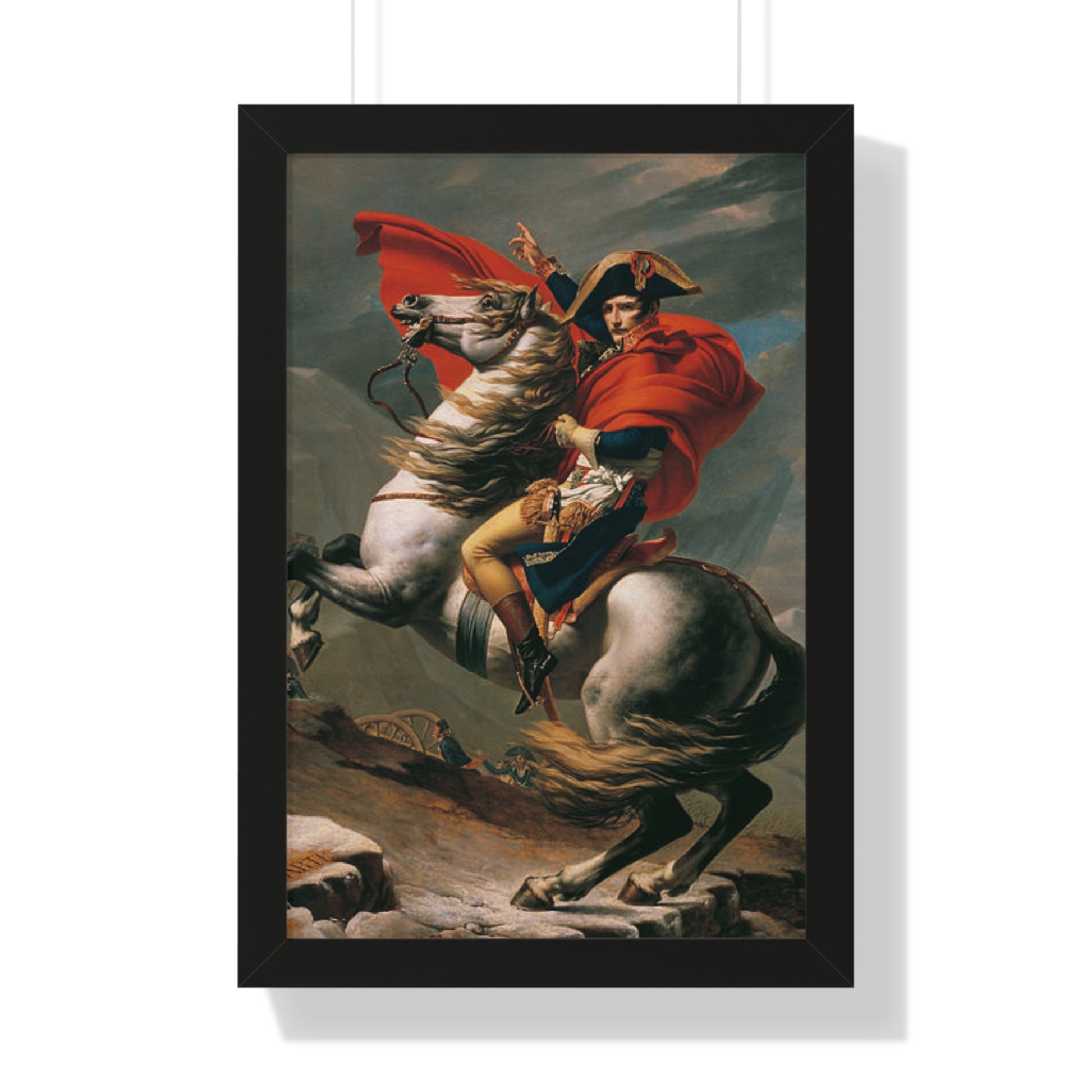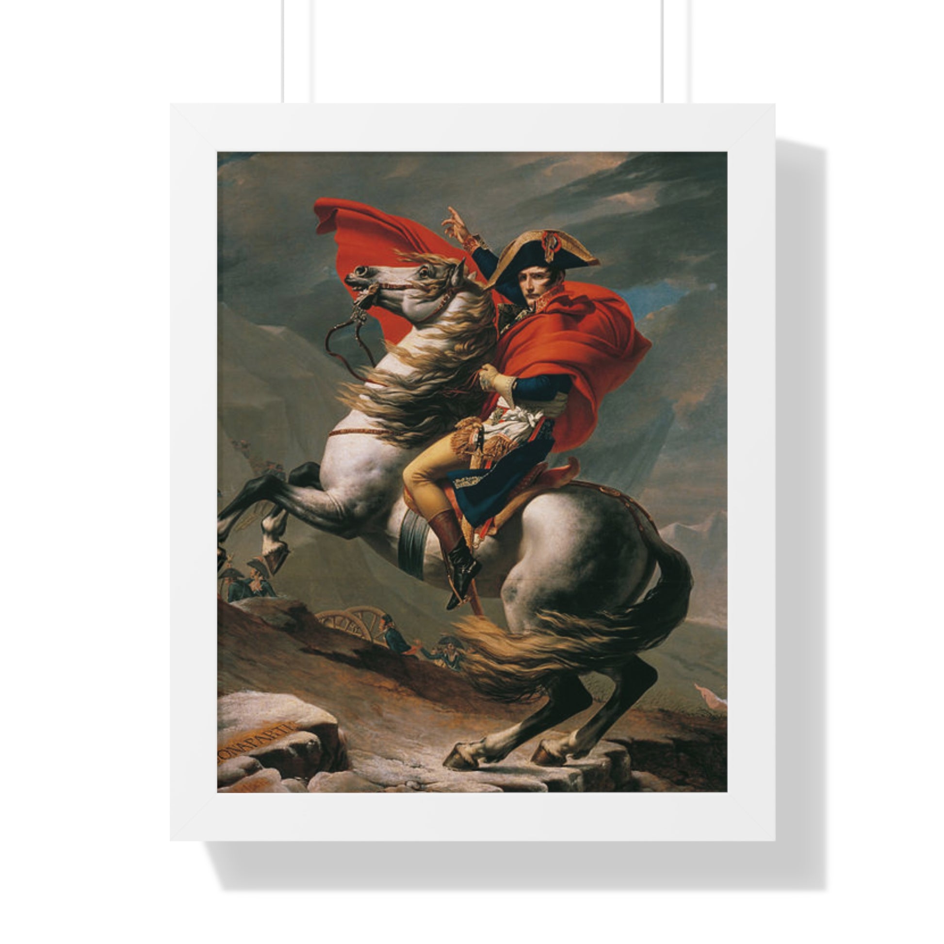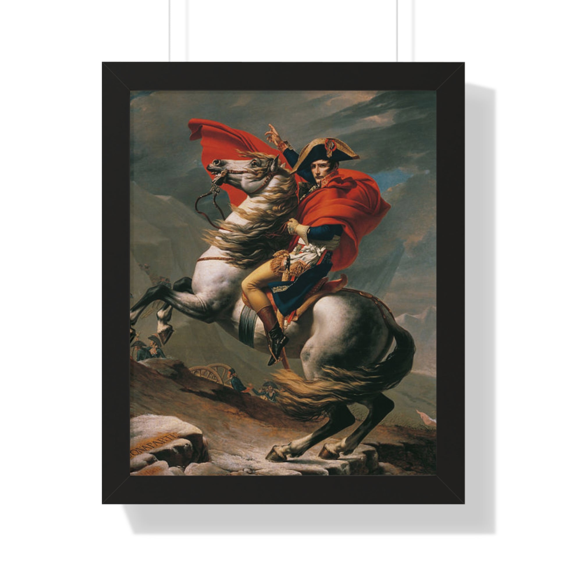 Elevate your wall decor with our Premium Framed Historical Painting of a Napoleon Bonapartecrossing the Great St. Bernard Mountain Alps on horseback by Jacques-Louis David. Available in three sophisticated colors: black, white, and walnut.