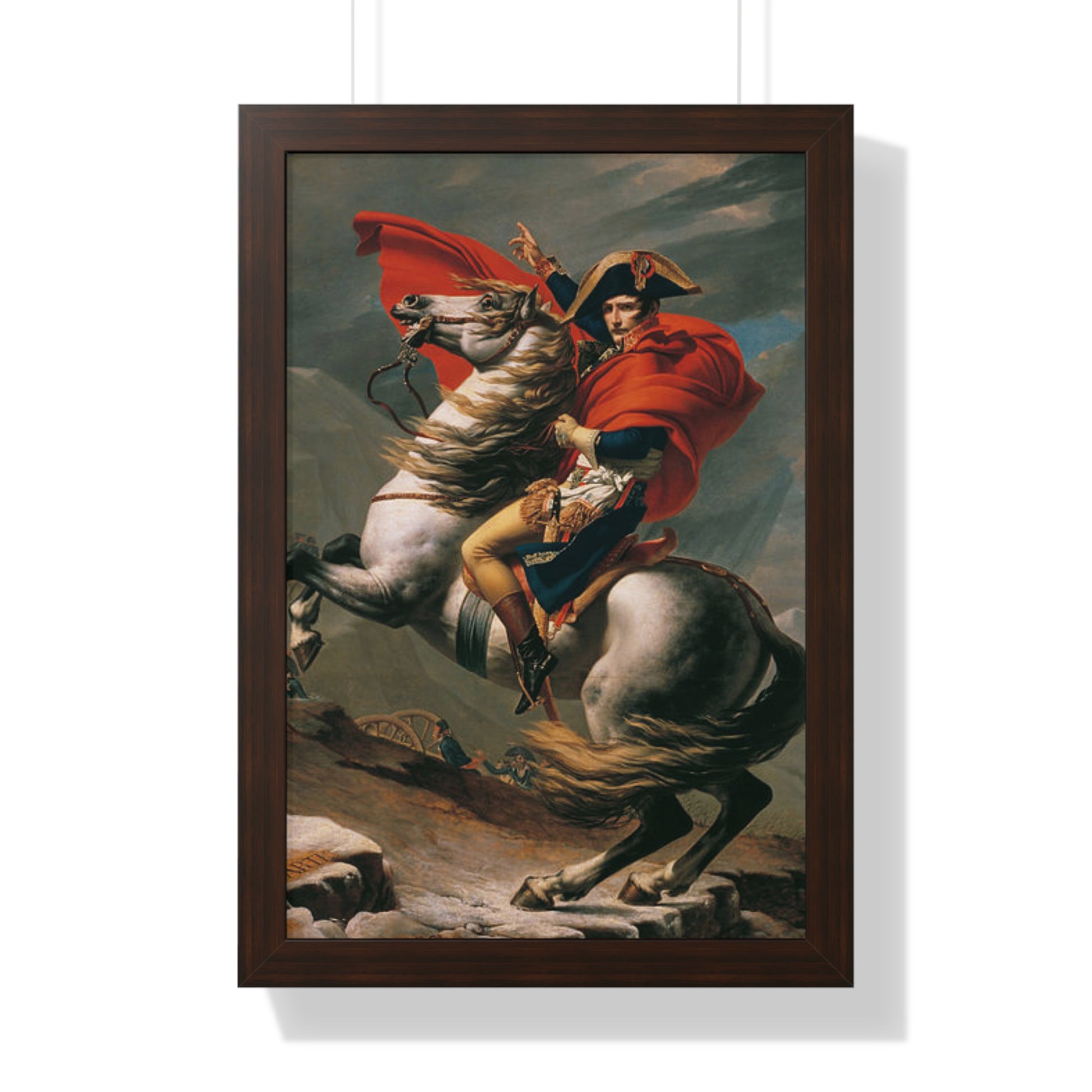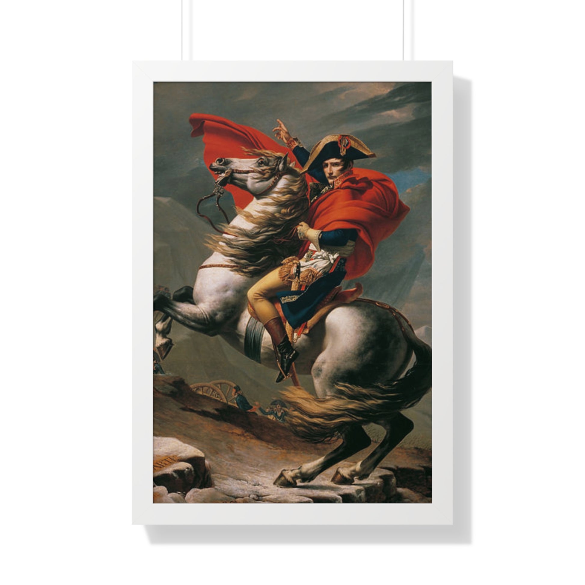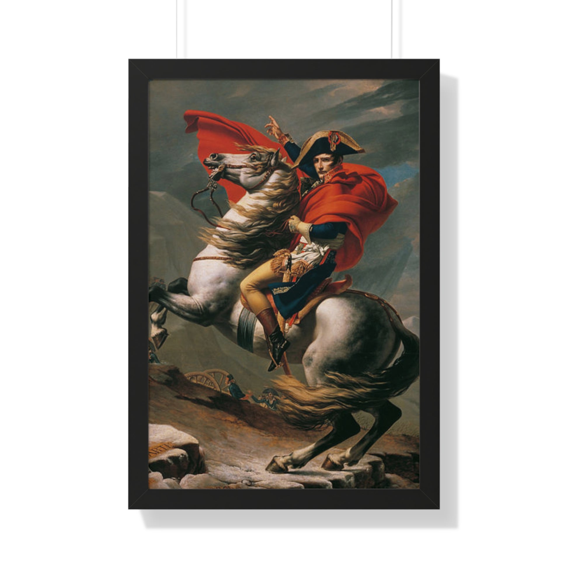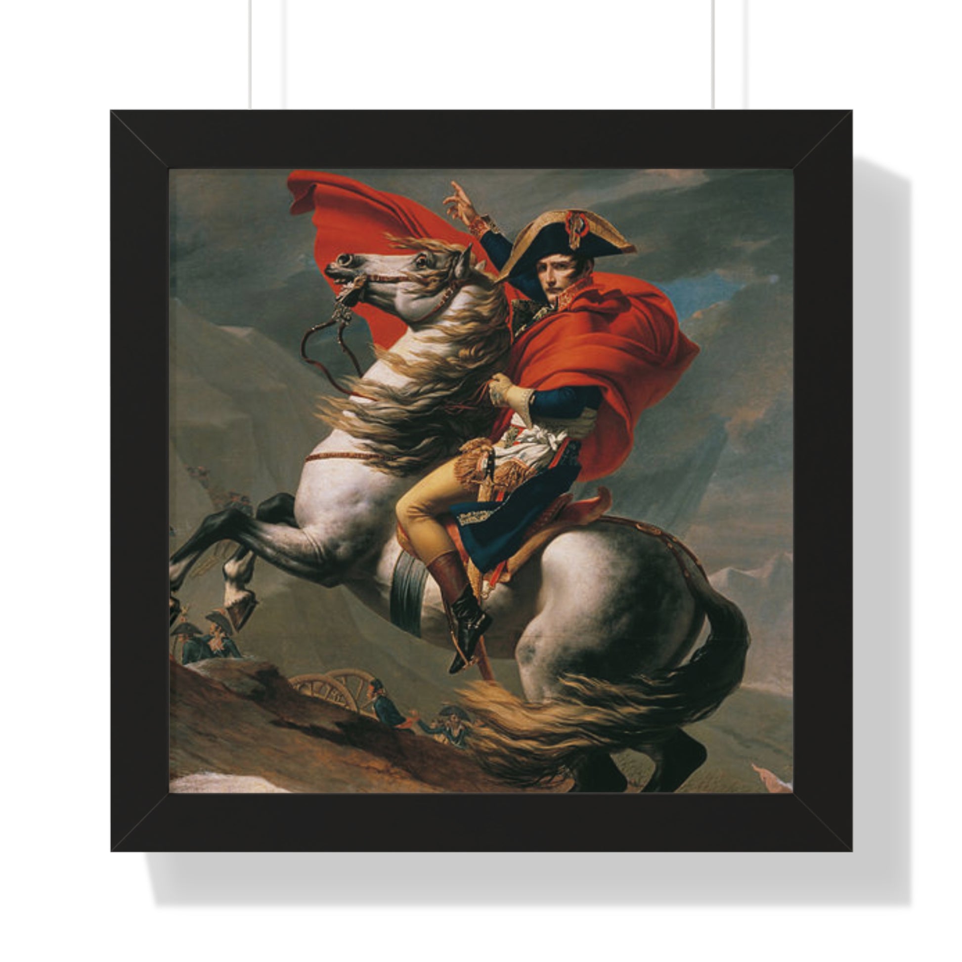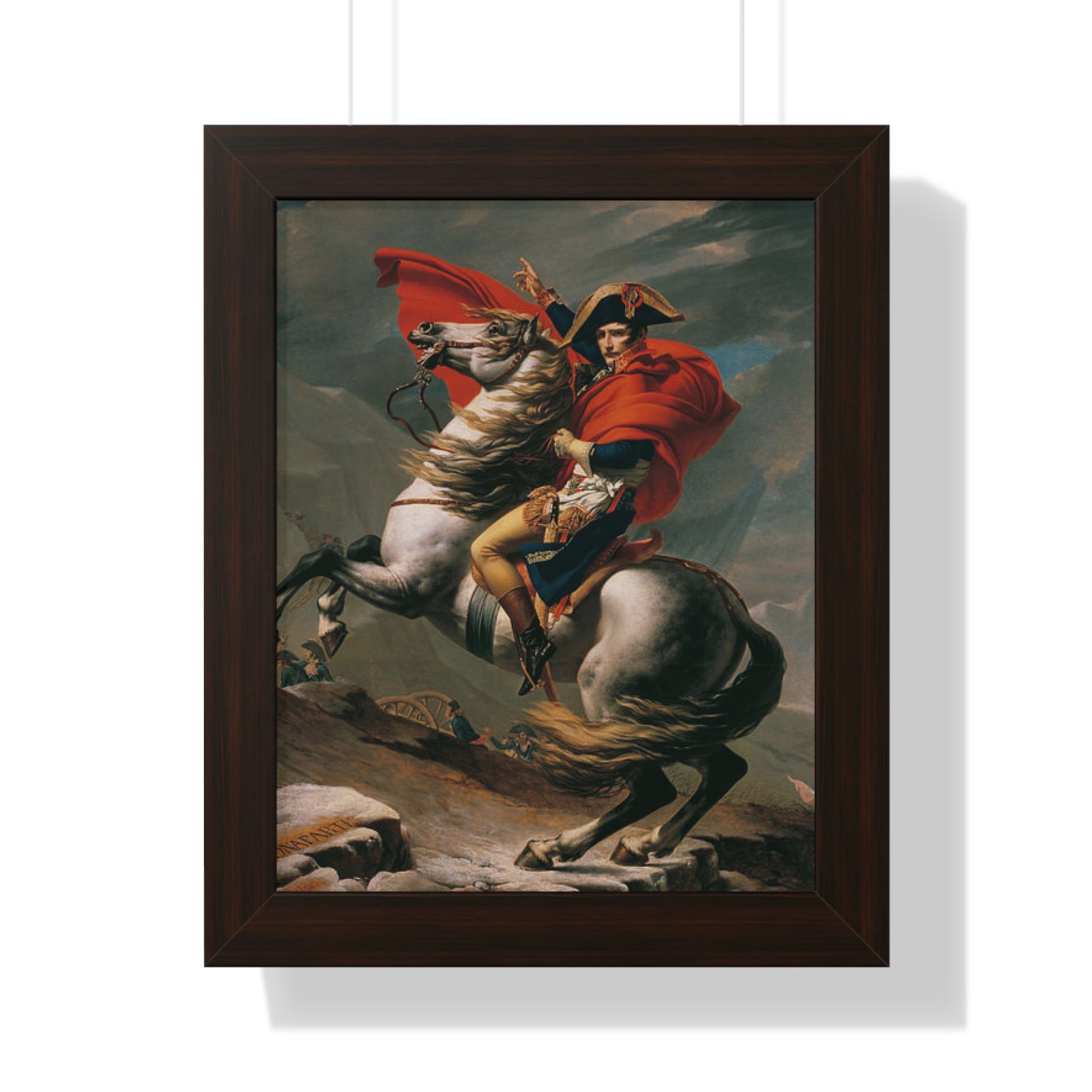 Elevate your wall decor with our Premium Framed Historical Painting of a Napoleon Bonapartecrossing the Great St. Bernard Mountain Alps on horseback by Jacques-Louis David. Available in three sophisticated colors: black, white, and walnut.
