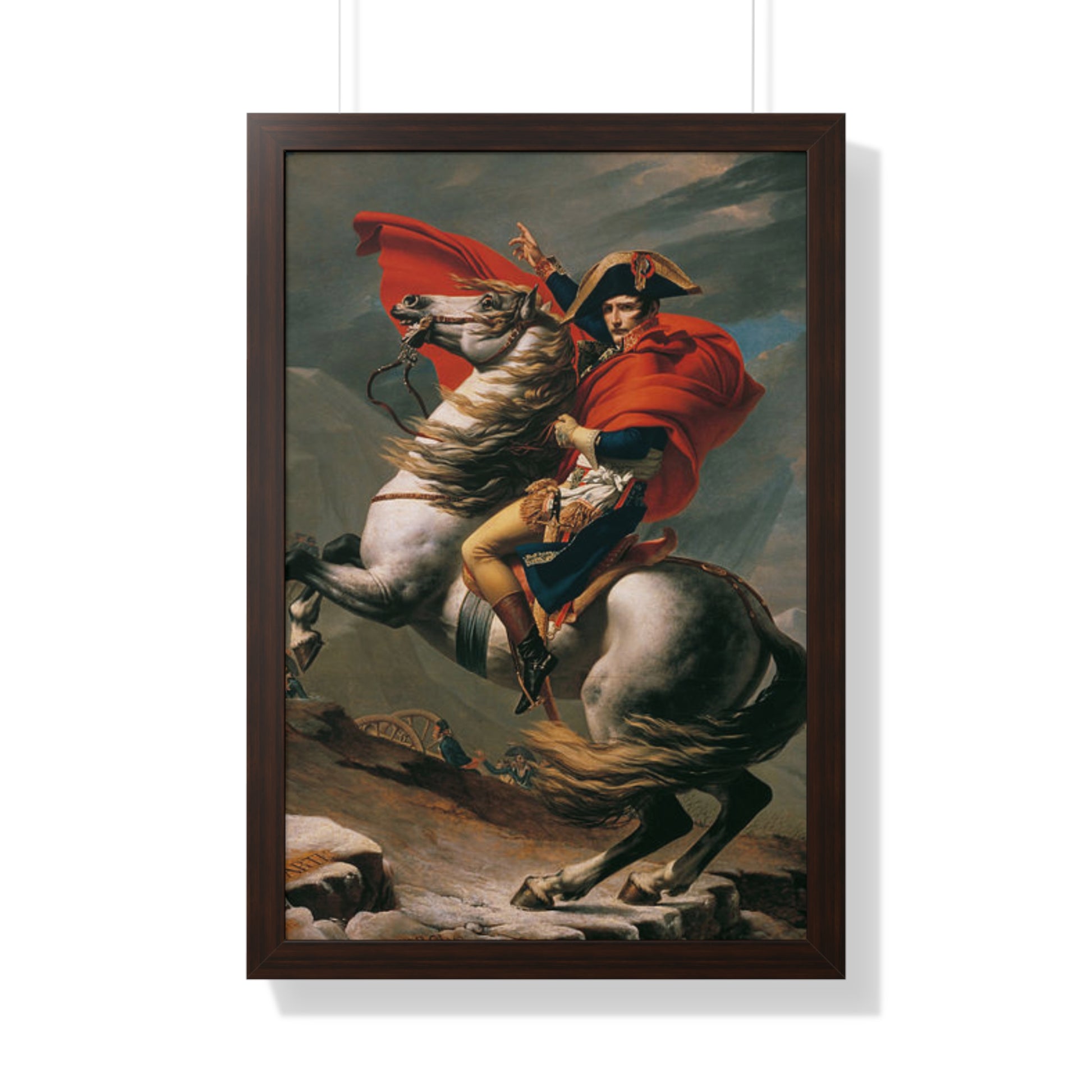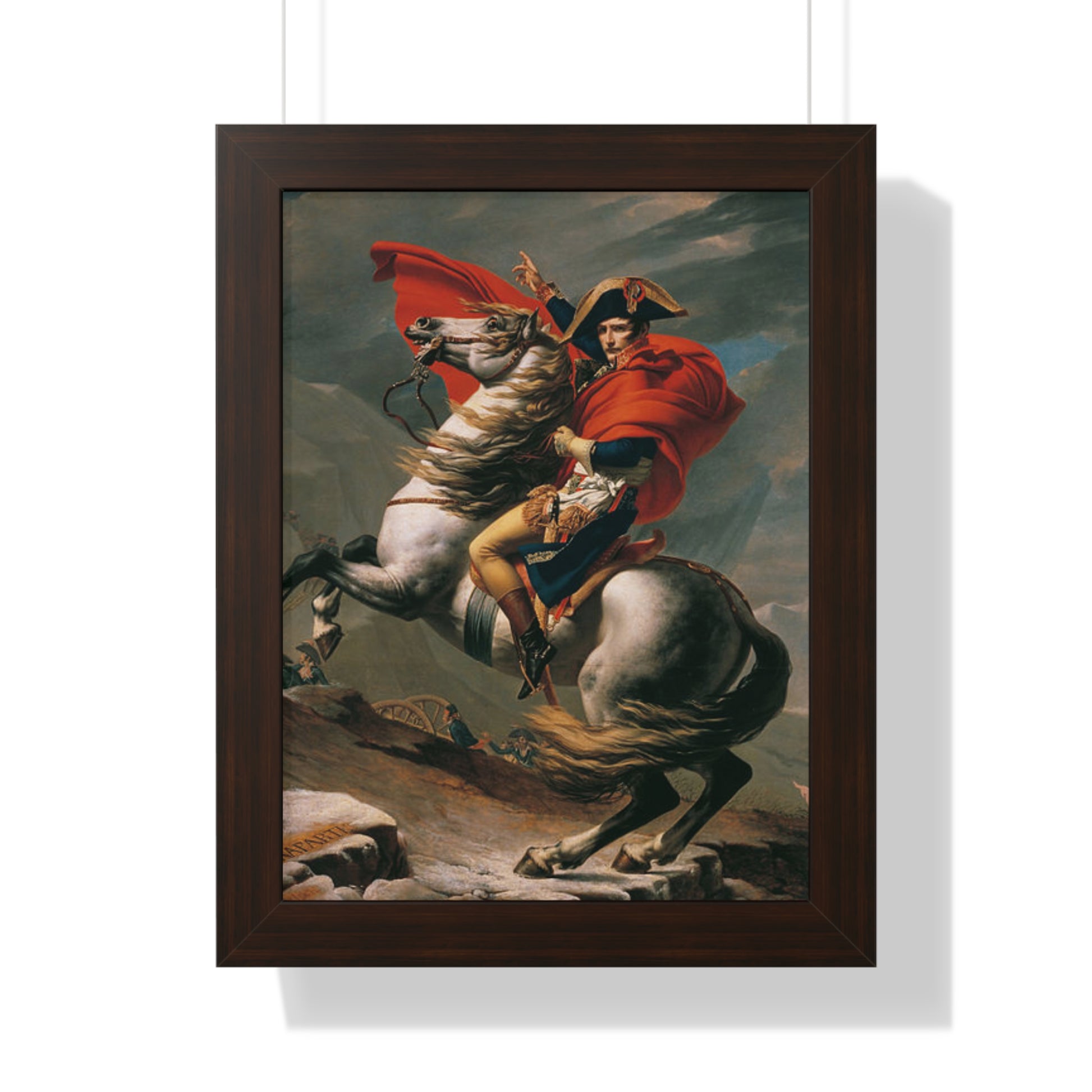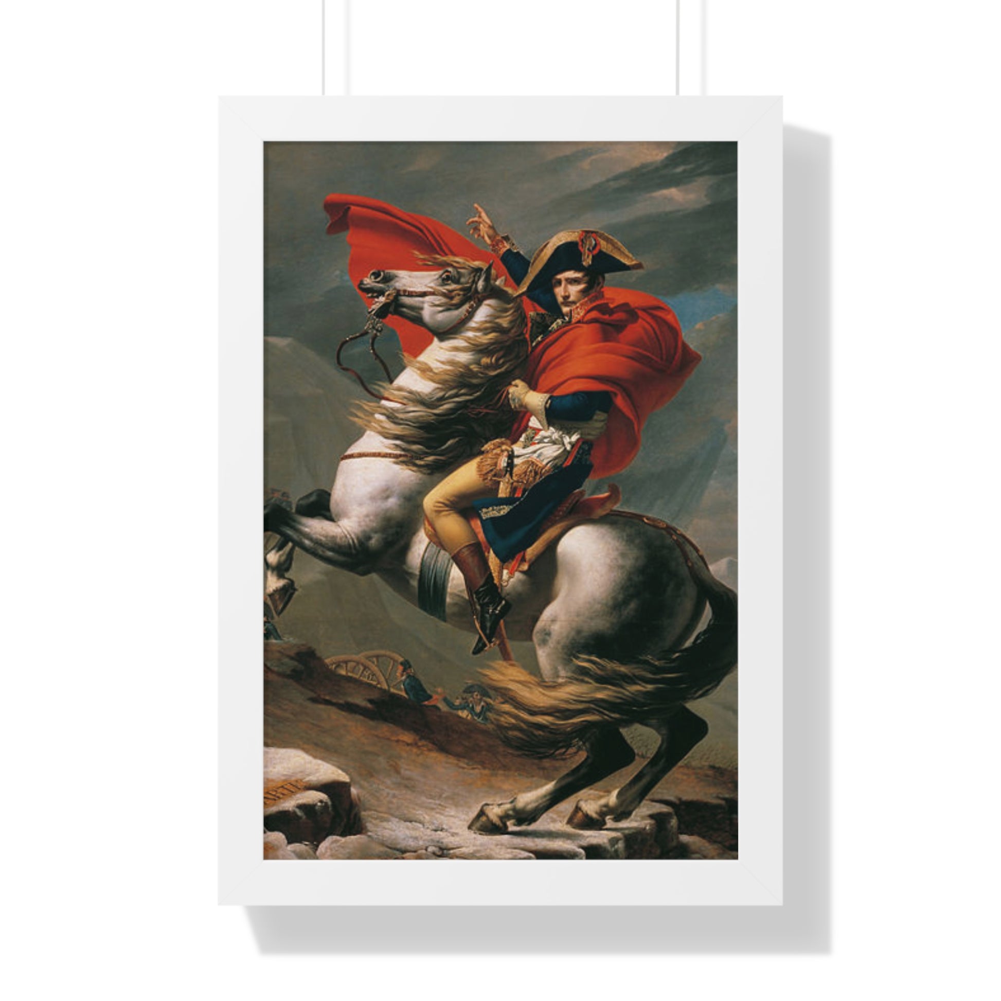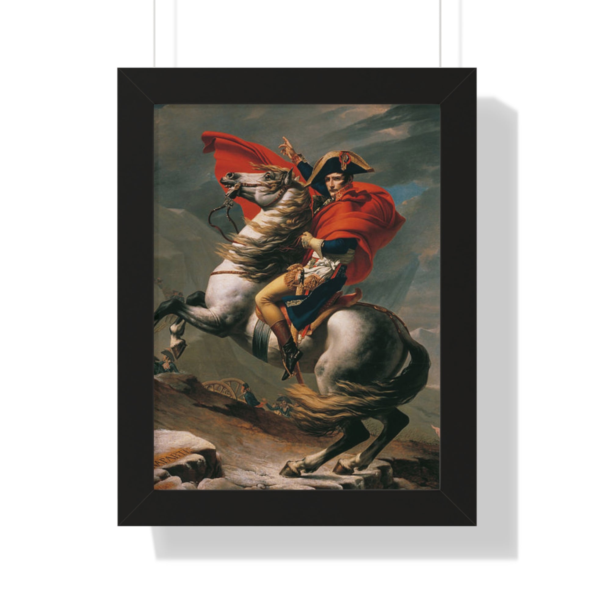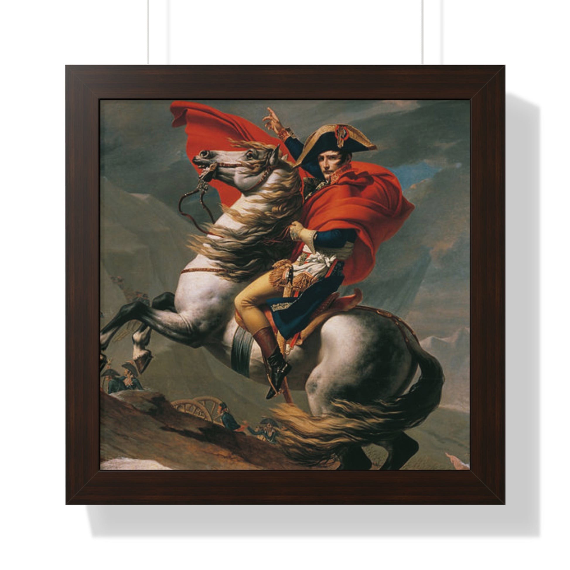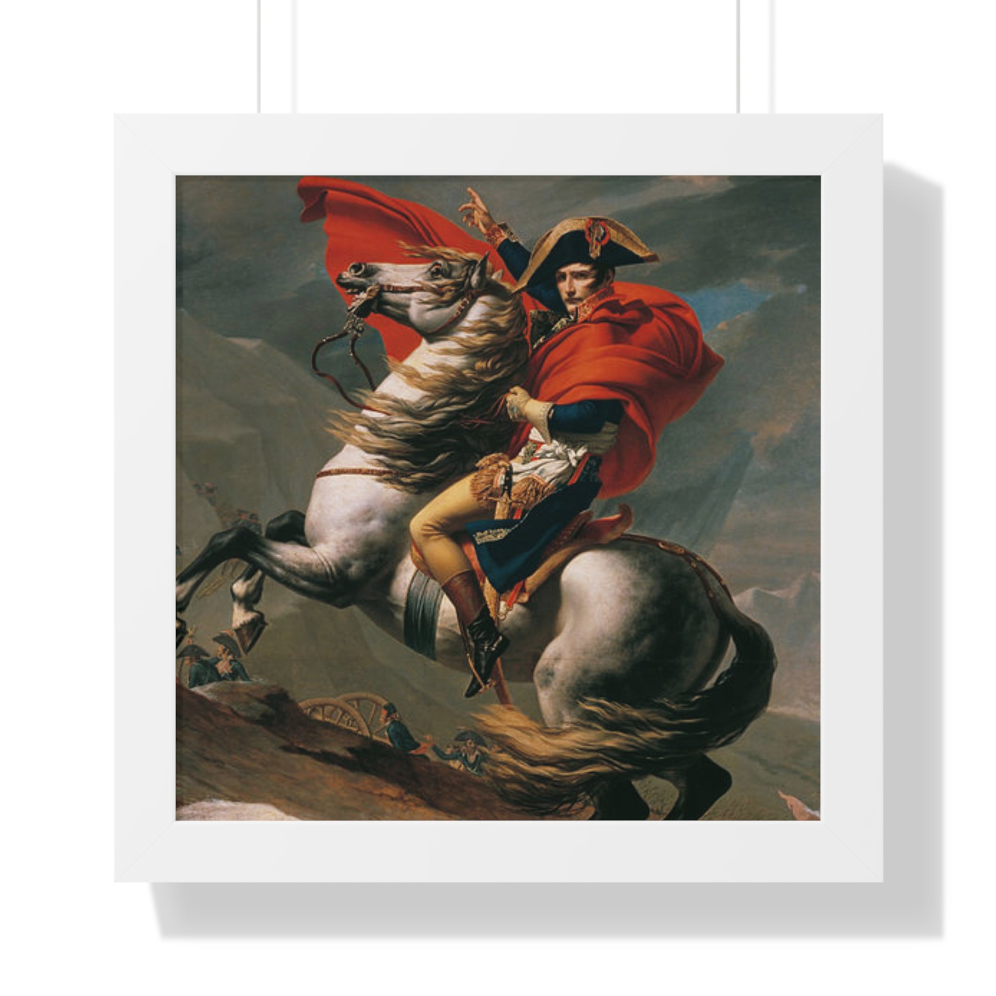 Elevate your wall decor with our Premium Framed Historical Painting of a Napoleon Bonapartecrossing the Great St. Bernard Mountain Alps on horseback by Jacques-Louis David. Available in three sophisticated colors: black, white, and walnut.