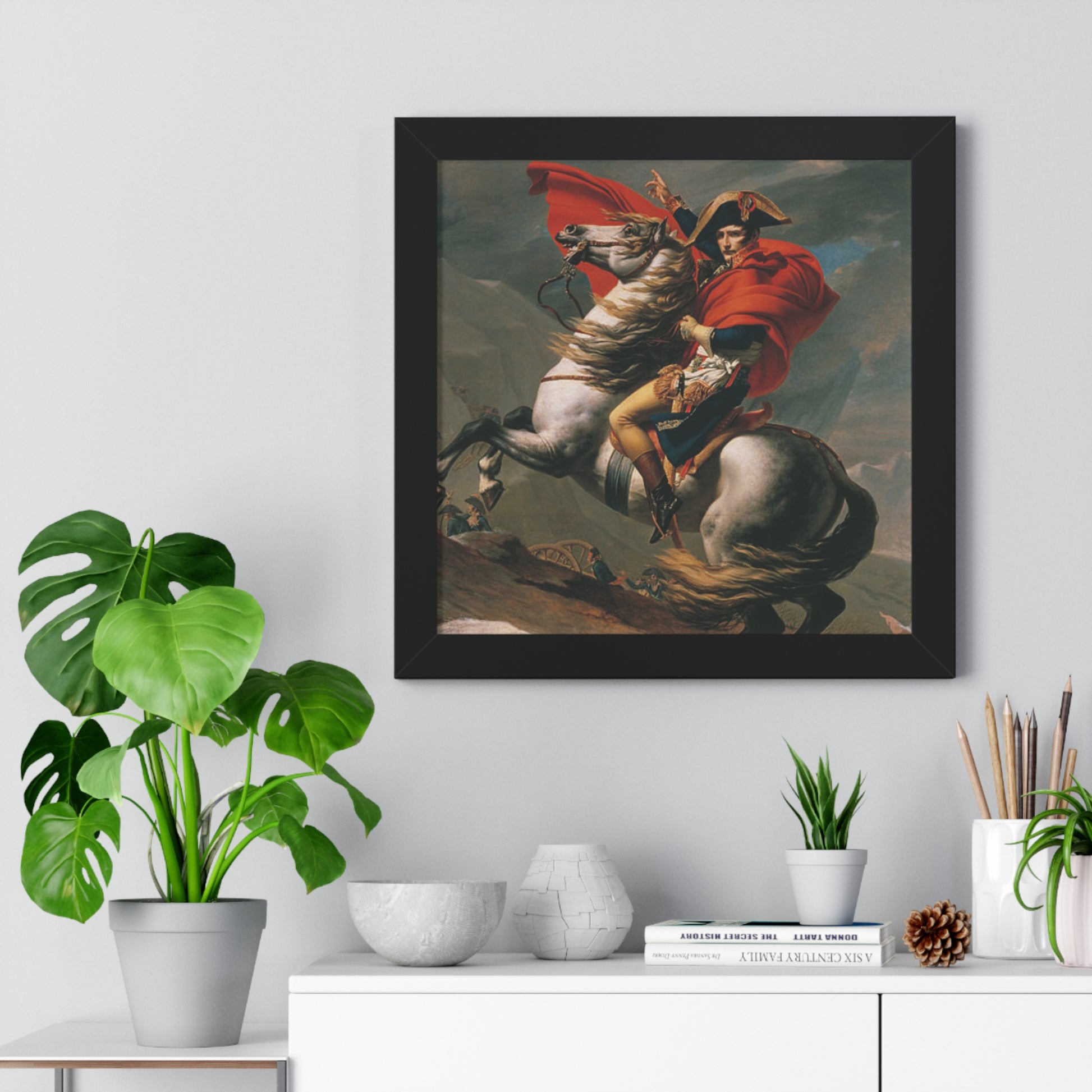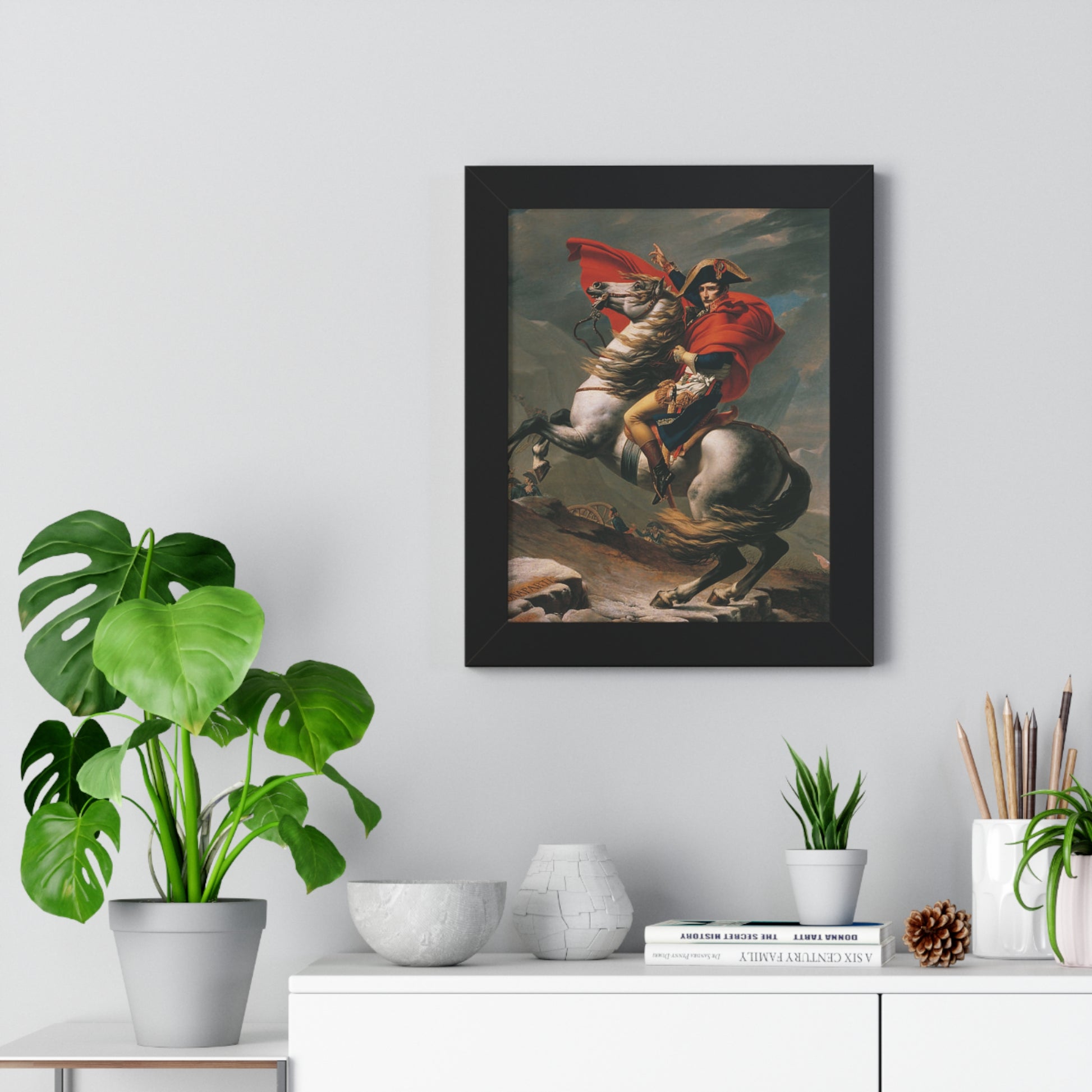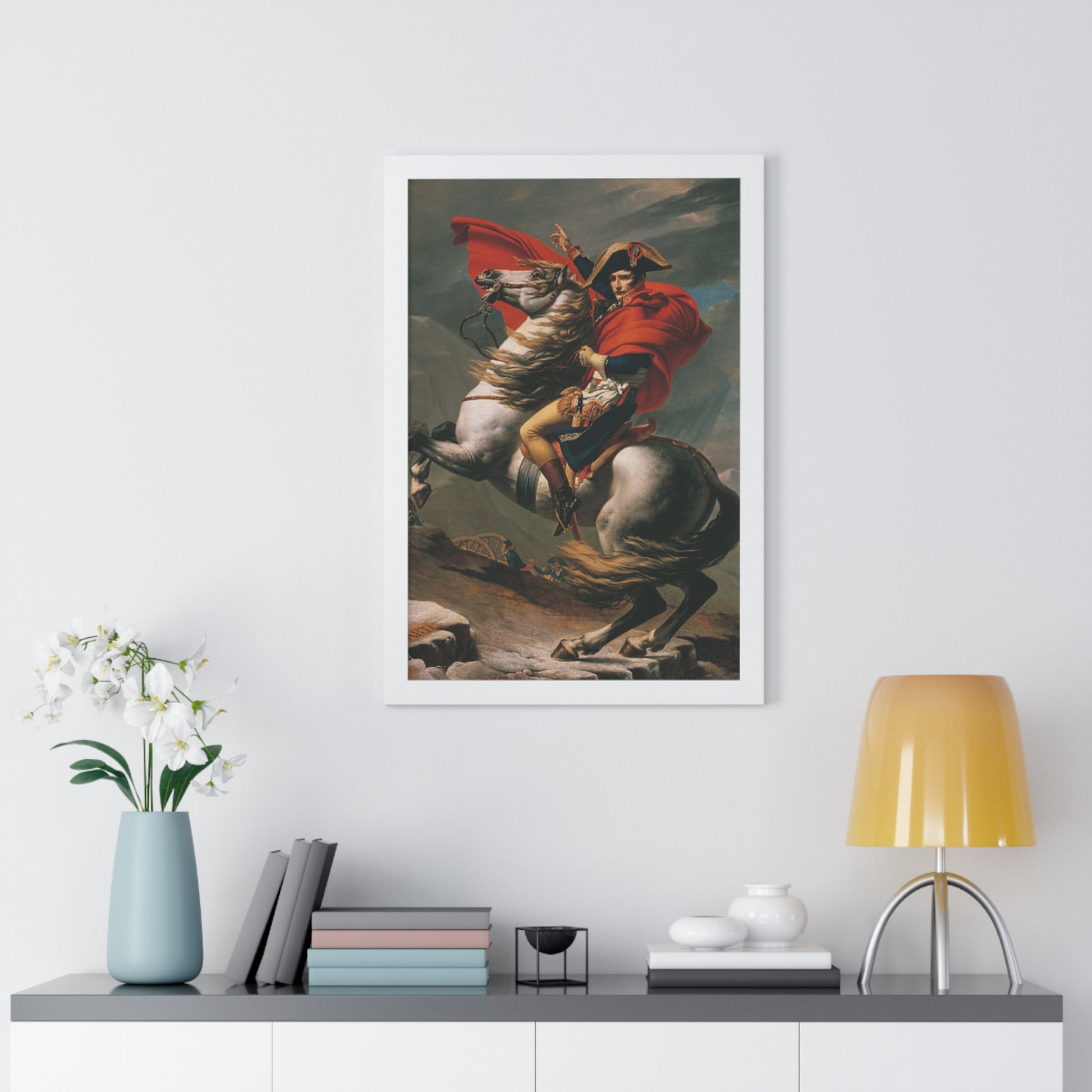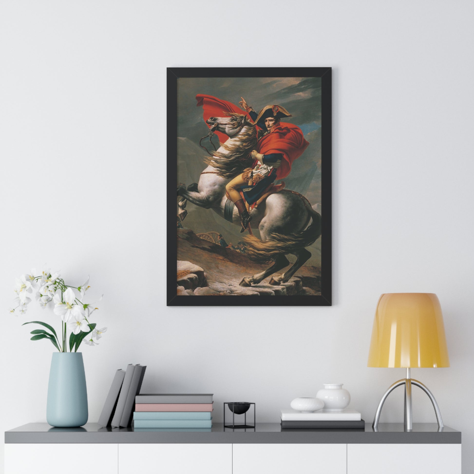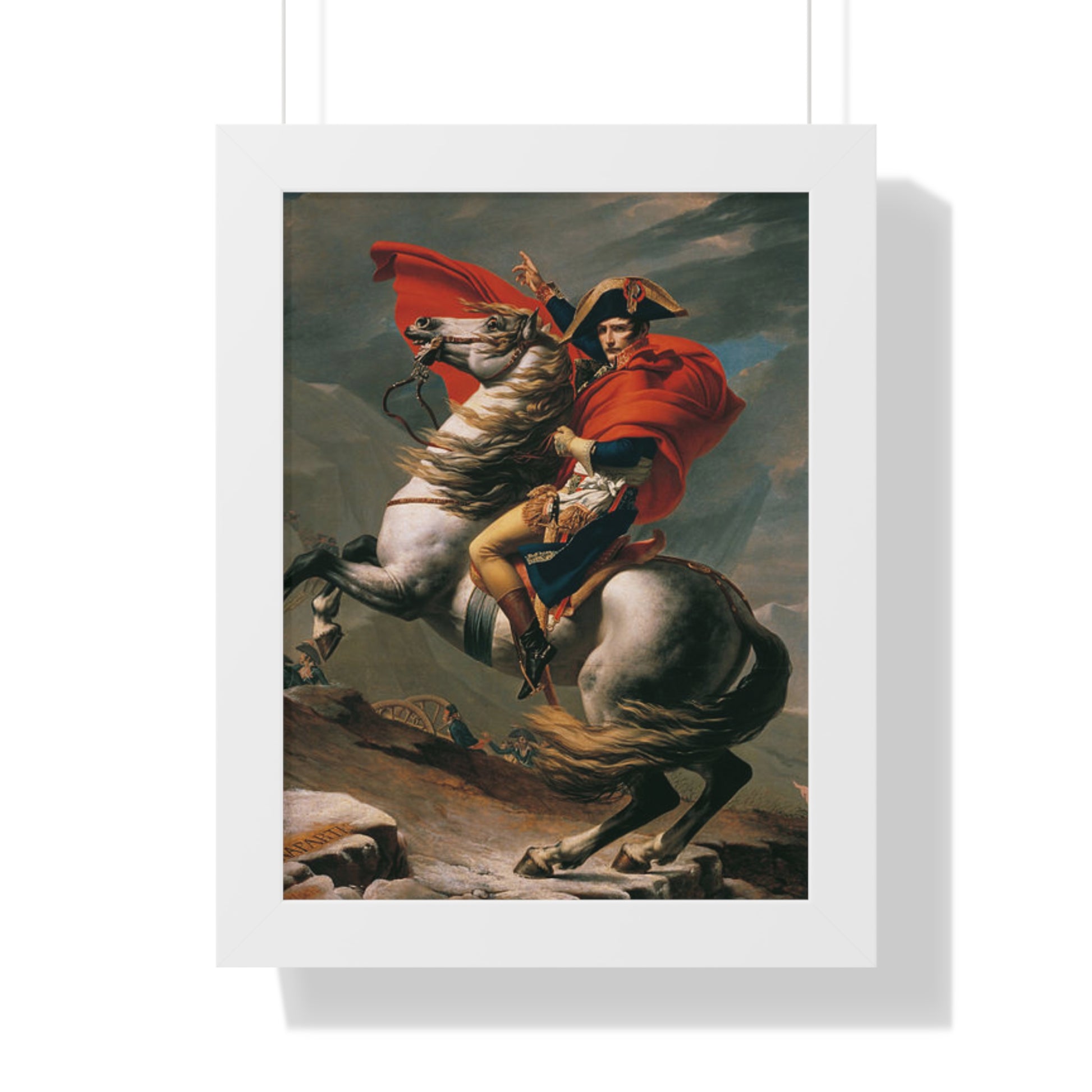 Elevate your wall decor with our Premium Framed Historical Painting of a Napoleon Bonapartecrossing the Great St. Bernard Mountain Alps on horseback by Jacques-Louis David. Available in three sophisticated colors: black, white, and walnut.