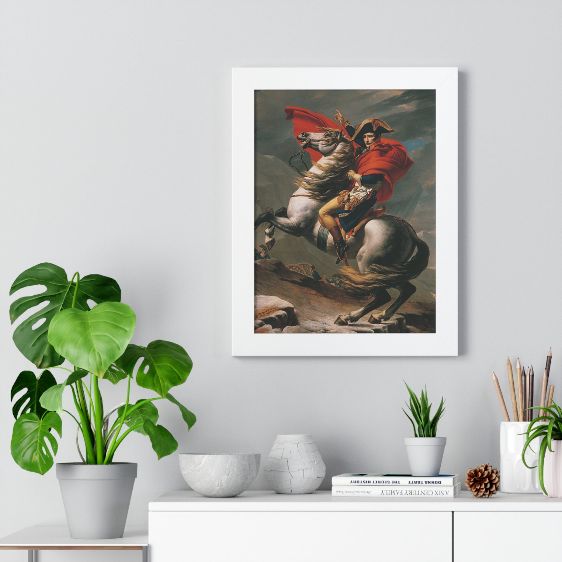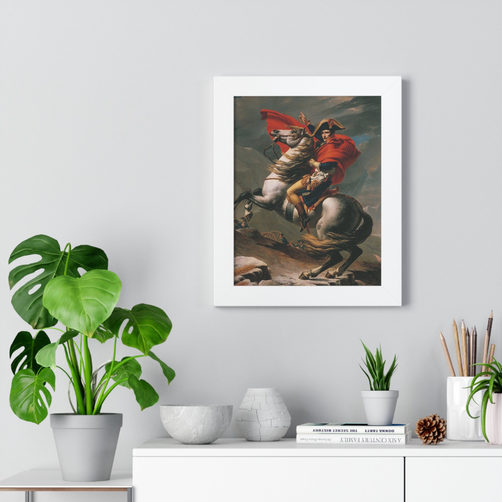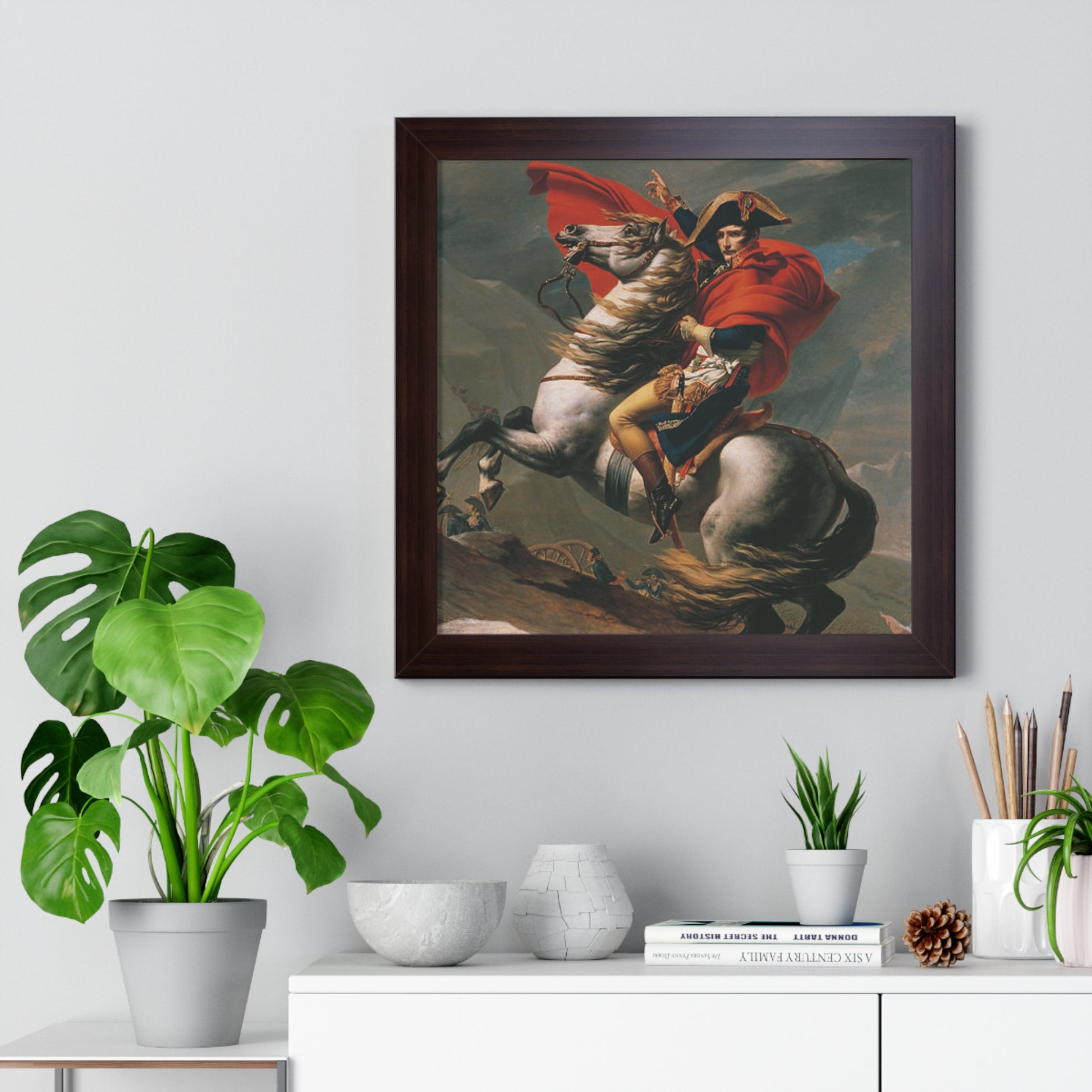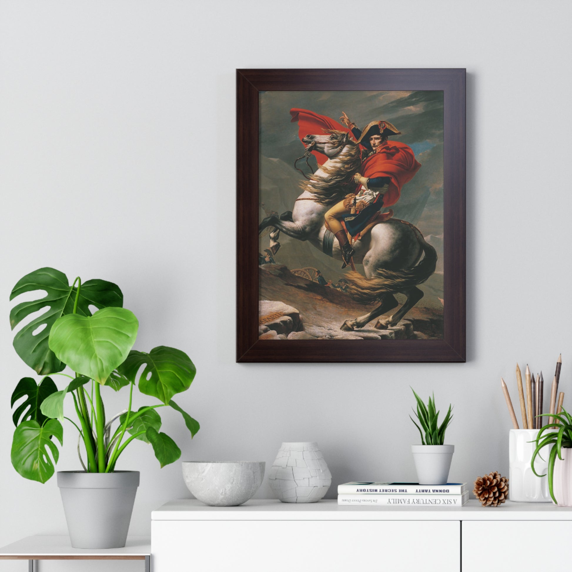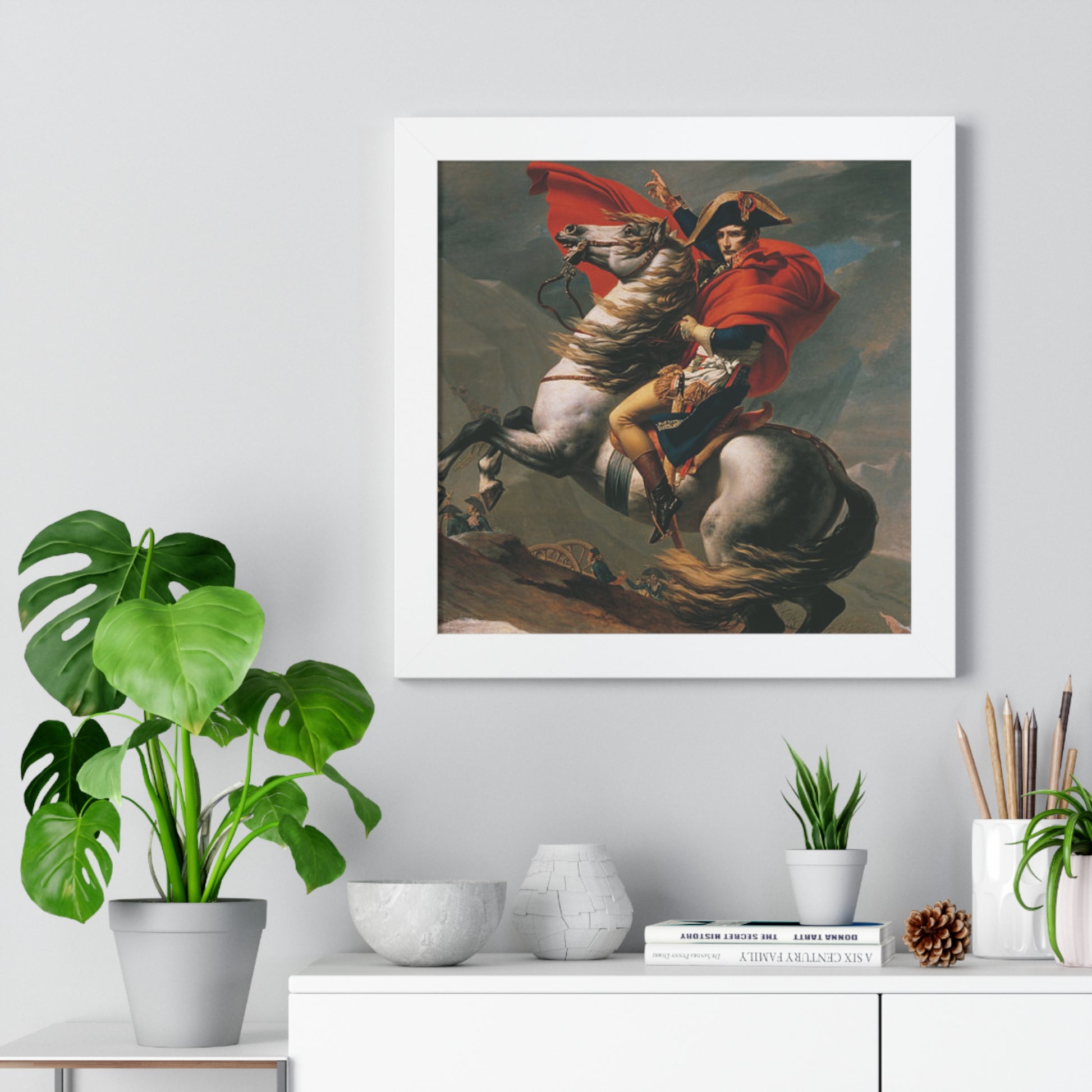 Elevate your wall decor with our Premium Framed Historical Painting of a Napoleon Bonapartecrossing the Great St. Bernard Mountain Alps on horseback by Jacques-Louis David. Available in three sophisticated colors: black, white, and walnut.