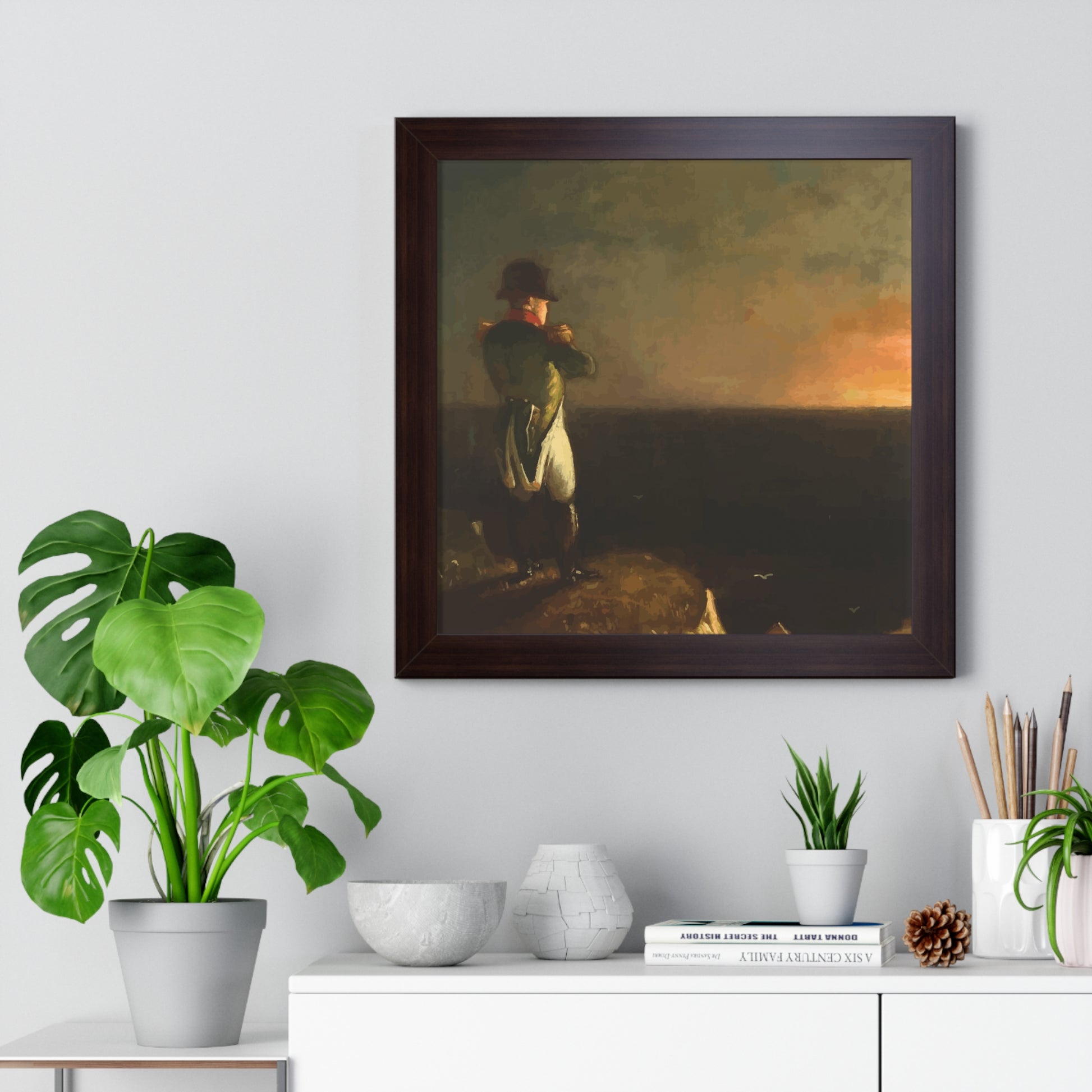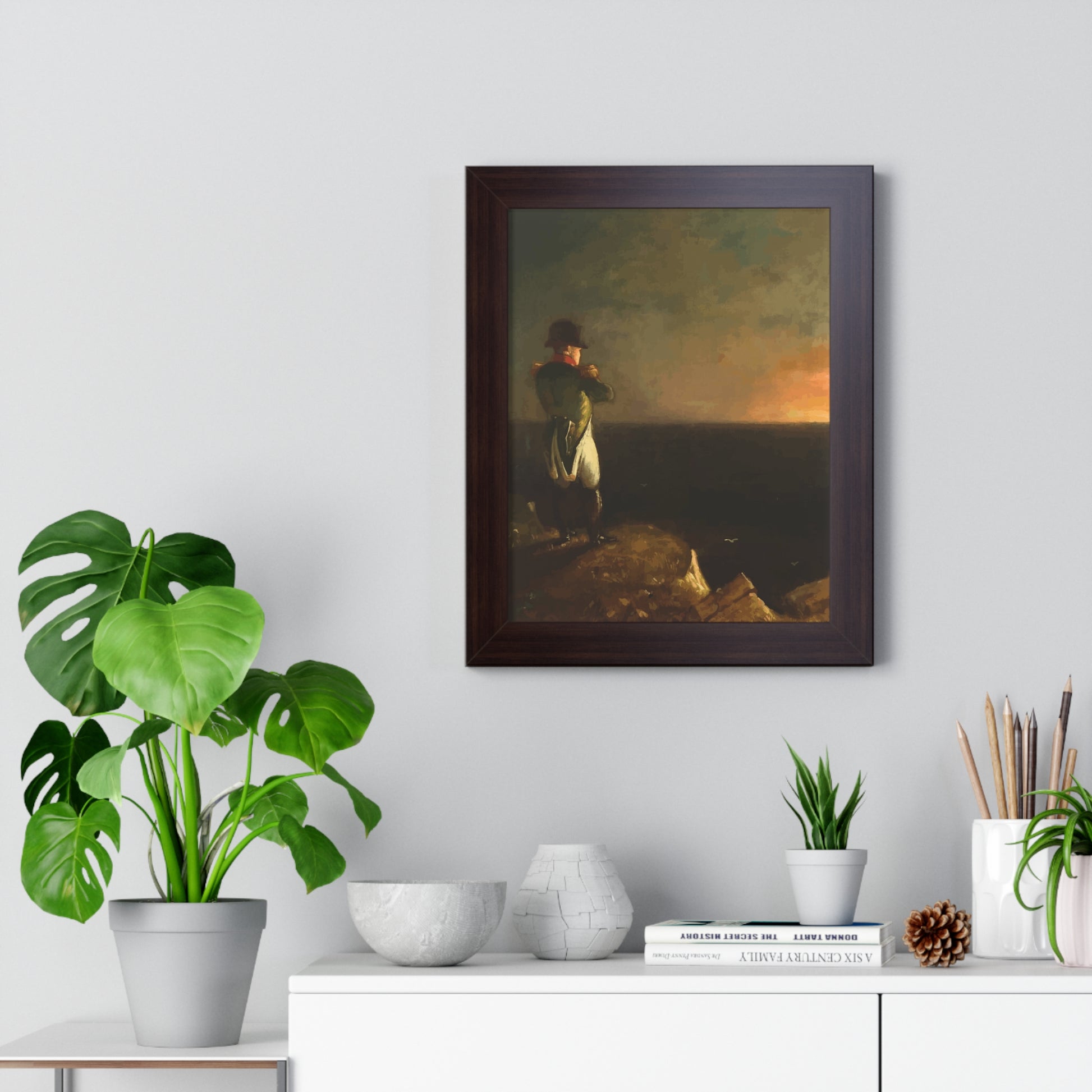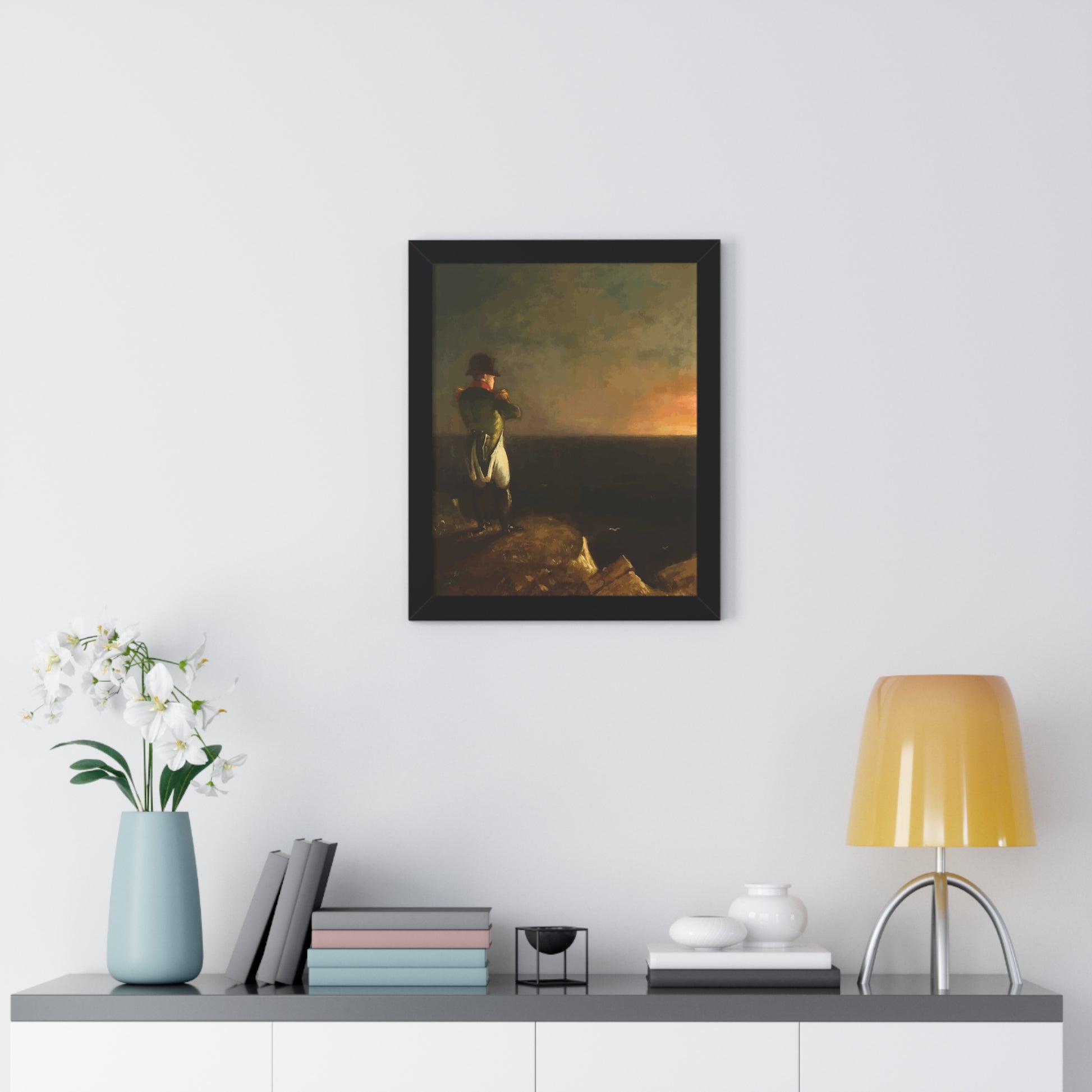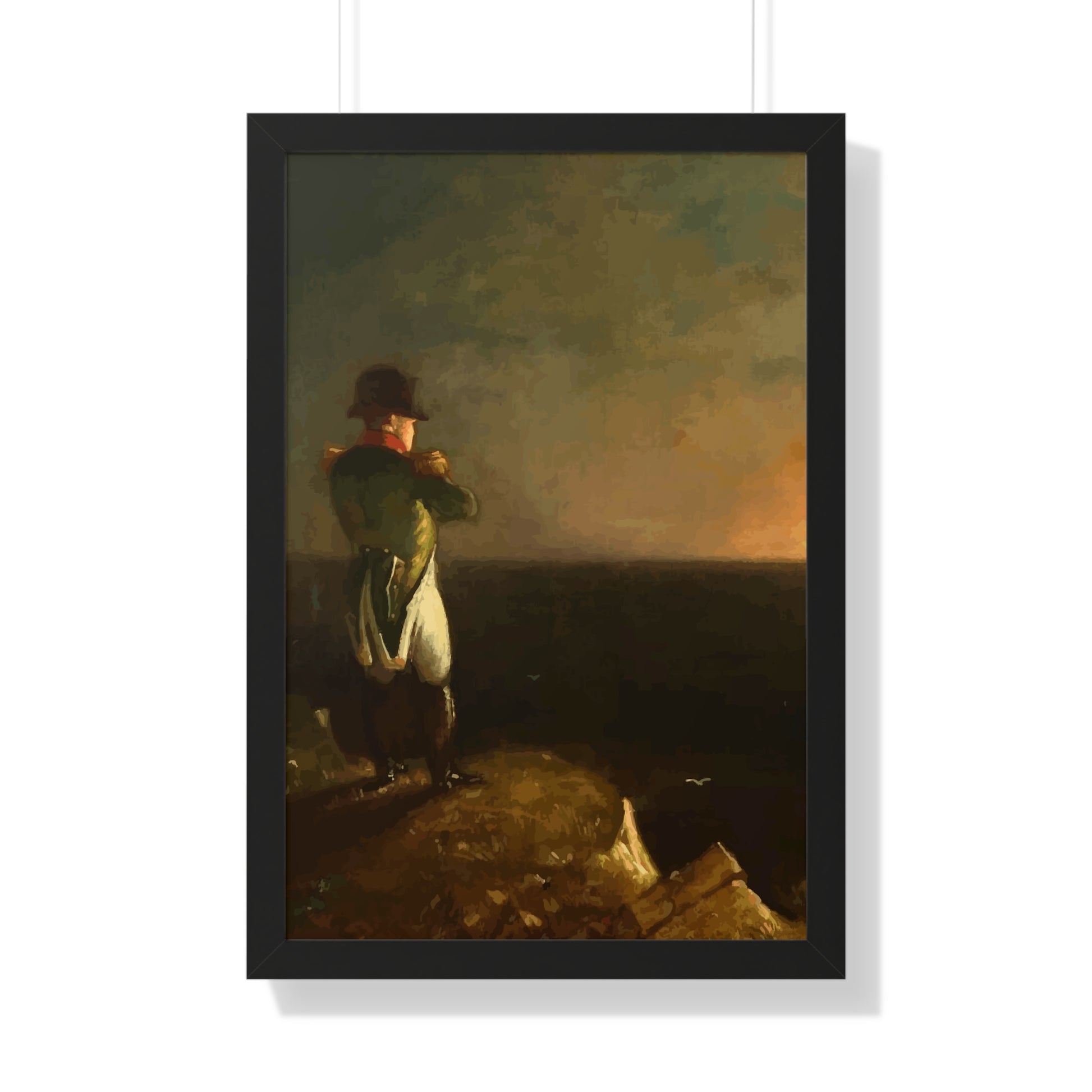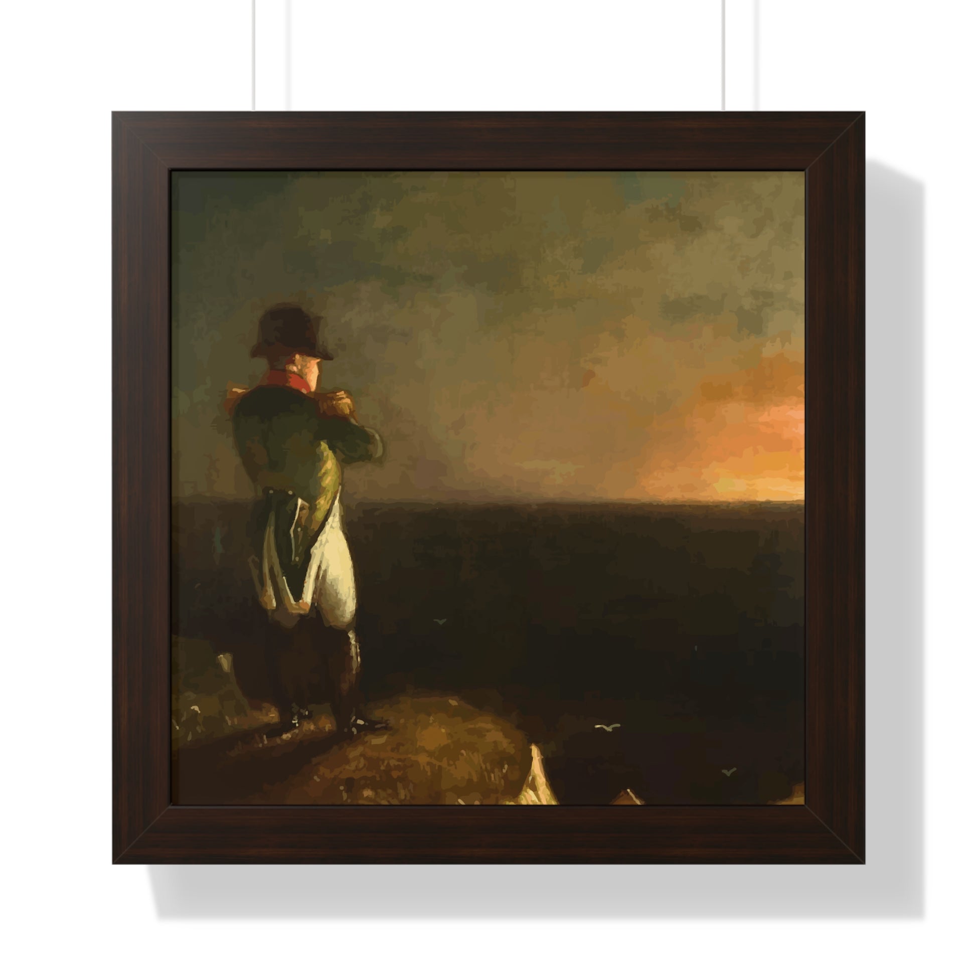 Werten Sie Ihre Wanddekoration mit unserem hochwertigen gerahmten historischen Gemälde „Napoleon im Exil auf St. Helena“, gemalt von Benjamin Robert Haydron, auf. Erhältlich in drei eleganten Farben: Schwarz, Weiß und Walnuss.