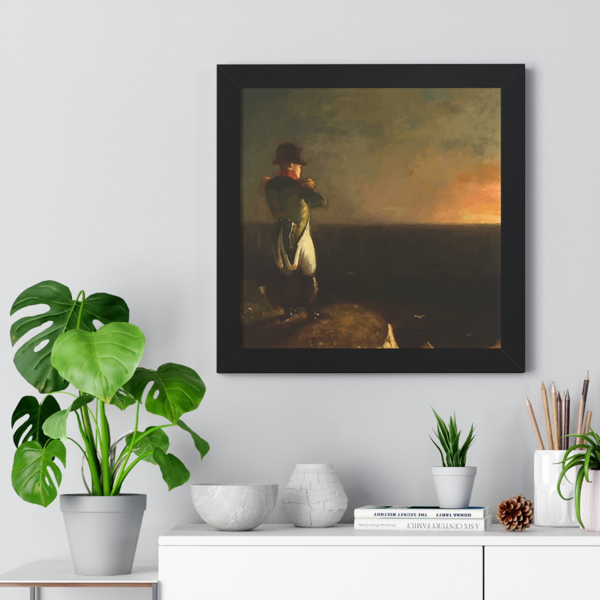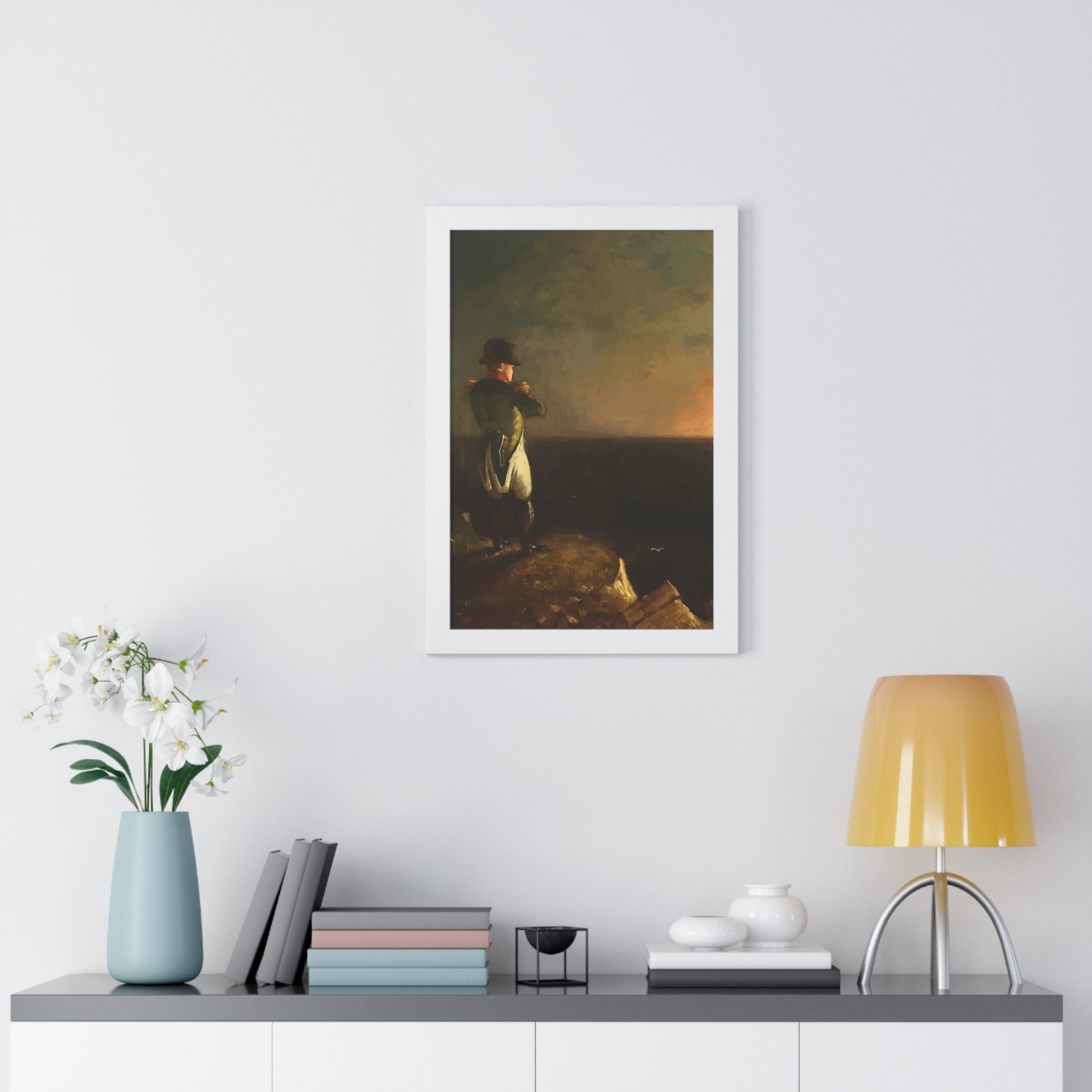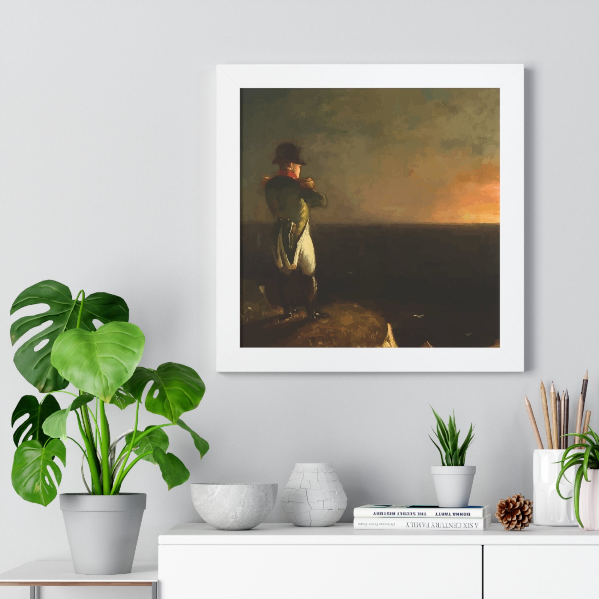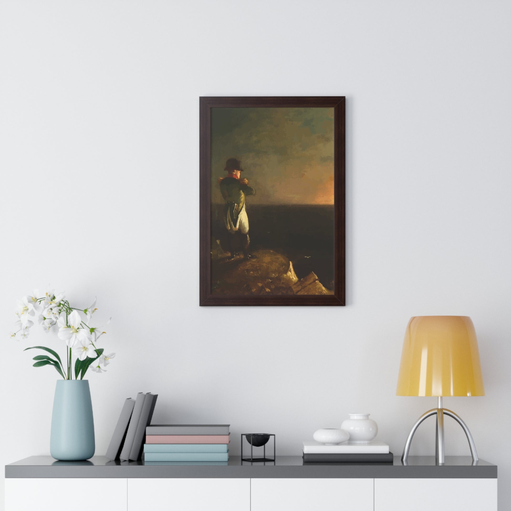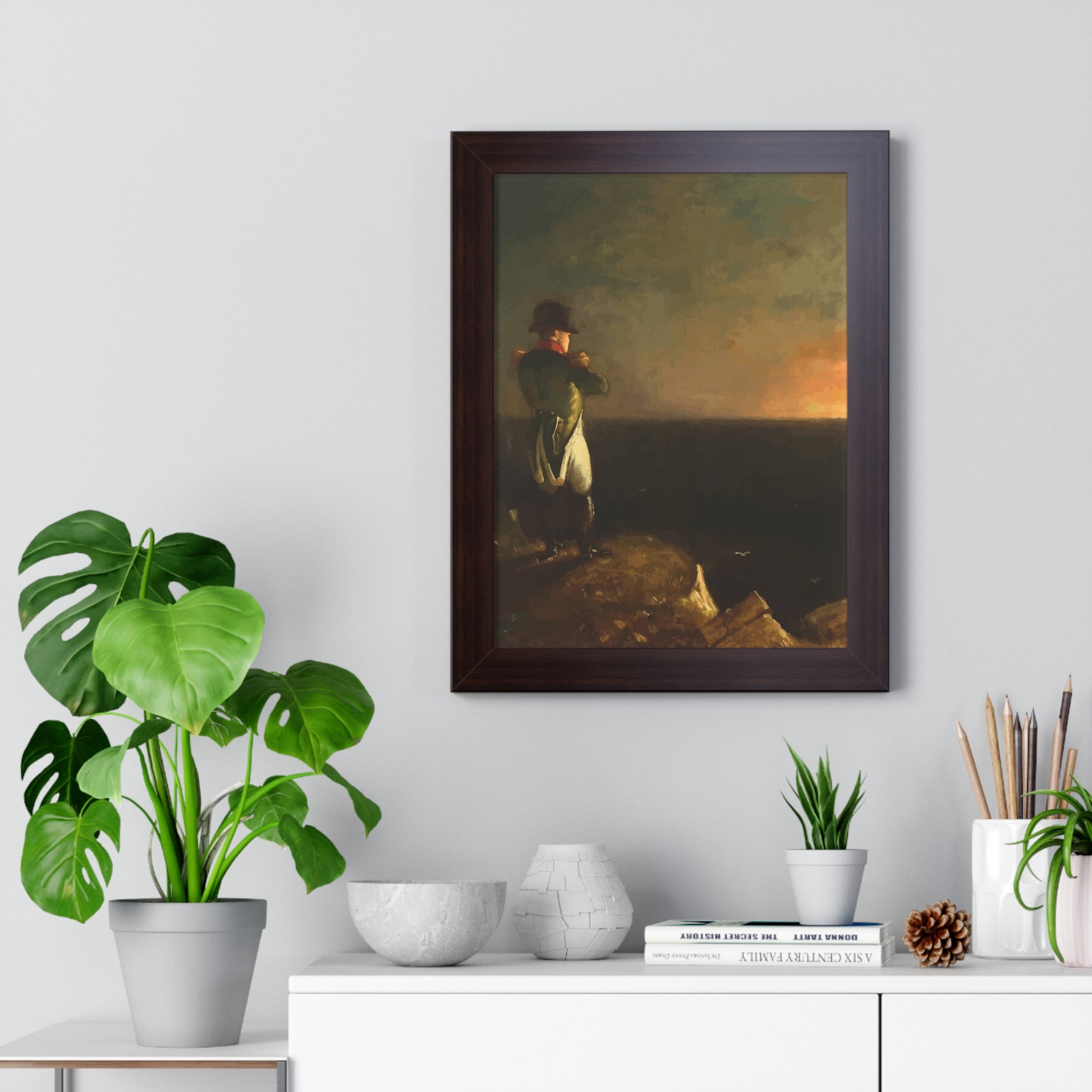 Werten Sie Ihre Wanddekoration mit unserem hochwertigen gerahmten historischen Gemälde „Napoleon im Exil auf St. Helena“, gemalt von Benjamin Robert Haydron, auf. Erhältlich in drei eleganten Farben: Schwarz, Weiß und Walnuss.