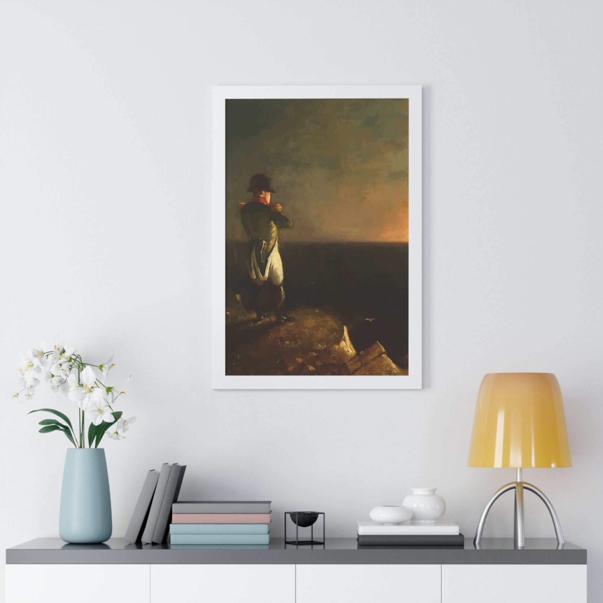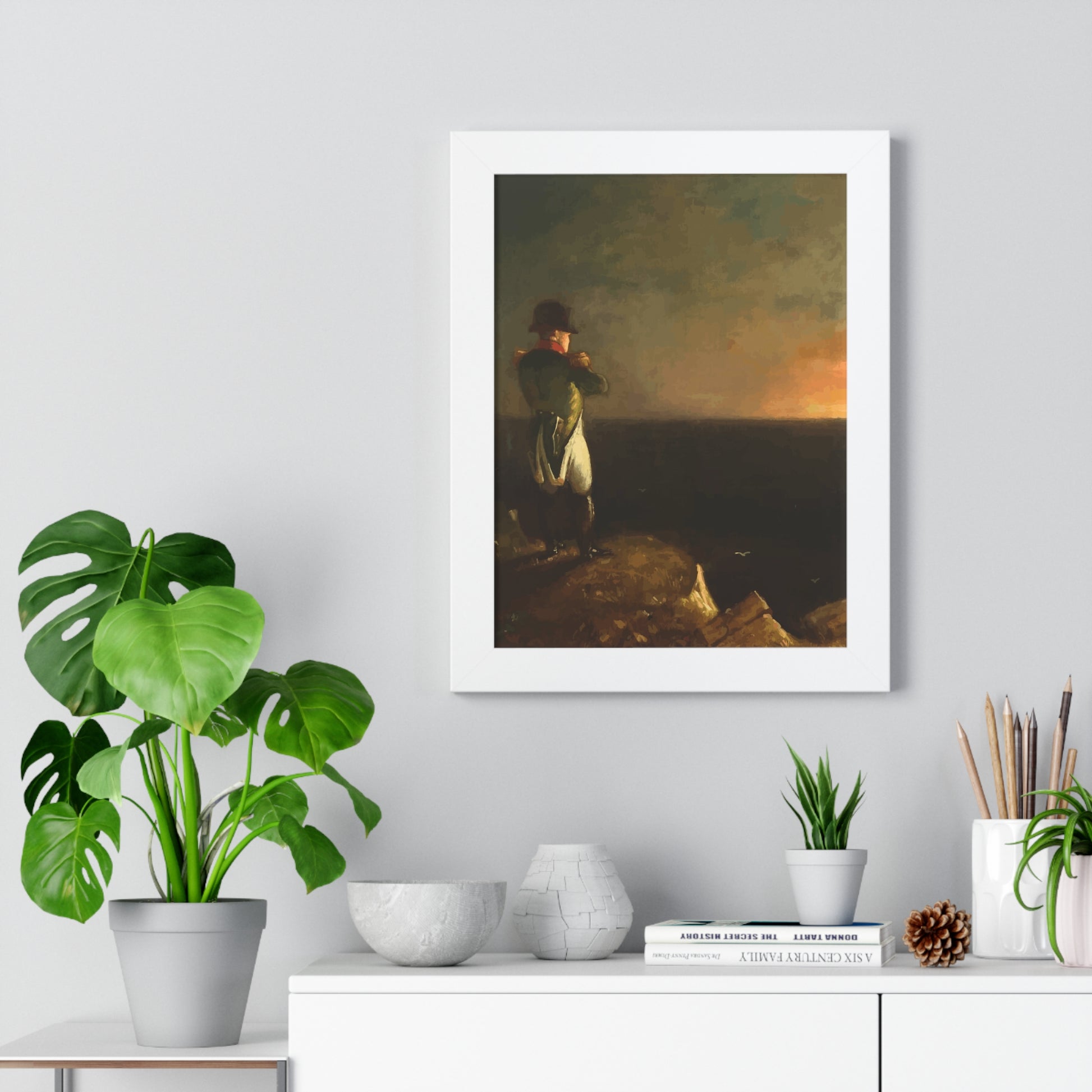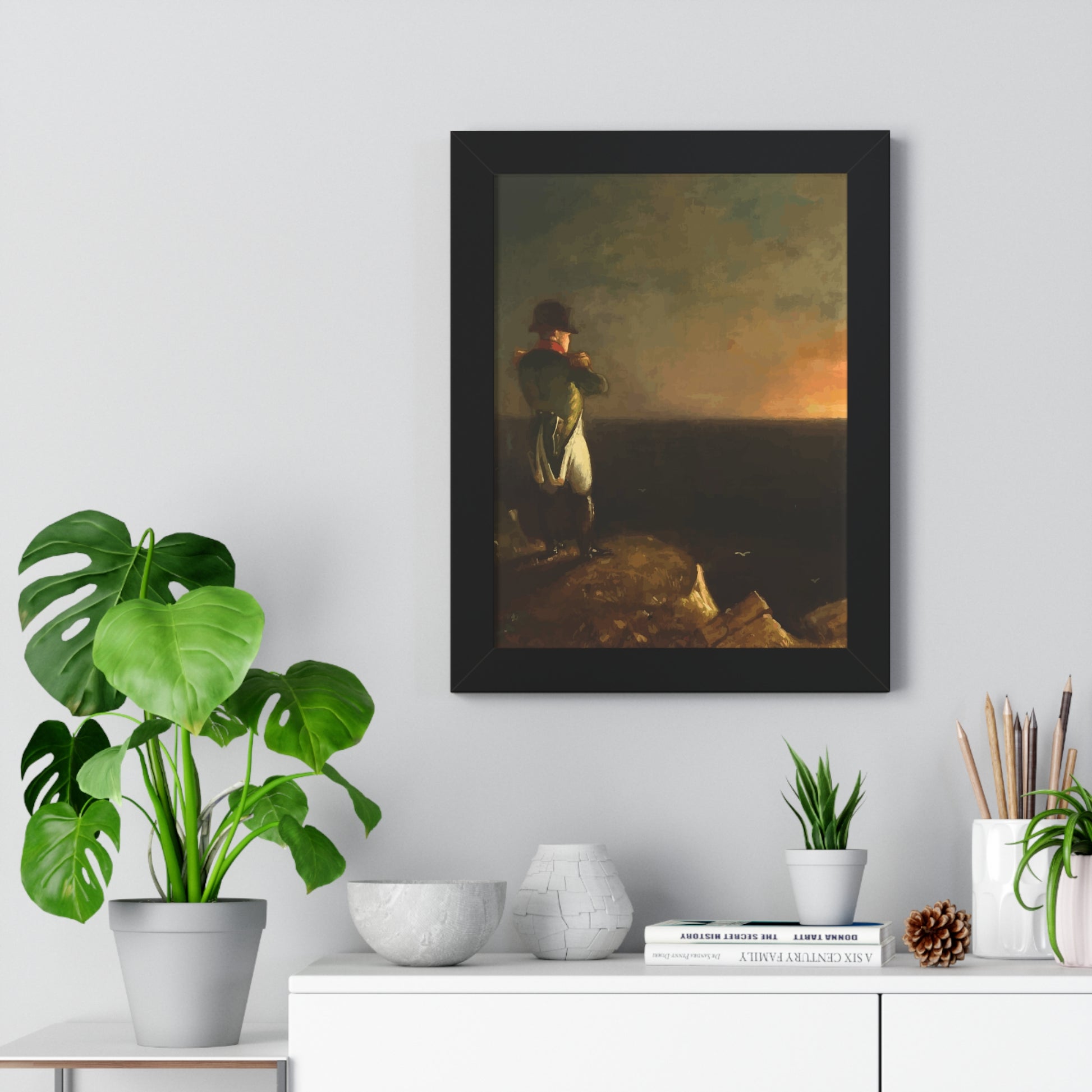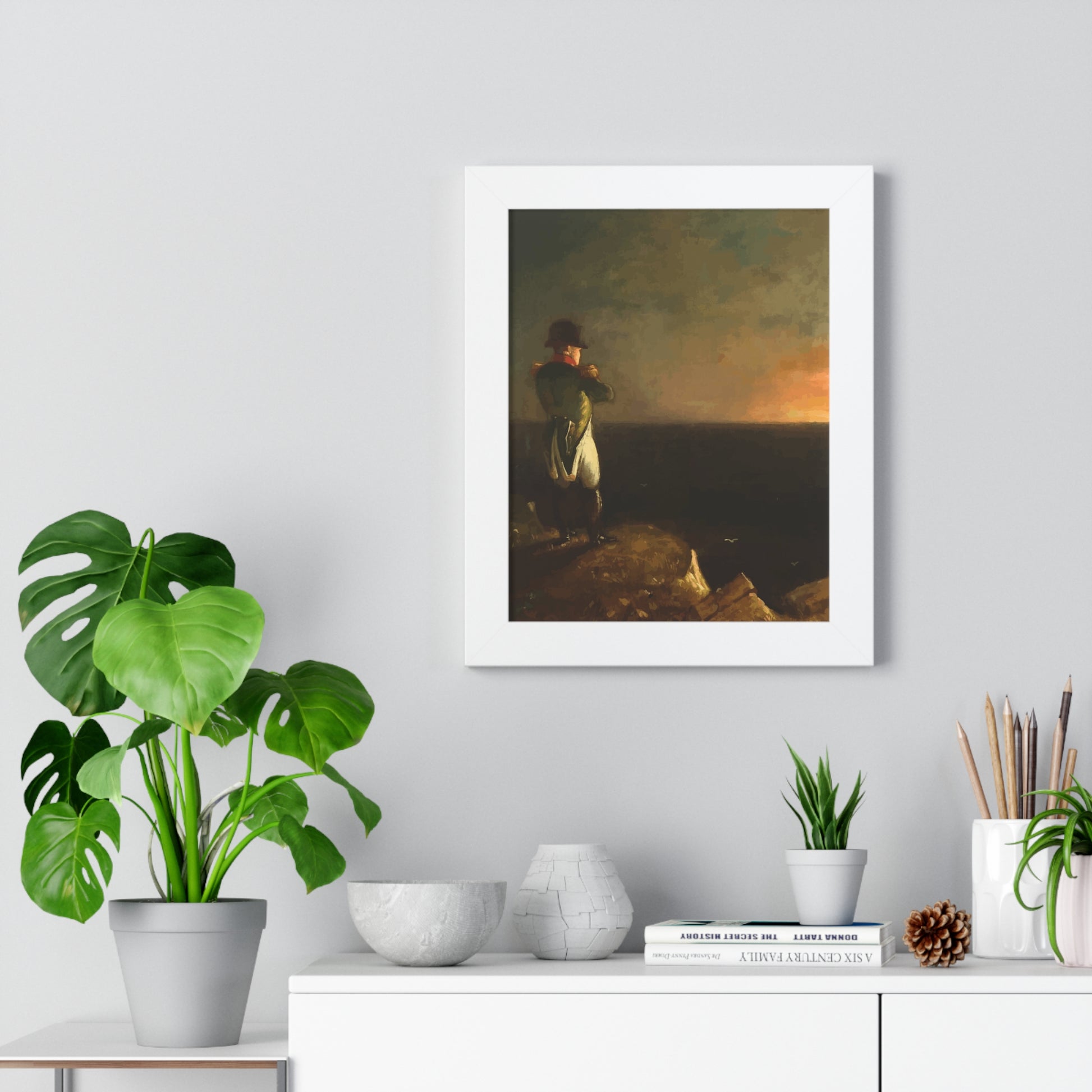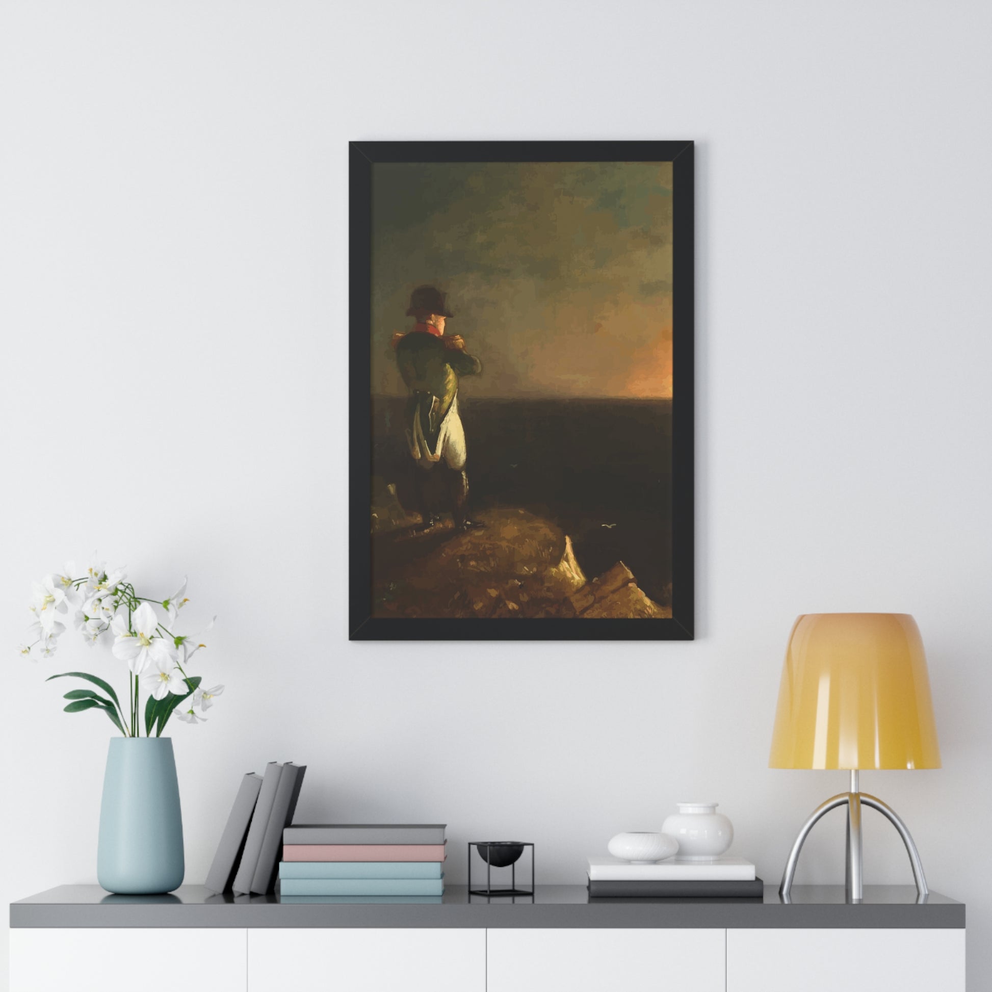 Werten Sie Ihre Wanddekoration mit unserem hochwertigen gerahmten historischen Gemälde „Napoleon im Exil auf St. Helena“, gemalt von Benjamin Robert Haydron, auf. Erhältlich in drei eleganten Farben: Schwarz, Weiß und Walnuss.