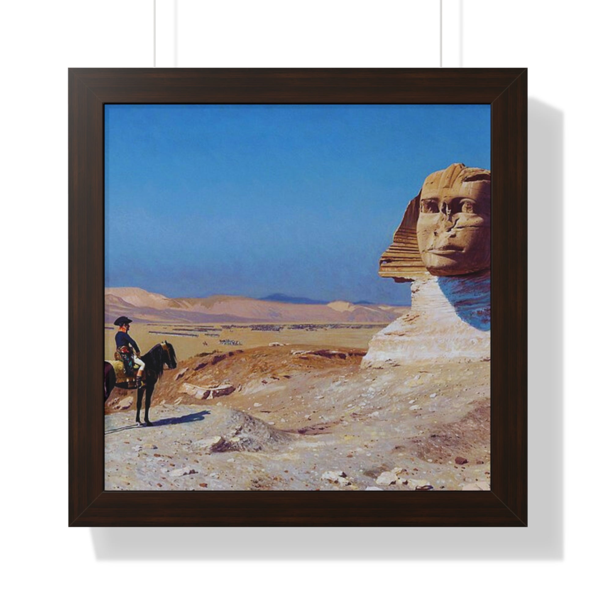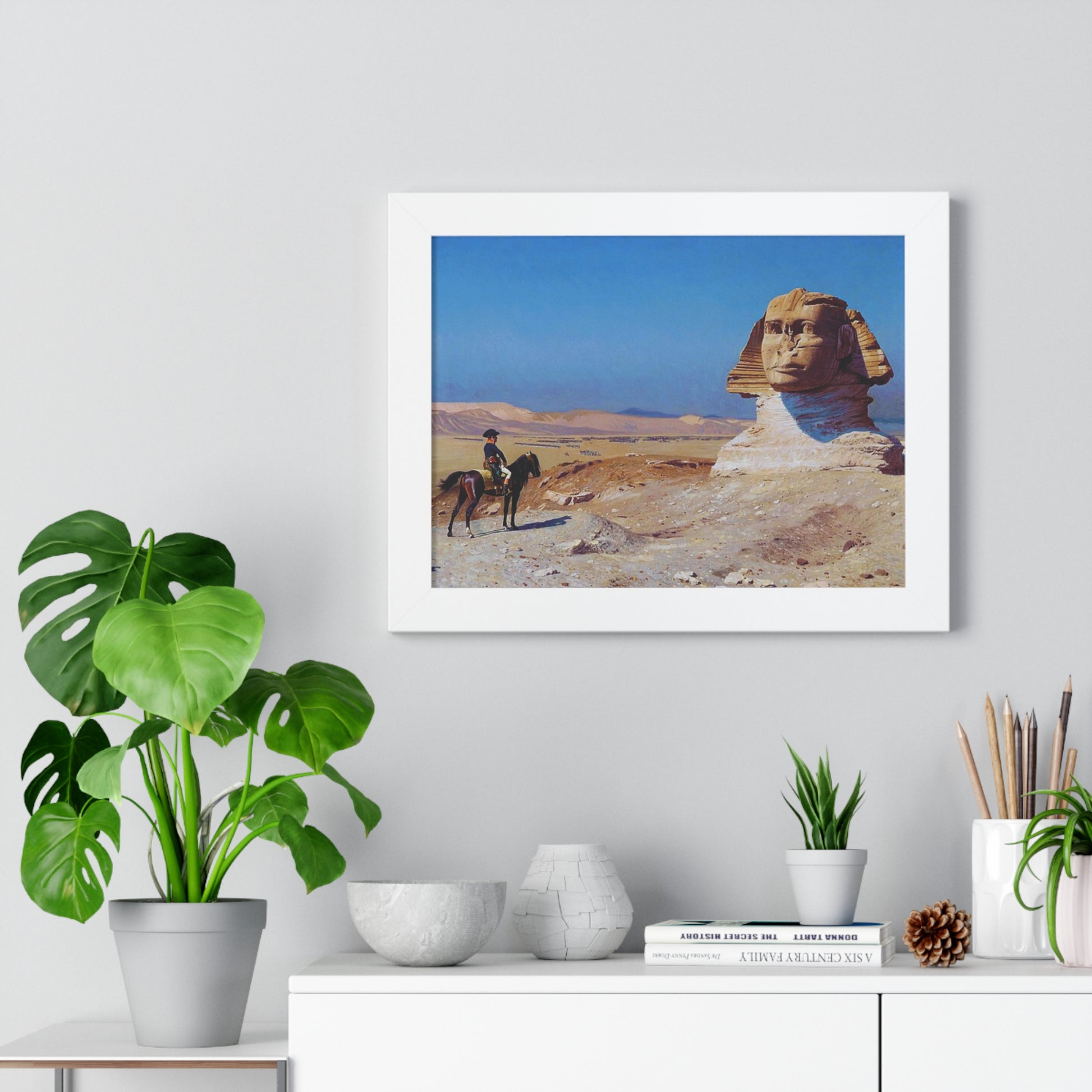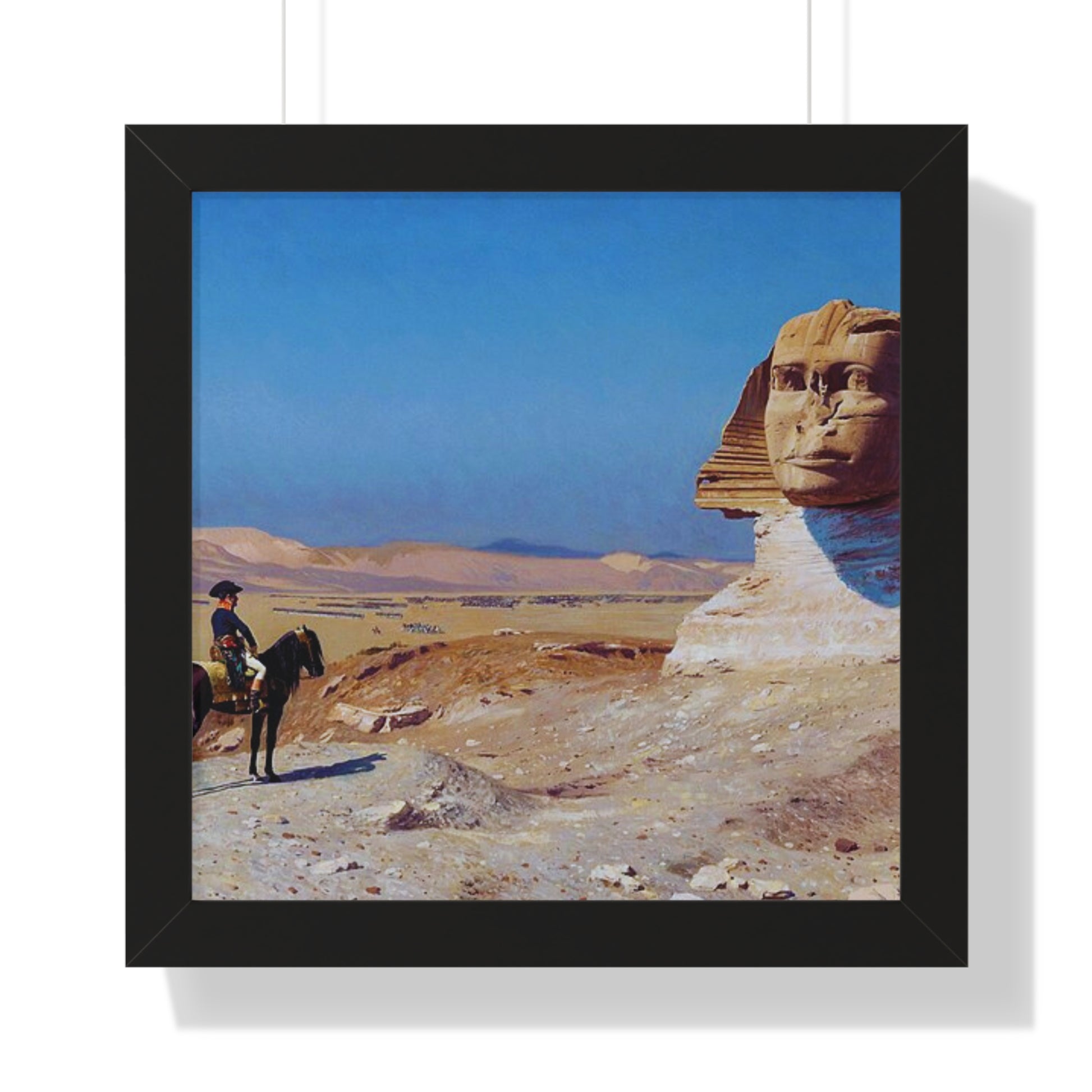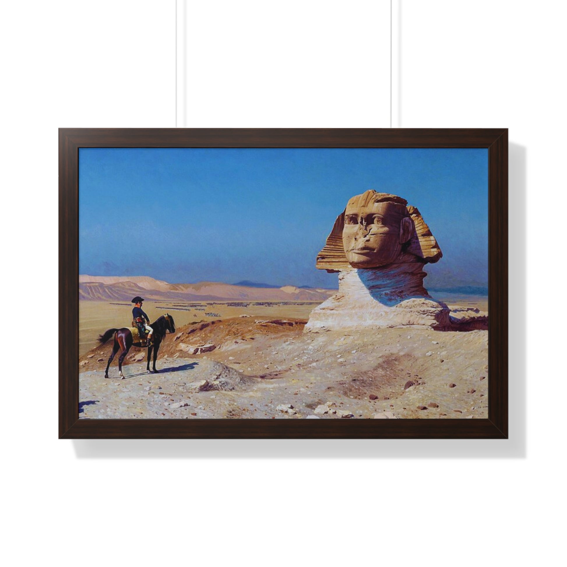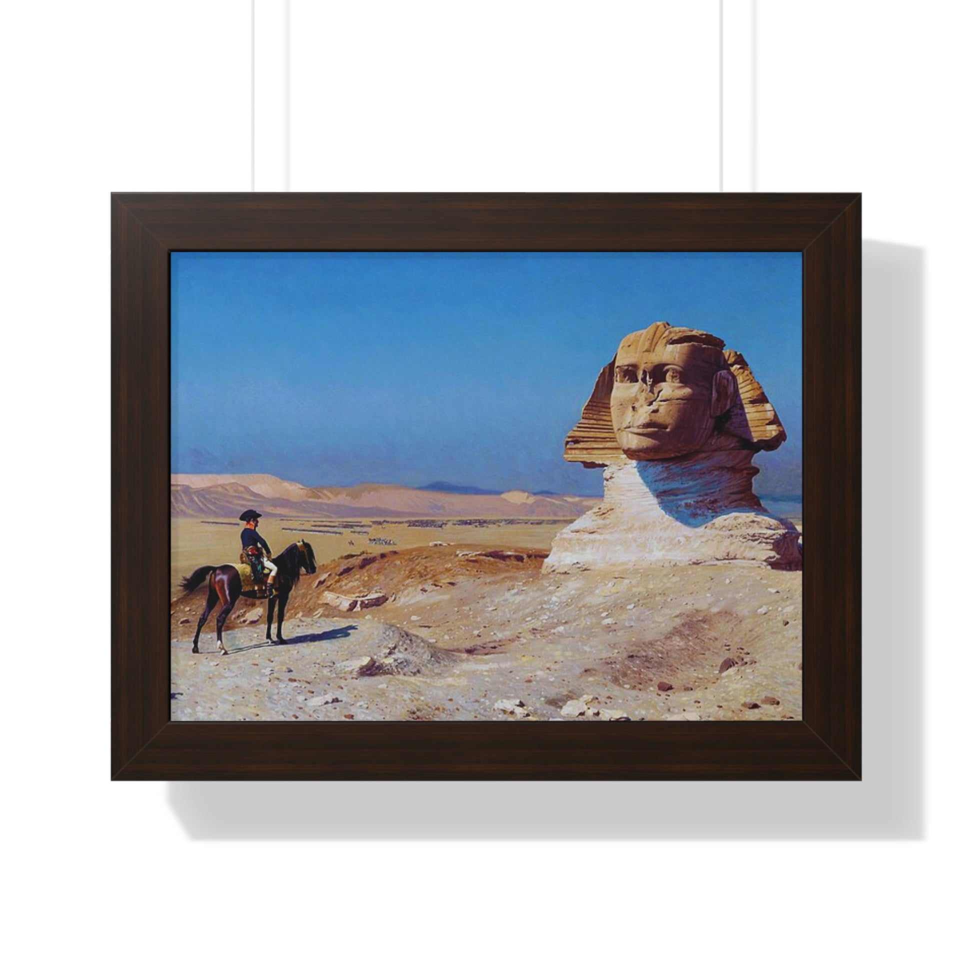 Elevate your wall decor with our Premium Framed Historical Painting of Napoleon Bonaparte during his Egypt campaign lookin at a Sphinx, painted by French painter Jean-Léon Gérôme. Available in three sophisticated colors: black, white, and walnut.