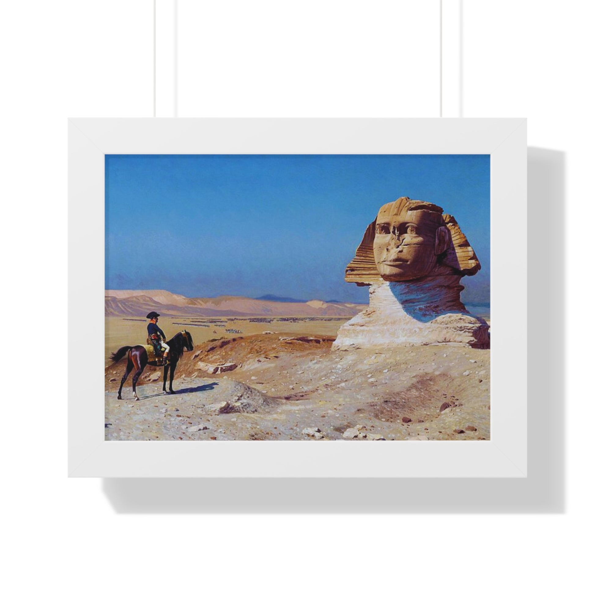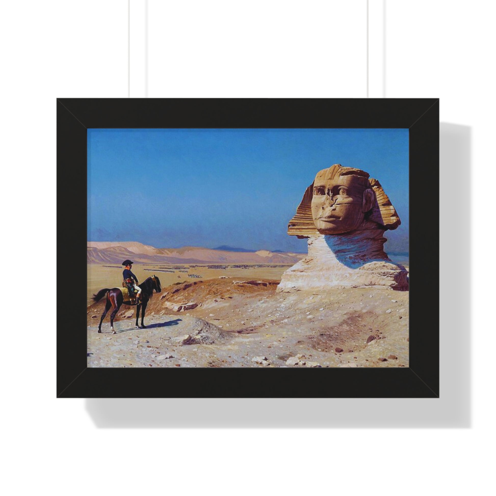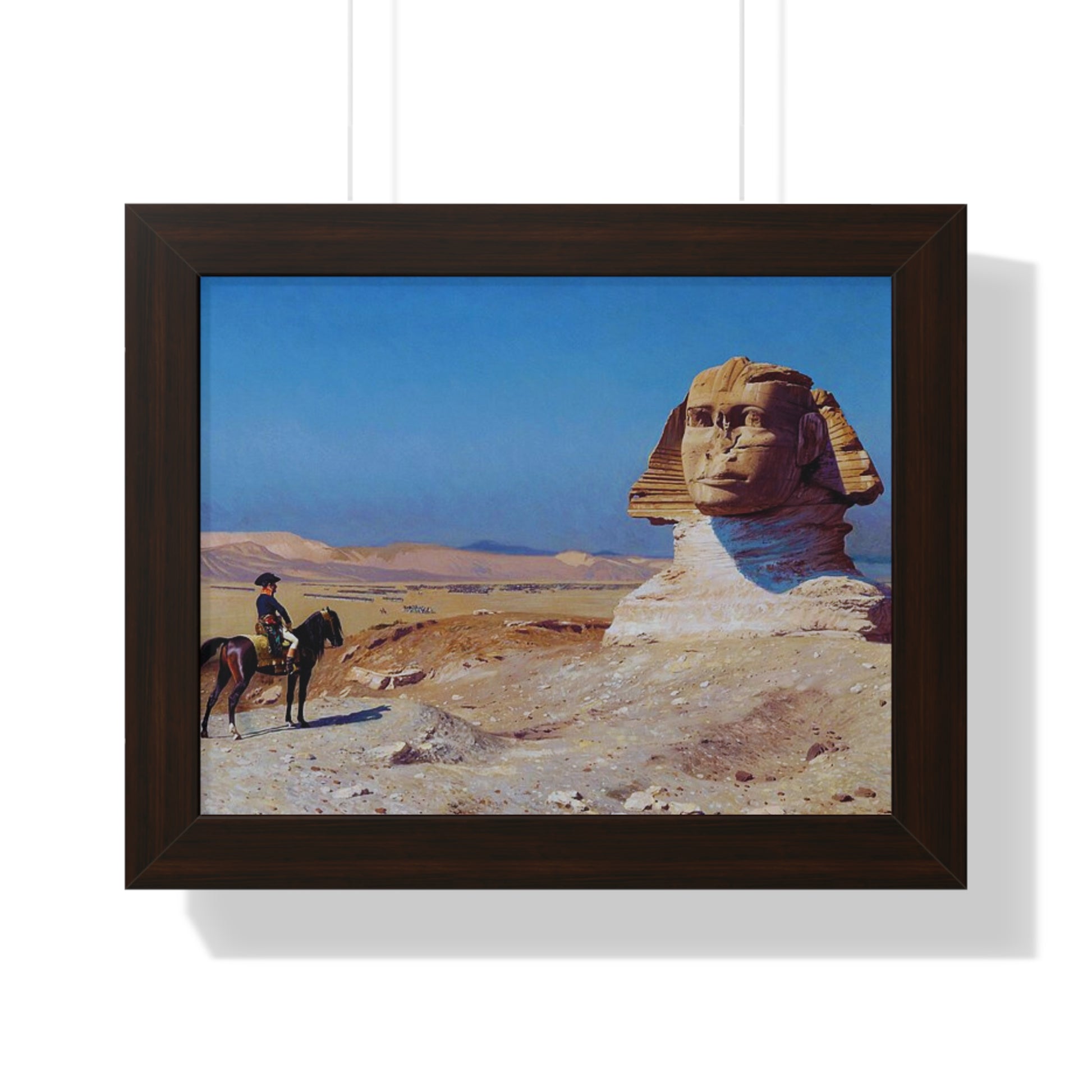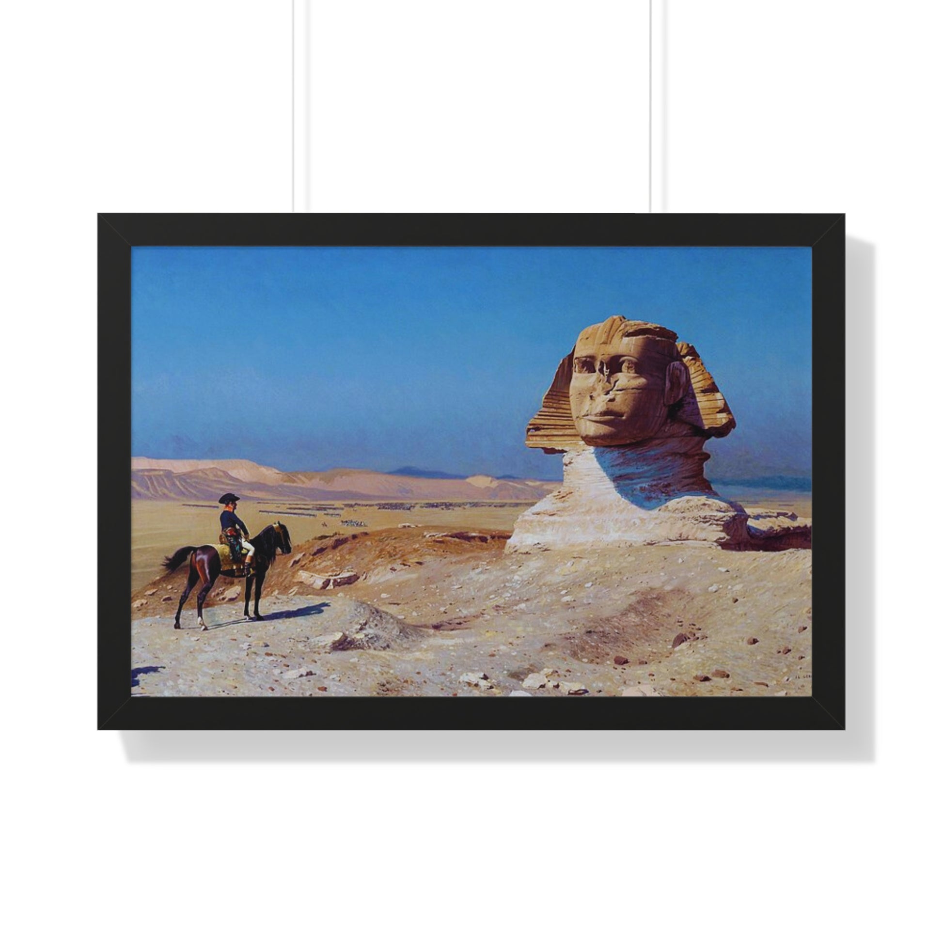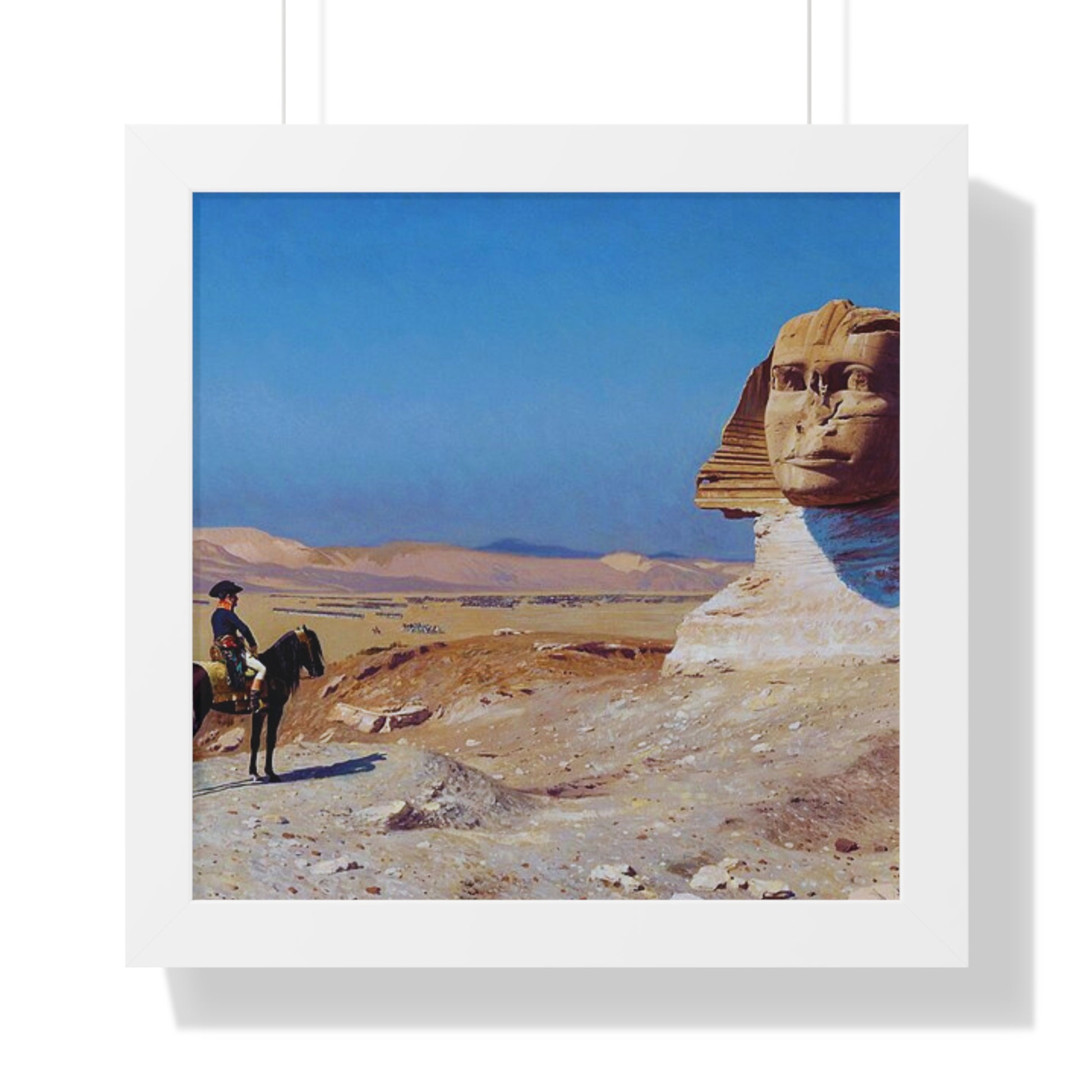 Elevate your wall decor with our Premium Framed Historical Painting of Napoleon Bonaparte during his Egypt campaign lookin at a Sphinx, painted by French painter Jean-Léon Gérôme. Available in three sophisticated colors: black, white, and walnut.