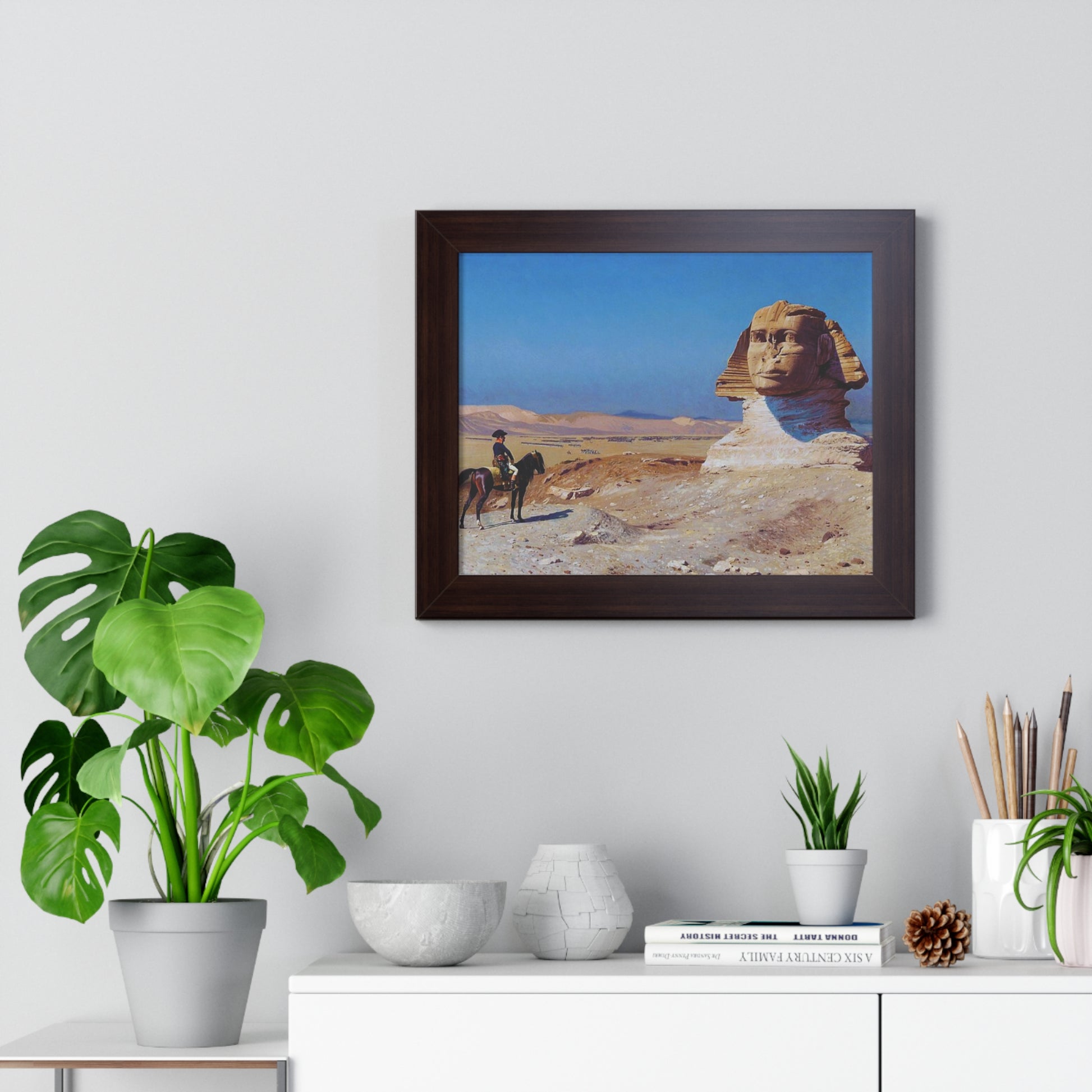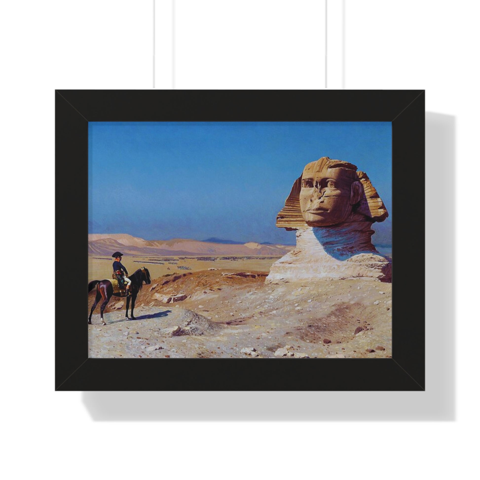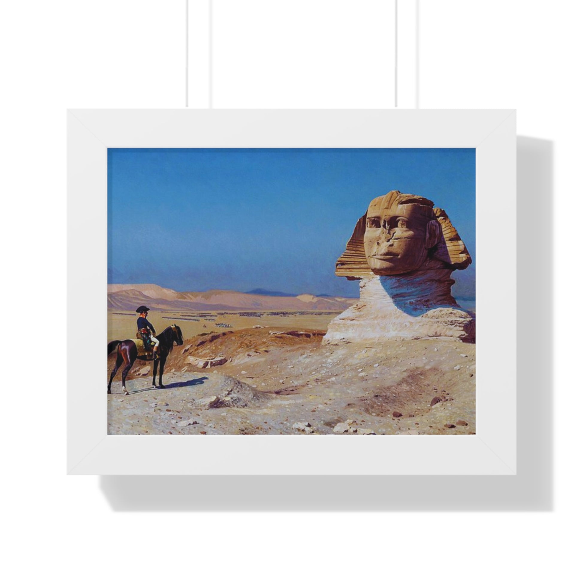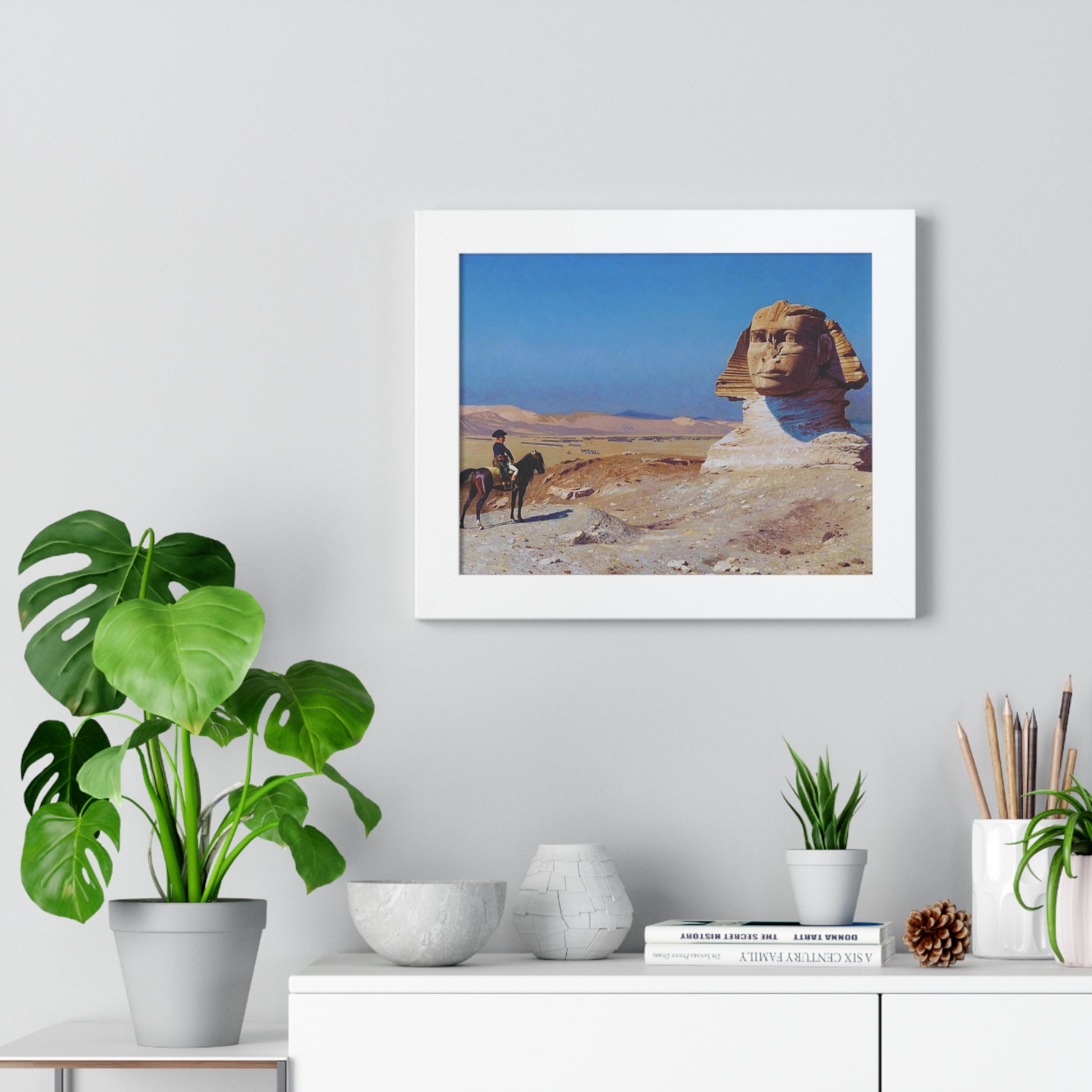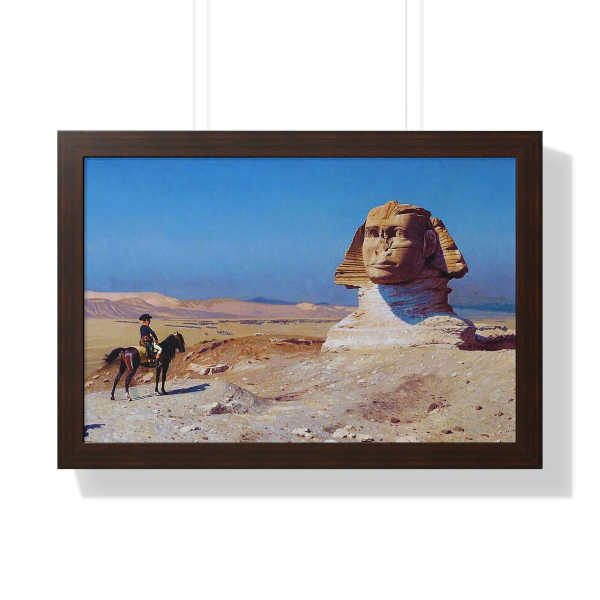 Elevate your wall decor with our Premium Framed Historical Painting of Napoleon Bonaparte during his Egypt campaign lookin at a Sphinx, painted by French painter Jean-Léon Gérôme. Available in three sophisticated colors: black, white, and walnut.