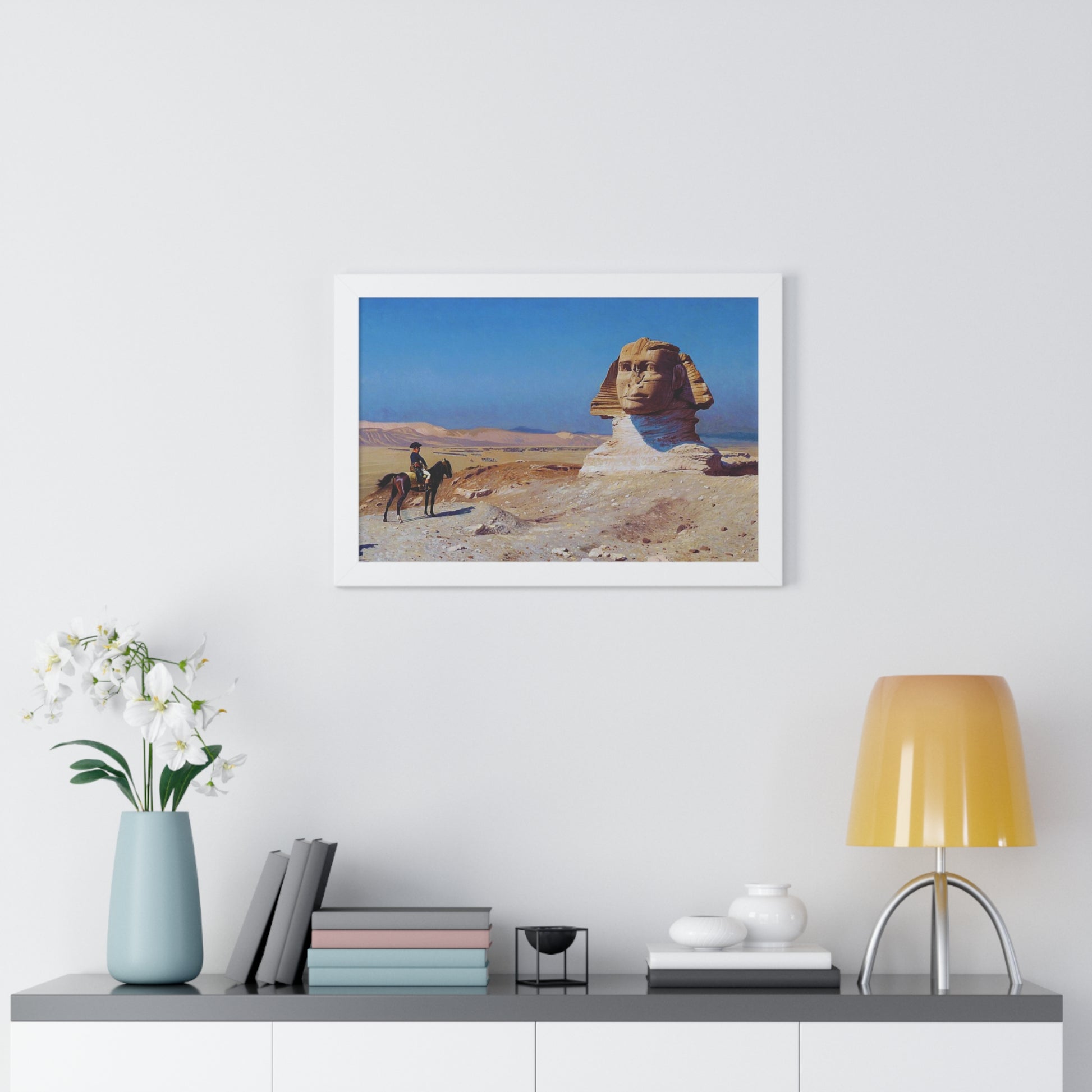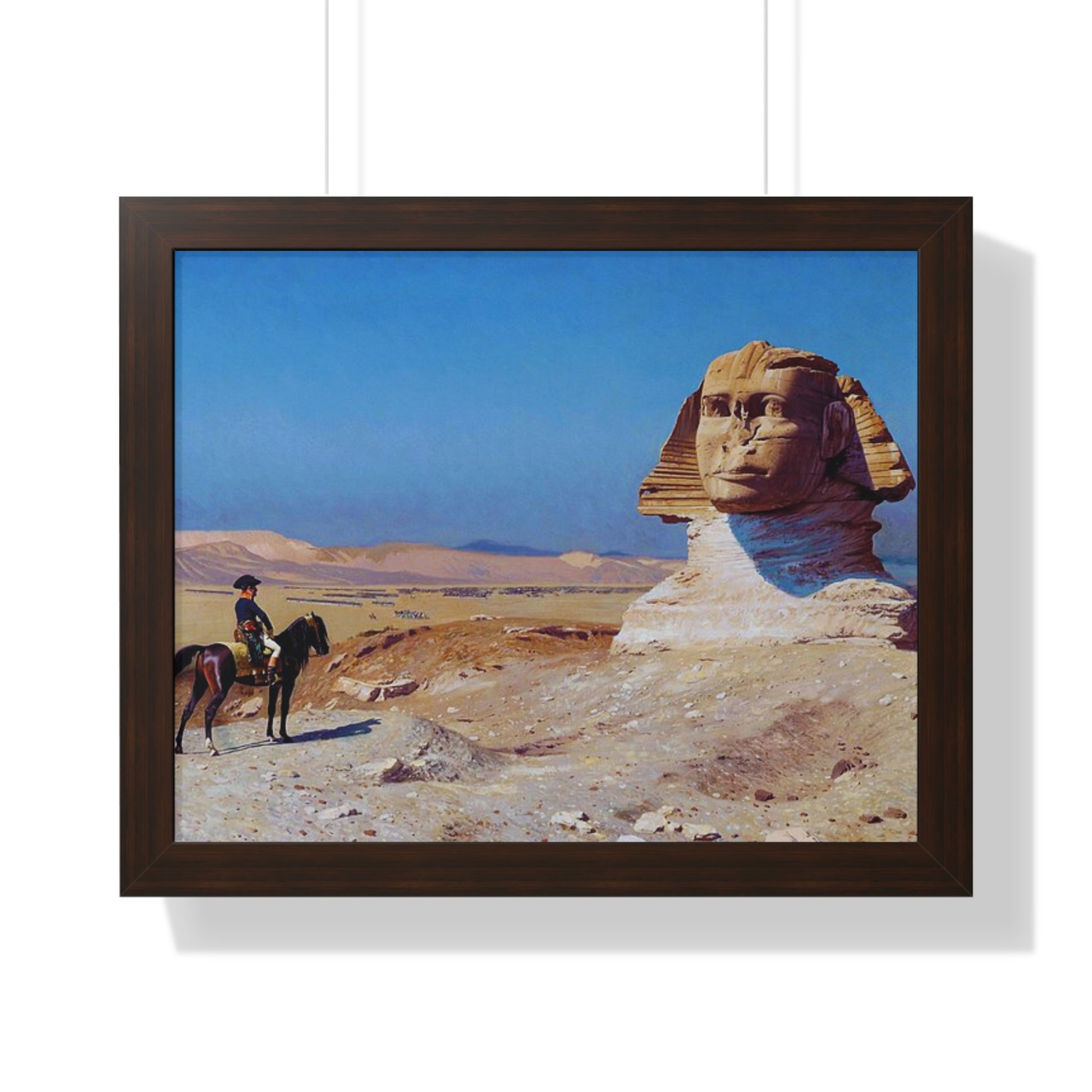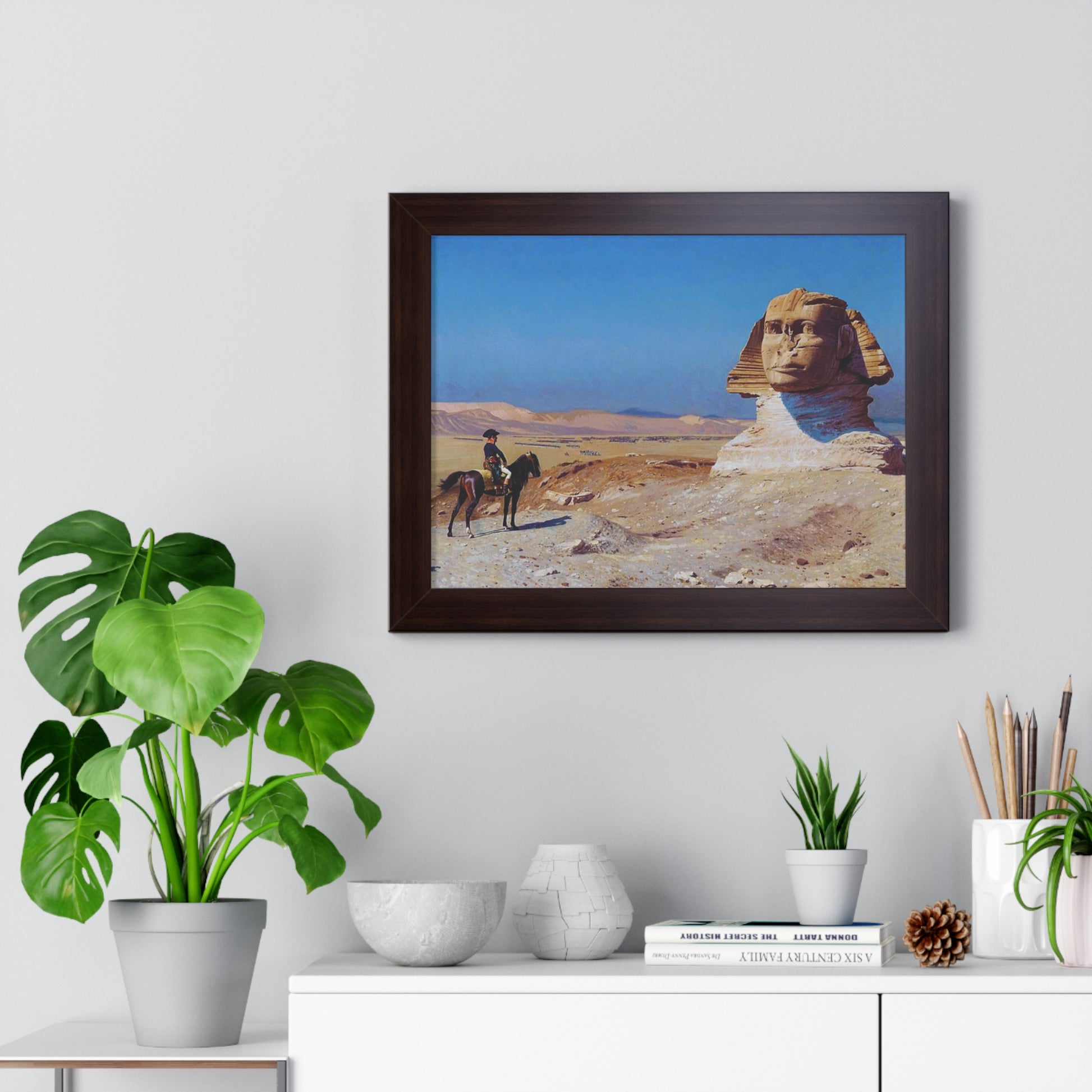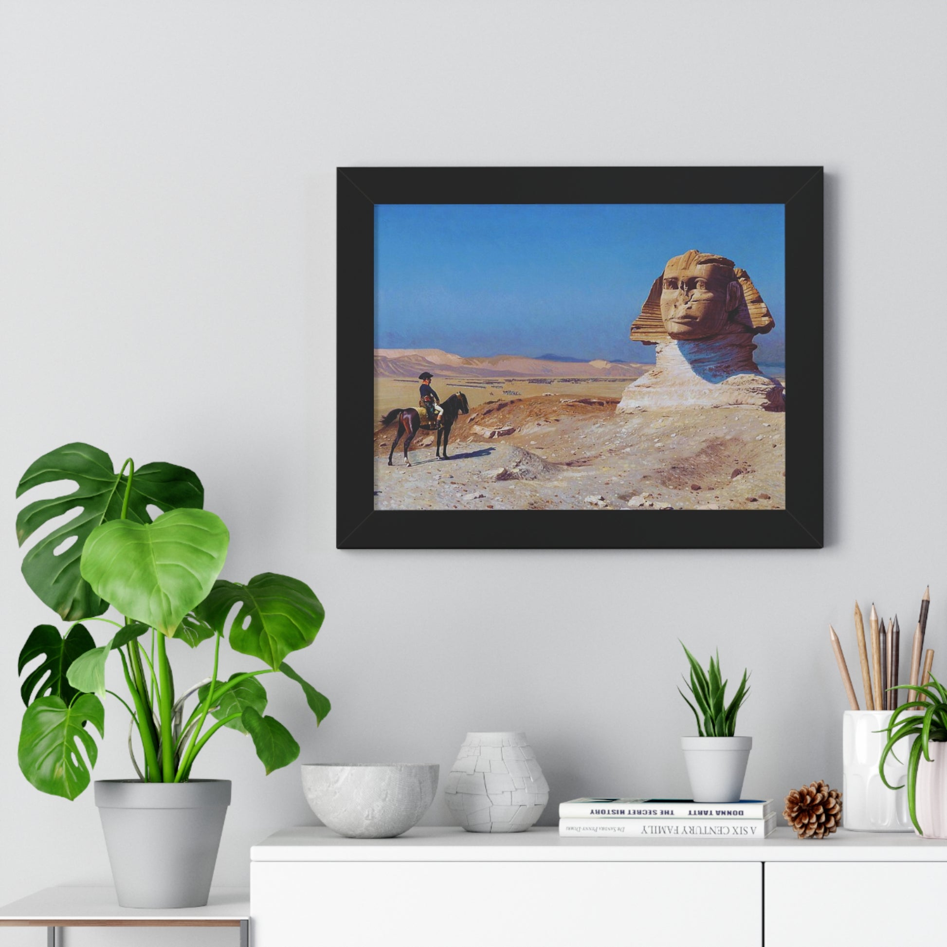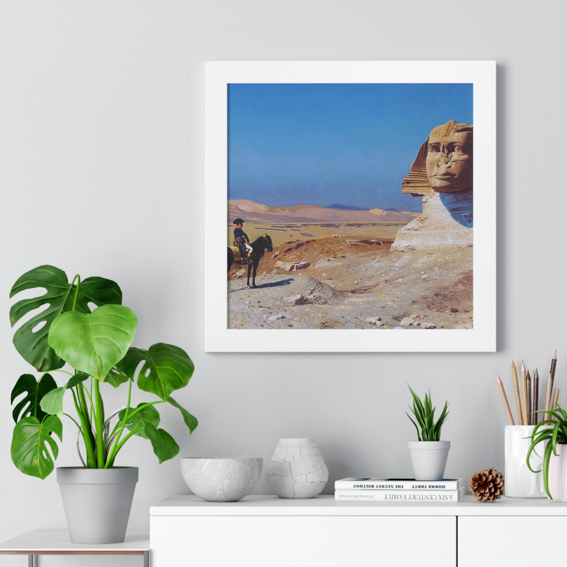 Elevate your wall decor with our Premium Framed Historical Painting of Napoleon Bonaparte during his Egypt campaign lookin at a Sphinx, painted by French painter Jean-Léon Gérôme. Available in three sophisticated colors: black, white, and walnut.