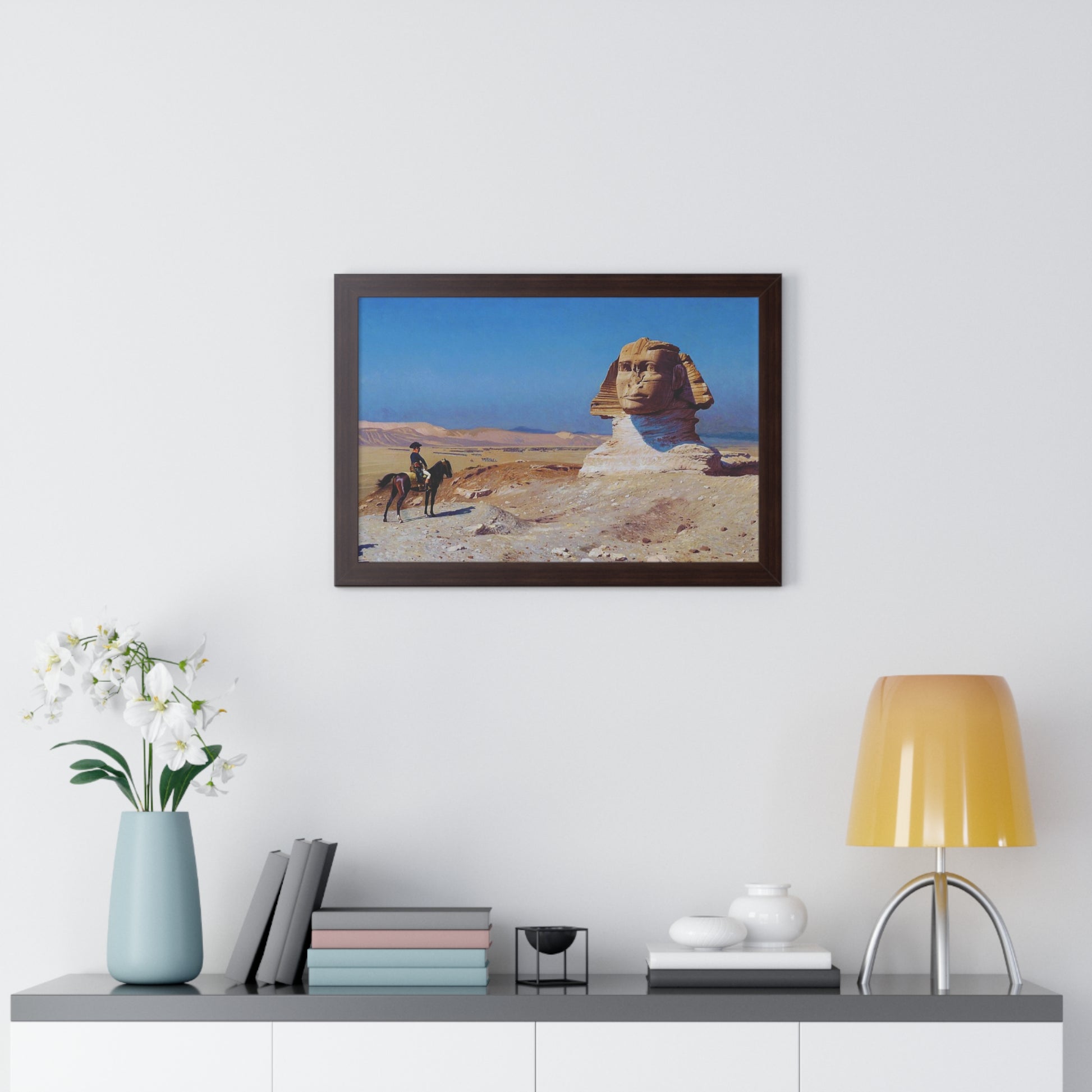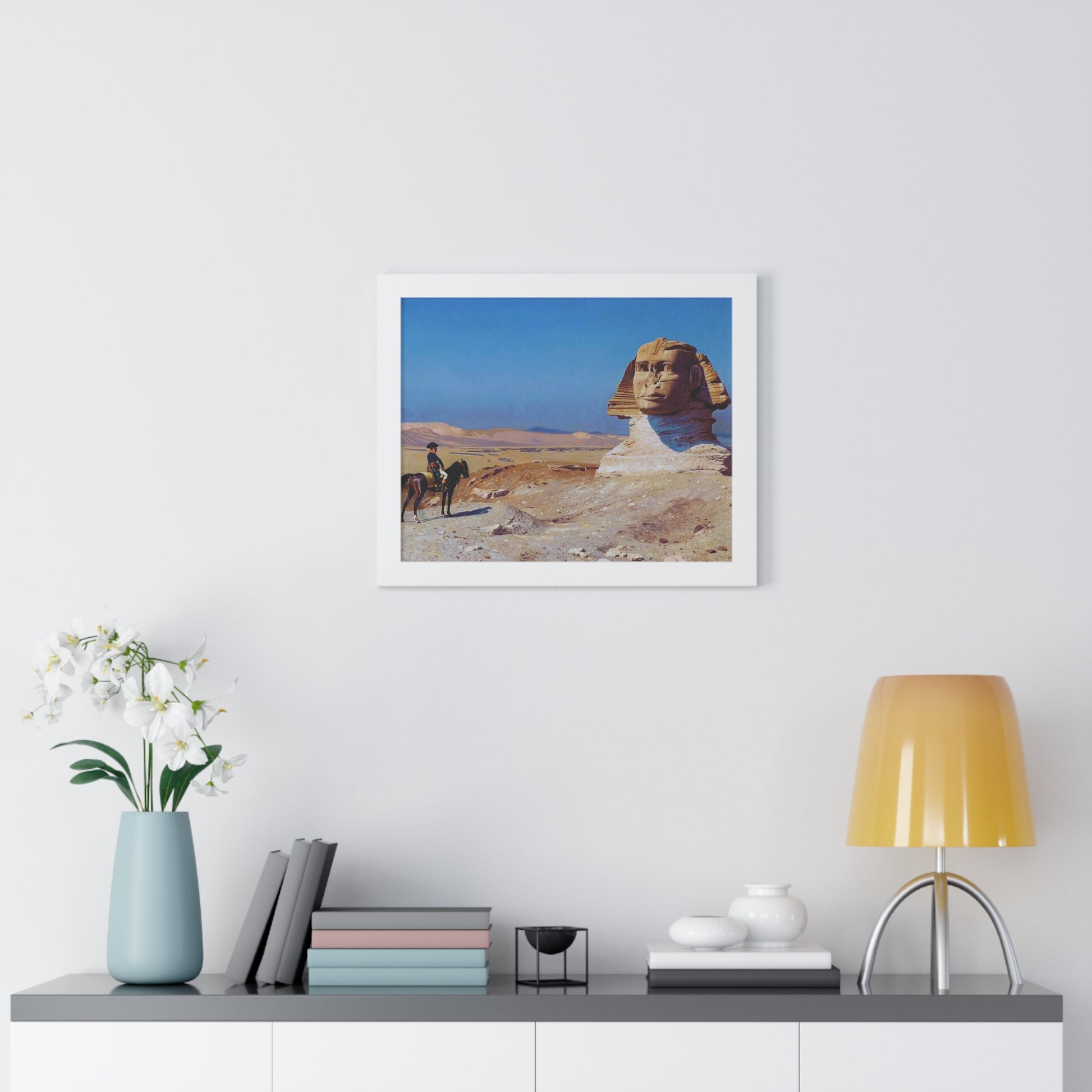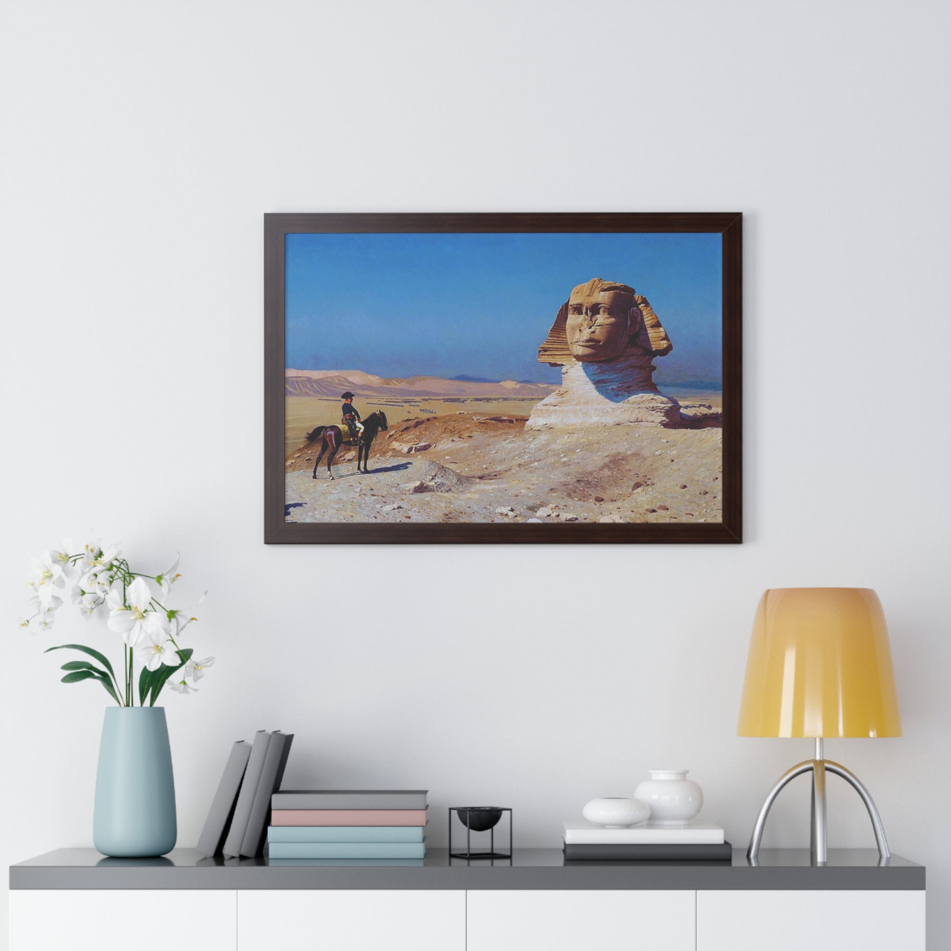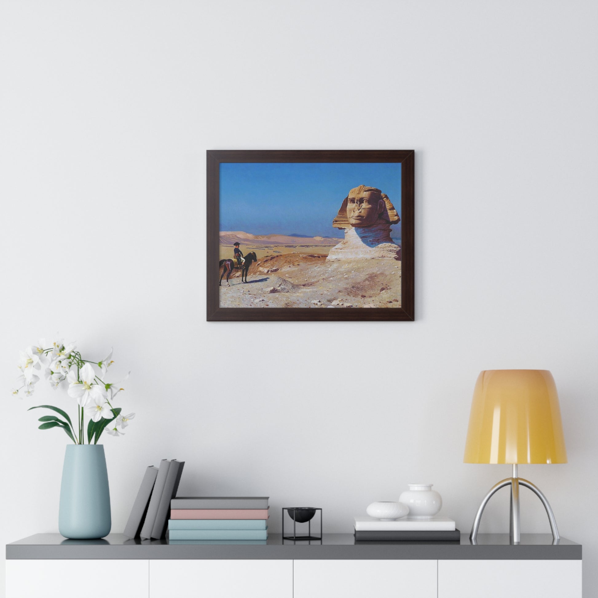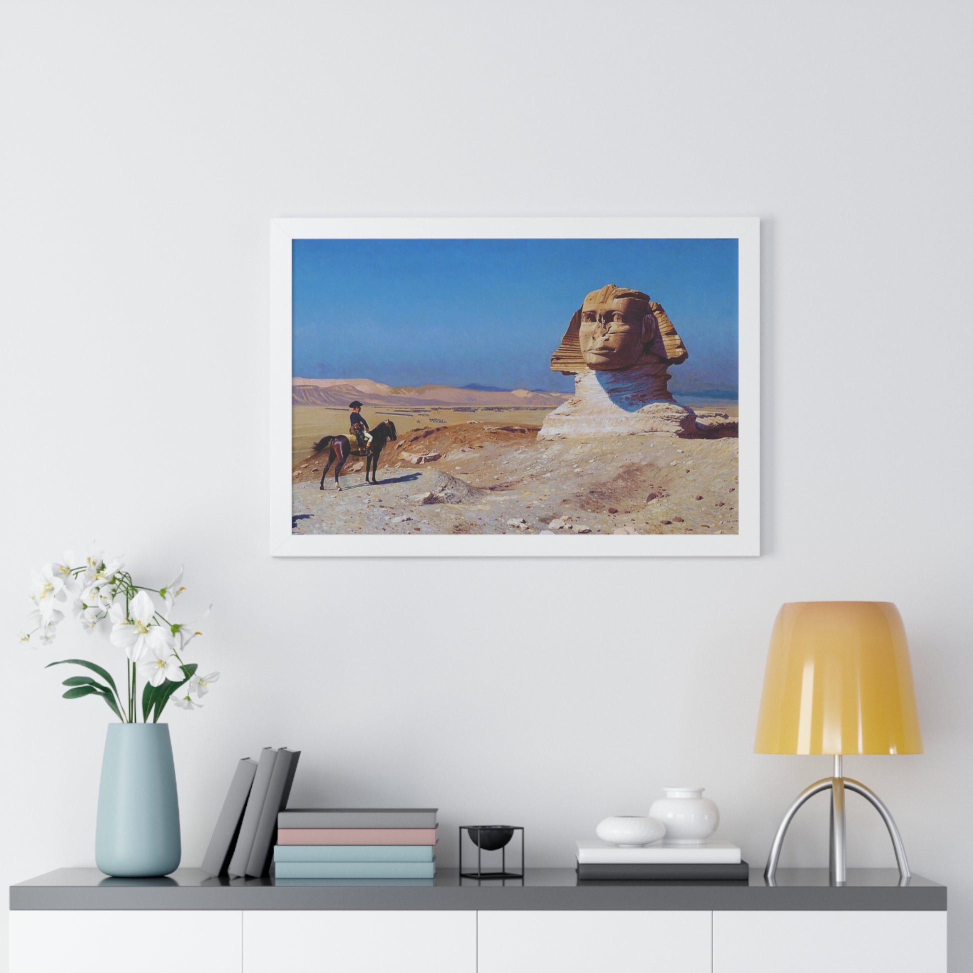 Elevate your wall decor with our Premium Framed Historical Painting of Napoleon Bonaparte during his Egypt campaign lookin at a Sphinx, painted by French painter Jean-Léon Gérôme. Available in three sophisticated colors: black, white, and walnut.