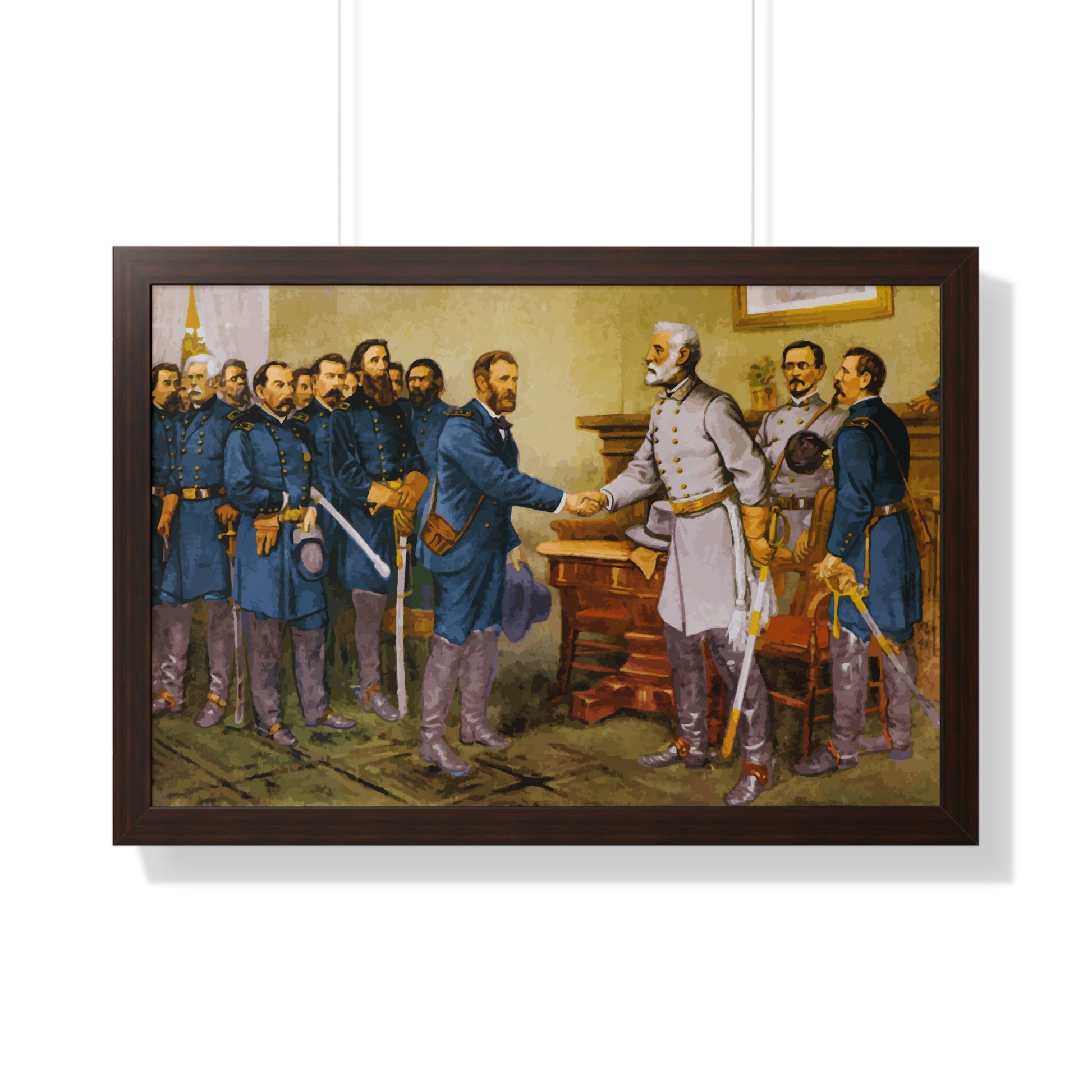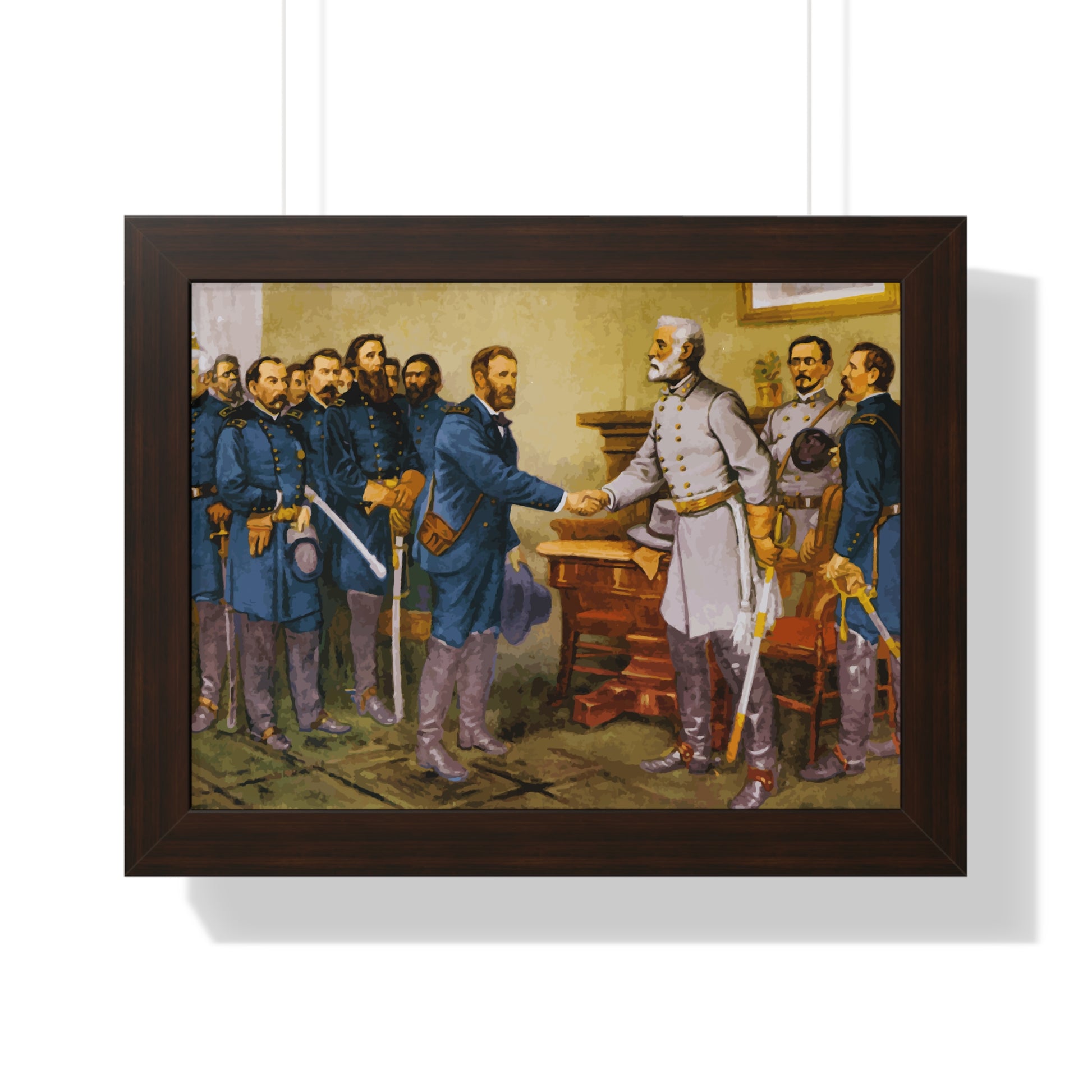 Elevate your wall decor with our Premium Framed Historical Painting of General Robert E. Lee's surrender at Appomattox Court House, painted by Thomas Nast. Available in three sophisticated colors: black, white, and walnut.