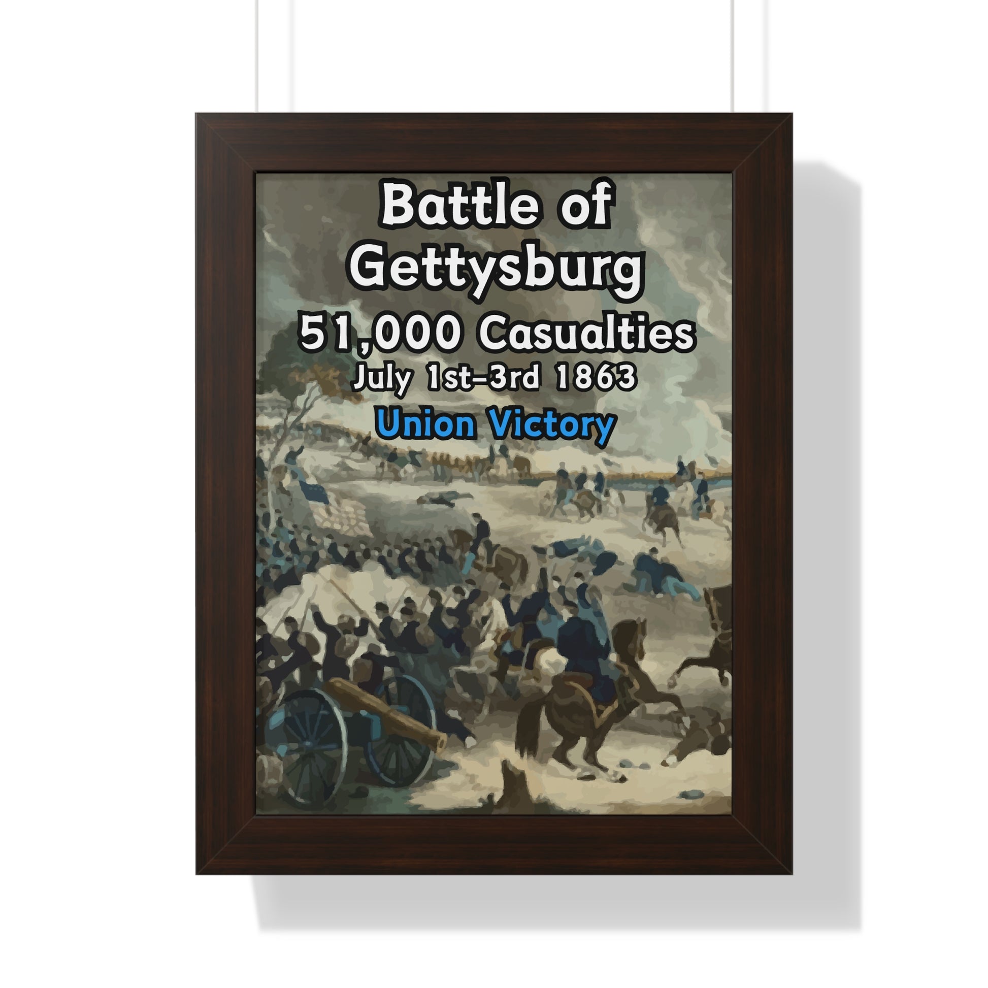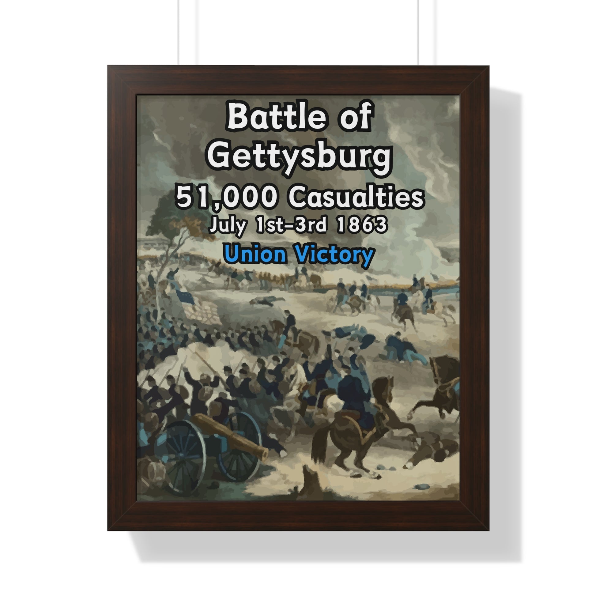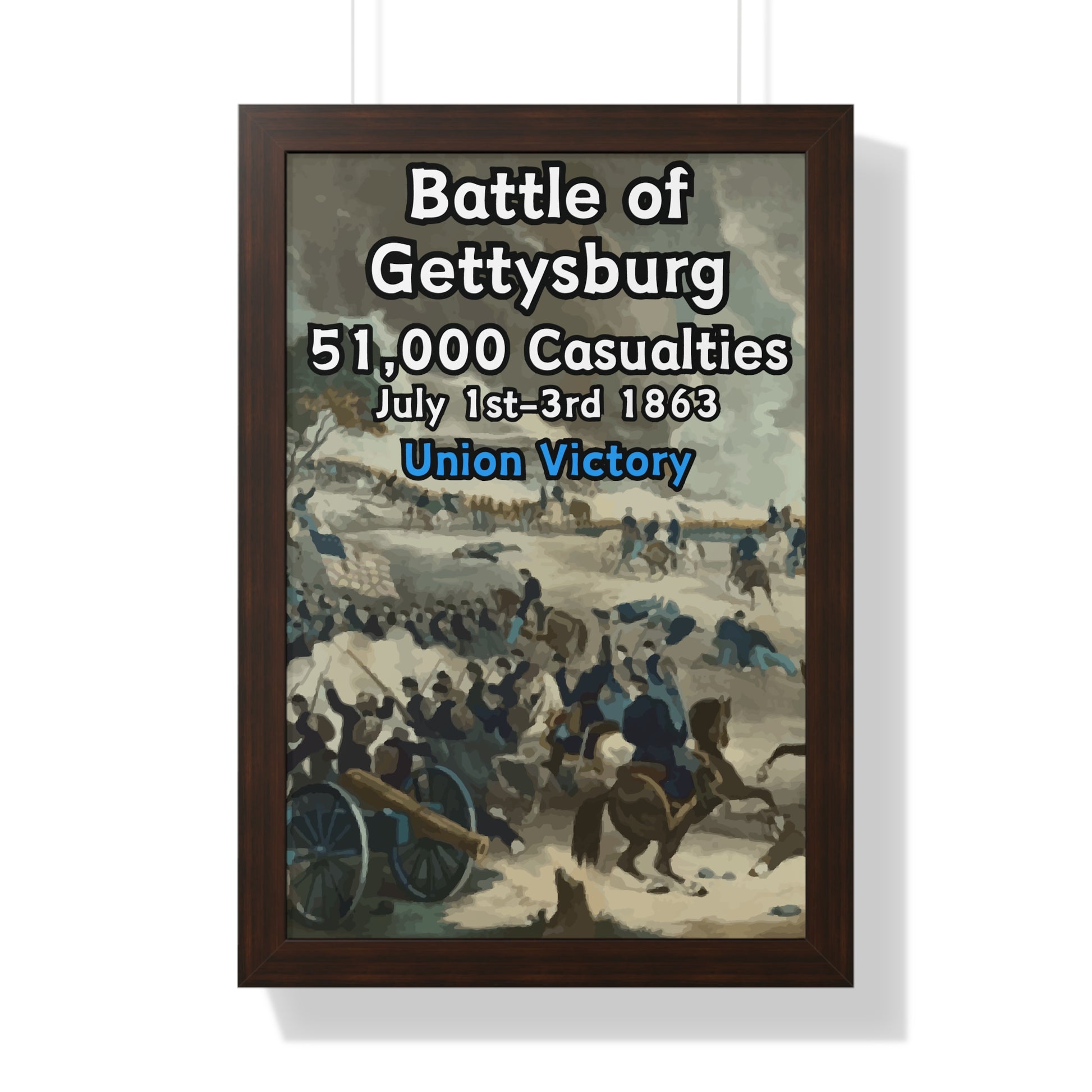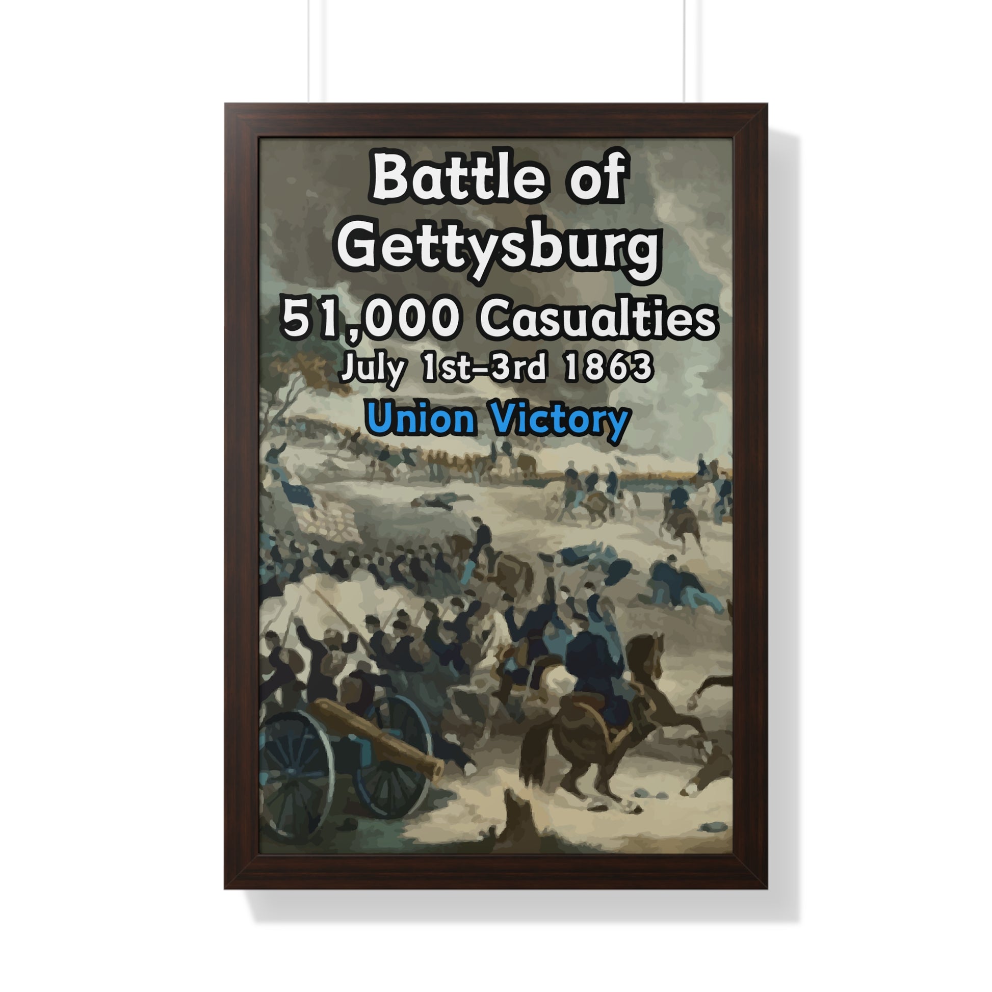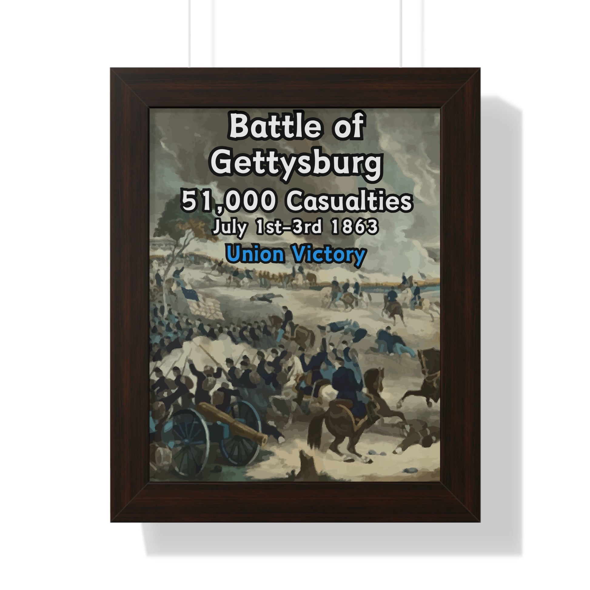 Elevate your wall decor with our Premium Framed Historical Poster of the American Civil War Battle of Gettysburg, available in three sophisticated colors: black, white, and walnut.