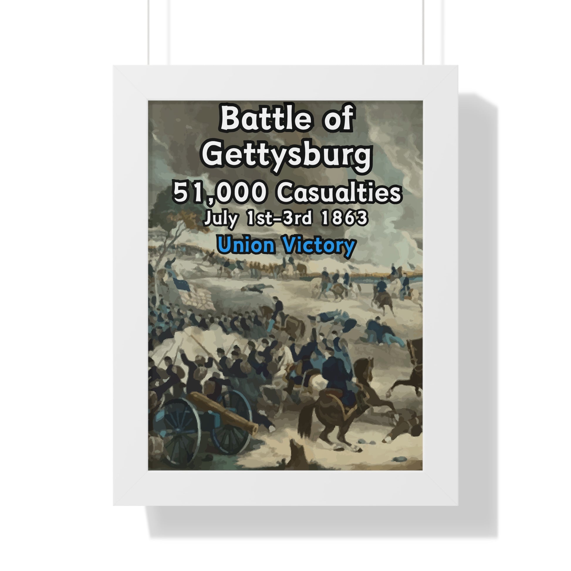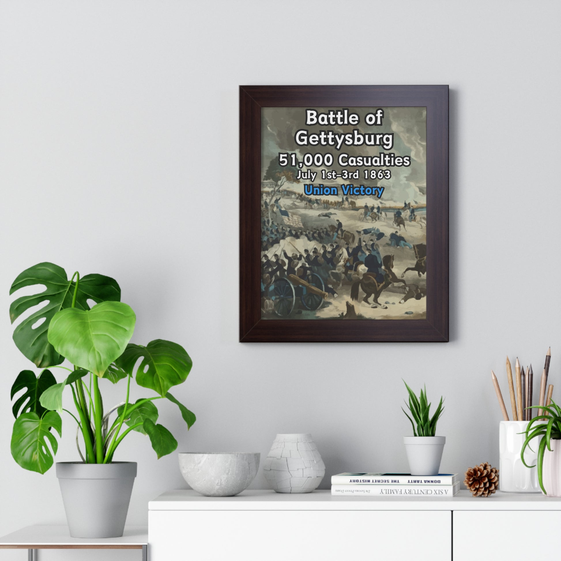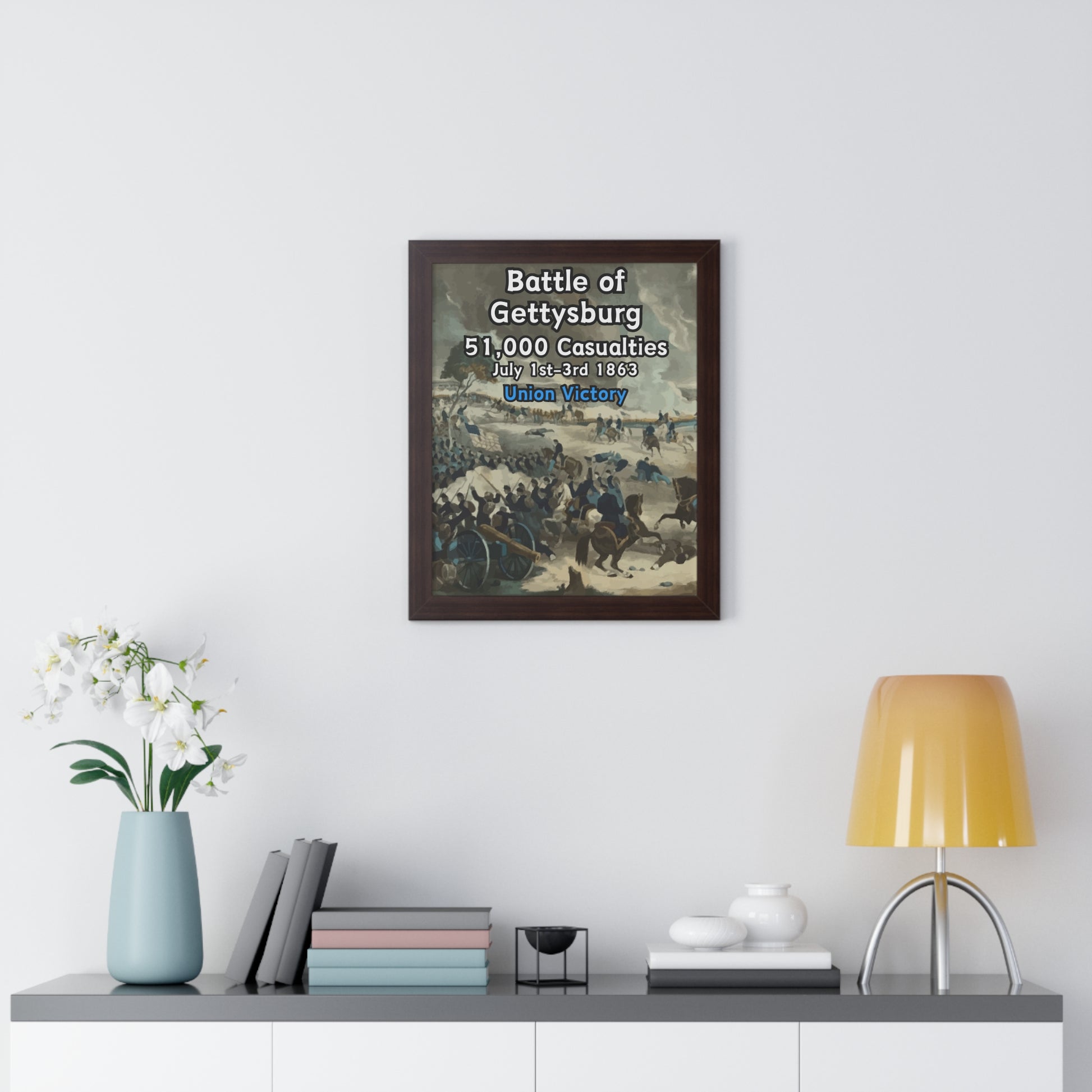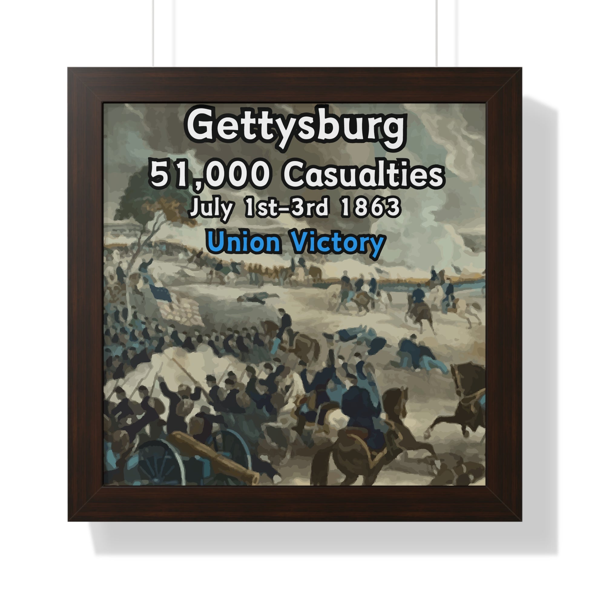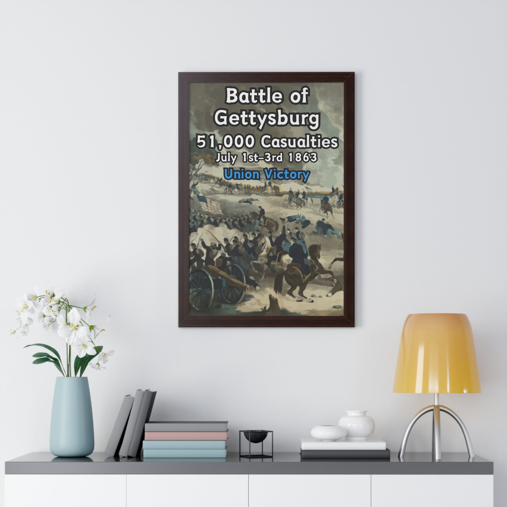 Elevate your wall decor with our Premium Framed Historical Poster of the American Civil War Battle of Gettysburg, available in three sophisticated colors: black, white, and walnut.