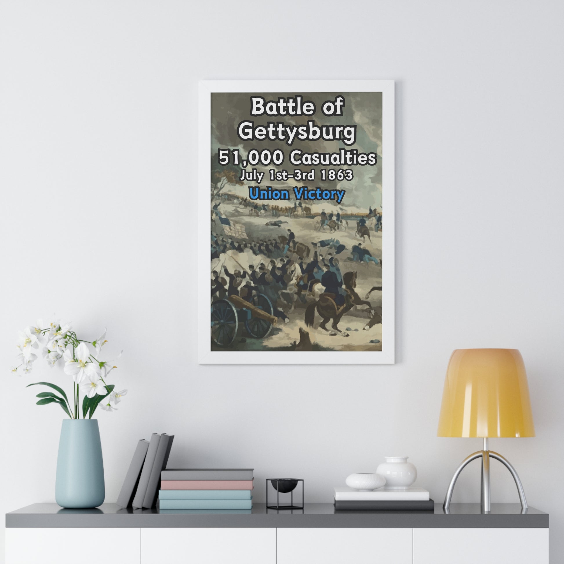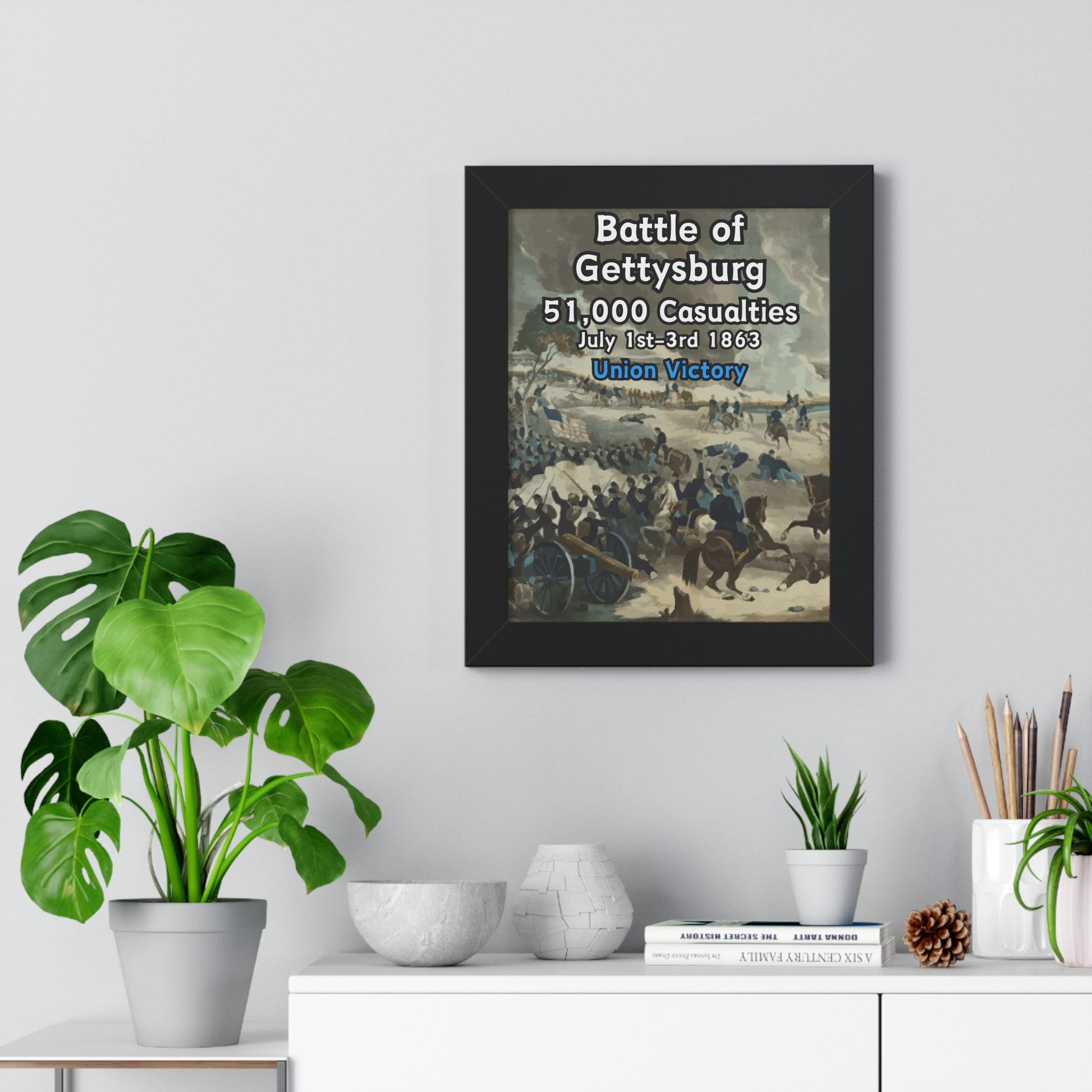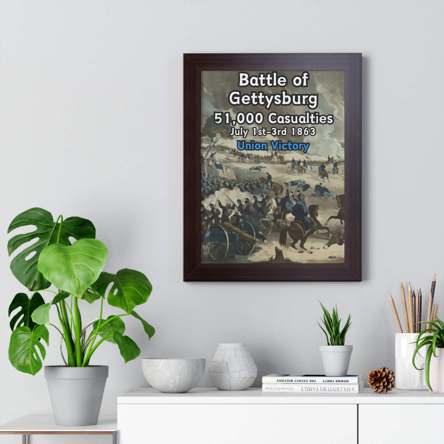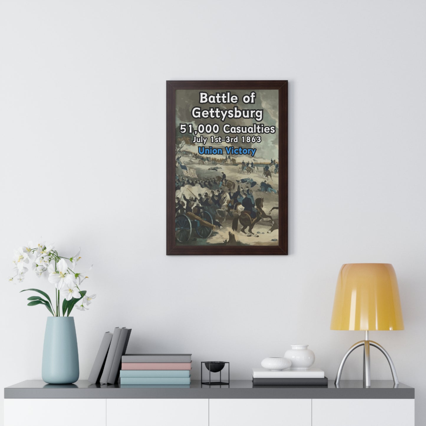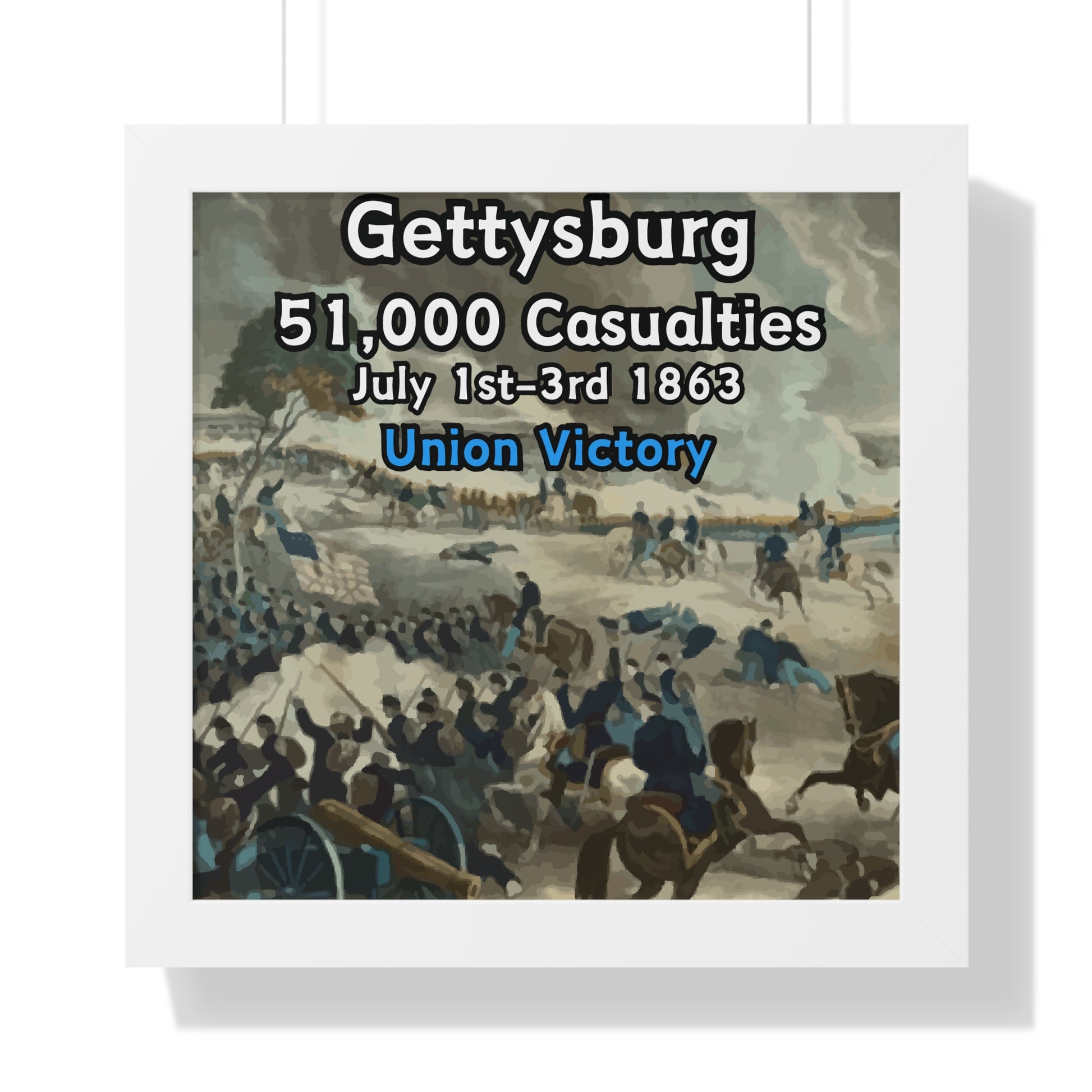Elevate your wall decor with our Premium Framed Historical Poster of the American Civil War Battle of Gettysburg, available in three sophisticated colors: black, white, and walnut.