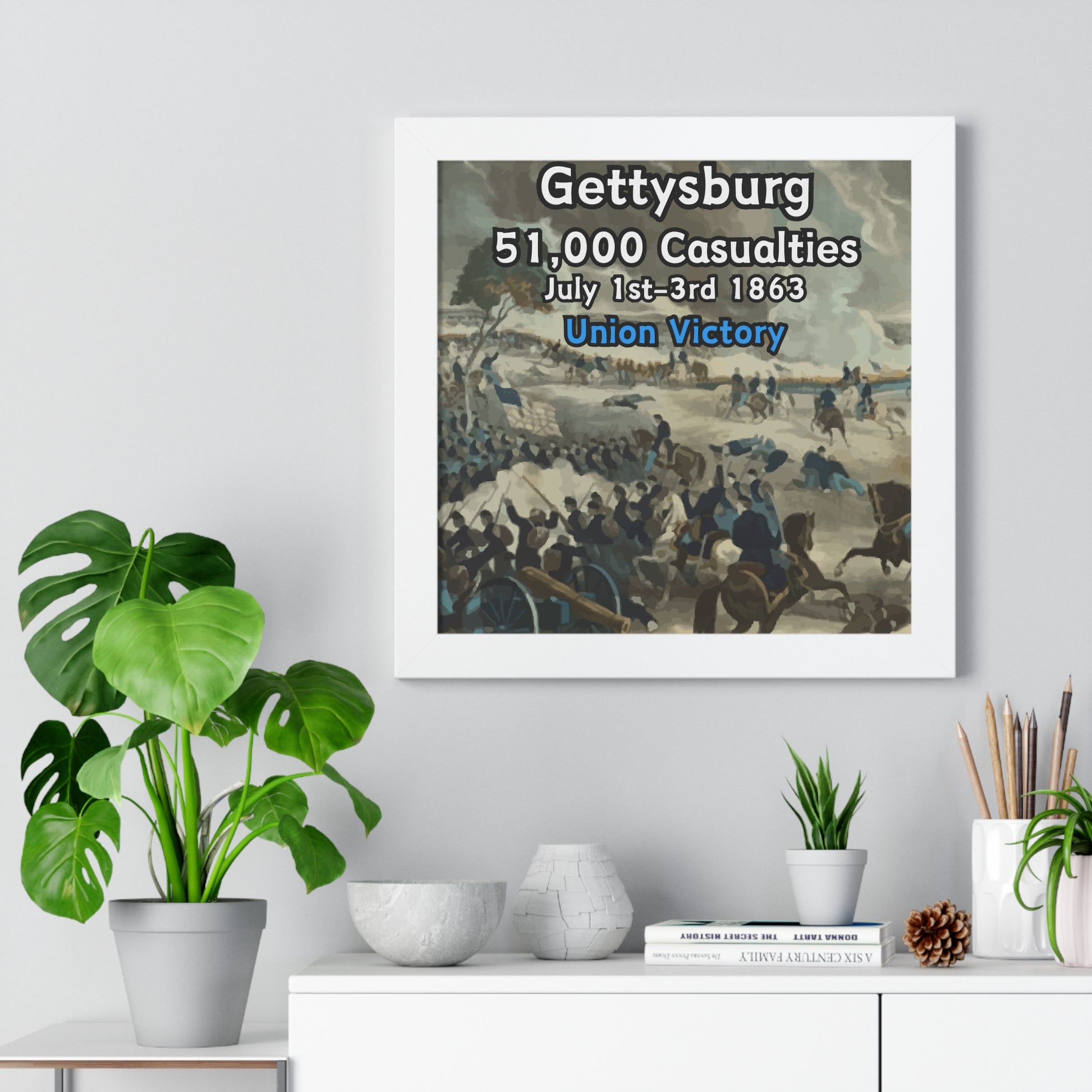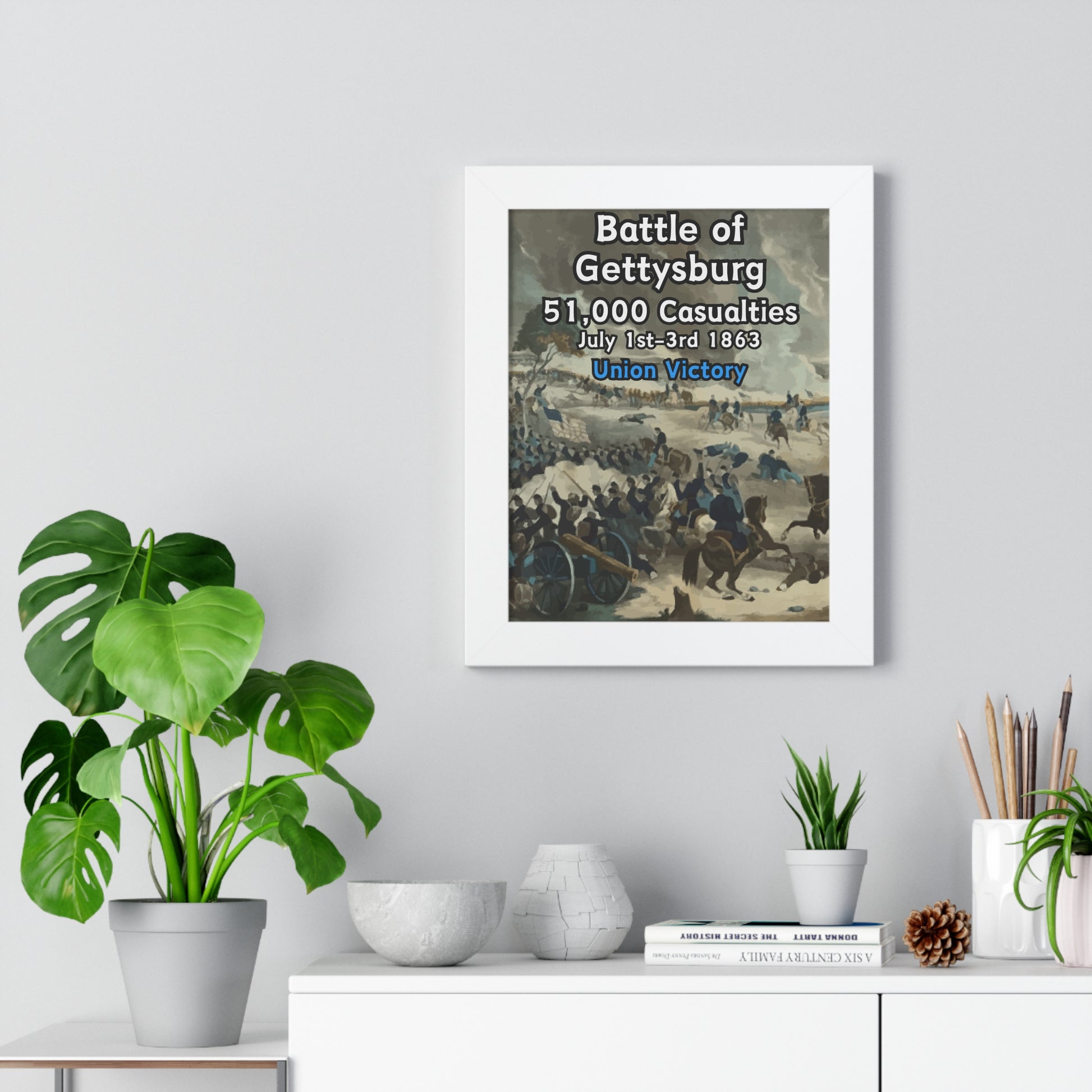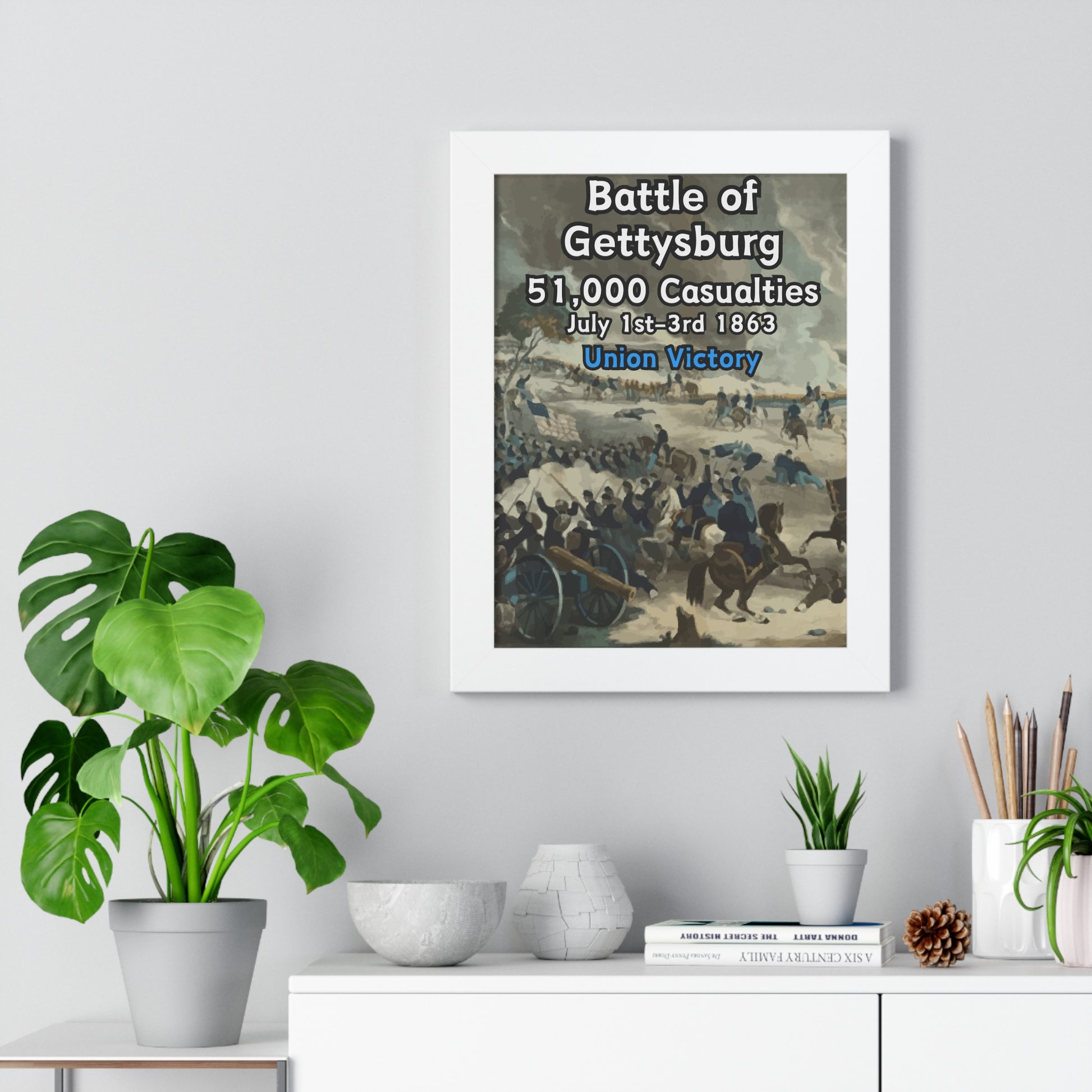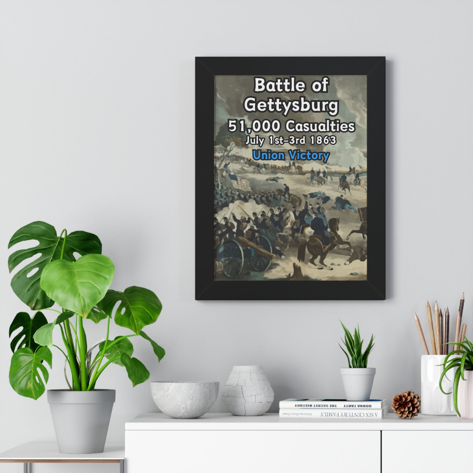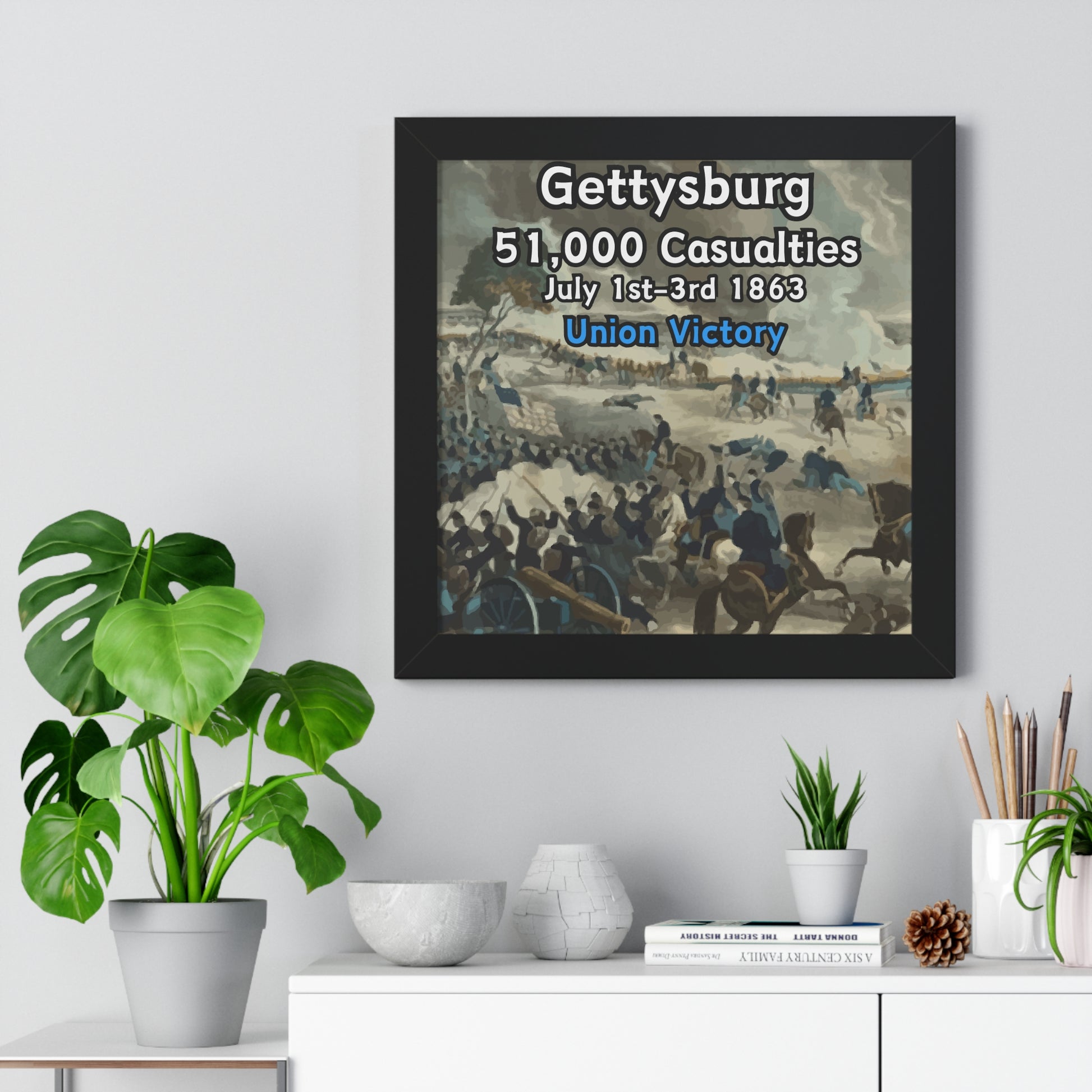 Elevate your wall decor with our Premium Framed Historical Poster of the American Civil War Battle of Gettysburg, available in three sophisticated colors: black, white, and walnut.