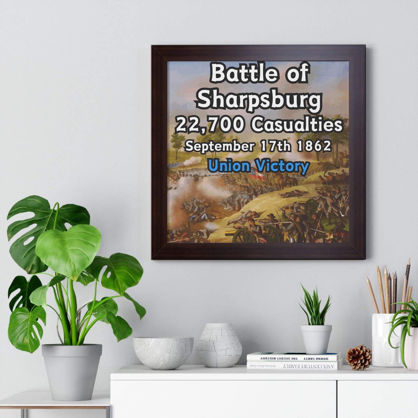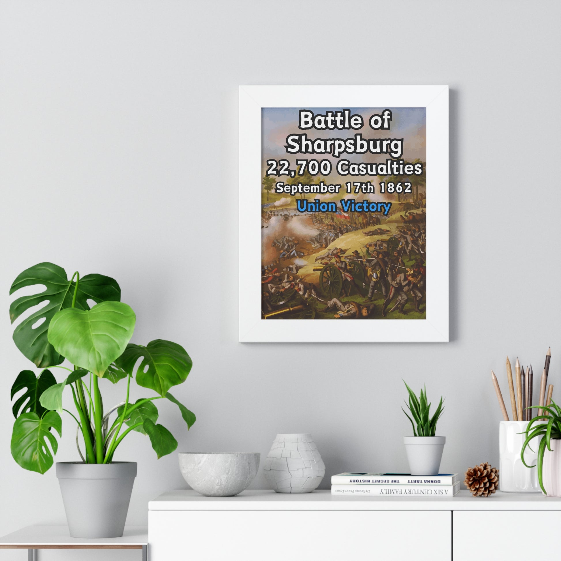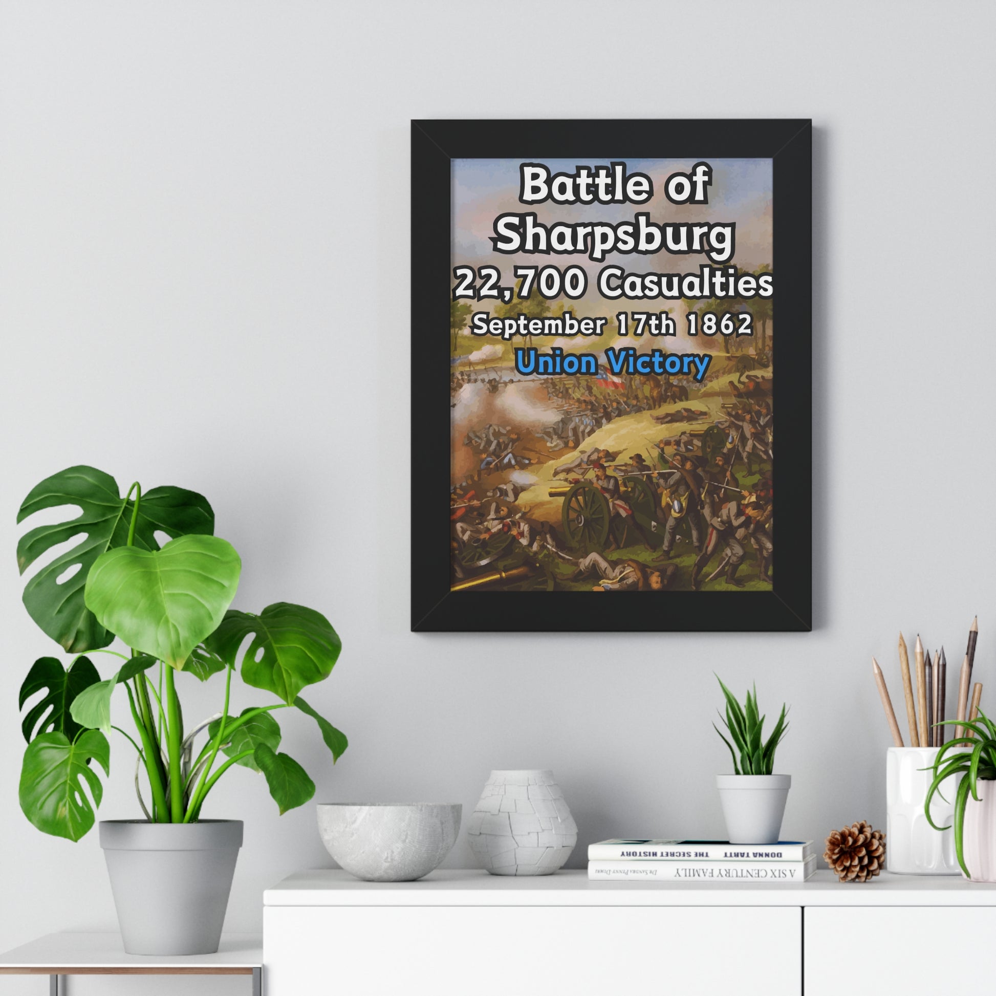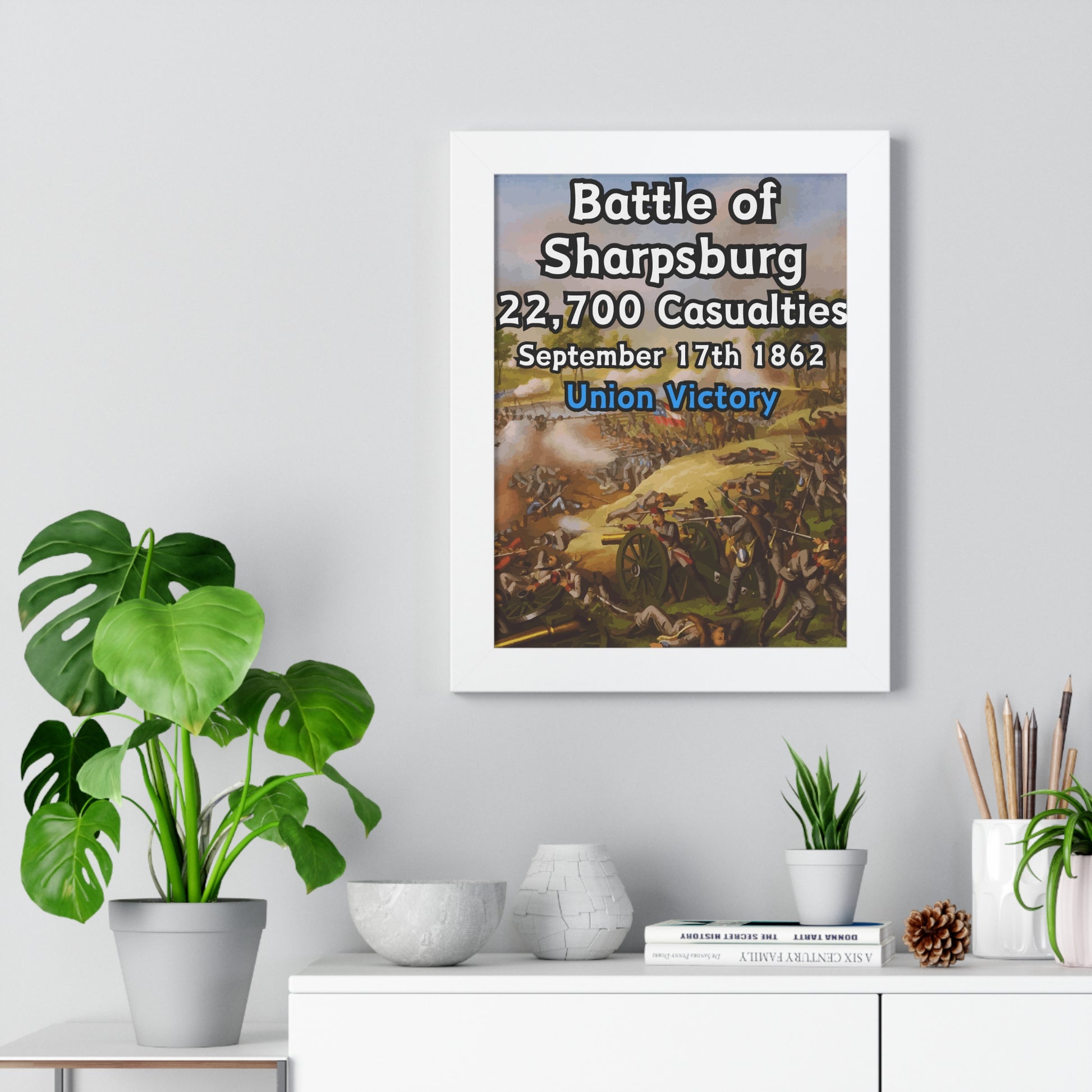 Elevate your wall decor with our Premium Framed Historical Poster of the American Civil War Battle of Sharpsburg, available in three sophisticated colors: black, white, and walnut.
