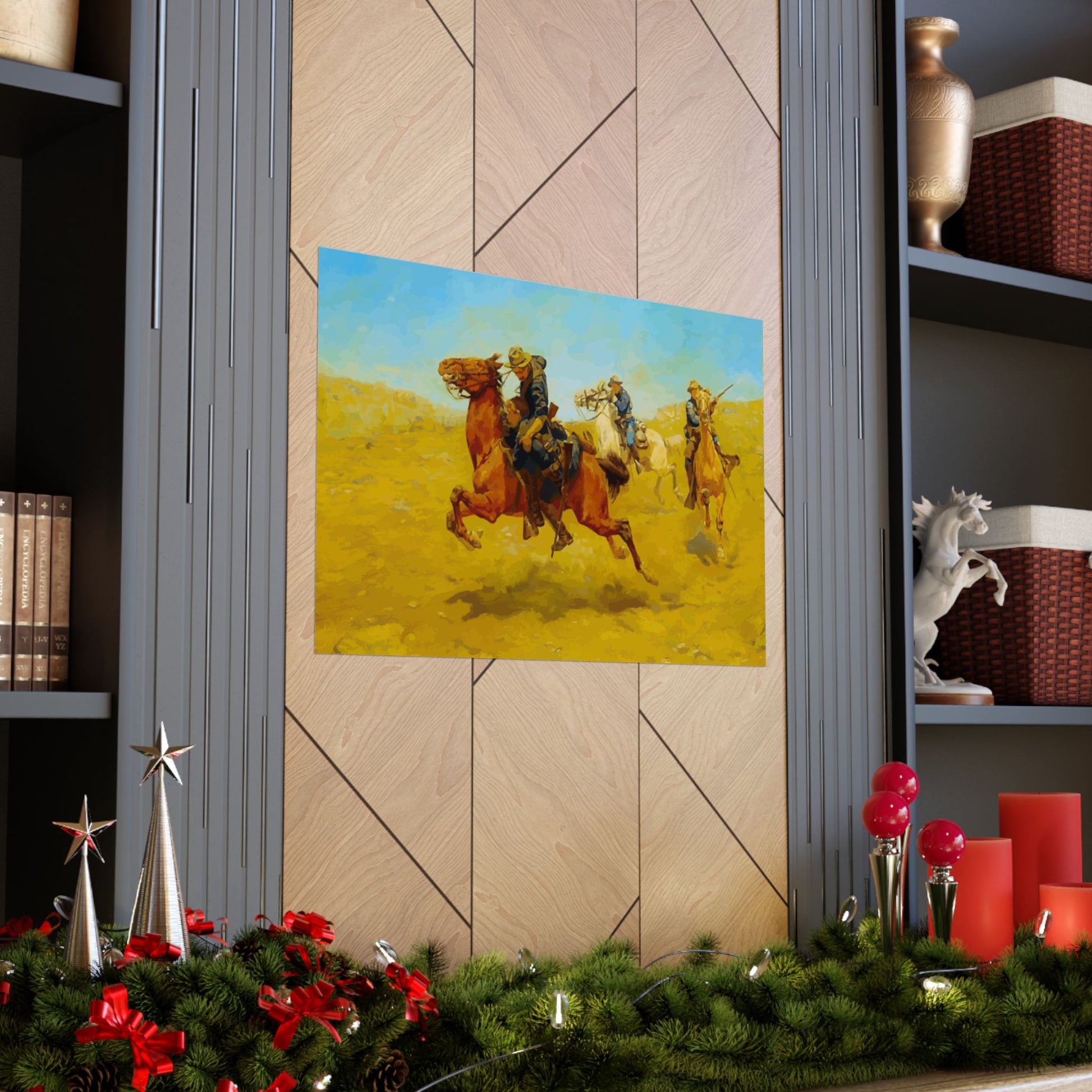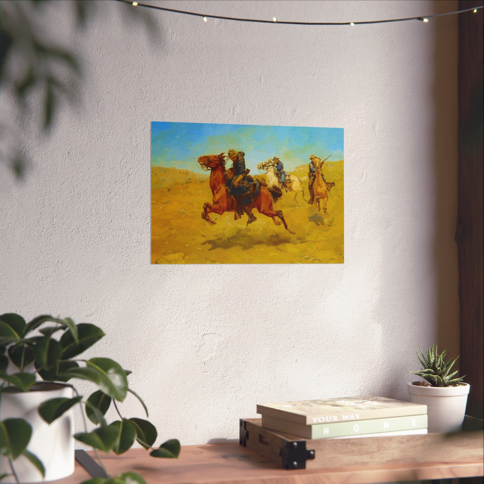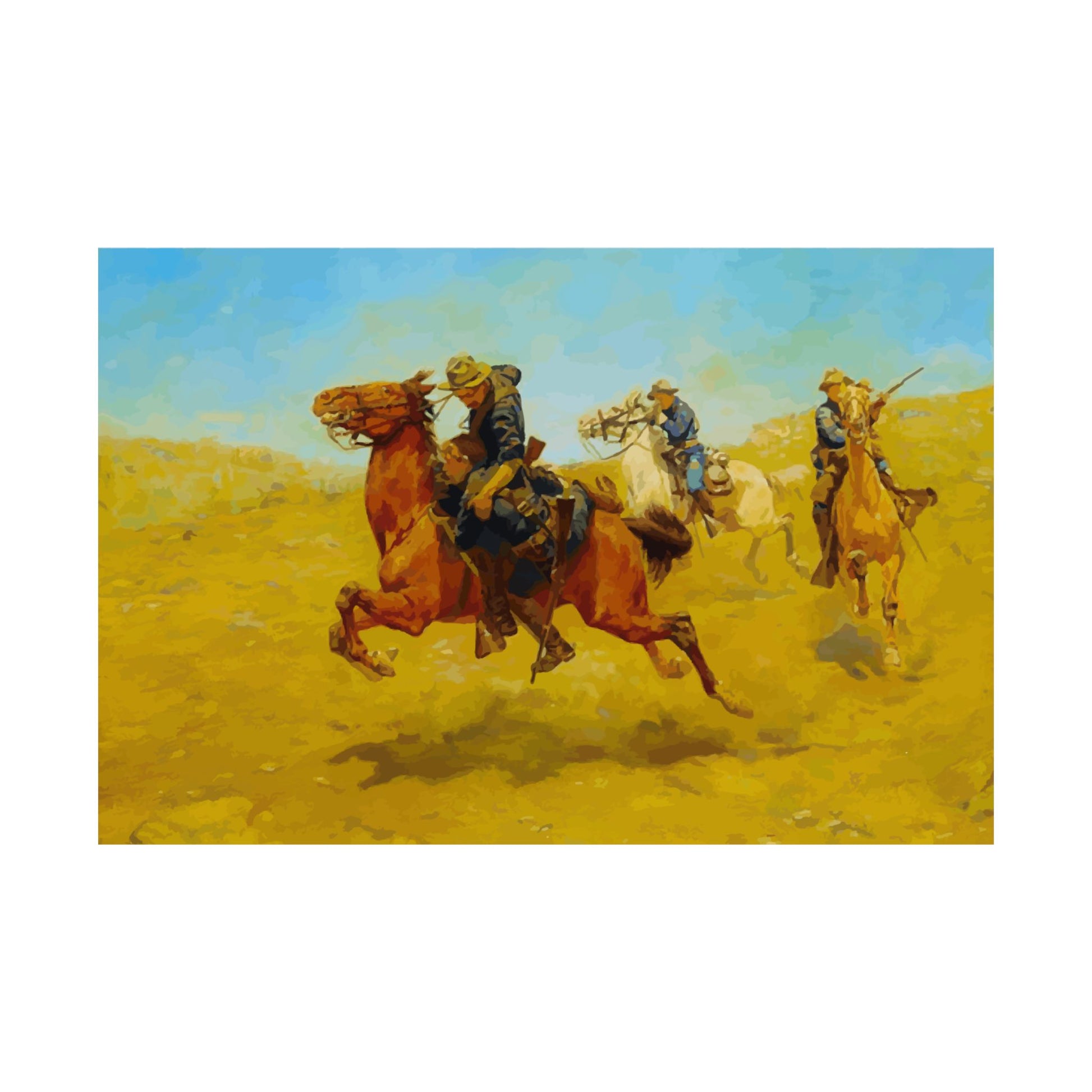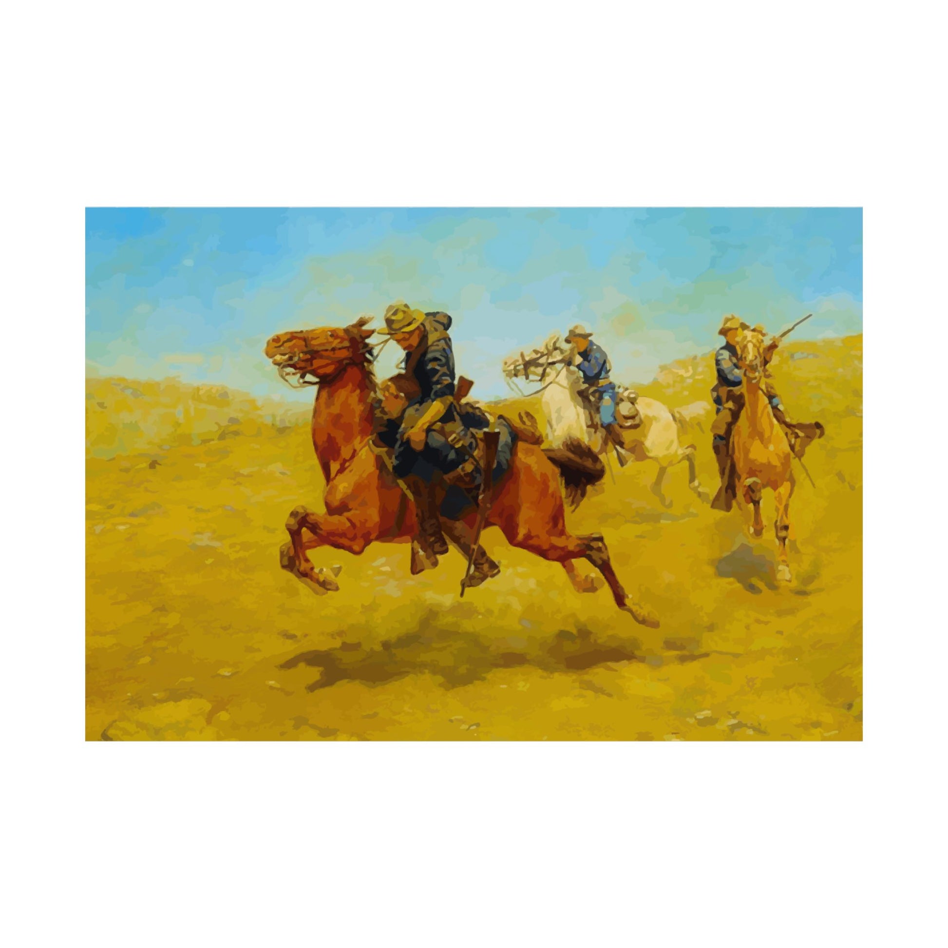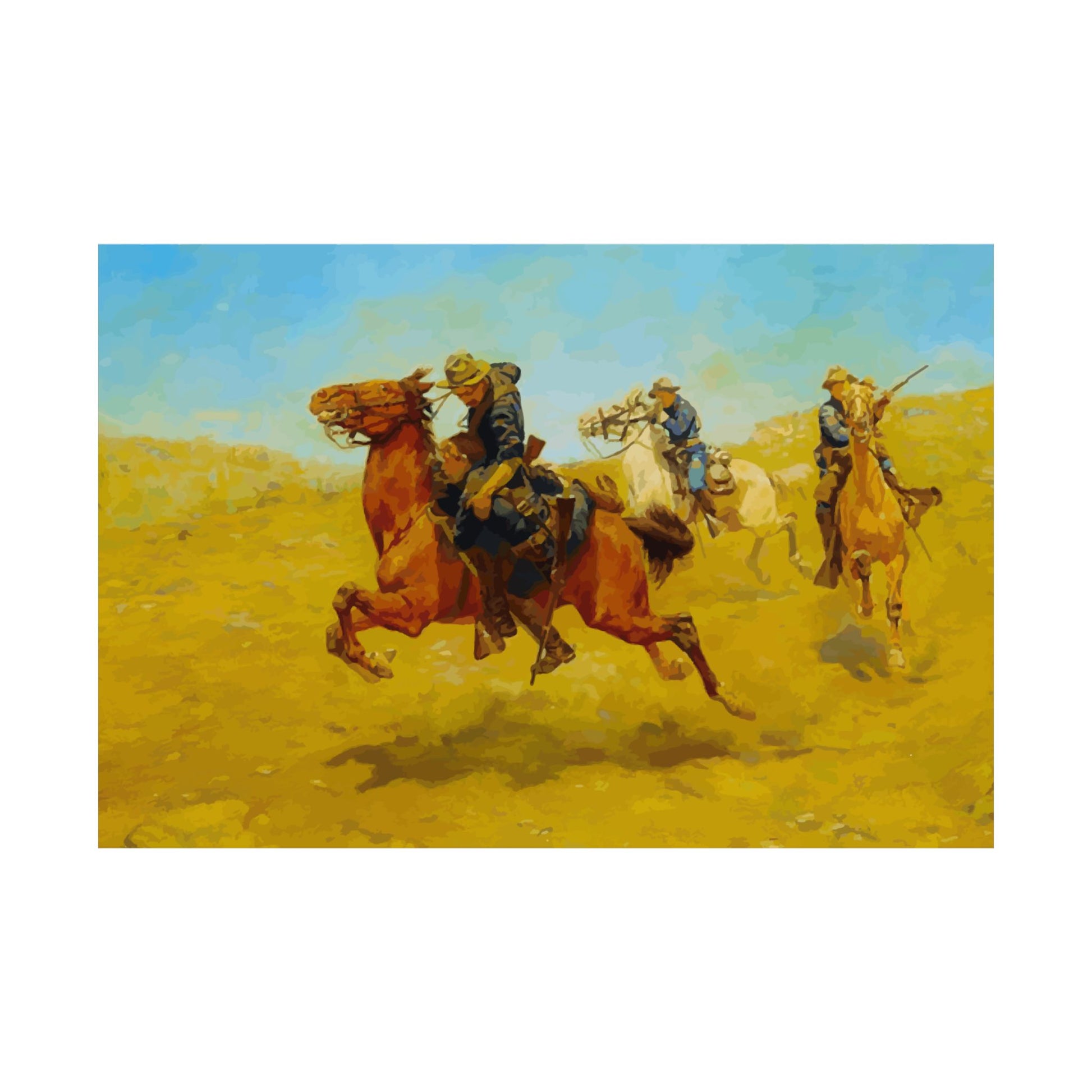 Add a little of bit of historical decoration with this Painting titled "My Bunkie" by Charles Schreyvogel depicting a U.S Cavalry unit. Perfect for history buffs, students, or anyone interested in American history. Ideal for decorating a home office, classroom, or study space.