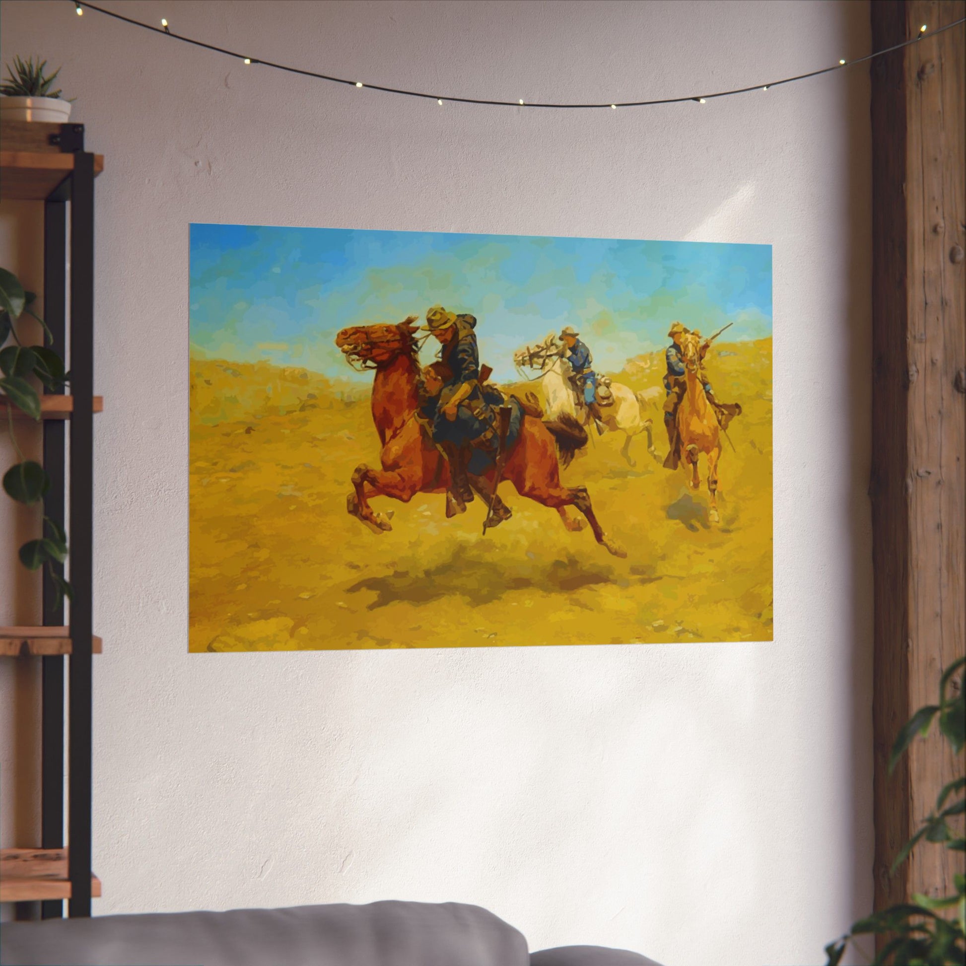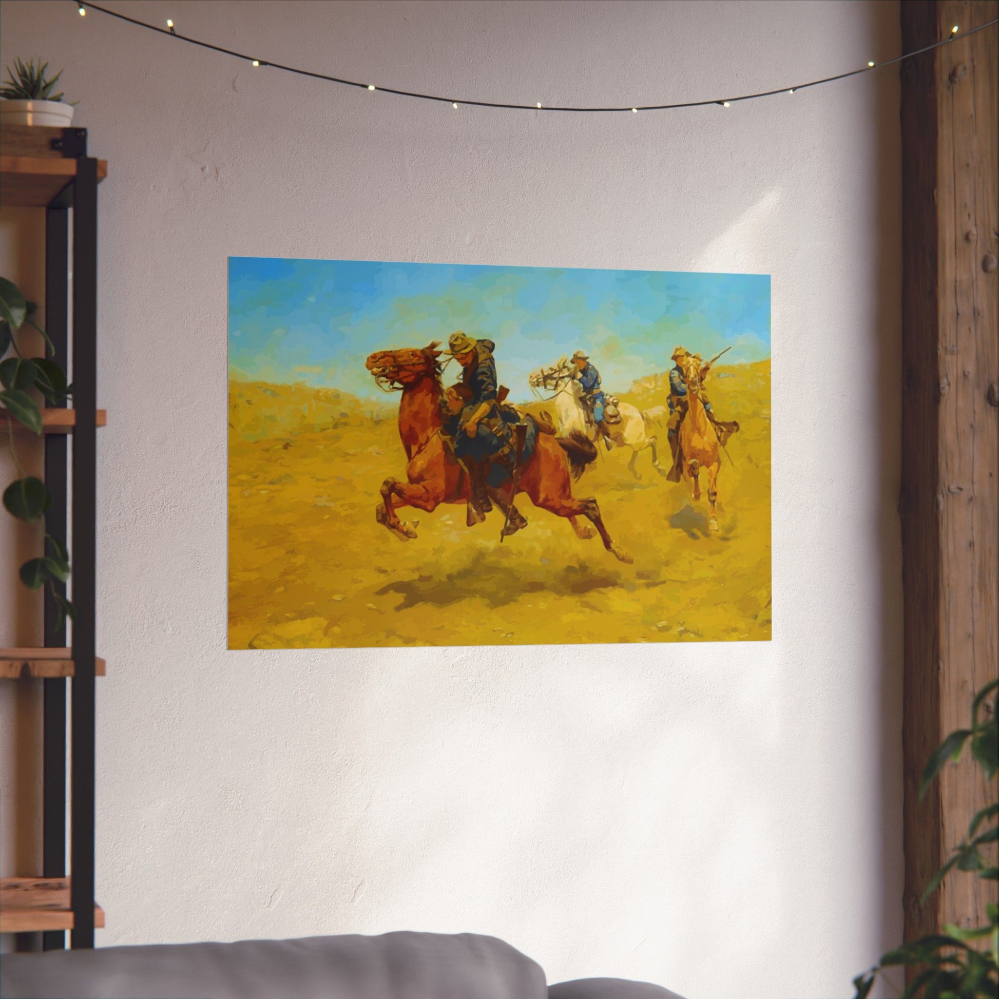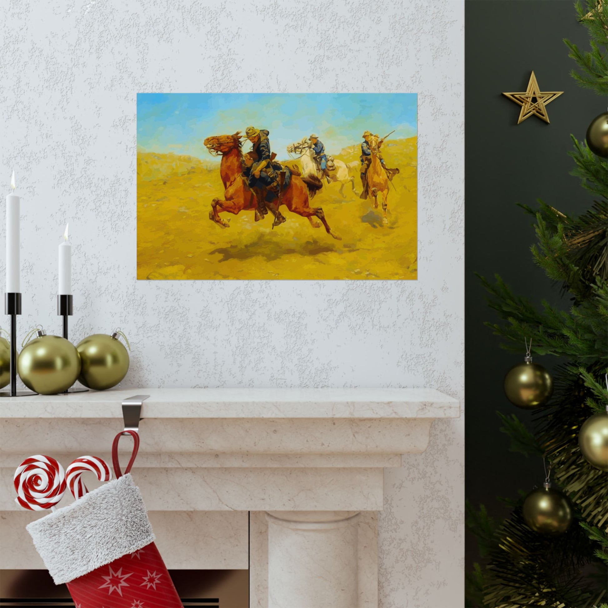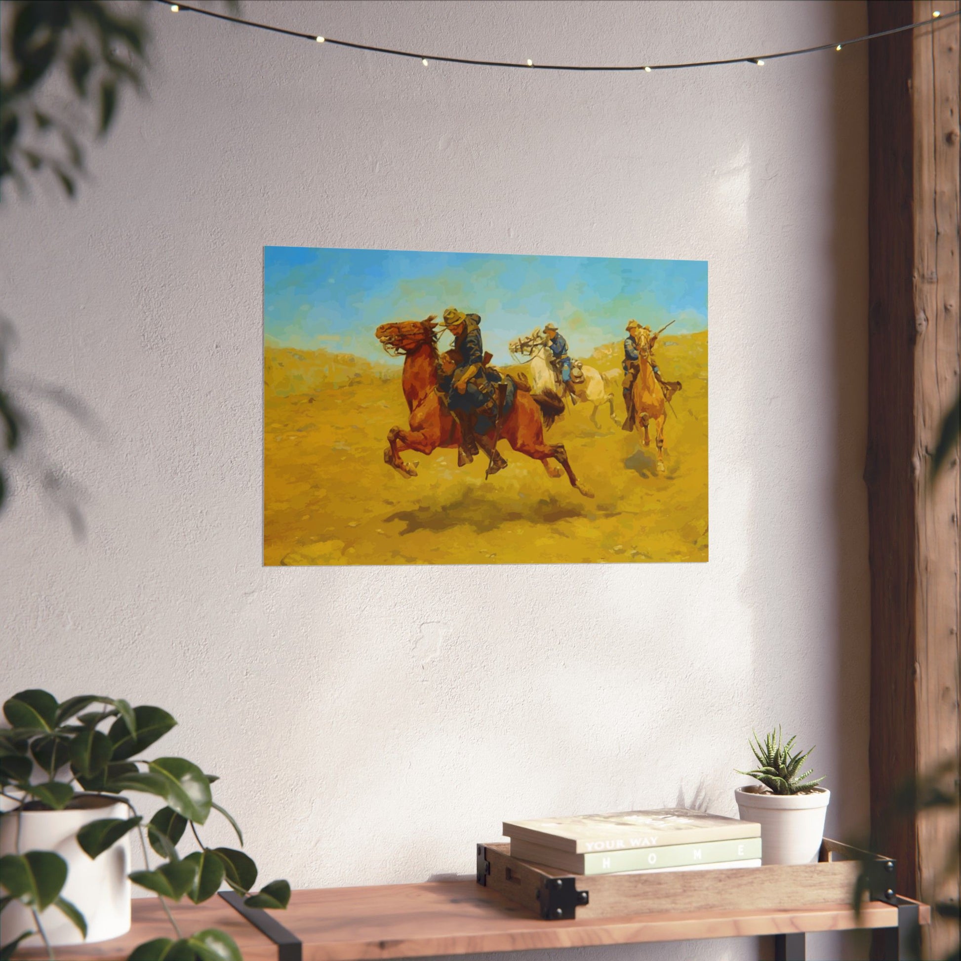 Add a little of bit of historical decoration with this Painting titled "My Bunkie" by Charles Schreyvogel depicting a U.S Cavalry unit. Perfect for history buffs, students, or anyone interested in American history. Ideal for decorating a home office, classroom, or study space.