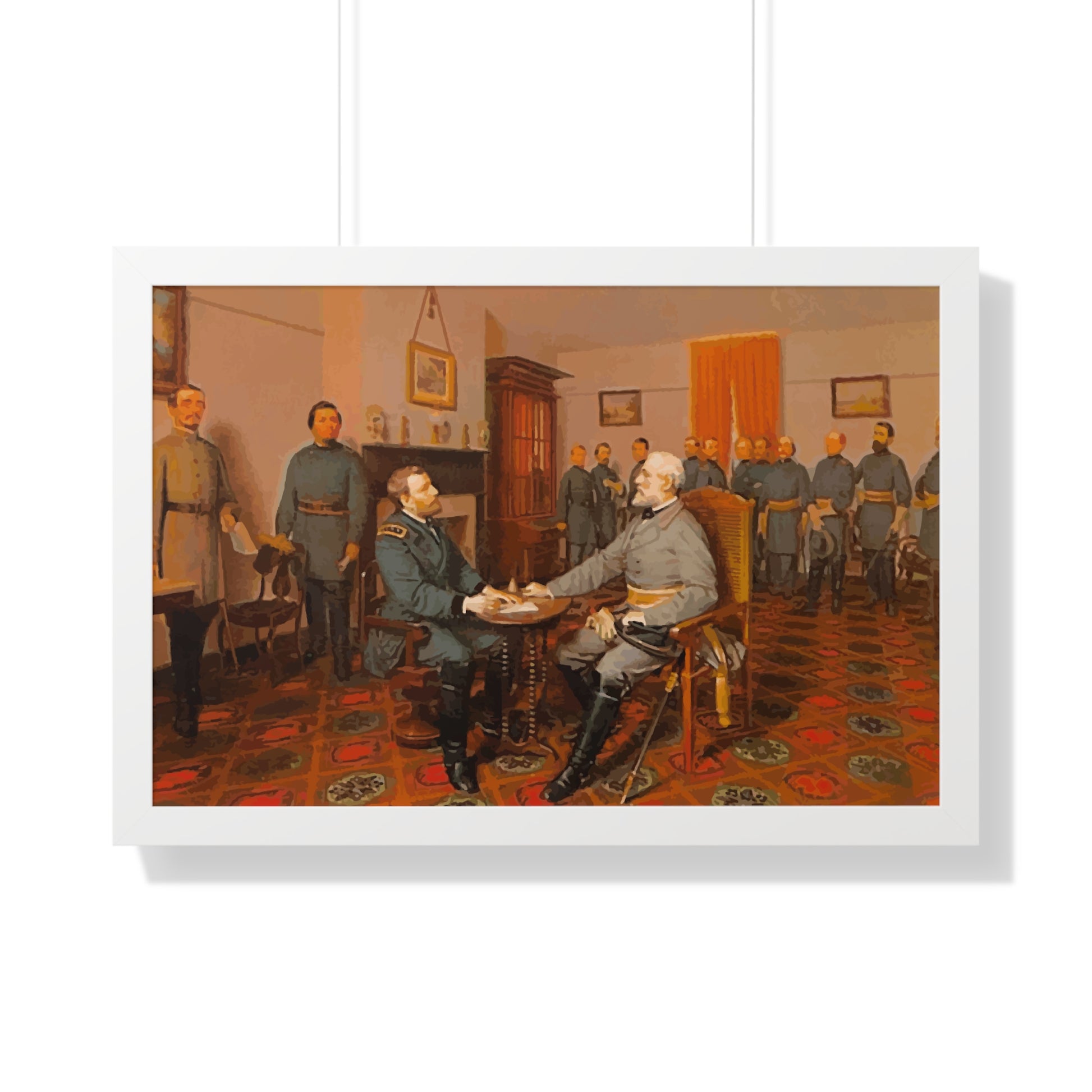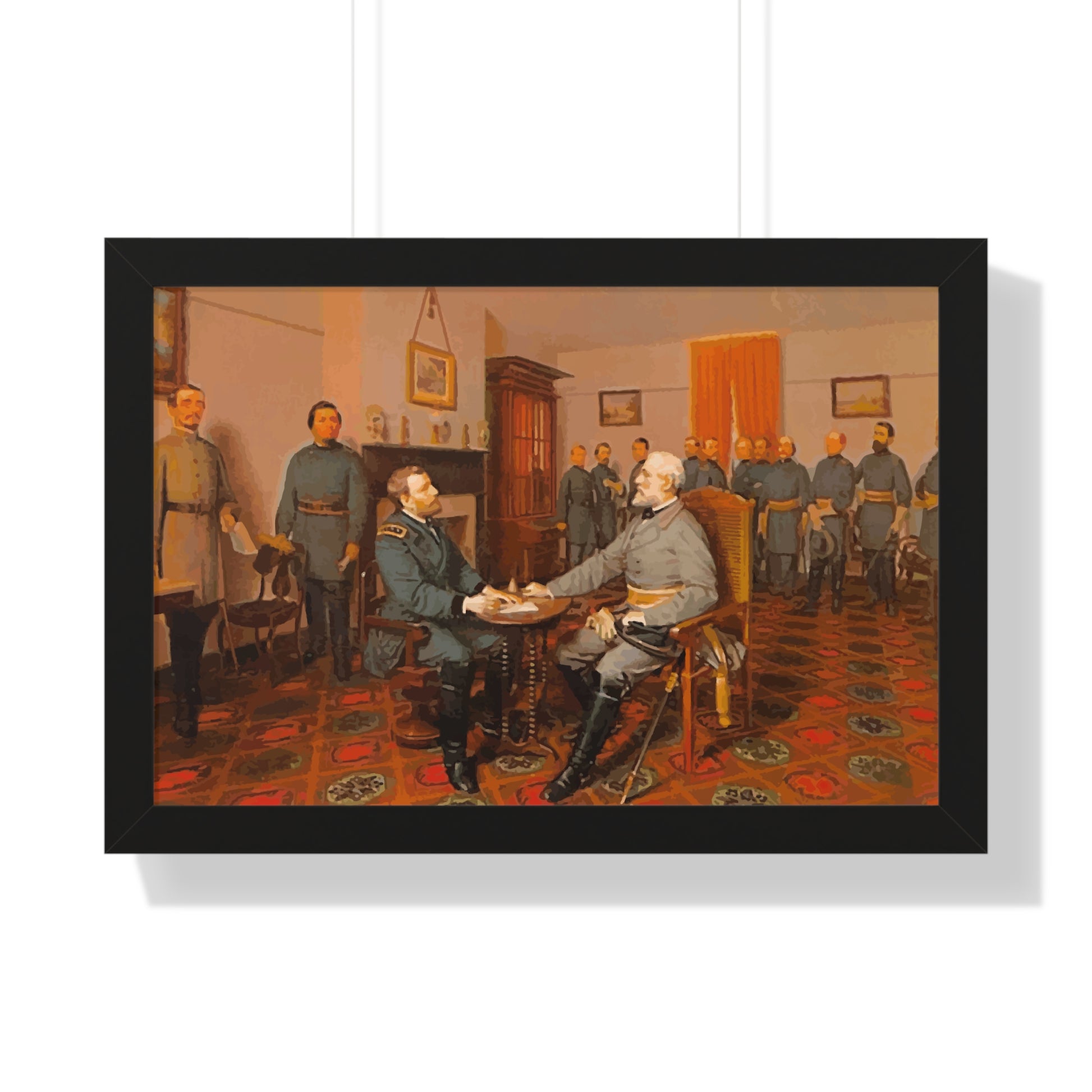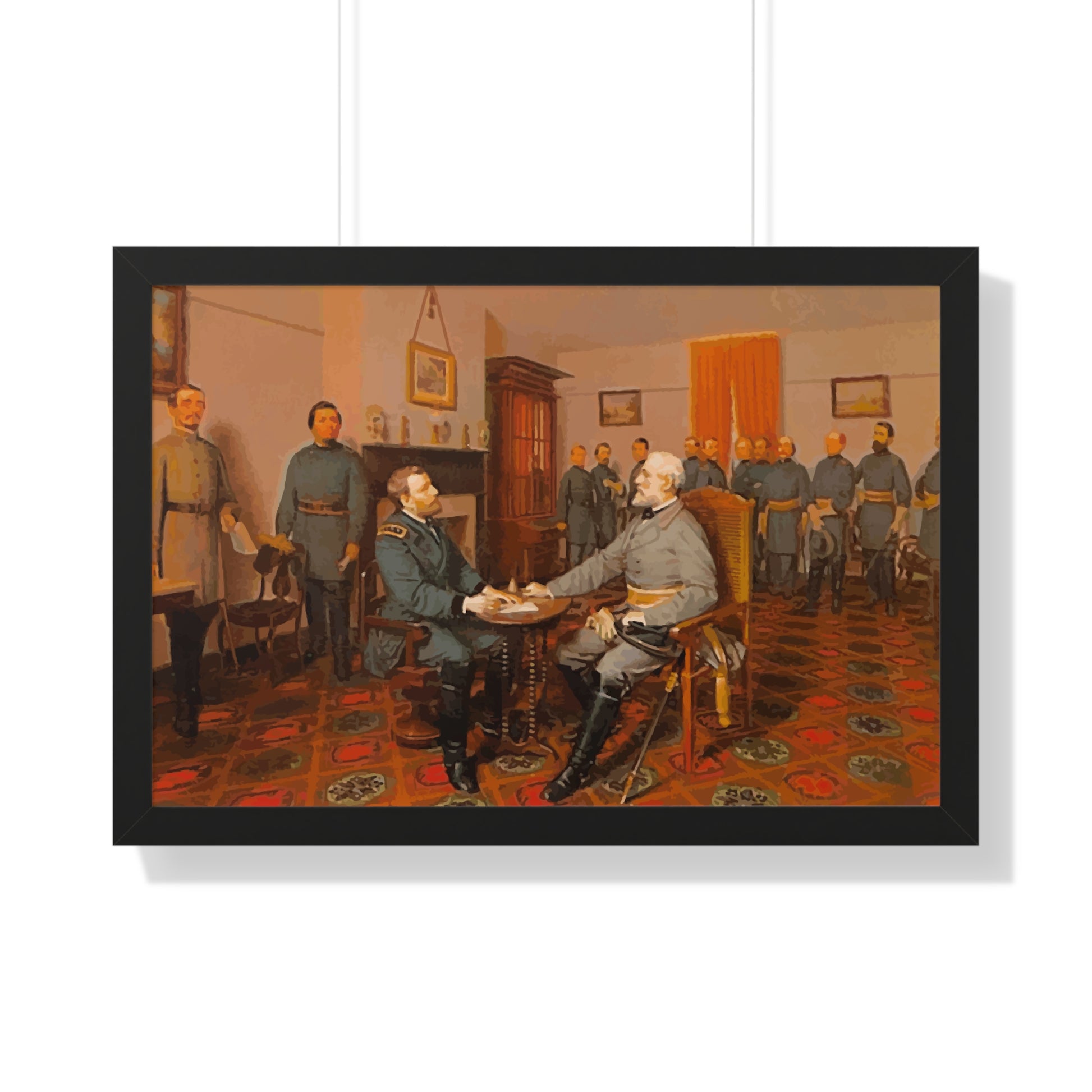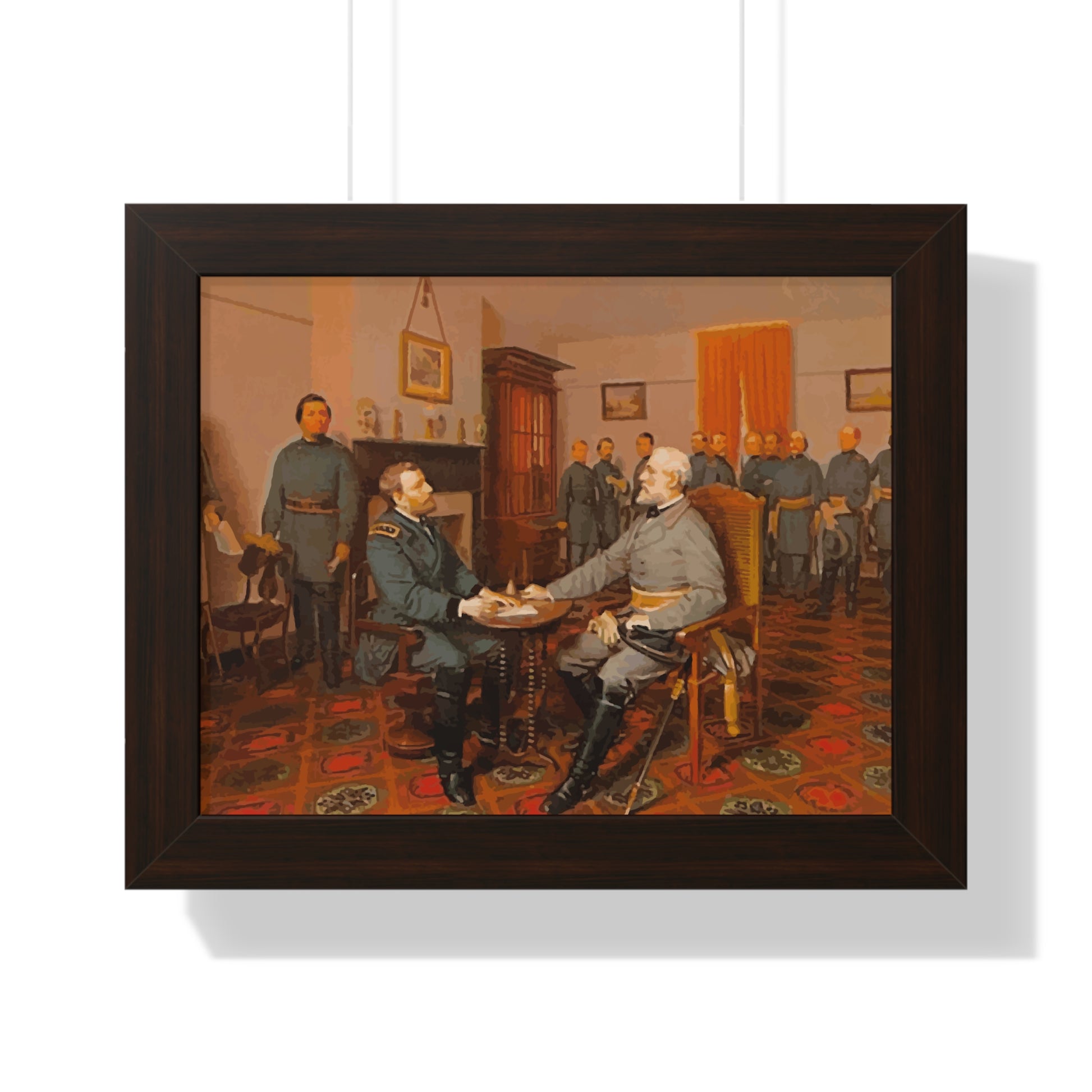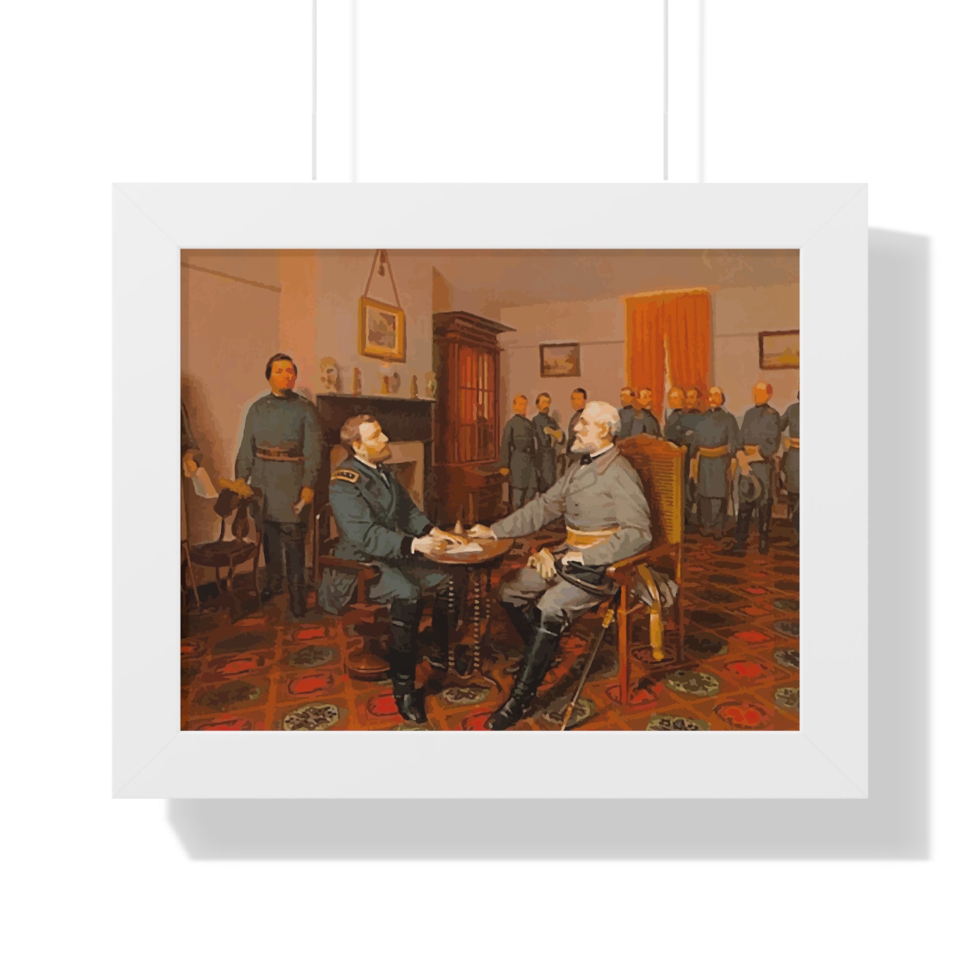 Elevate your wall decor with our Premium Framed Historical Painting of Confederate General Robert E Lee's surrender to Union General Ulysses. S Grant at Appomattox Court House, painted by Louis Guillaume. Available in three sophisticated colors: black, white, and walnut.
