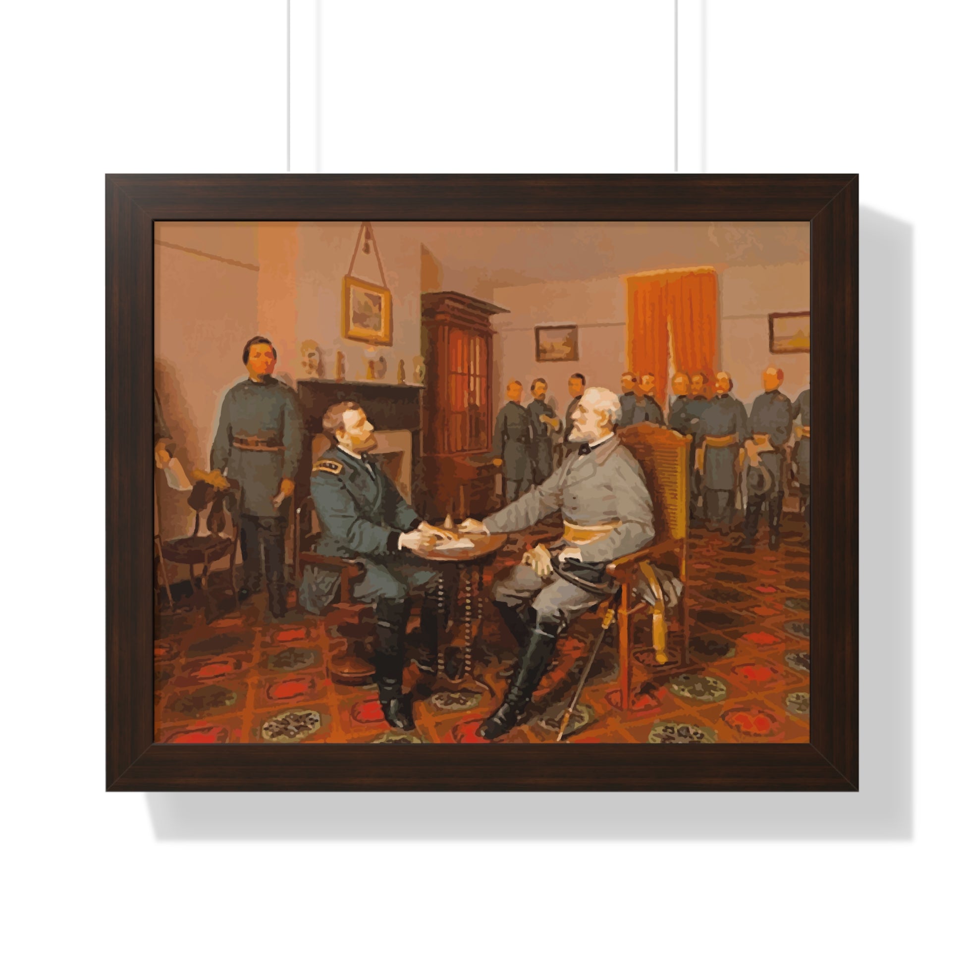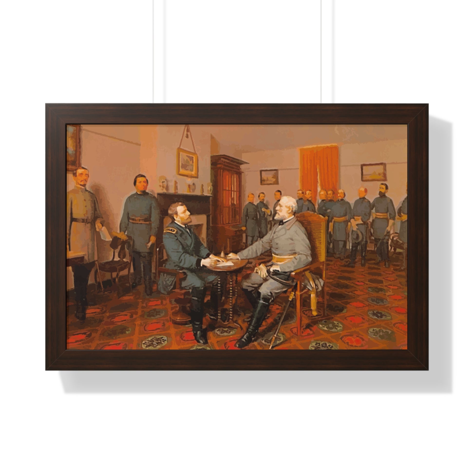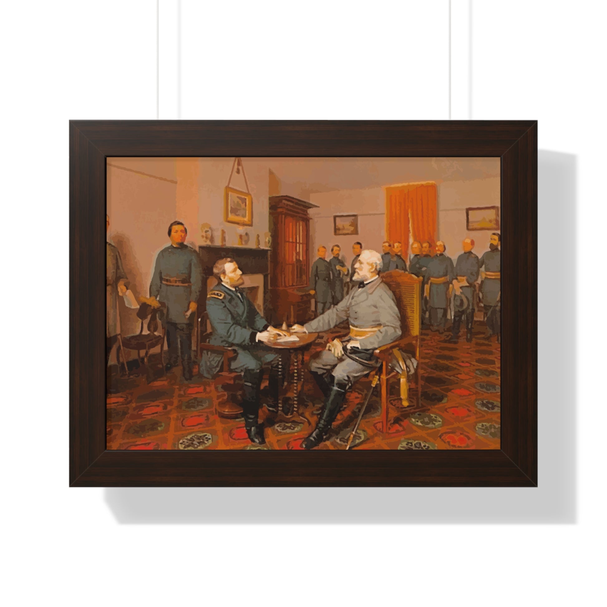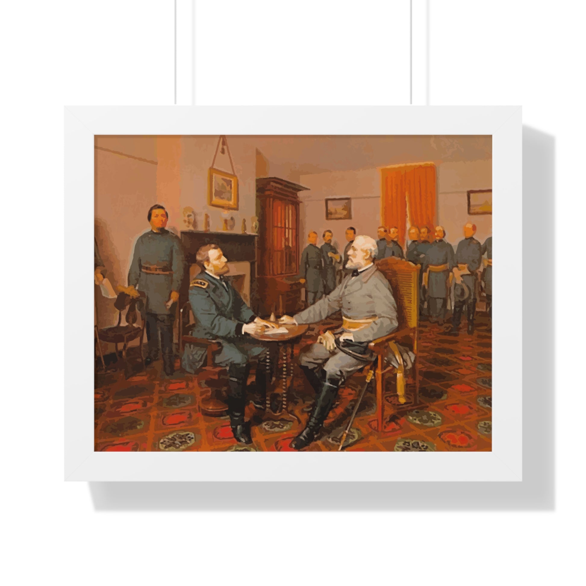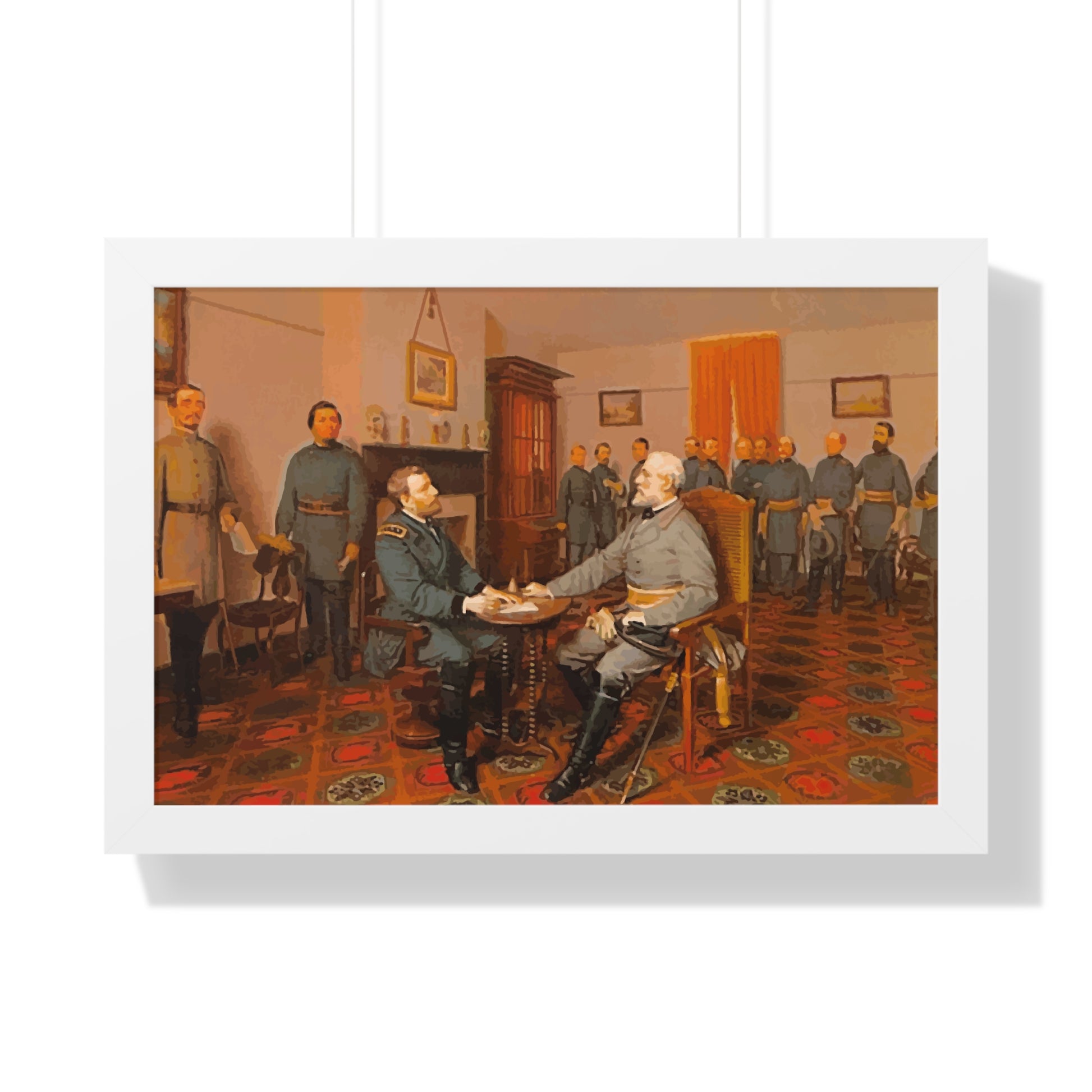 Elevate your wall decor with our Premium Framed Historical Painting of Confederate General Robert E Lee's surrender to Union General Ulysses. S Grant at Appomattox Court House, painted by Louis Guillaume. Available in three sophisticated colors: black, white, and walnut.
