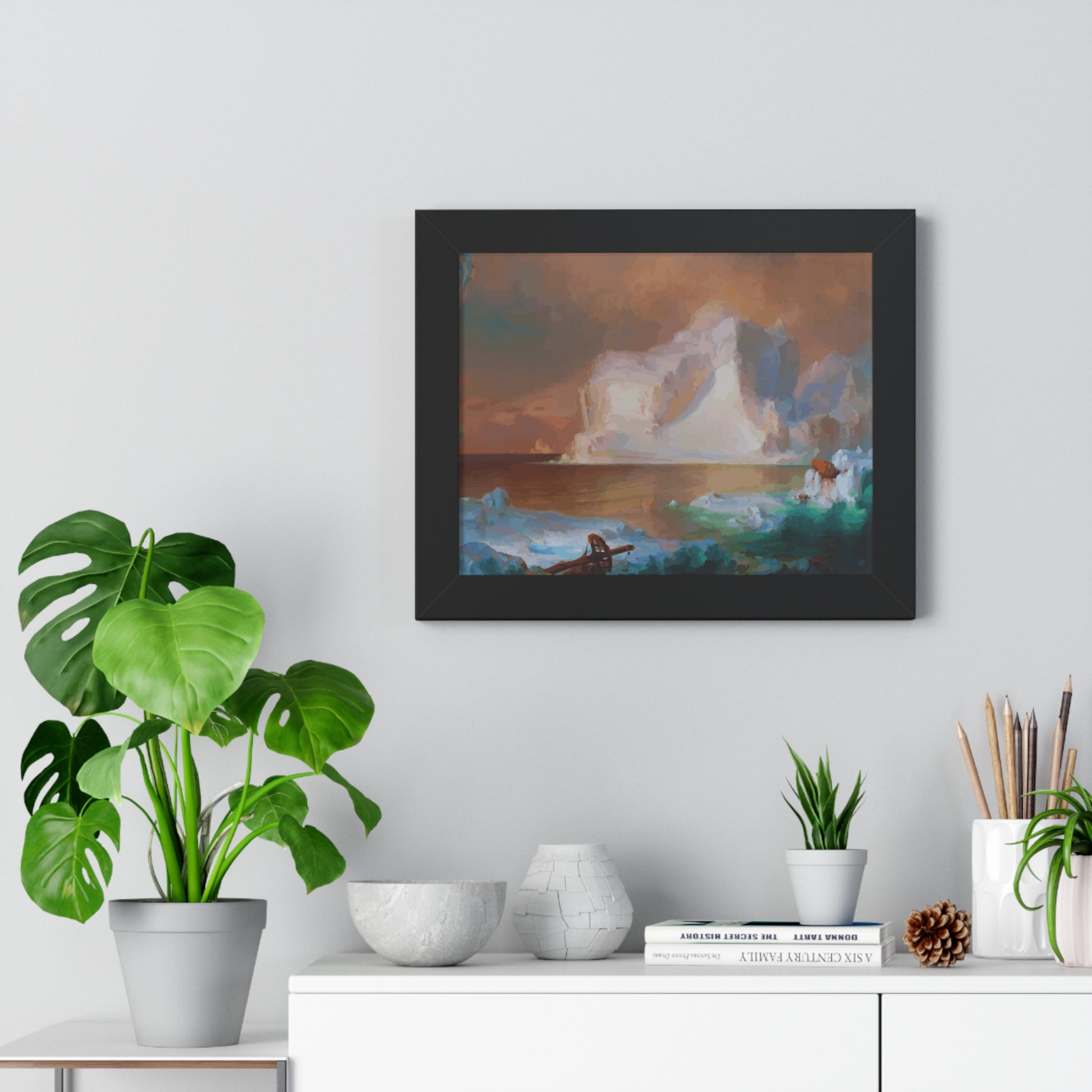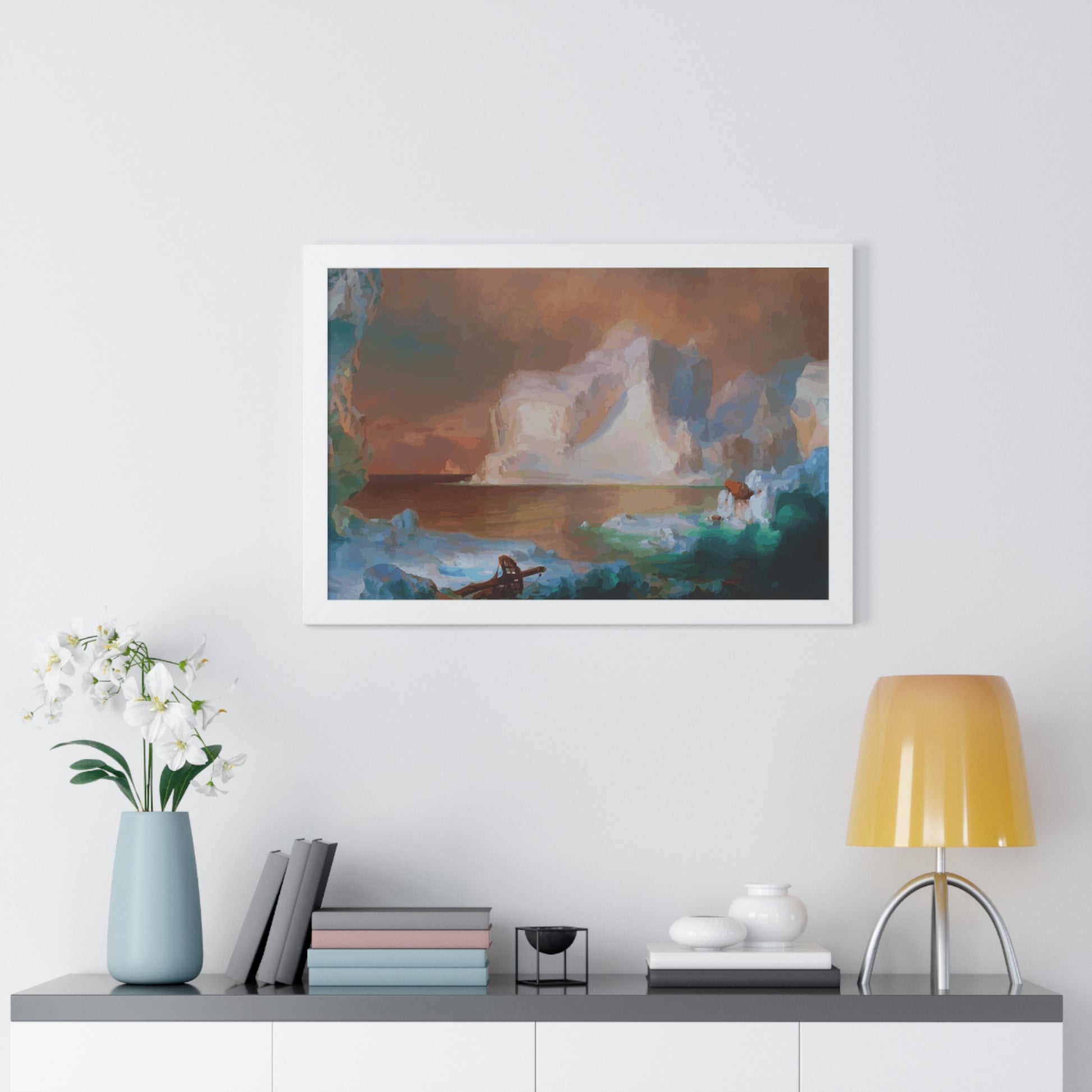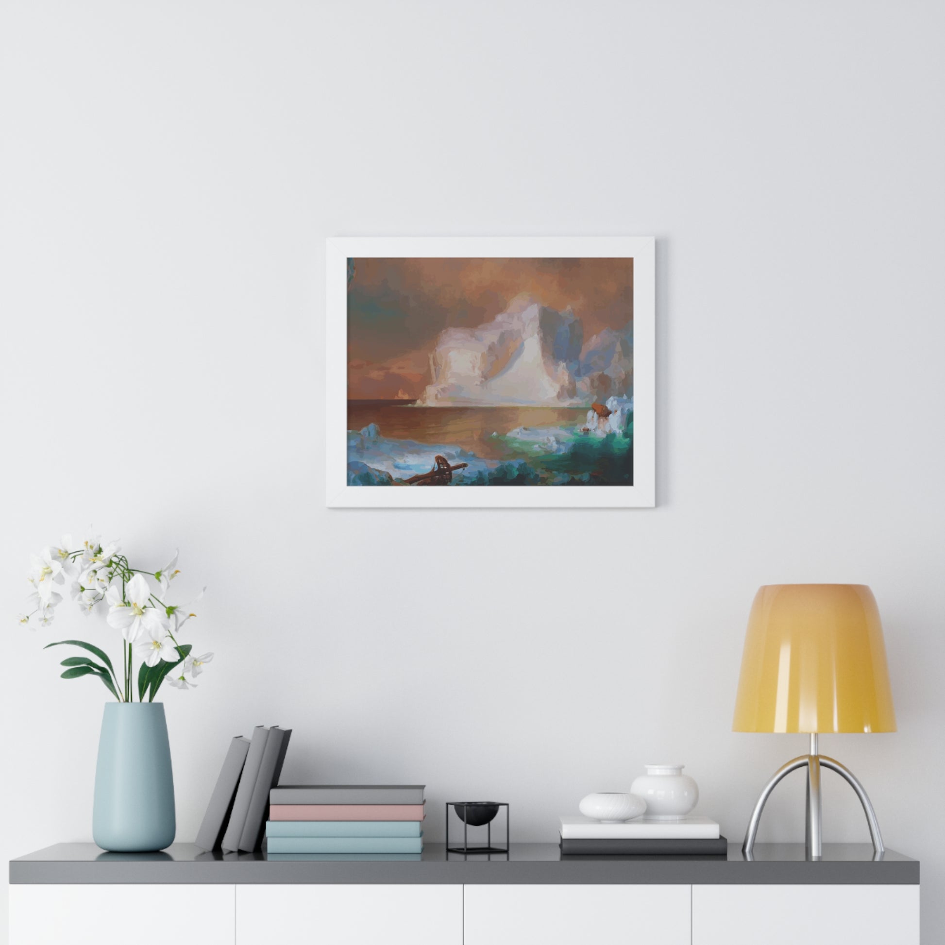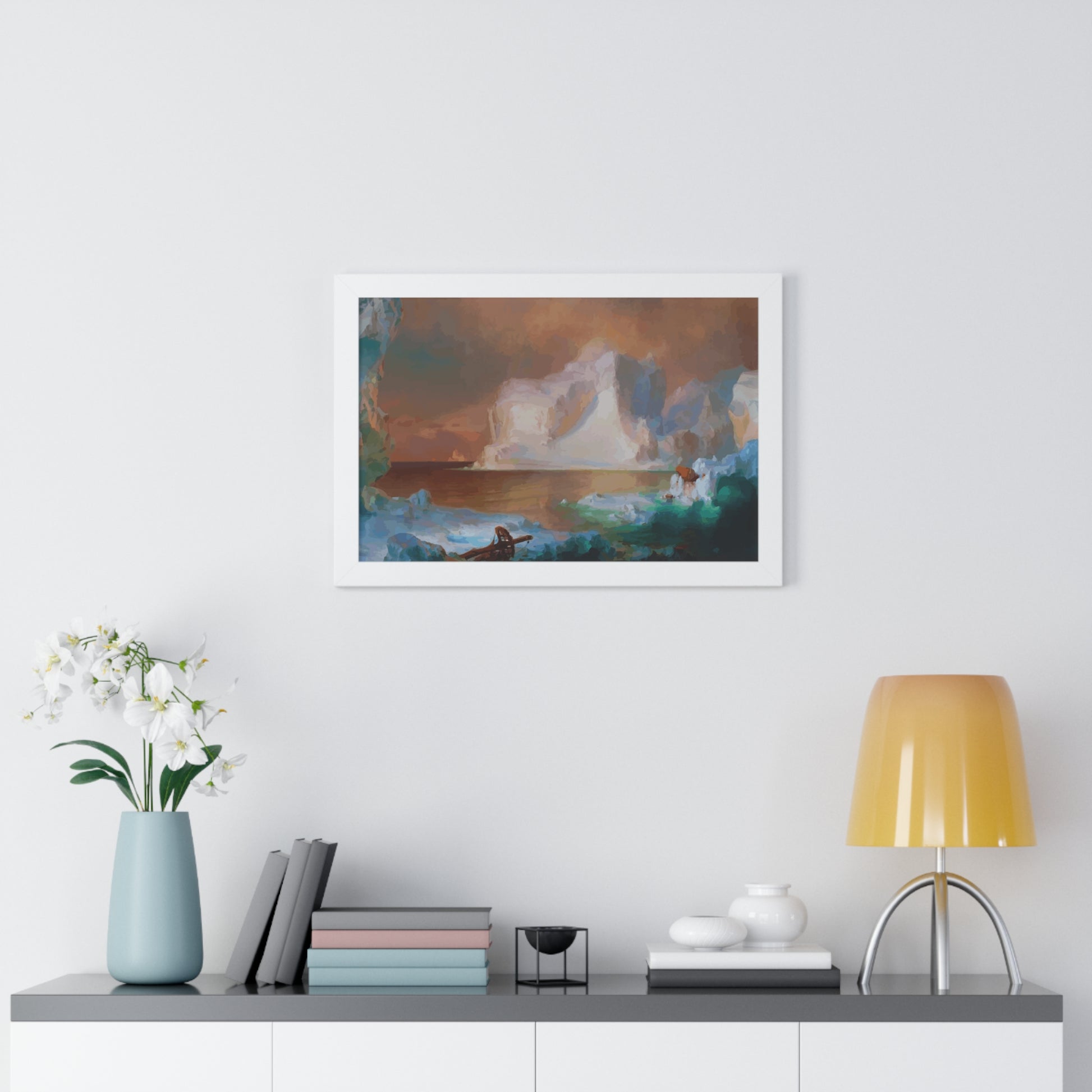 Elevate your wall decor with our Premium Framed Historical Painting titled "The Icebergs", painted by American painter Frederic Edwin Church in 1861. Available in three sophisticated colors: black, white, and walnut.