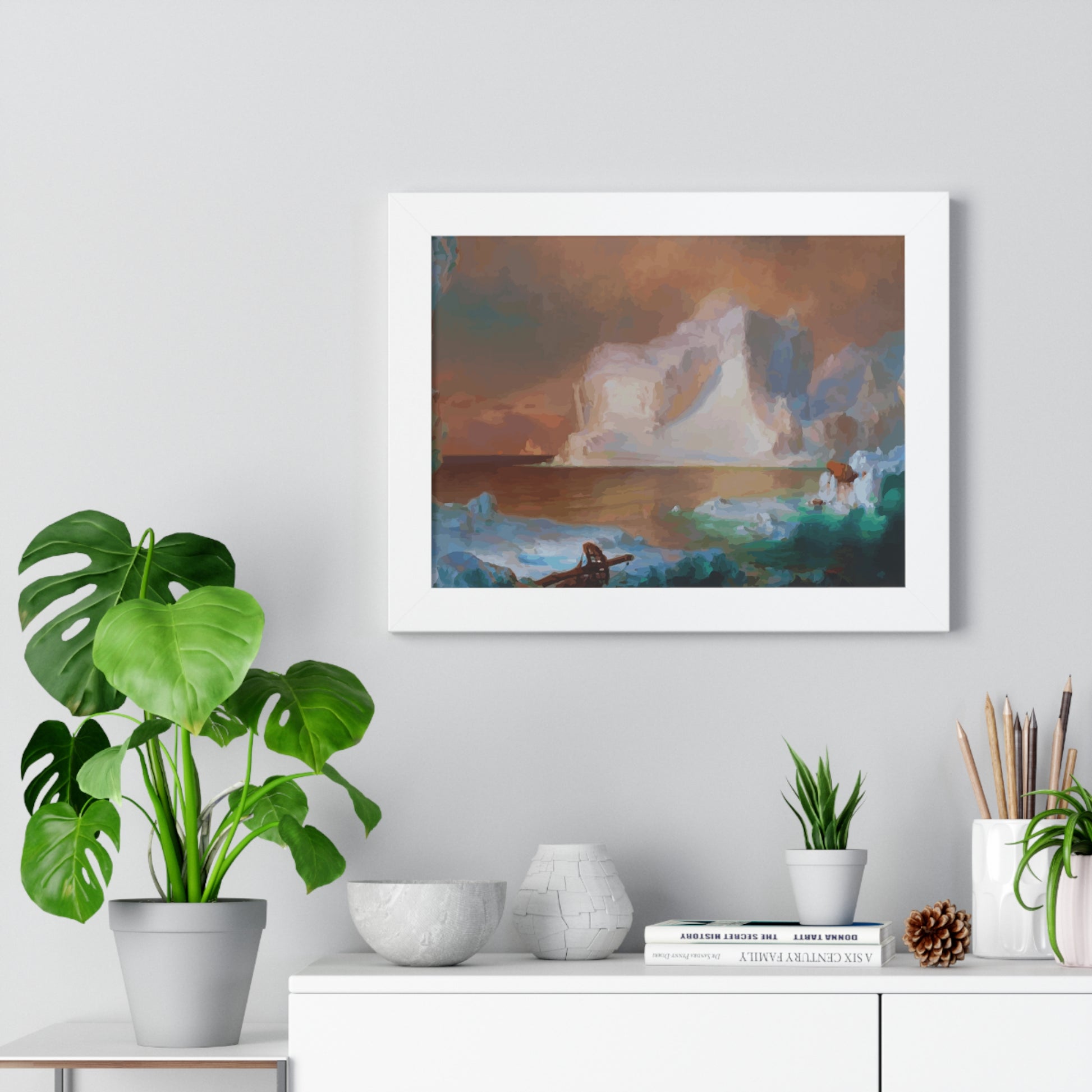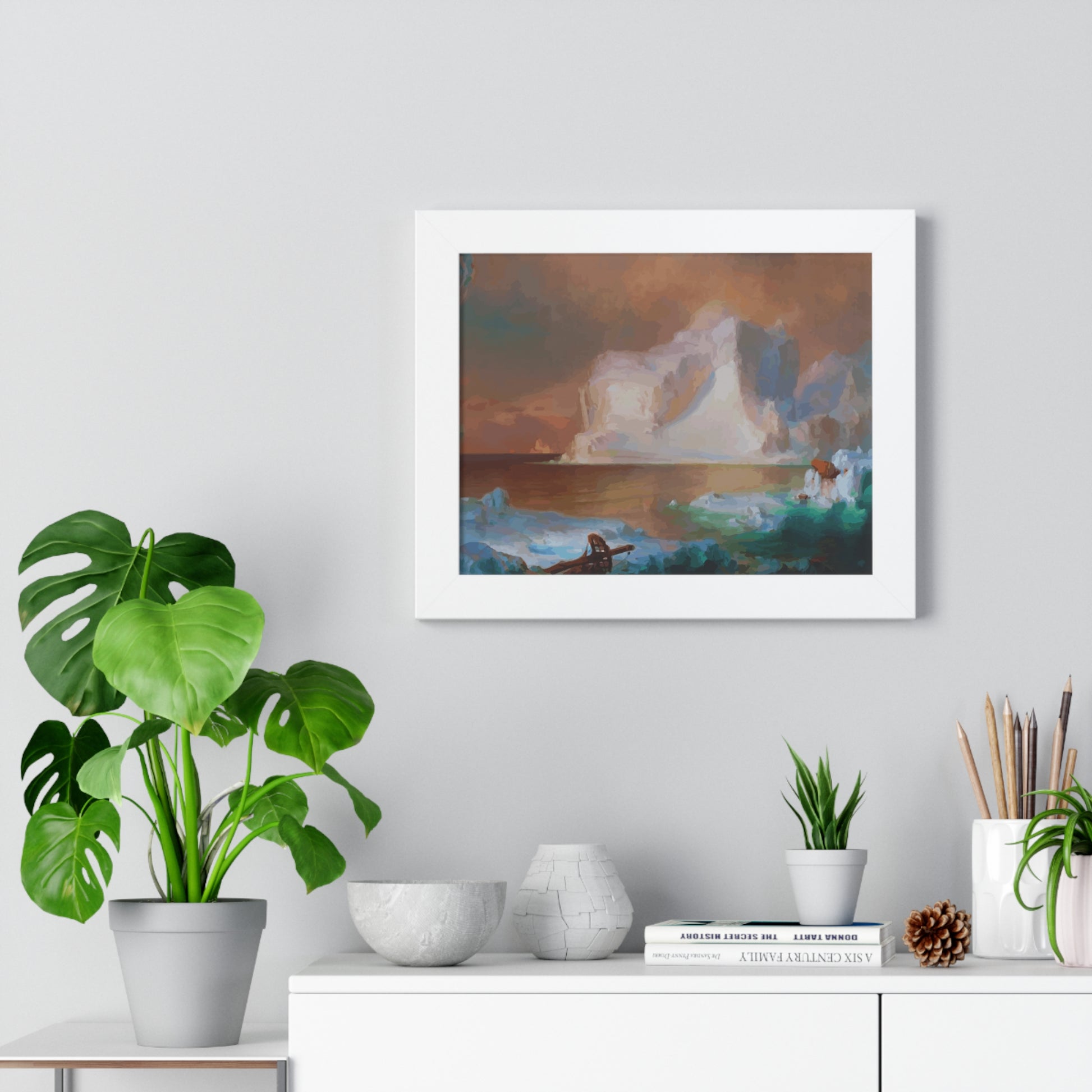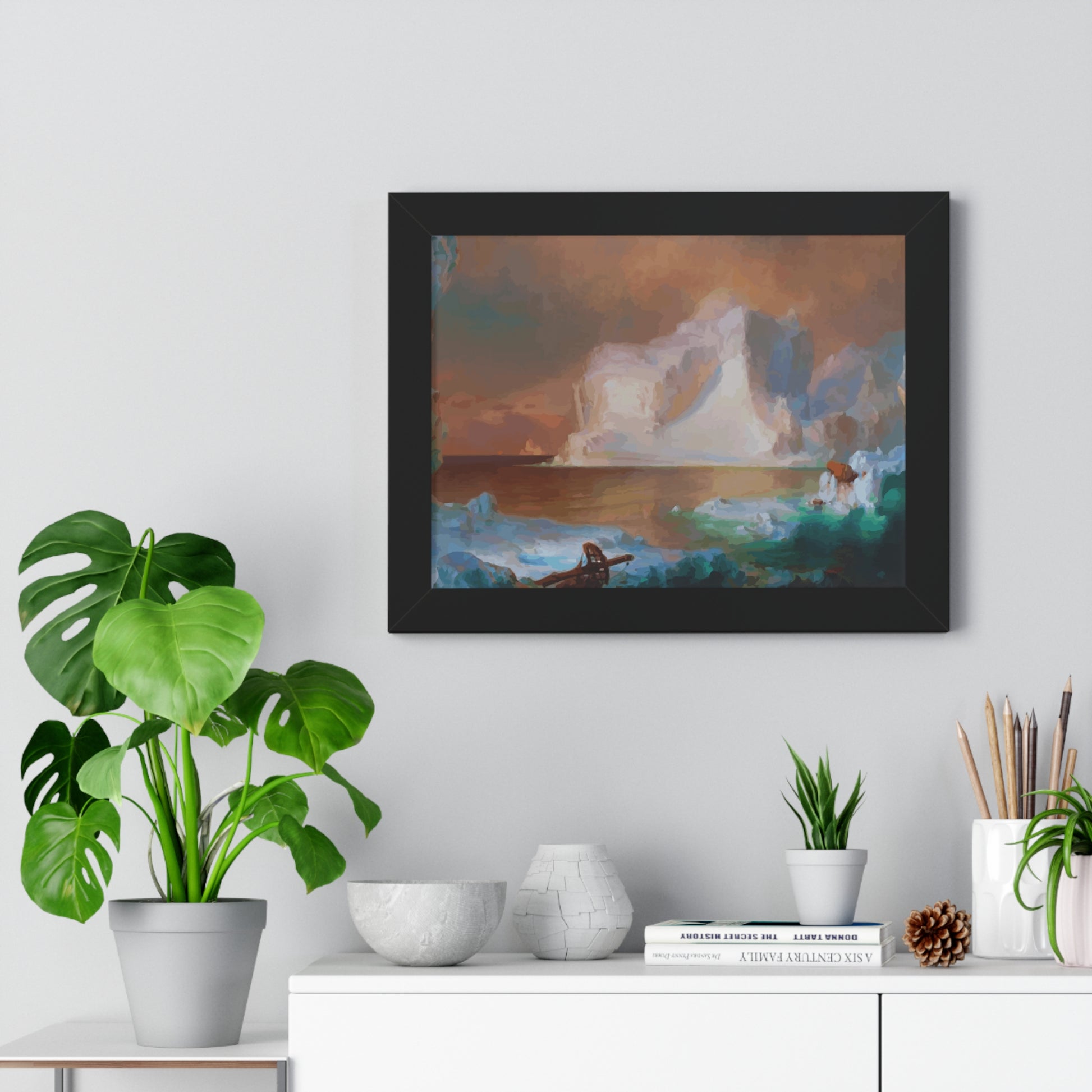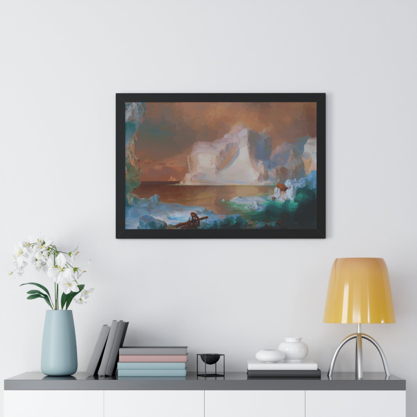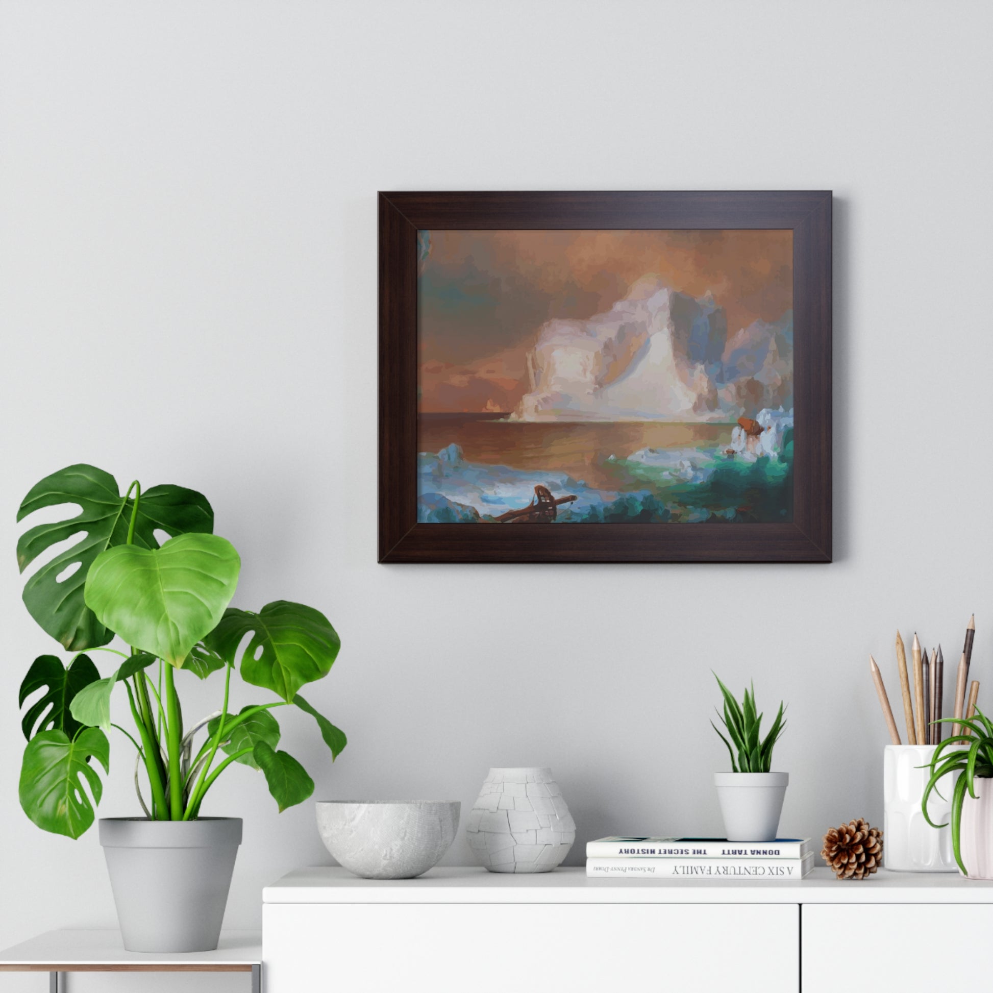 Elevate your wall decor with our Premium Framed Historical Painting titled "The Icebergs", painted by American painter Frederic Edwin Church in 1861. Available in three sophisticated colors: black, white, and walnut.