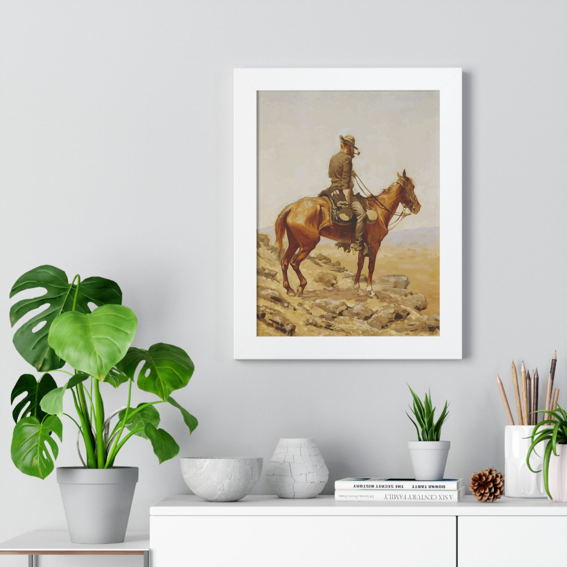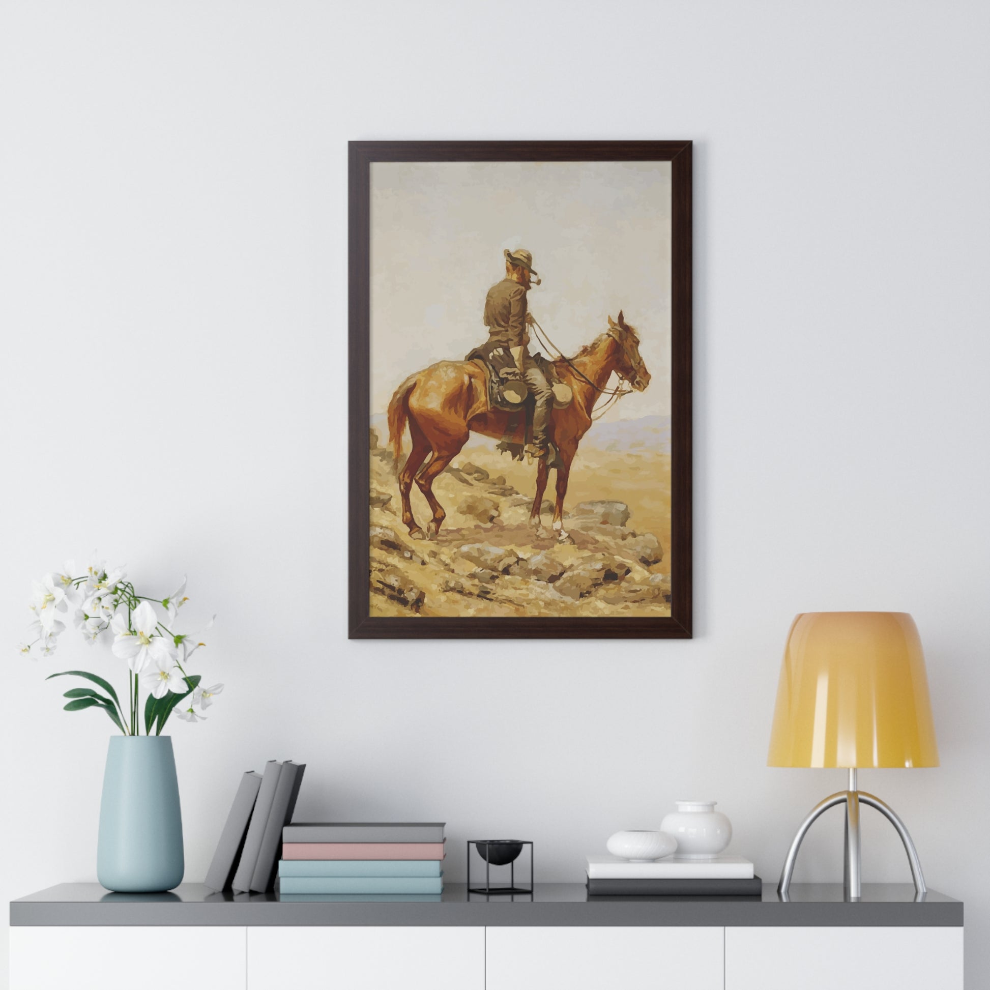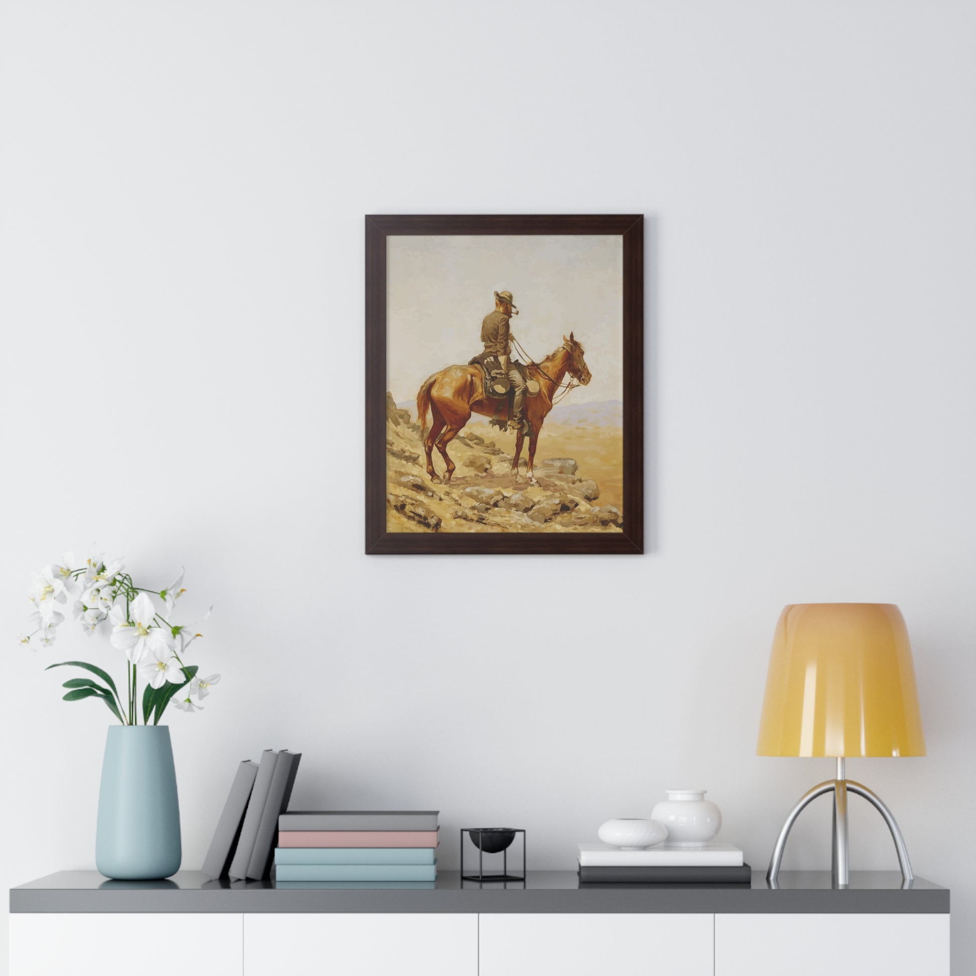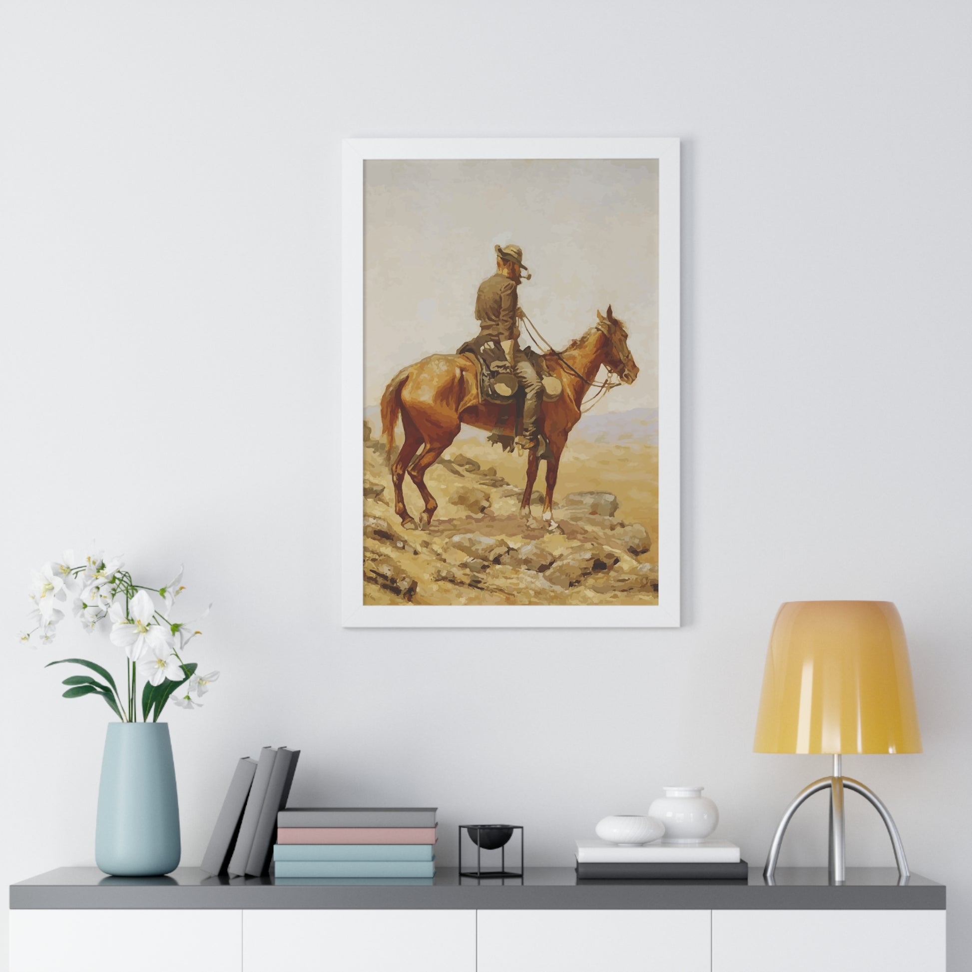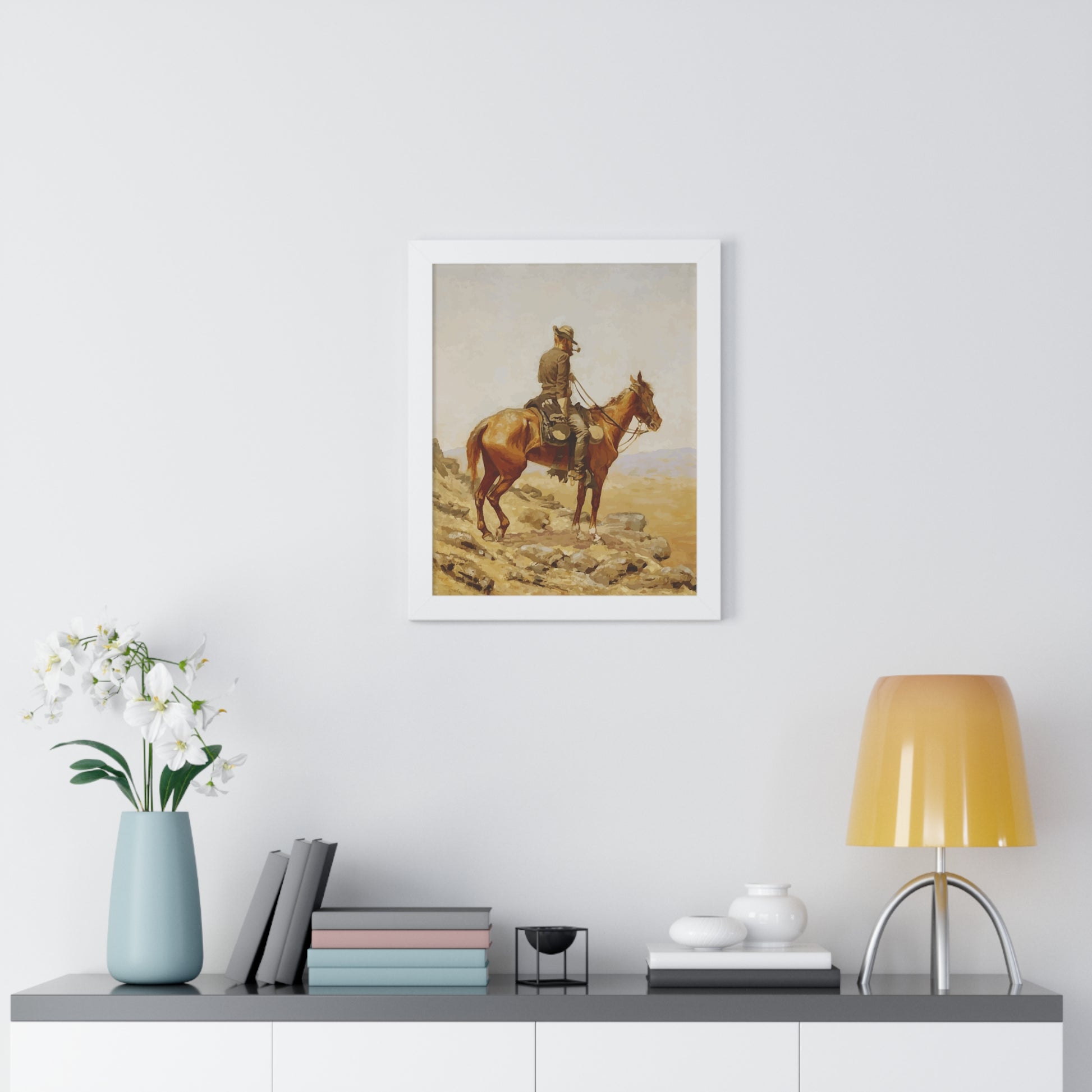 Elevate your home décor with this stunning Framed Vertical Poster Titled "The Lookout" painted by Frederic Remington in 1887. Perfect for art enthusiasts and history buffs alike, this exquisite piece creates a captivating atmosphere in any space. Whether you're decorating a living room, office, or study, this framed poster effortlessly enhances your surroundings with its vibrant colors and rich detail.