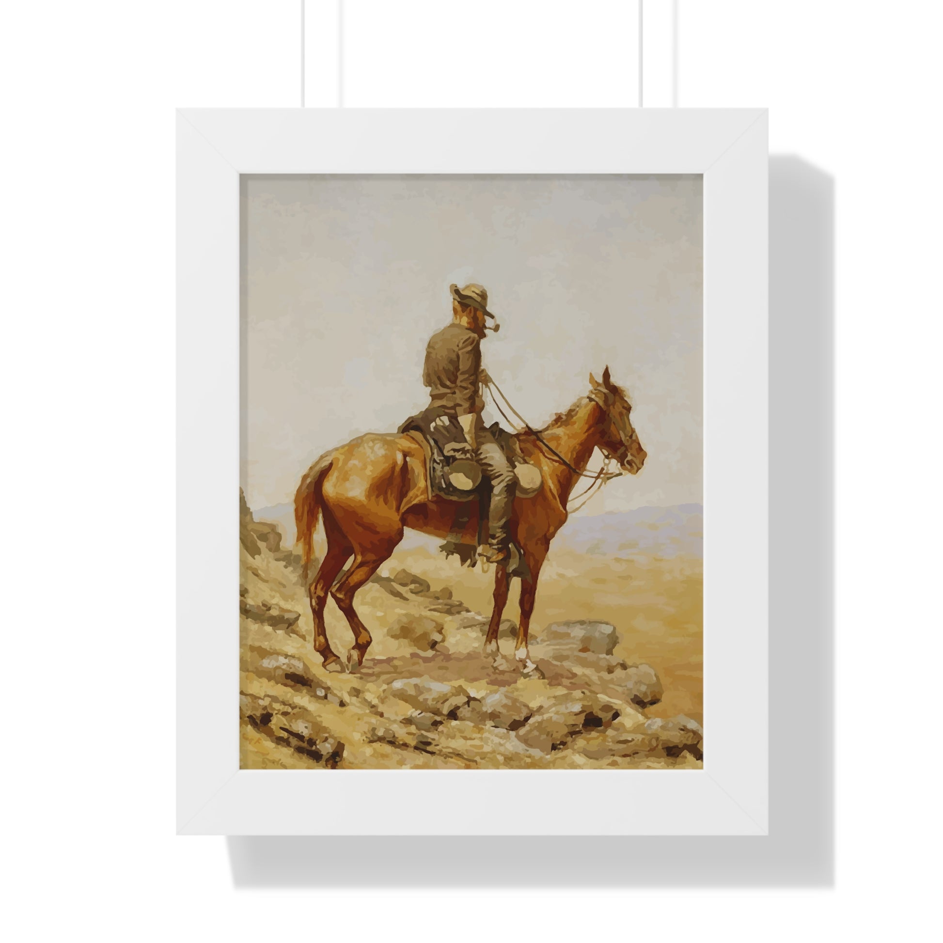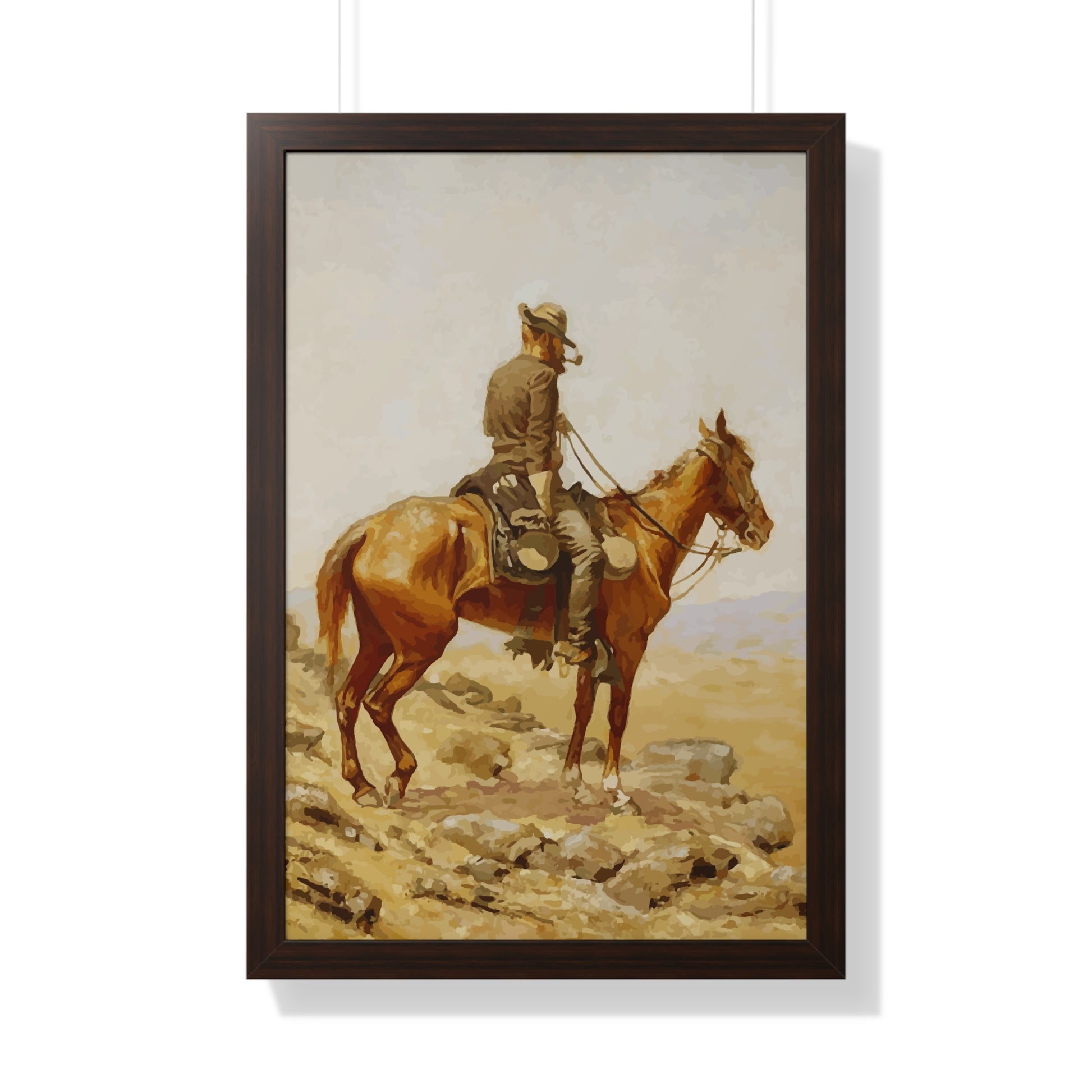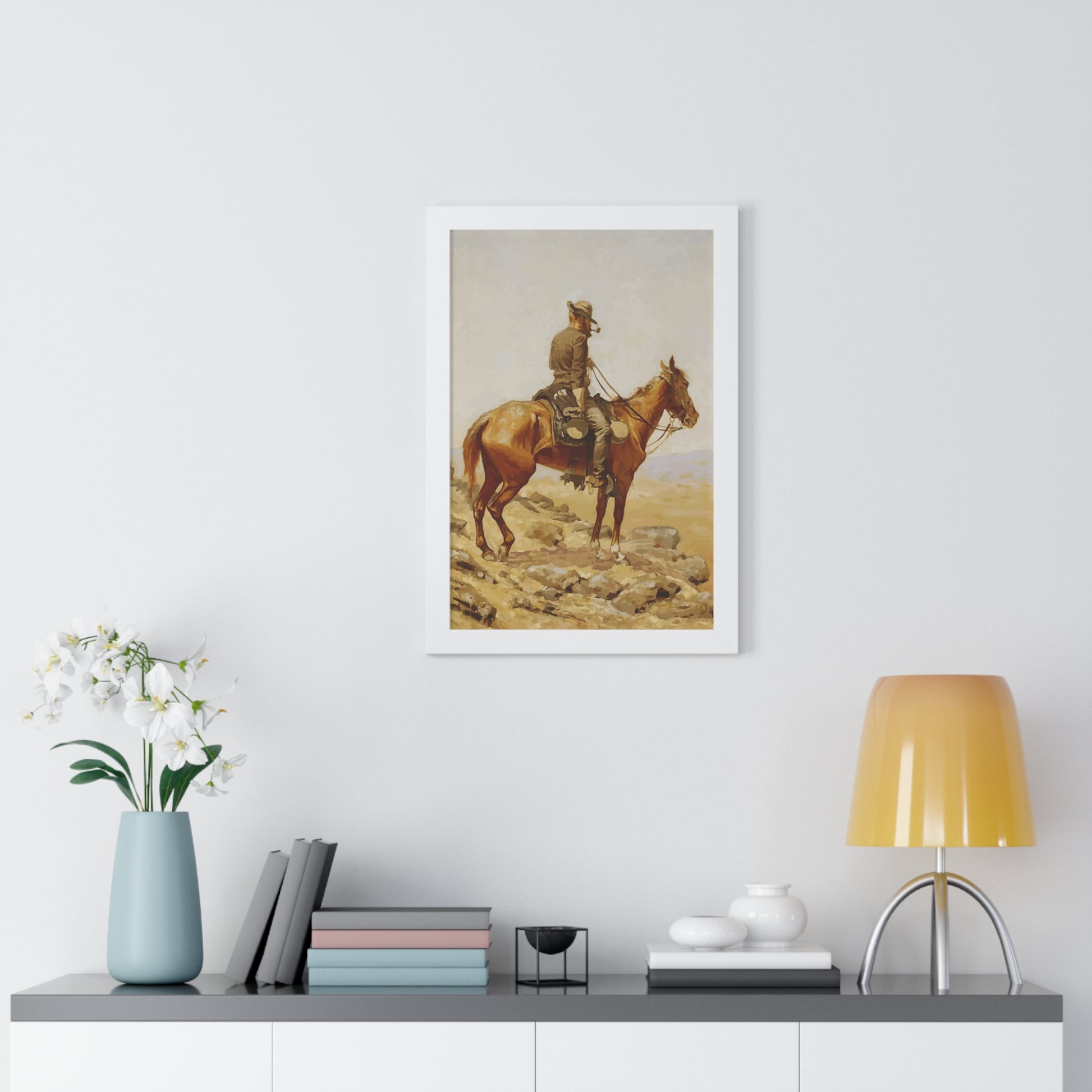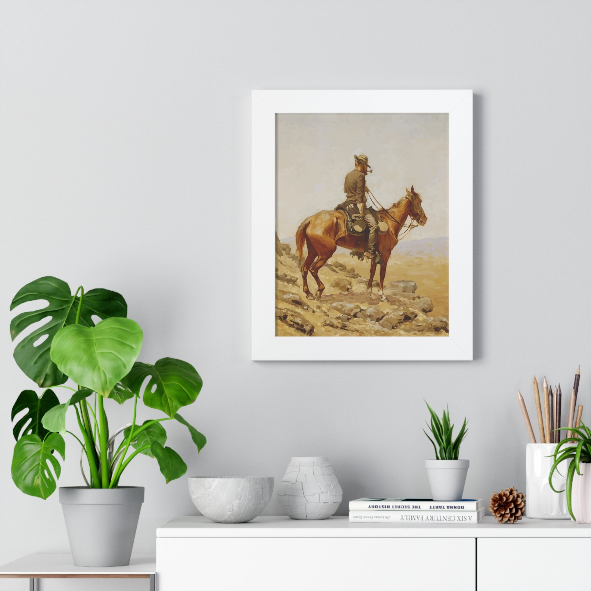 Elevate your home décor with this stunning Framed Vertical Poster Titled "The Lookout" painted by Frederic Remington in 1887. Perfect for art enthusiasts and history buffs alike, this exquisite piece creates a captivating atmosphere in any space. Whether you're decorating a living room, office, or study, this framed poster effortlessly enhances your surroundings with its vibrant colors and rich detail.