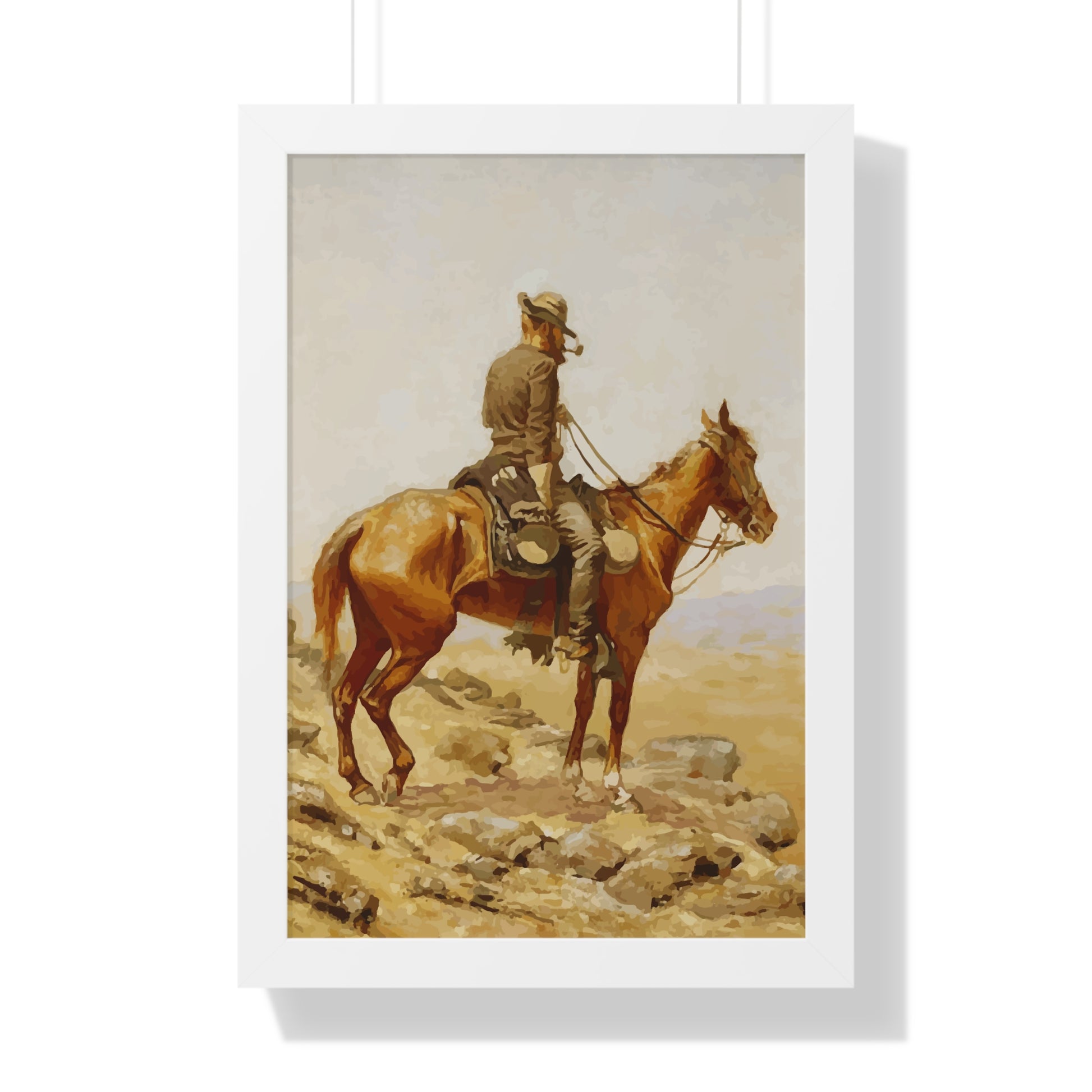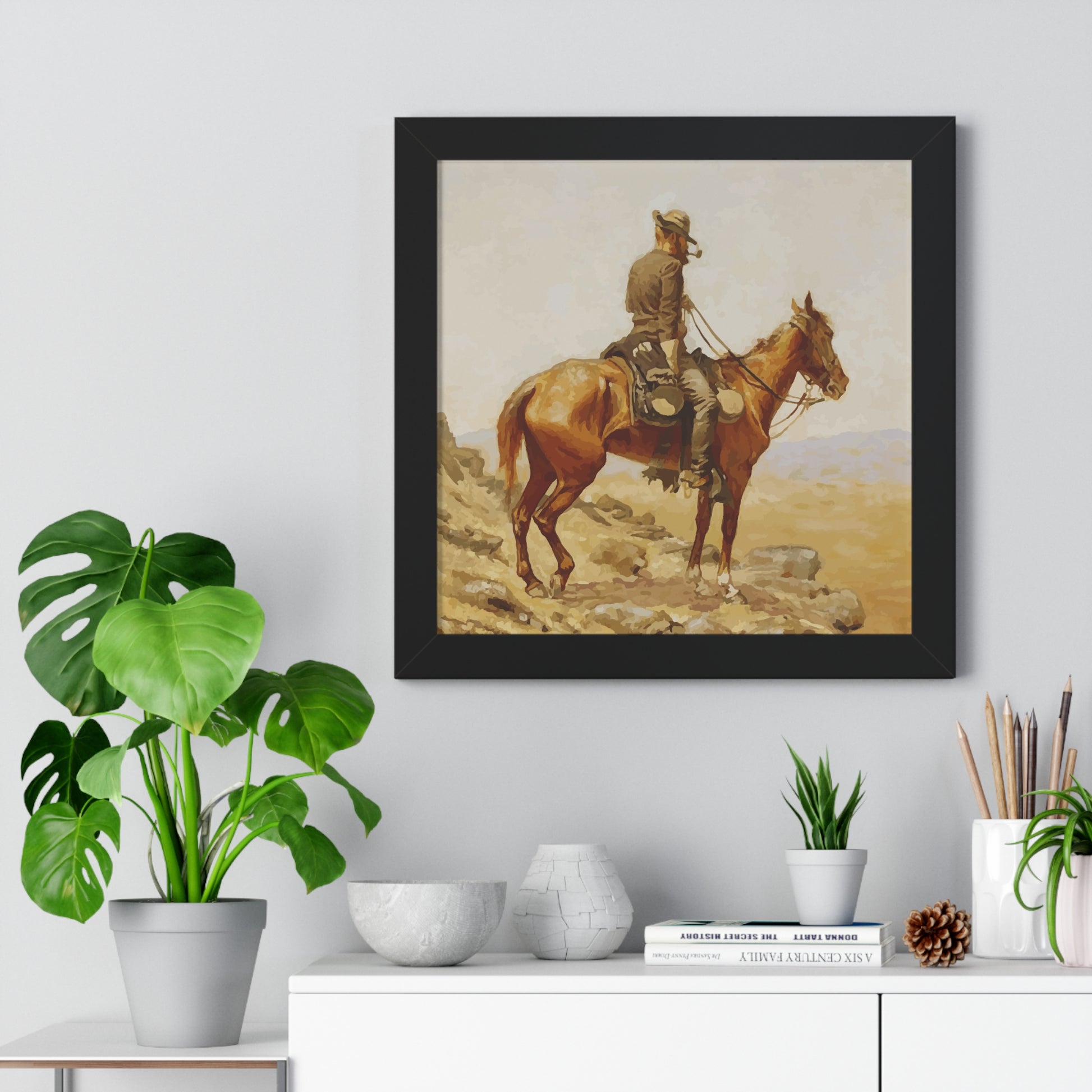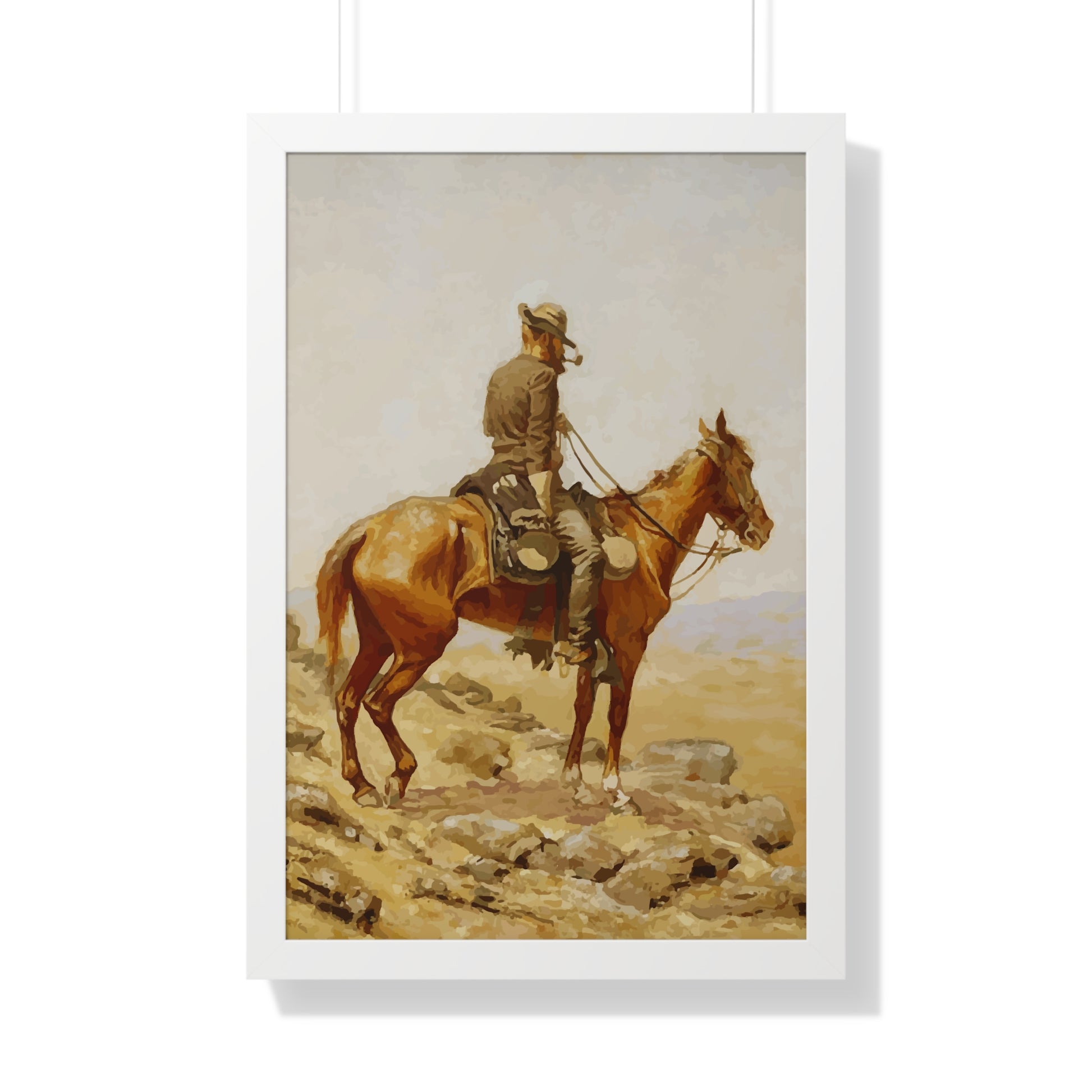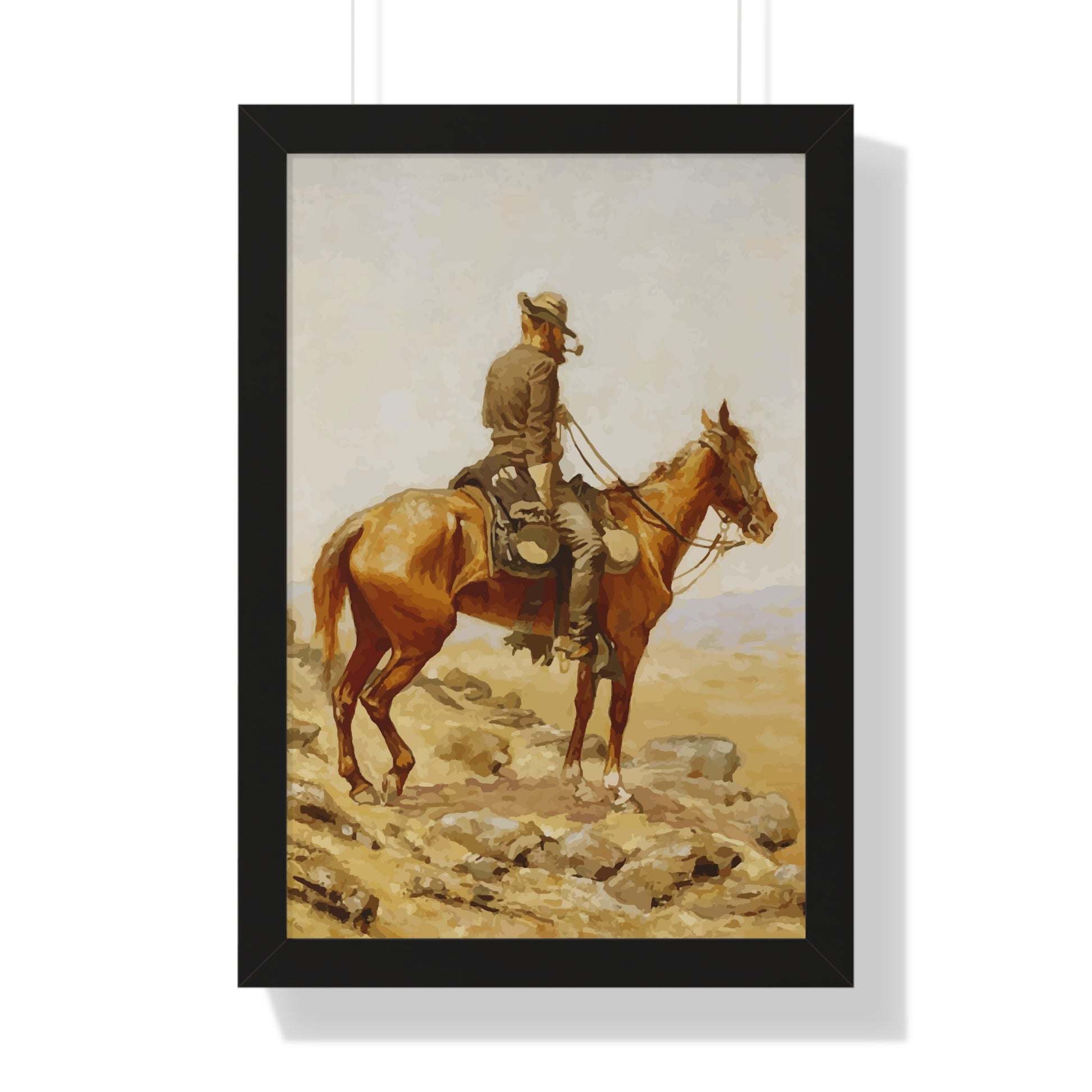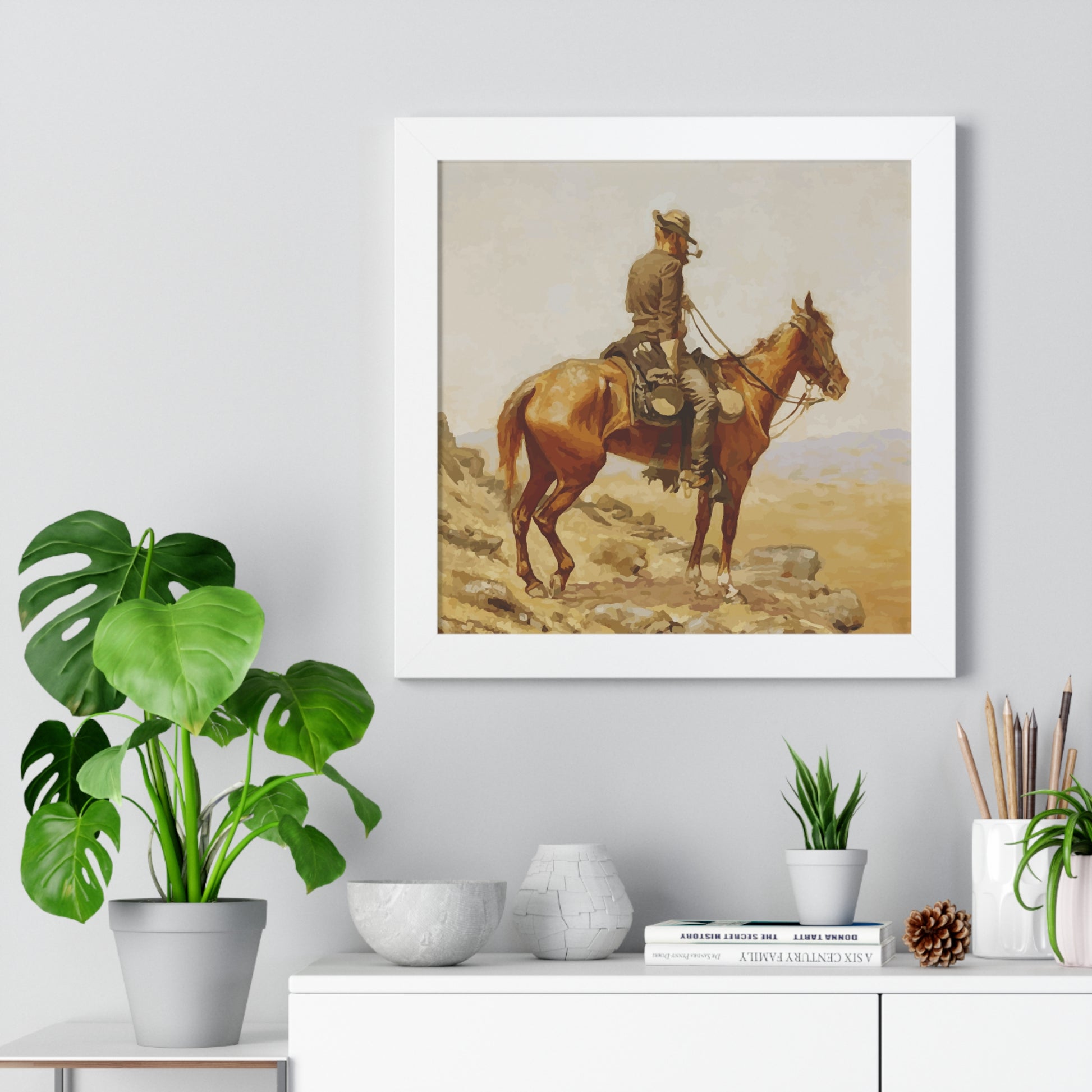 Elevate your home décor with this stunning Framed Vertical Poster Titled "The Lookout" painted by Frederic Remington in 1887. Perfect for art enthusiasts and history buffs alike, this exquisite piece creates a captivating atmosphere in any space. Whether you're decorating a living room, office, or study, this framed poster effortlessly enhances your surroundings with its vibrant colors and rich detail.