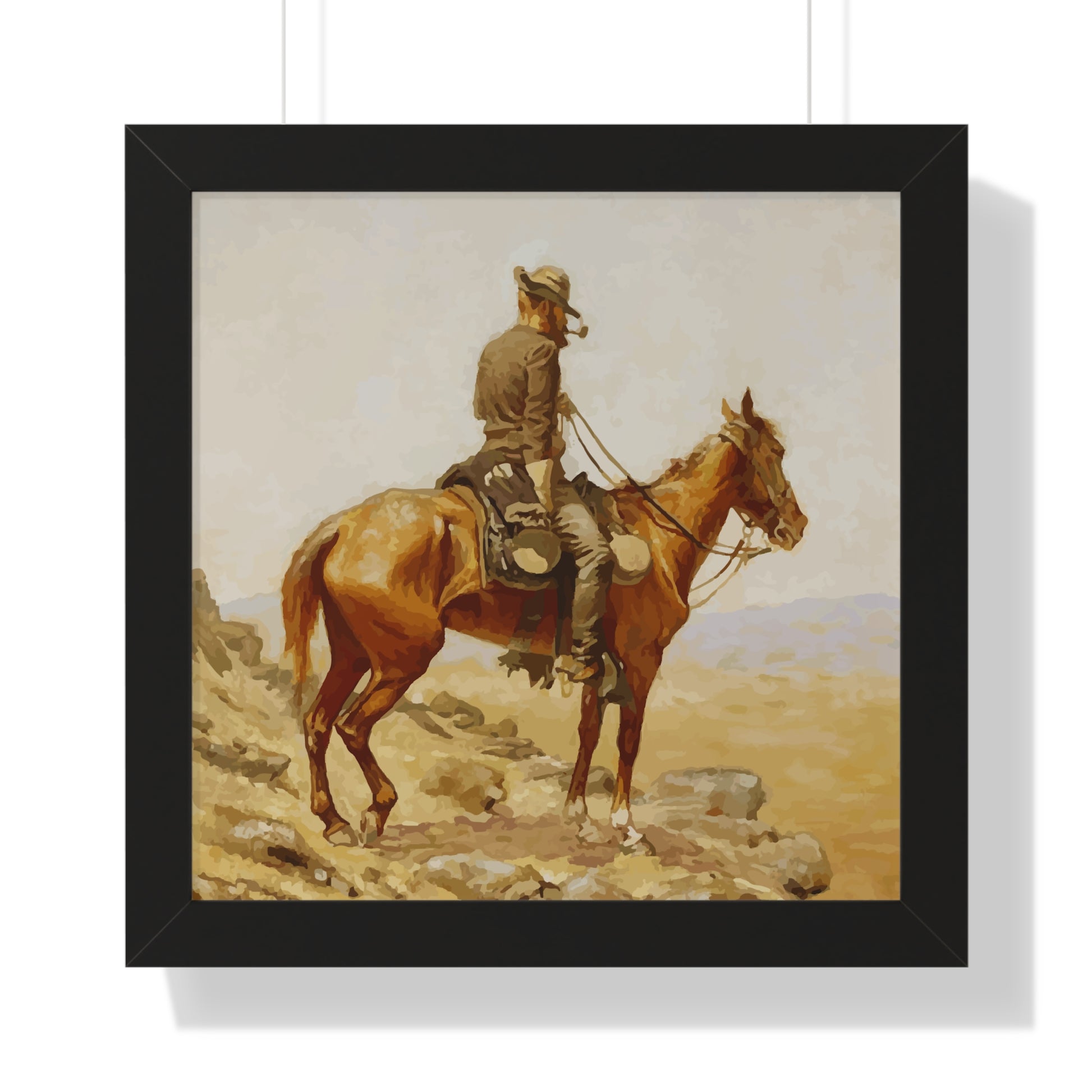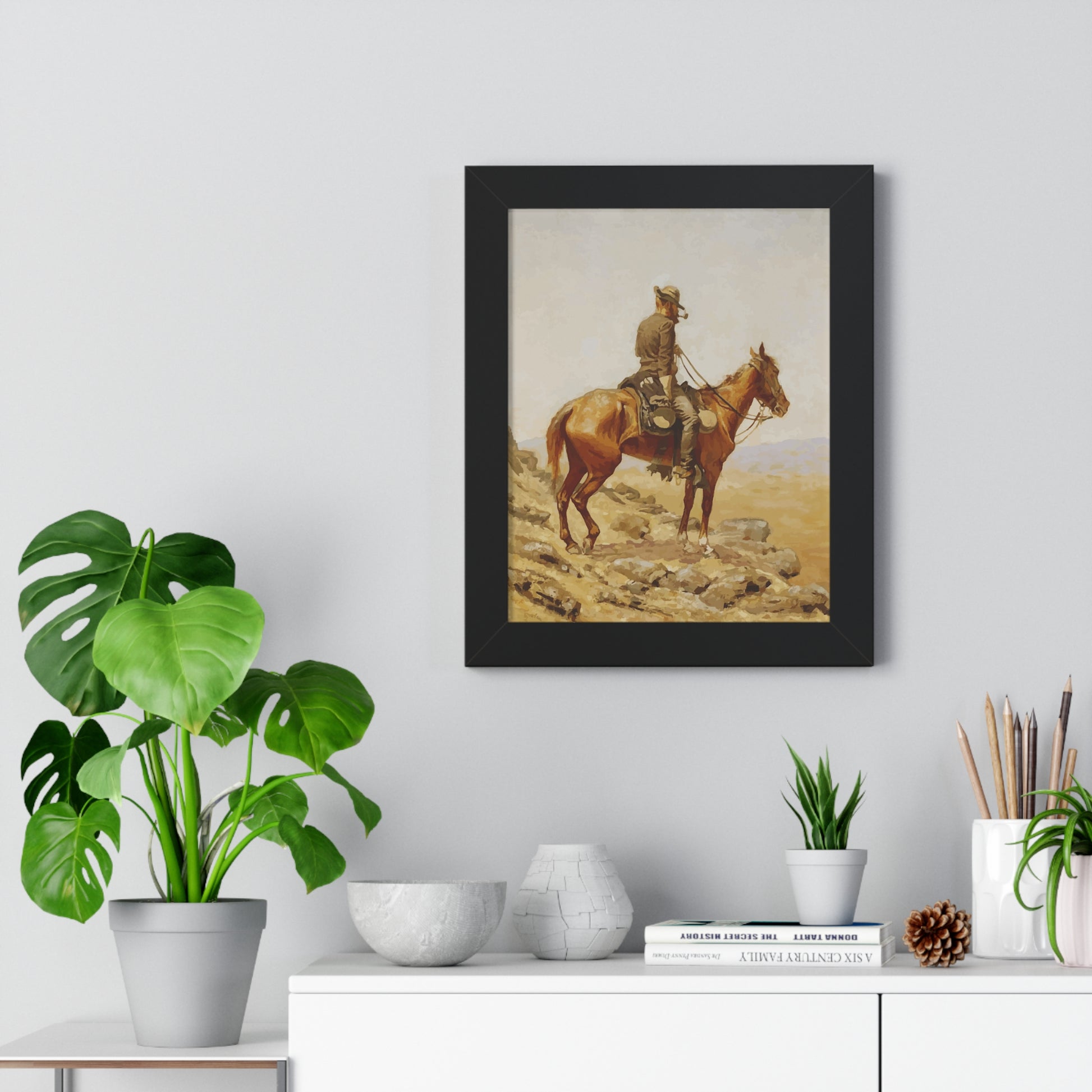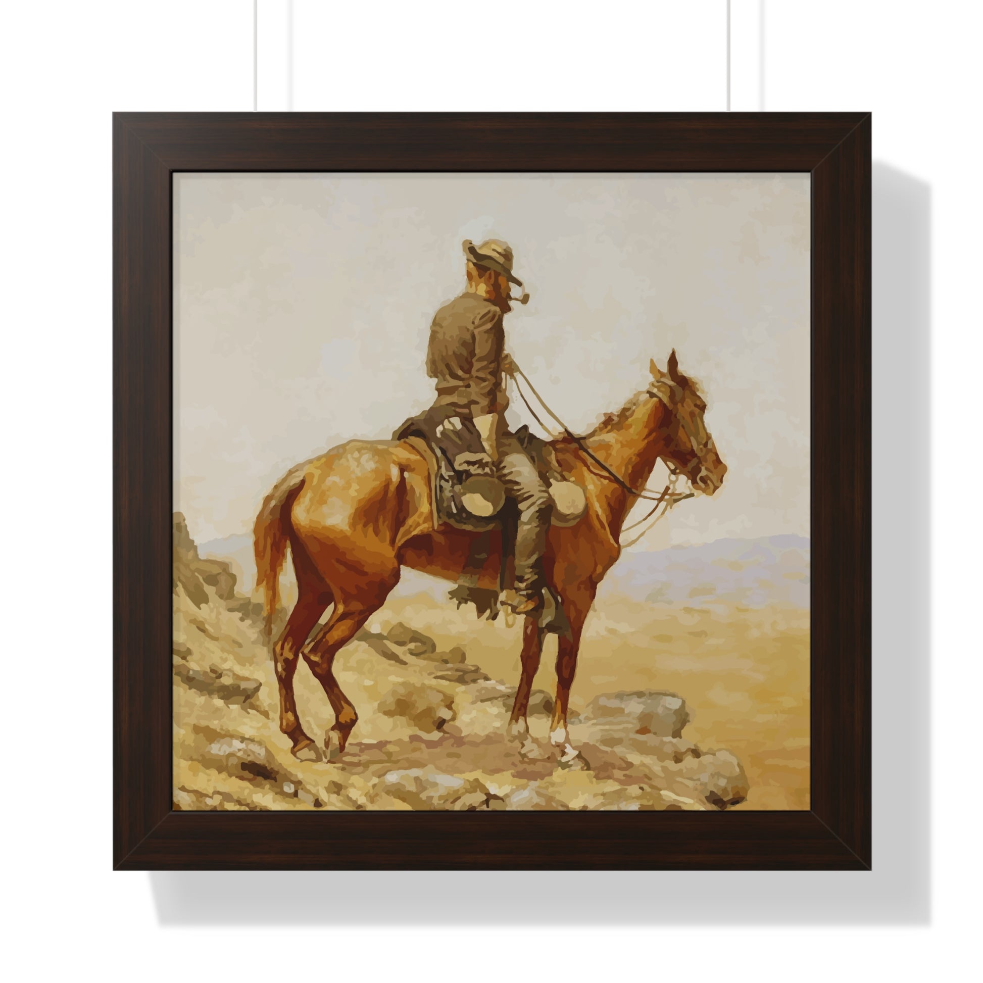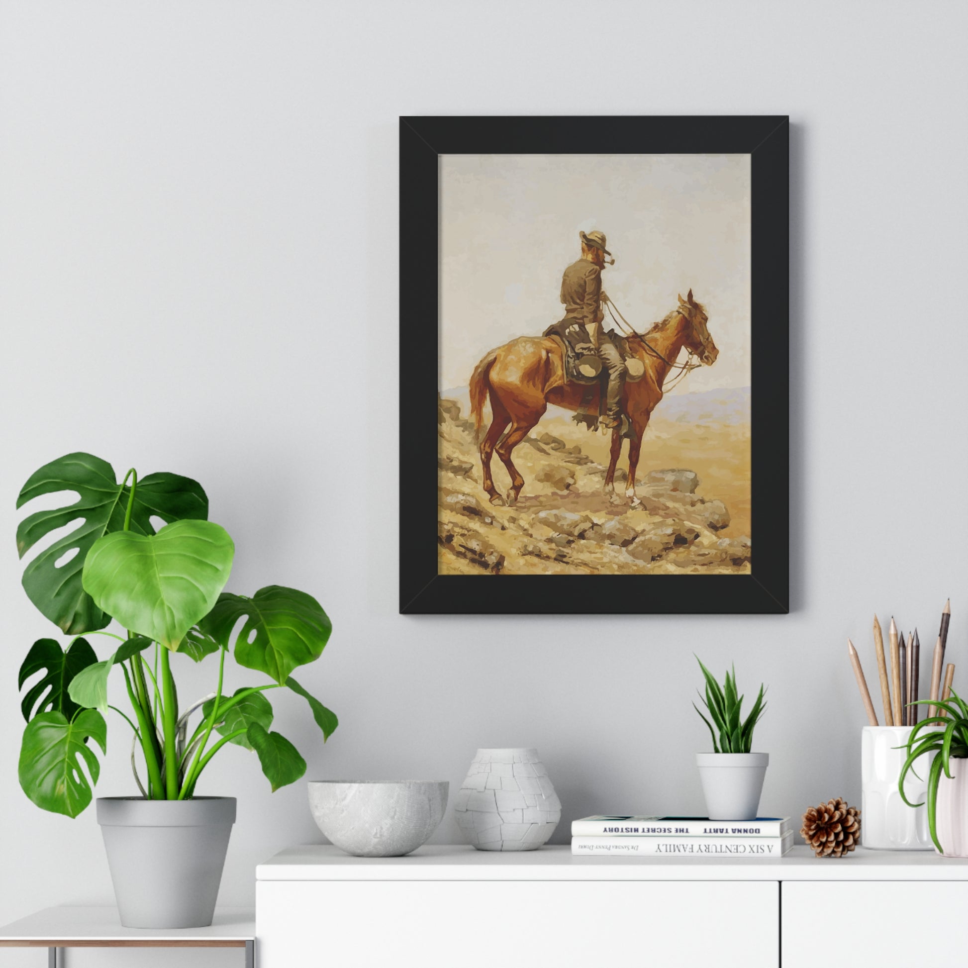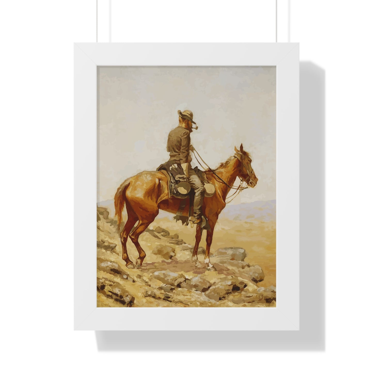 Elevate your home décor with this stunning Framed Vertical Poster Titled "The Lookout" painted by Frederic Remington in 1887. Perfect for art enthusiasts and history buffs alike, this exquisite piece creates a captivating atmosphere in any space. Whether you're decorating a living room, office, or study, this framed poster effortlessly enhances your surroundings with its vibrant colors and rich detail.