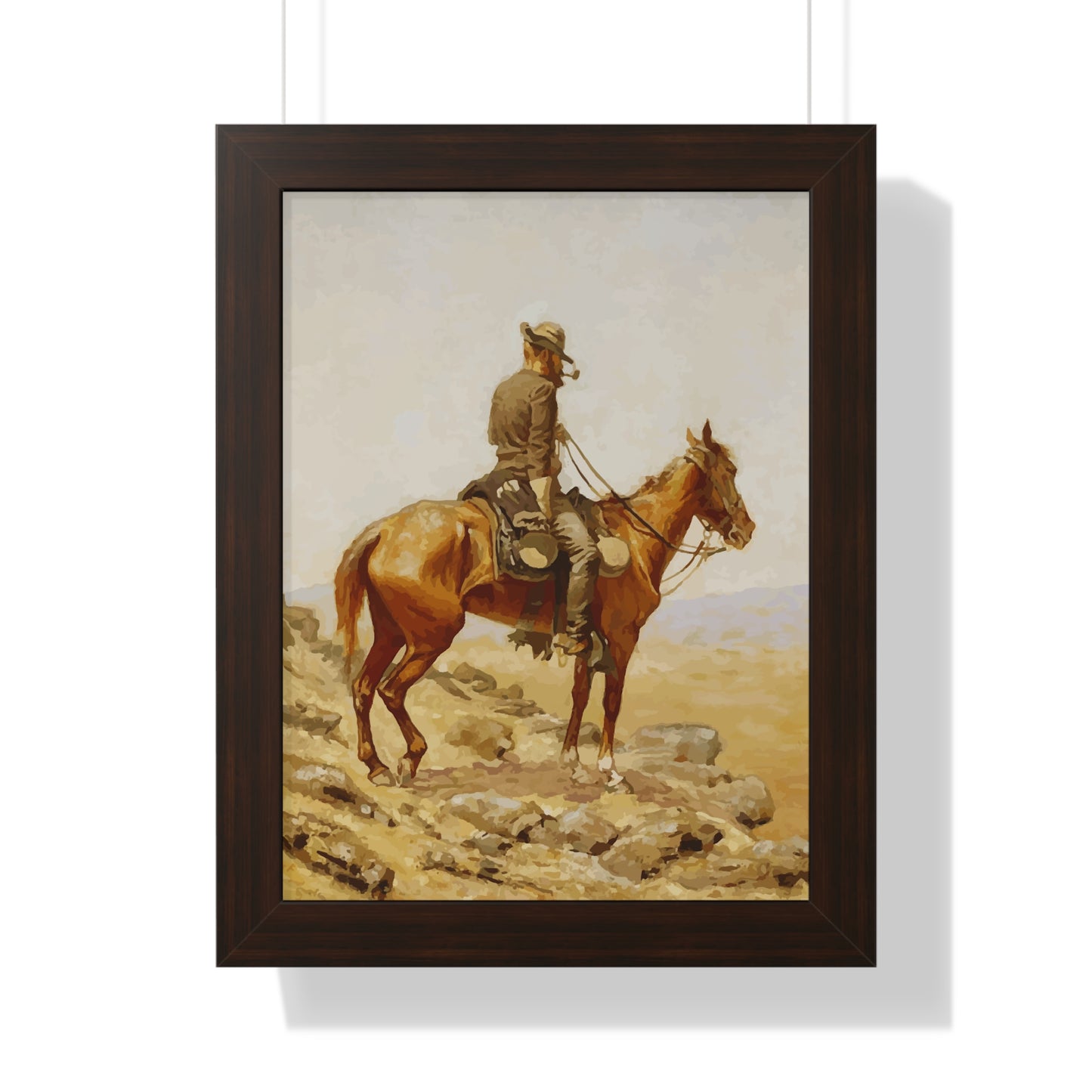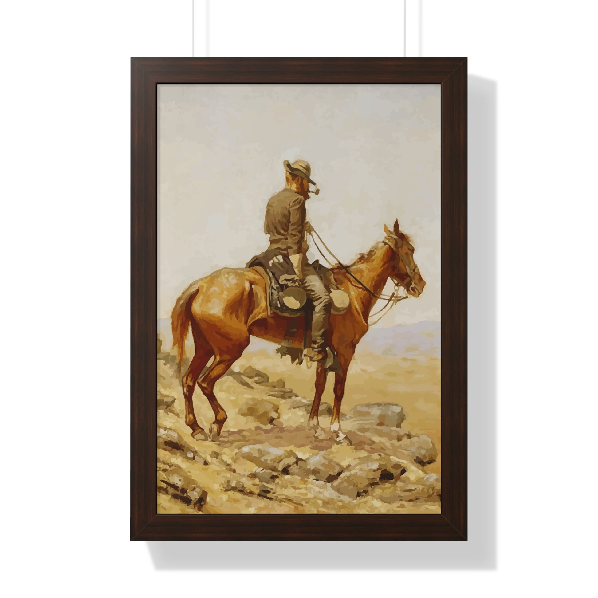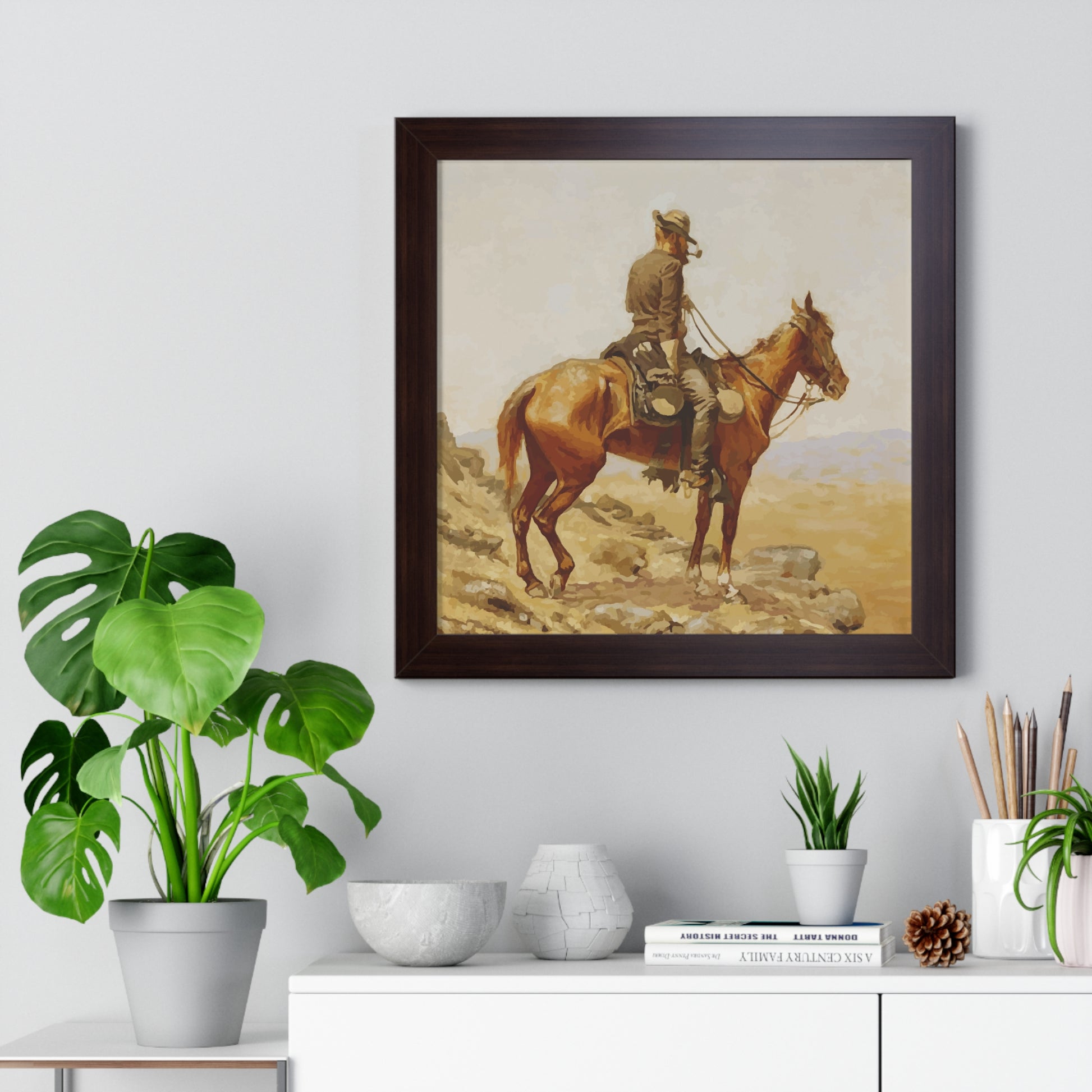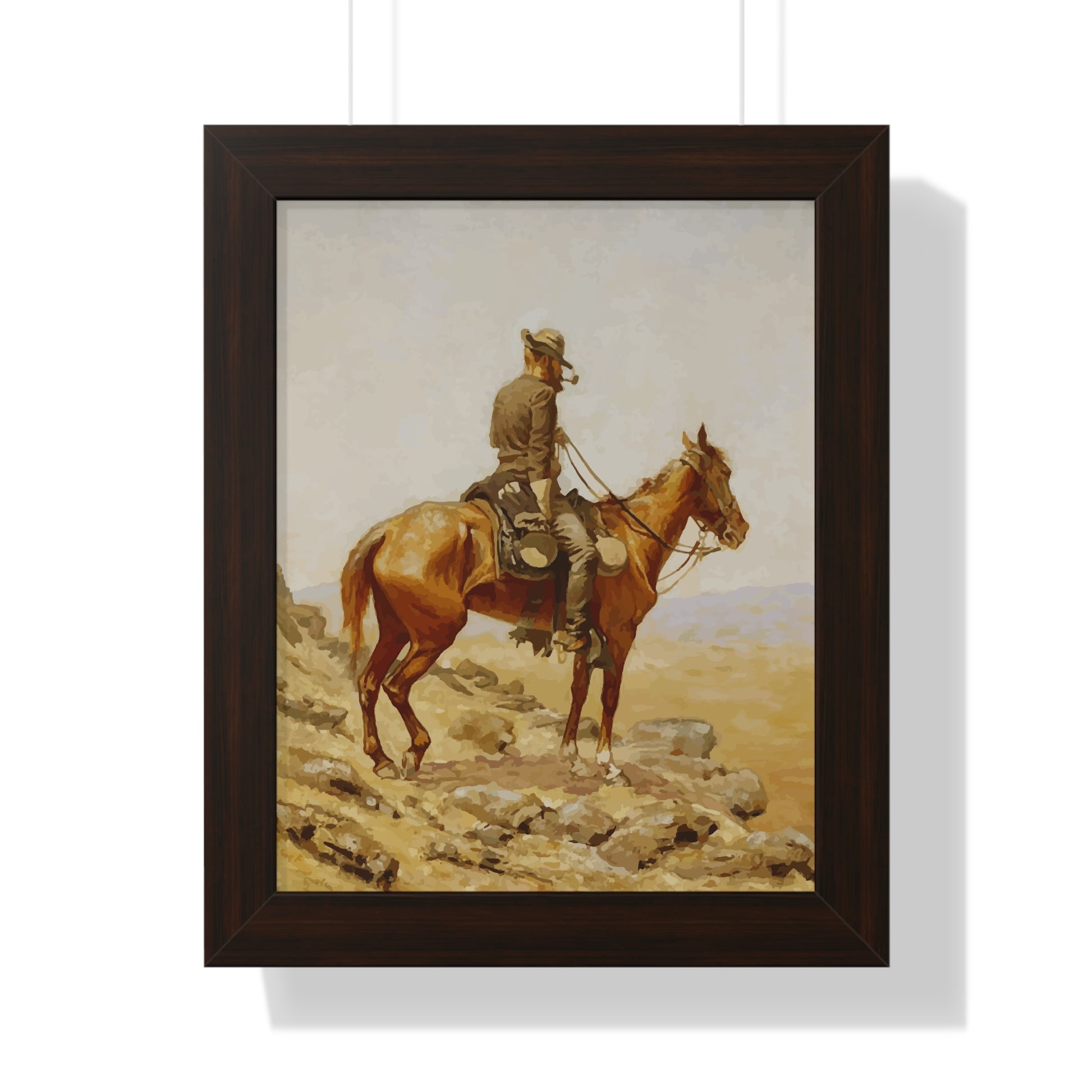 Elevate your home décor with this stunning Framed Vertical Poster Titled "The Lookout" painted by Frederic Remington in 1887. Perfect for art enthusiasts and history buffs alike, this exquisite piece creates a captivating atmosphere in any space. Whether you're decorating a living room, office, or study, this framed poster effortlessly enhances your surroundings with its vibrant colors and rich detail.