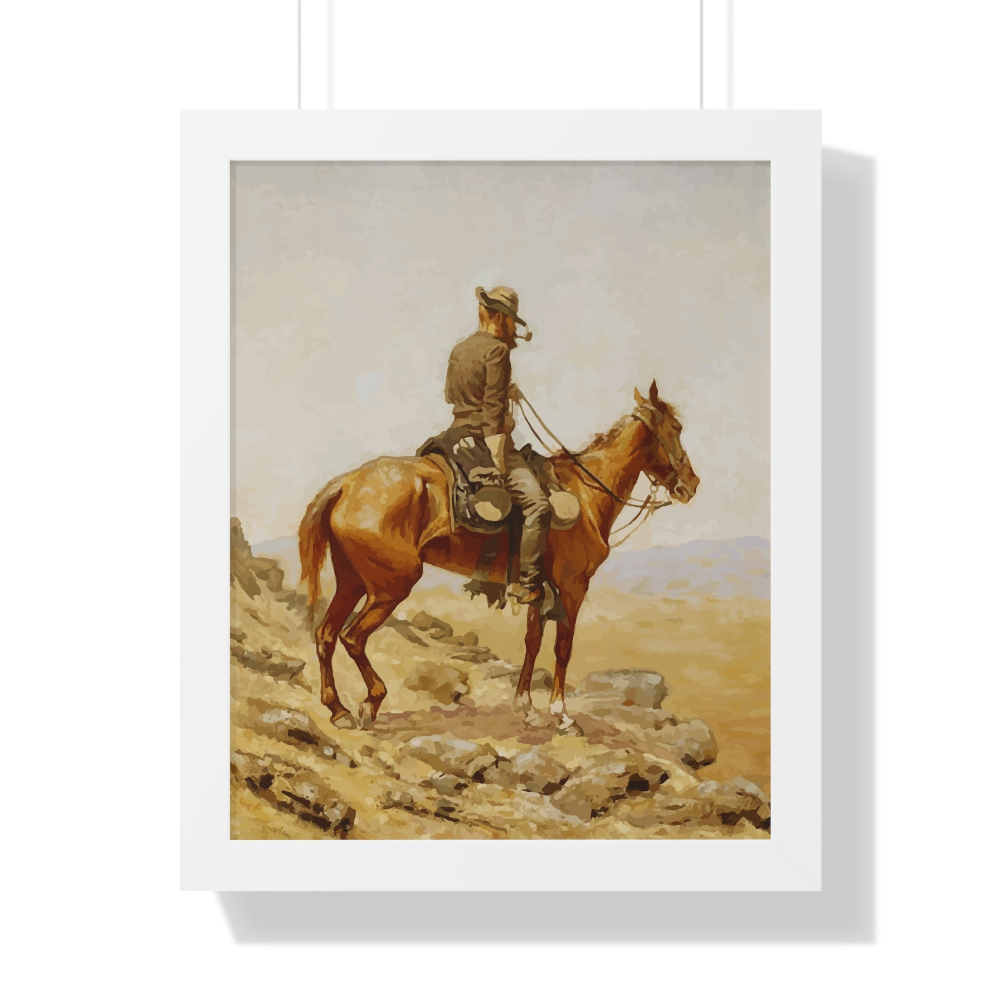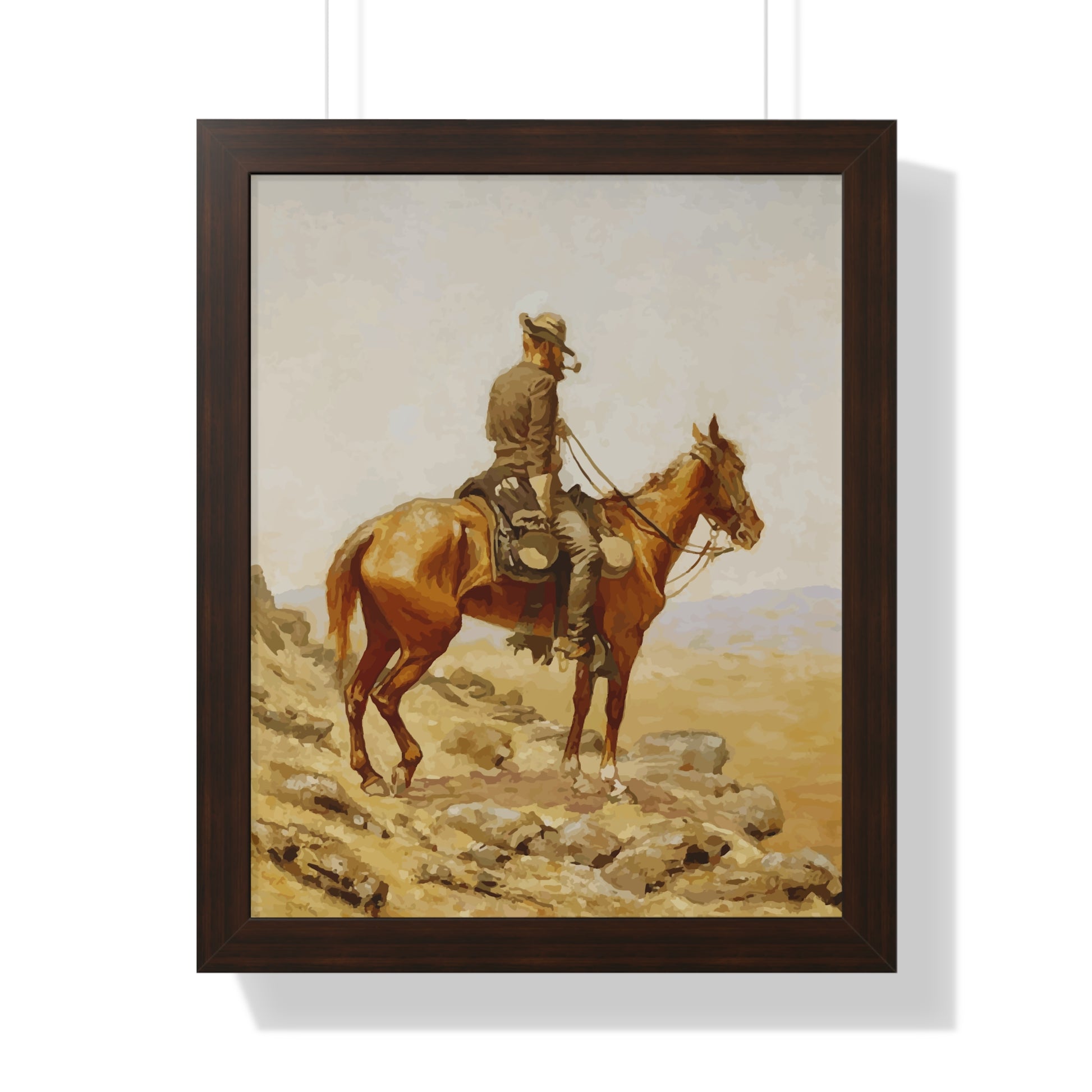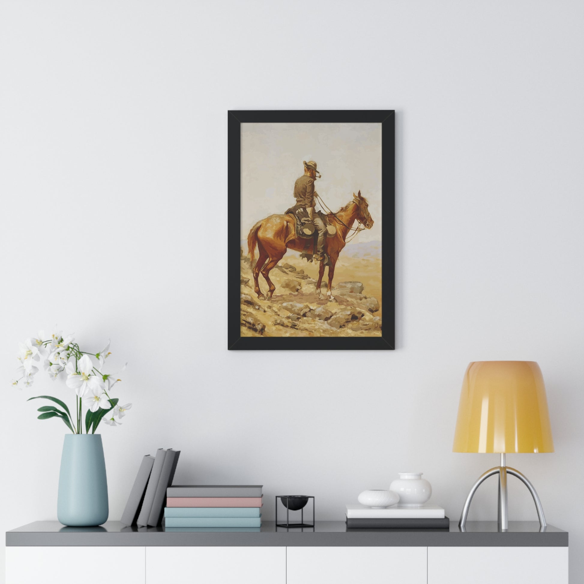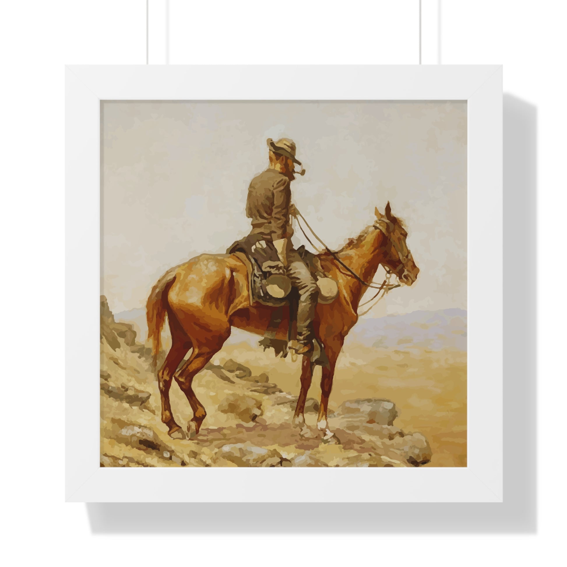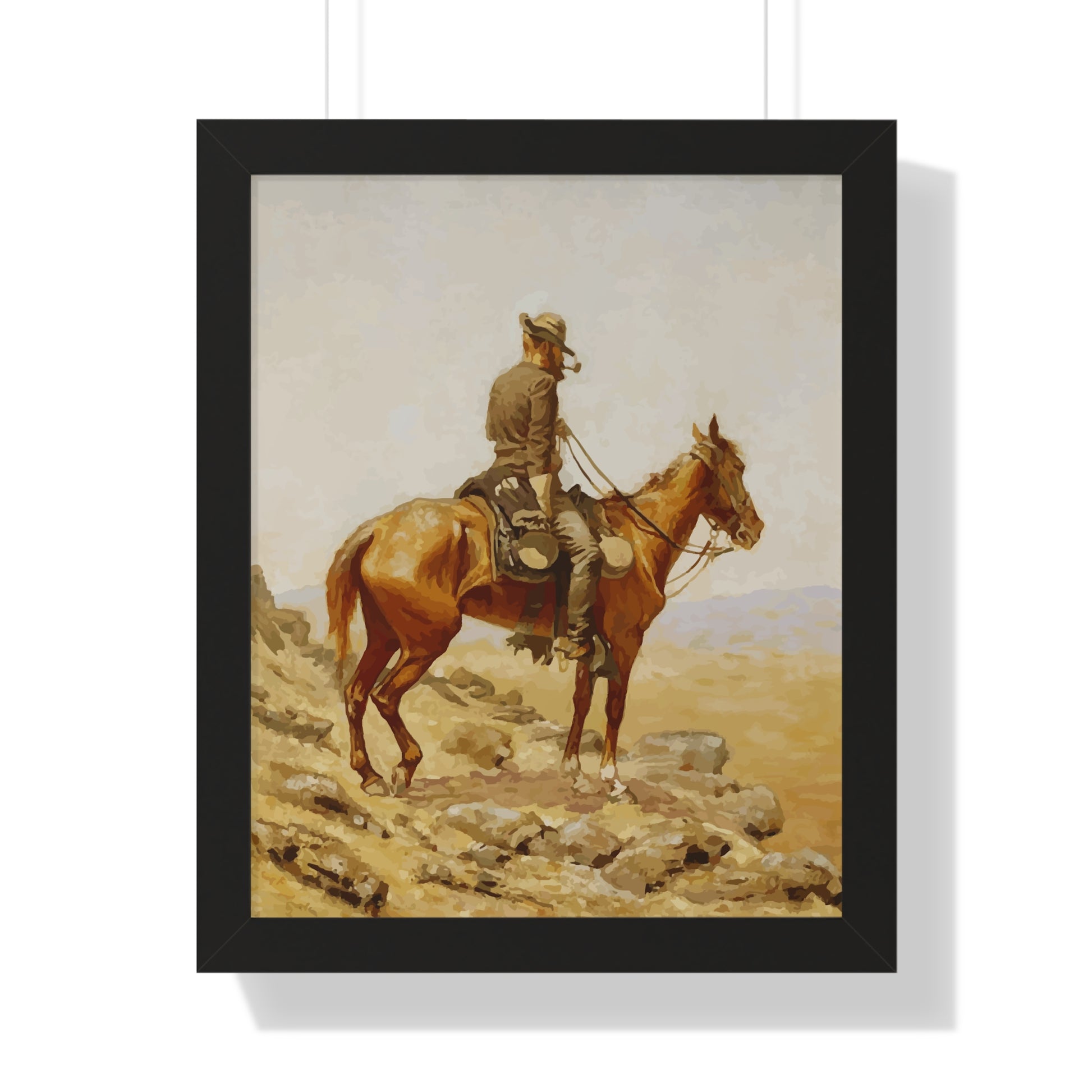 Elevate your home décor with this stunning Framed Vertical Poster Titled "The Lookout" painted by Frederic Remington in 1887. Perfect for art enthusiasts and history buffs alike, this exquisite piece creates a captivating atmosphere in any space. Whether you're decorating a living room, office, or study, this framed poster effortlessly enhances your surroundings with its vibrant colors and rich detail.