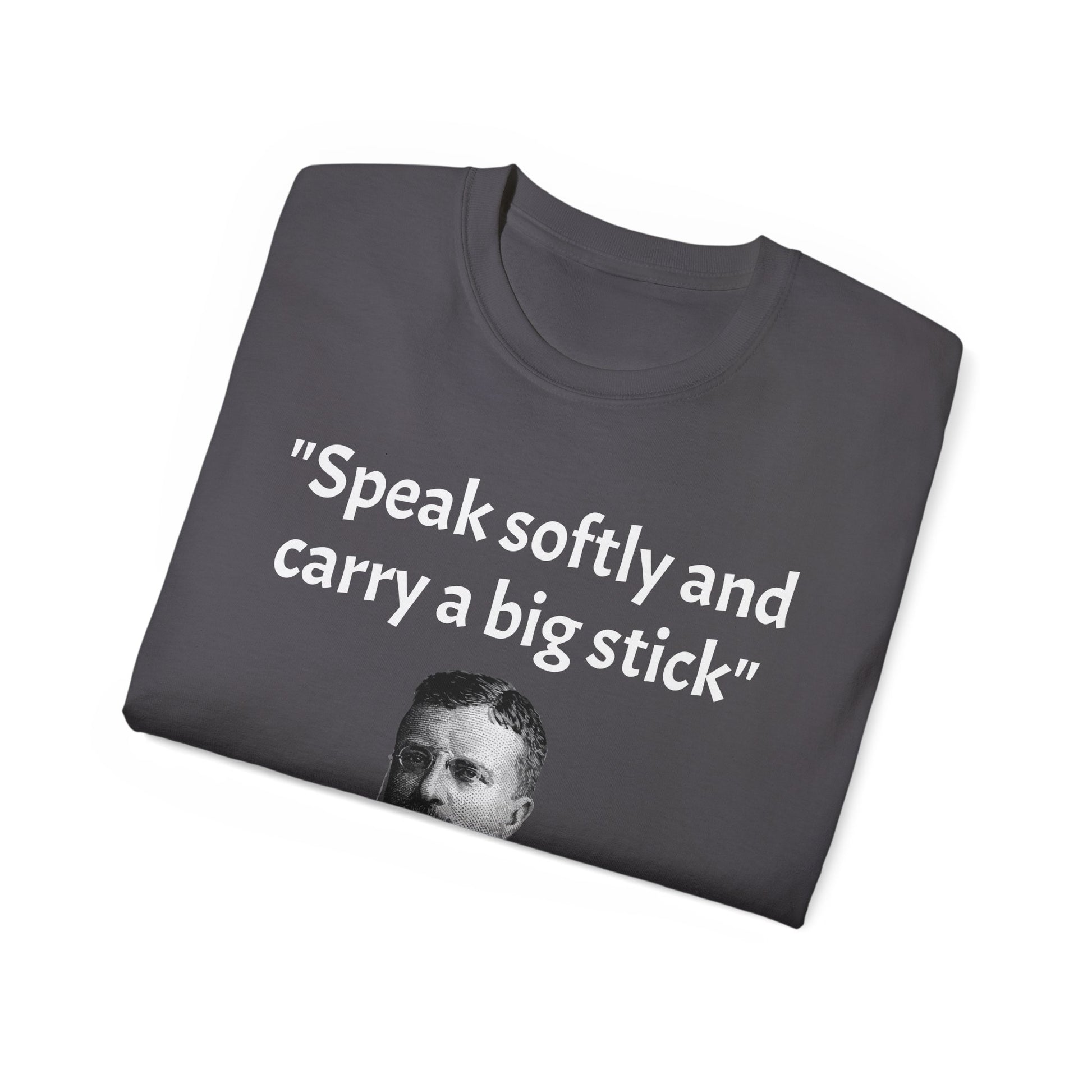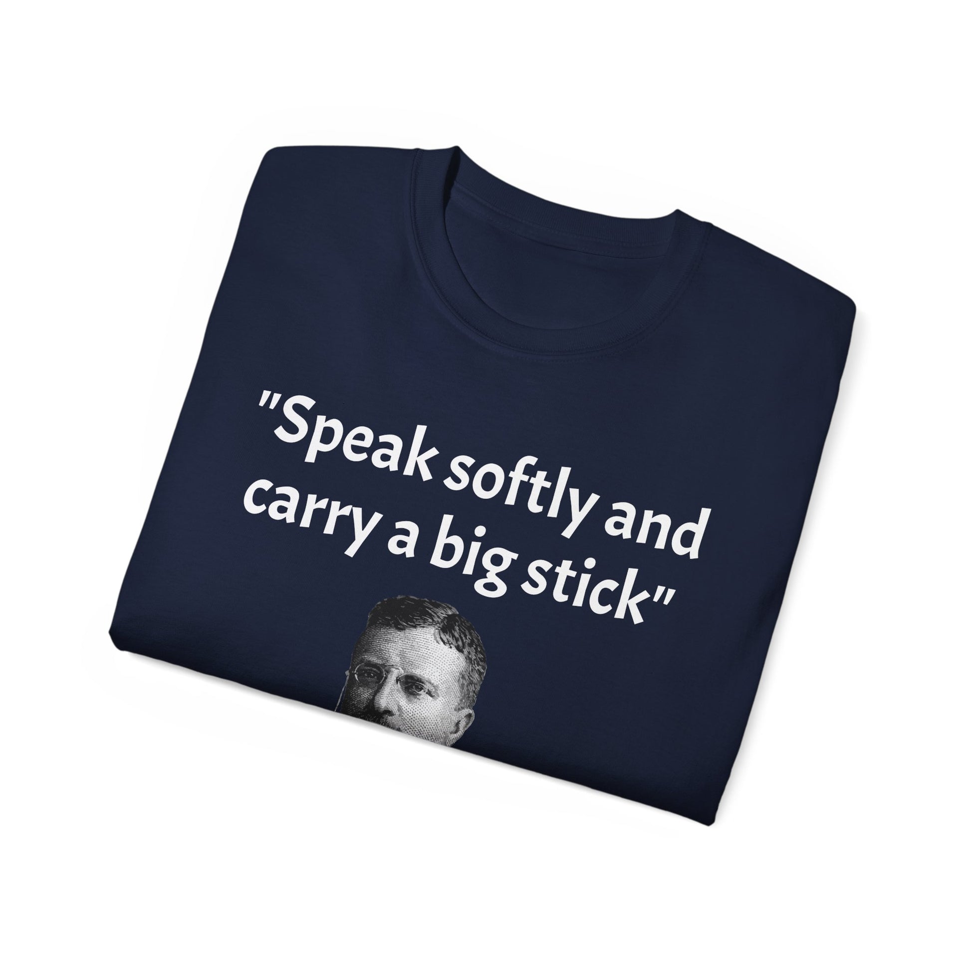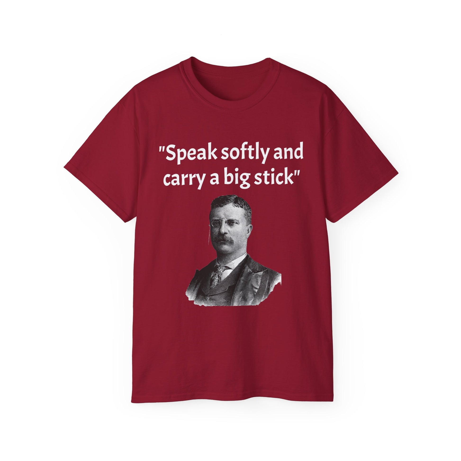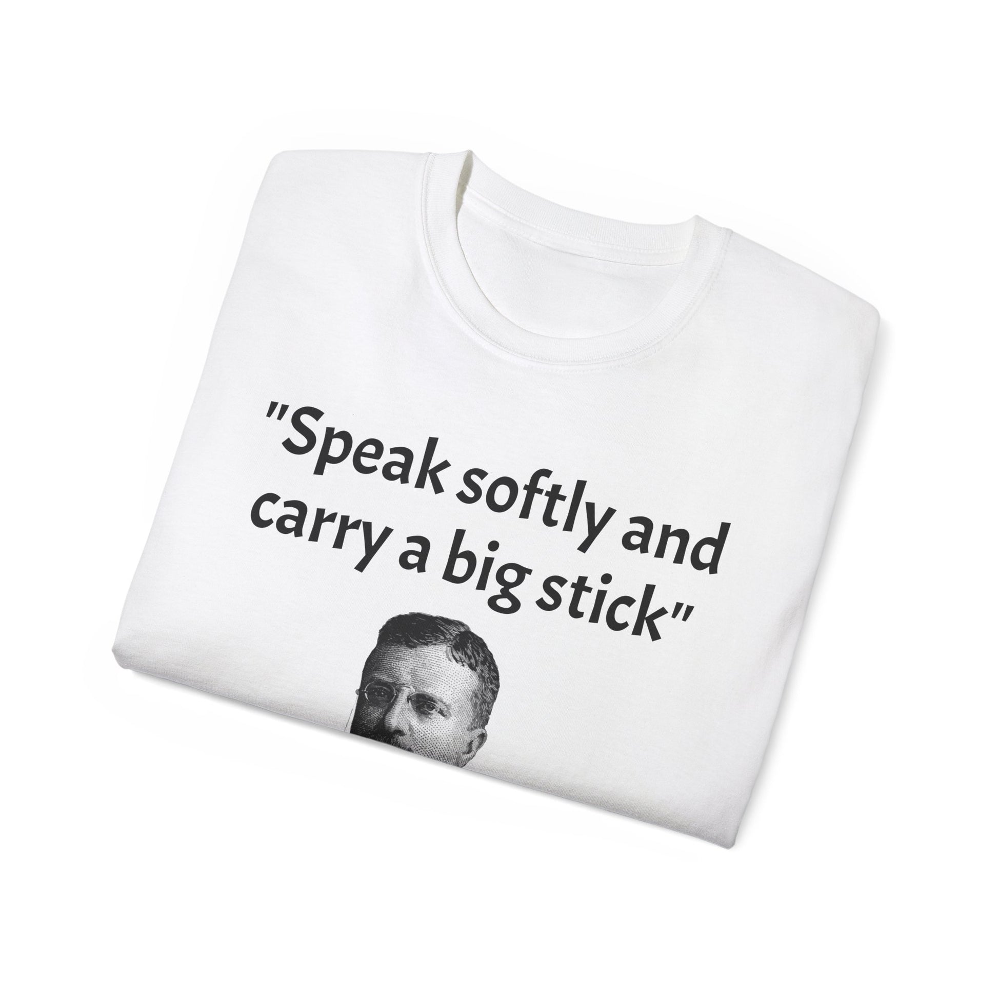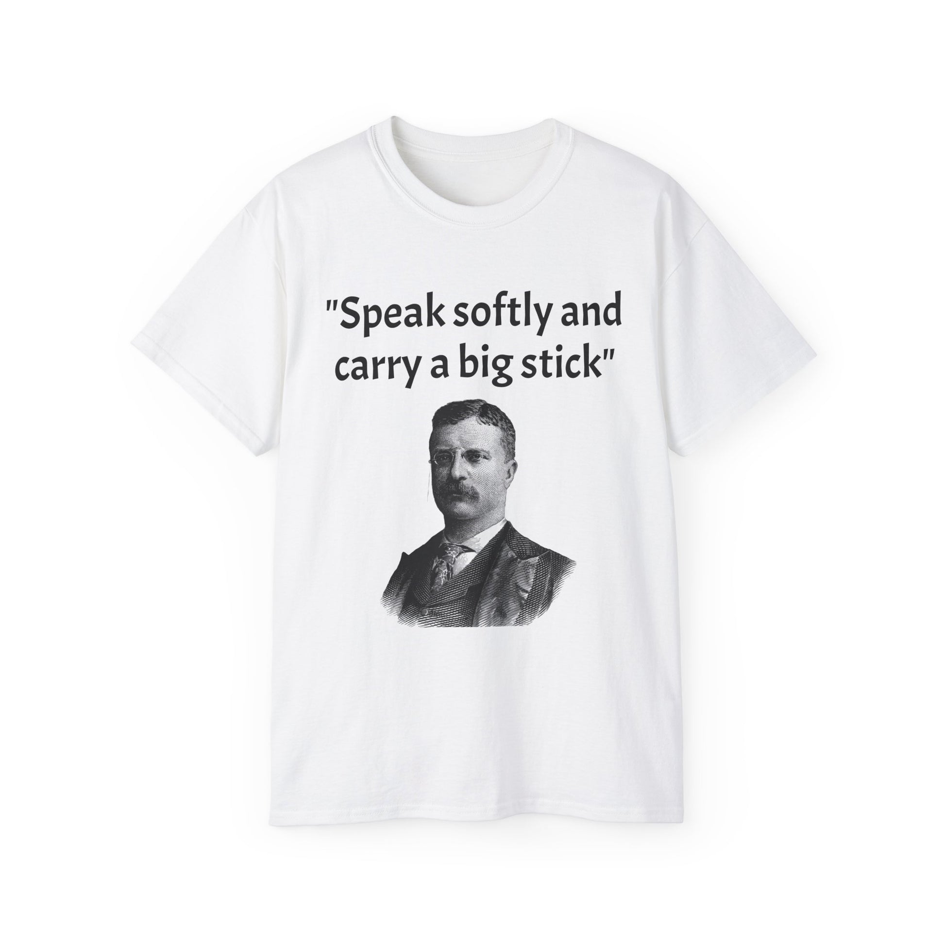 Show off your historical knowledge and enthusiasm with this Historic Theodore Roosevelt Quote "Speak Softly and Carry a Big Stick" Unisex Ultra Cotton T-Shirt. The perfect blend of comfort, durability, and sustainability.