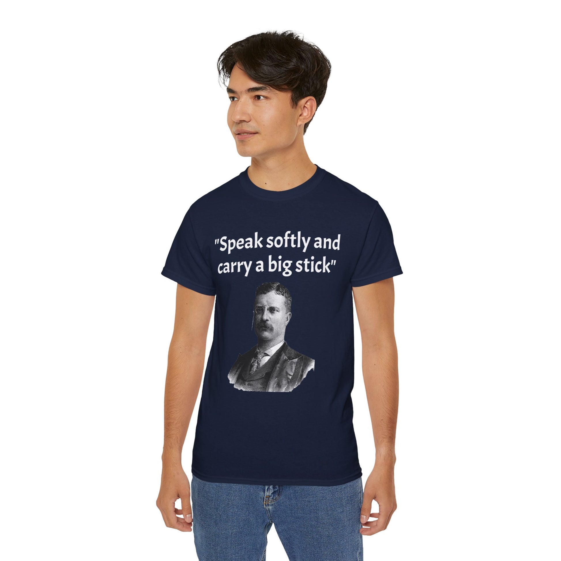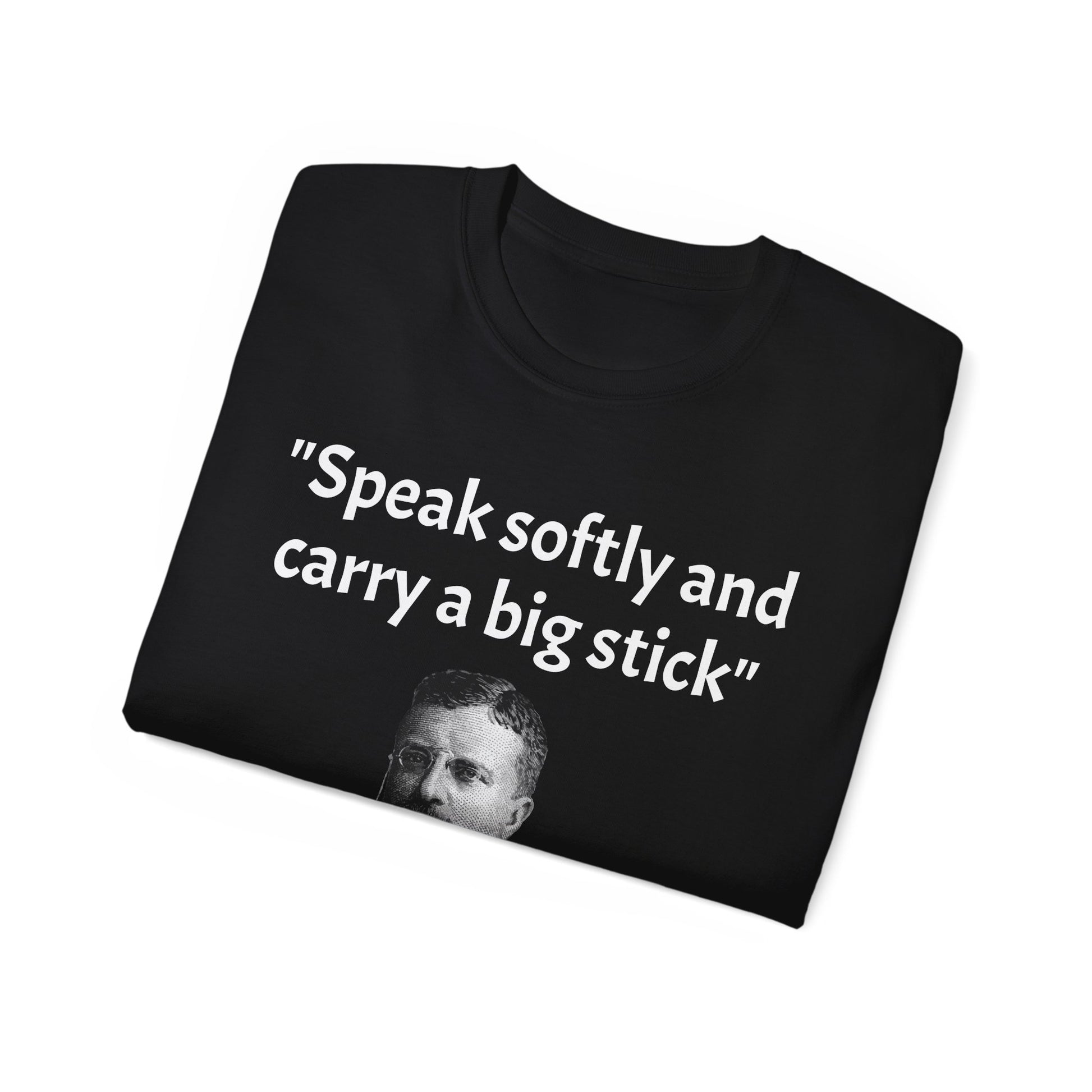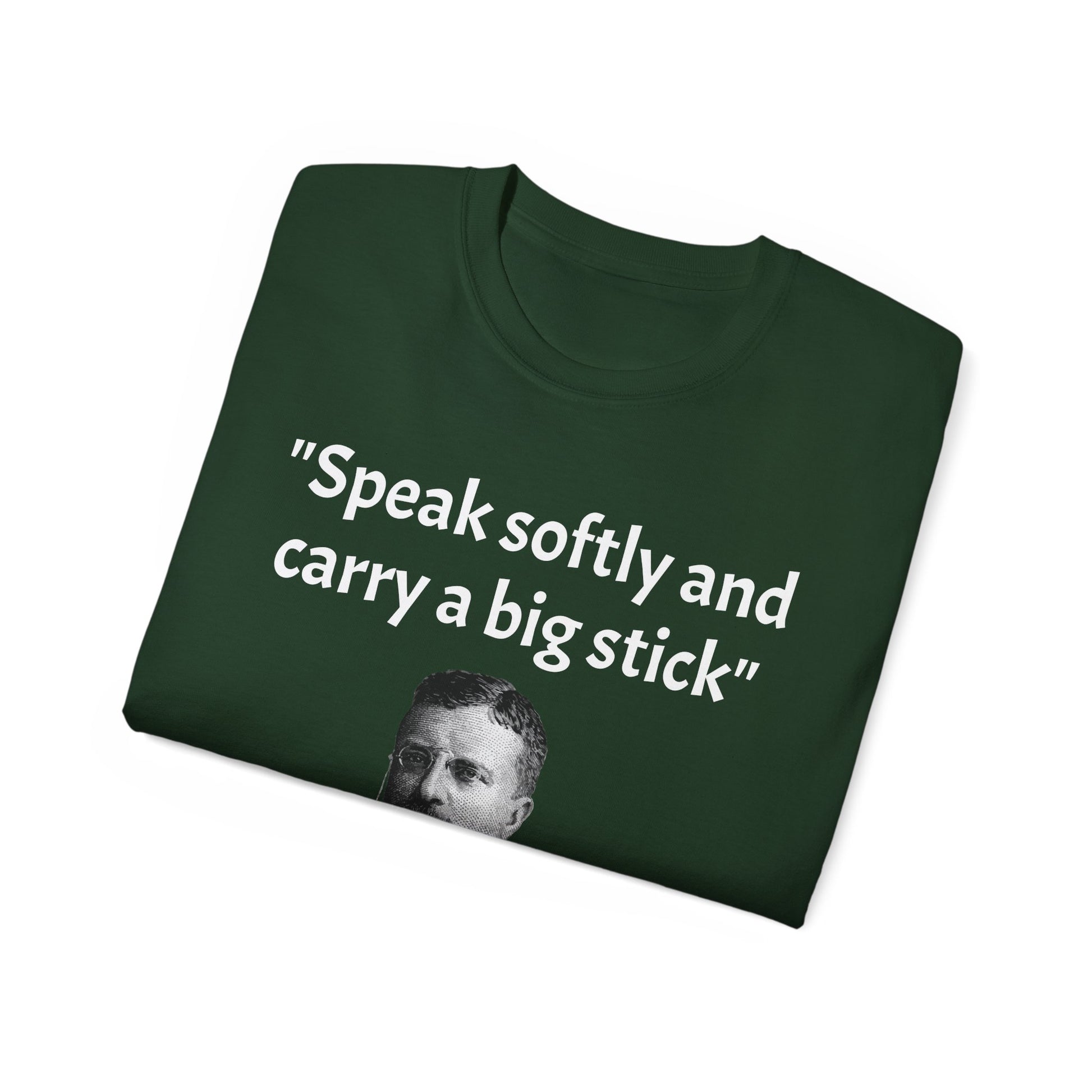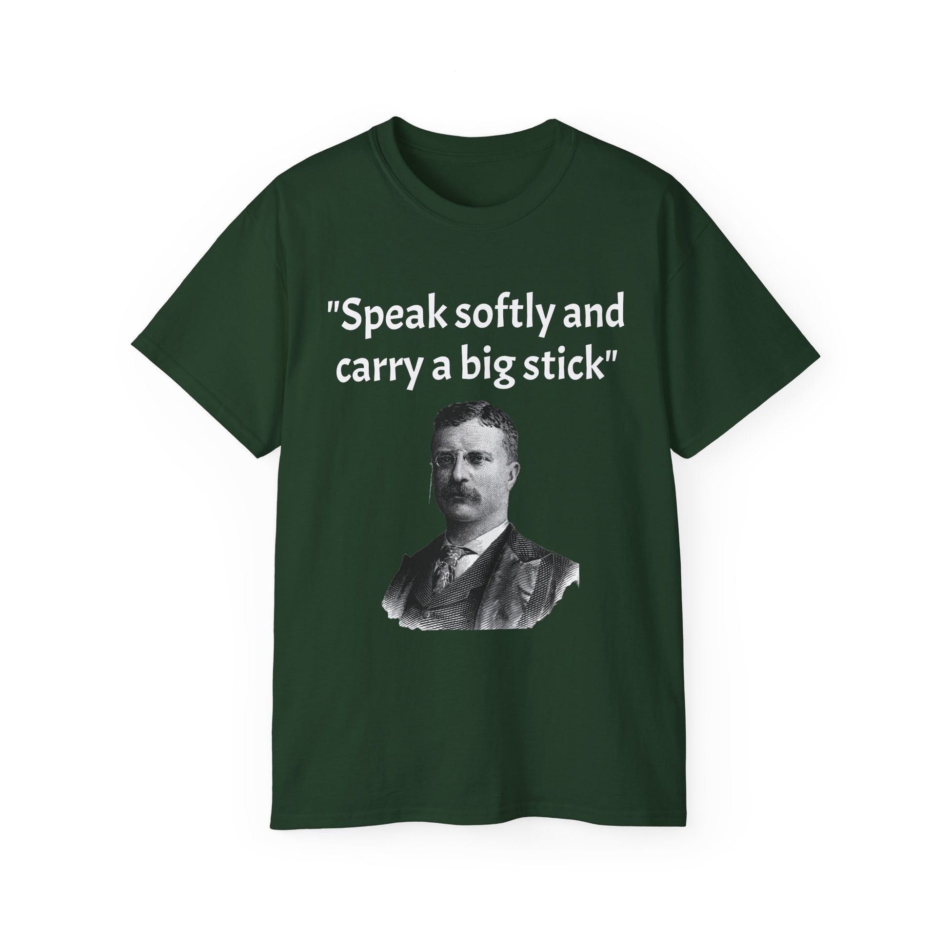 Show off your historical knowledge and enthusiasm with this Historic Theodore Roosevelt Quote "Speak Softly and Carry a Big Stick" Unisex Ultra Cotton T-Shirt. The perfect blend of comfort, durability, and sustainability.